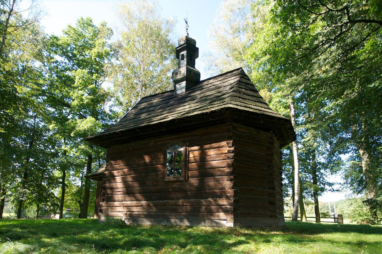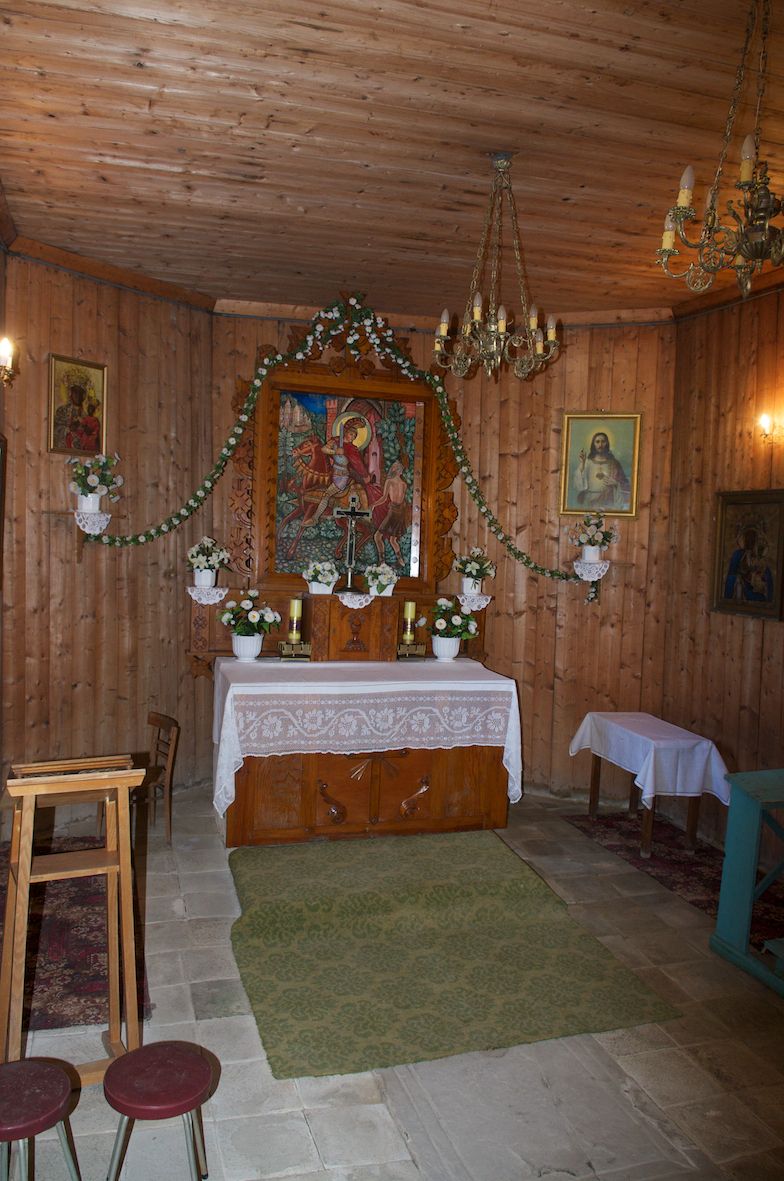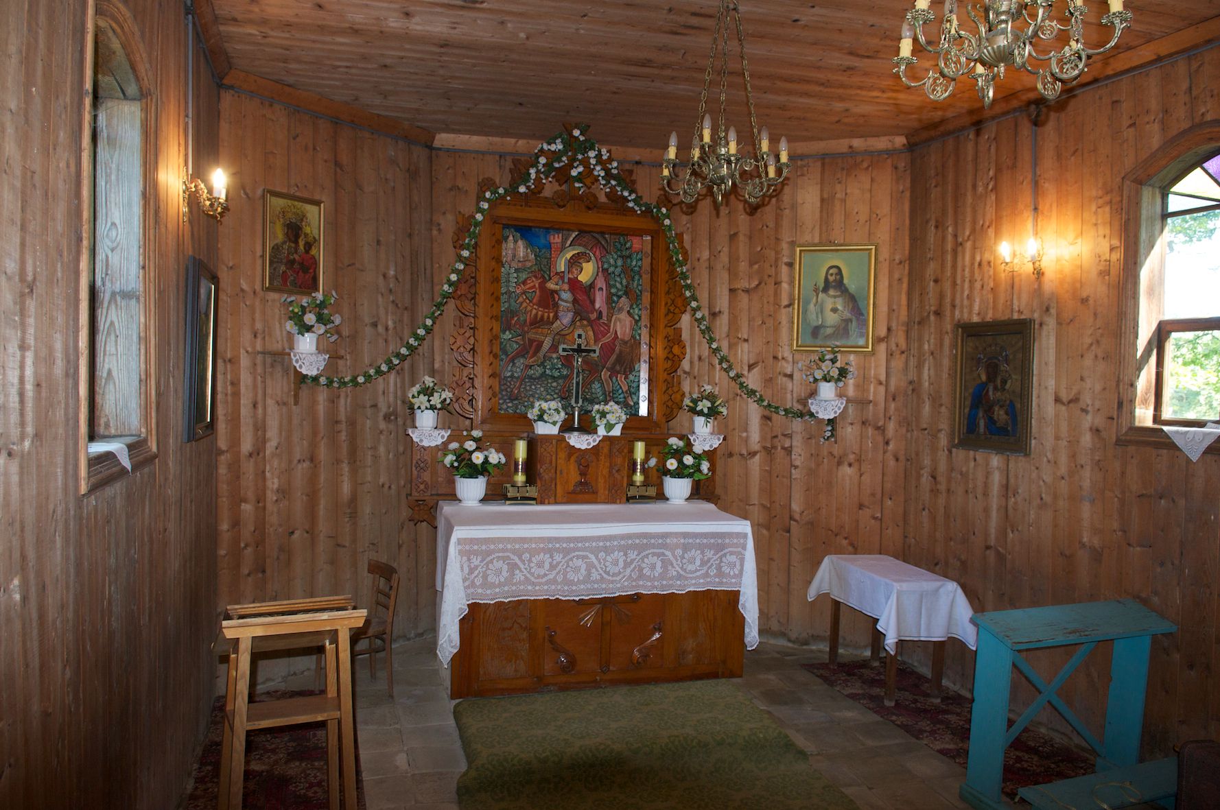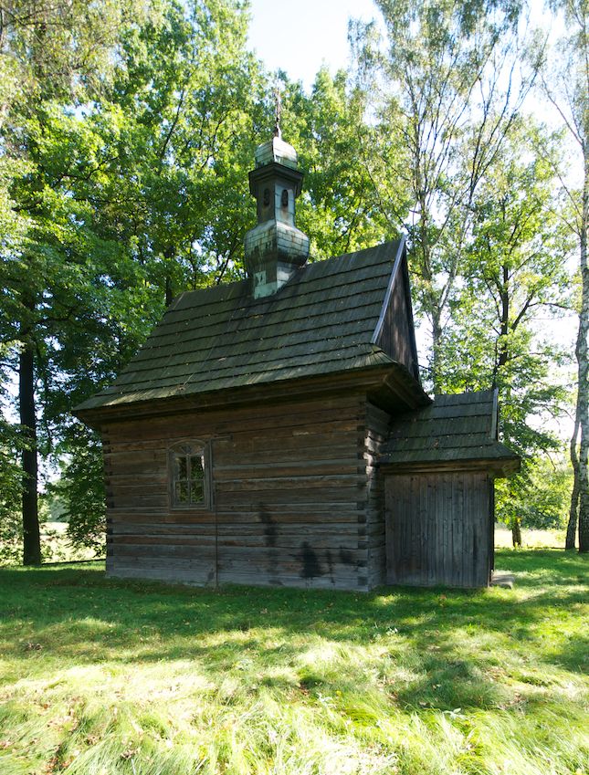 Dwa otwory okienne w ścianie południowej i północnej, w formie stojącego prostokąta zamkniętego łukiem odcinkowym, skrzynkowe, obwiedzione listwowymi opaskami, z kwaterowymi podziałami. Otwory wejściowe: w wejściu do przedsionka od zachodu drzwi dwuskrzydłowe, płycinowe w futrynie skrzynkowej; w przejściu do nawy drzwi deskowe-spągowe, dwuskrzydłowe, w odrzwiach belkowych.