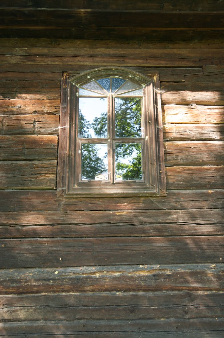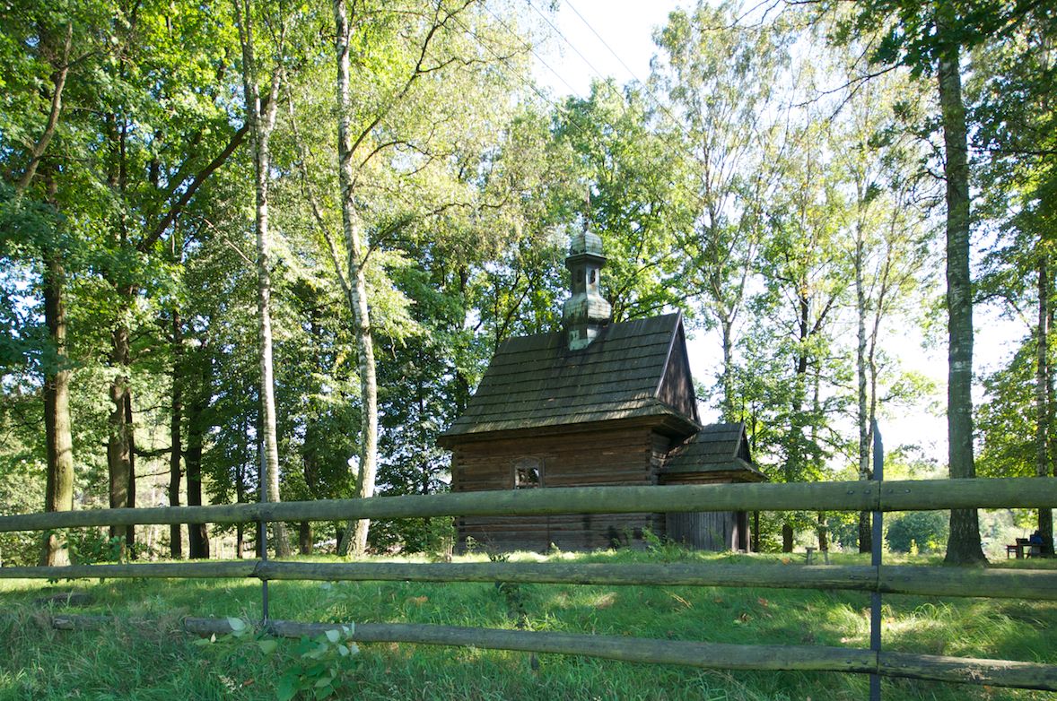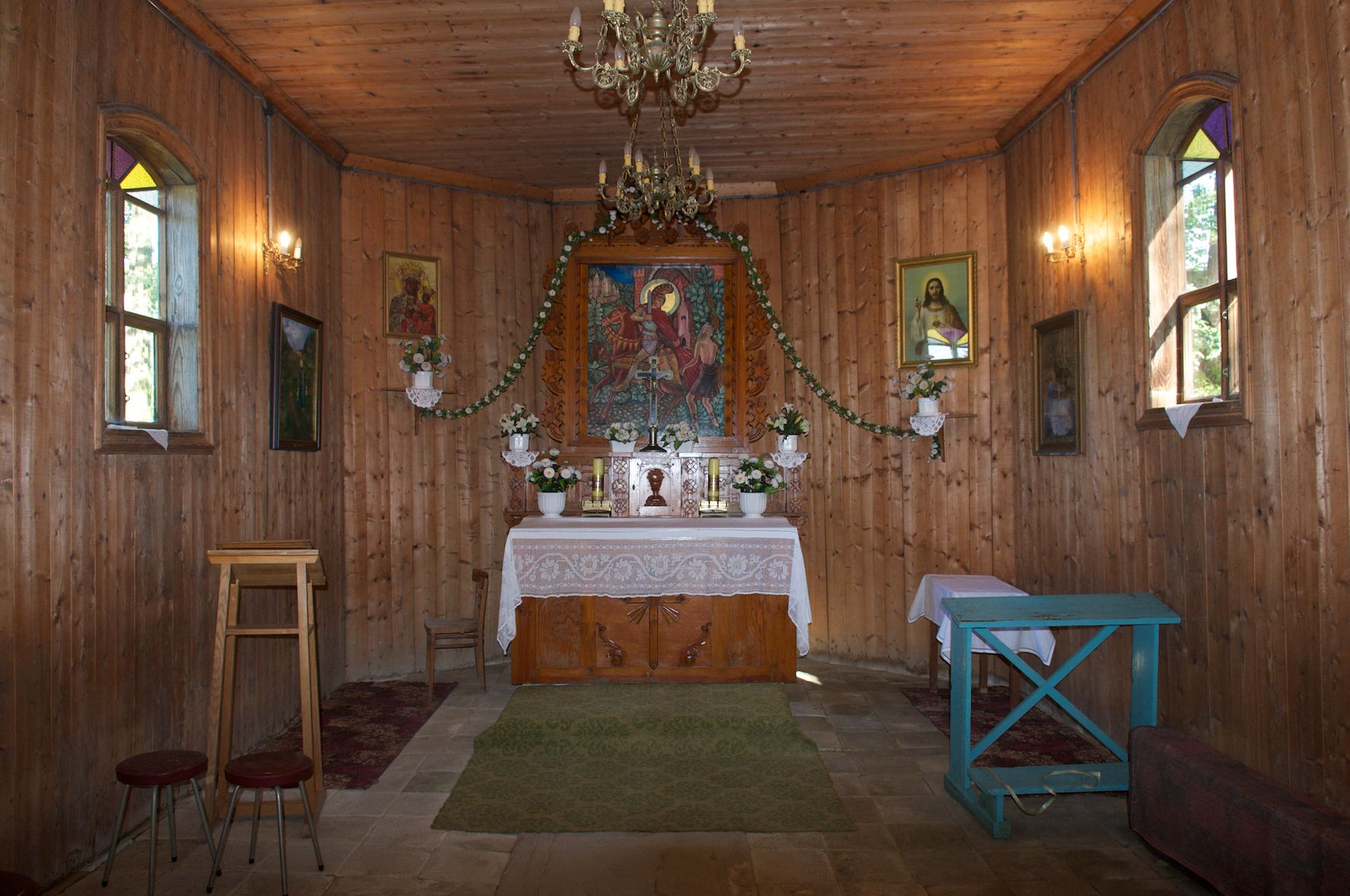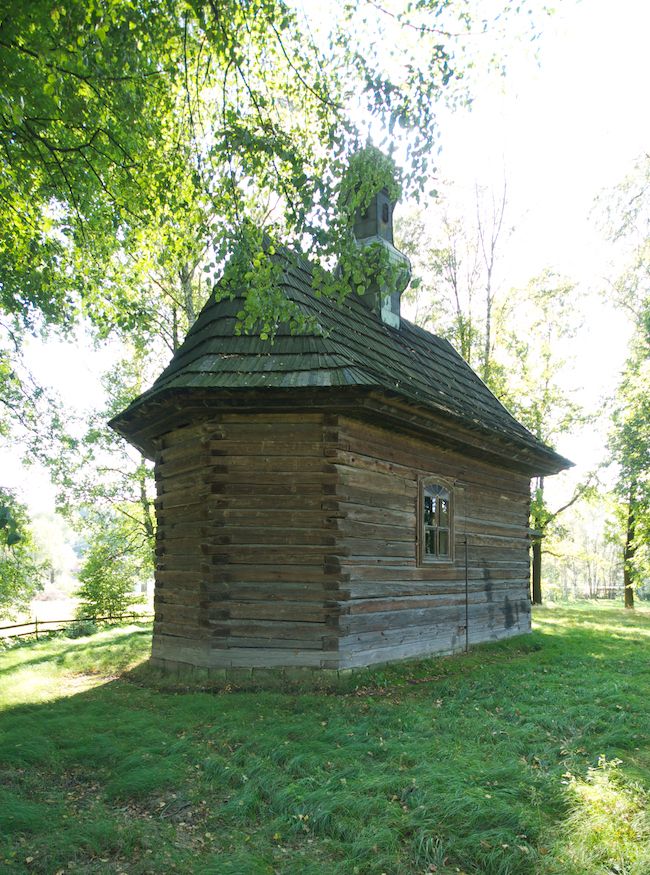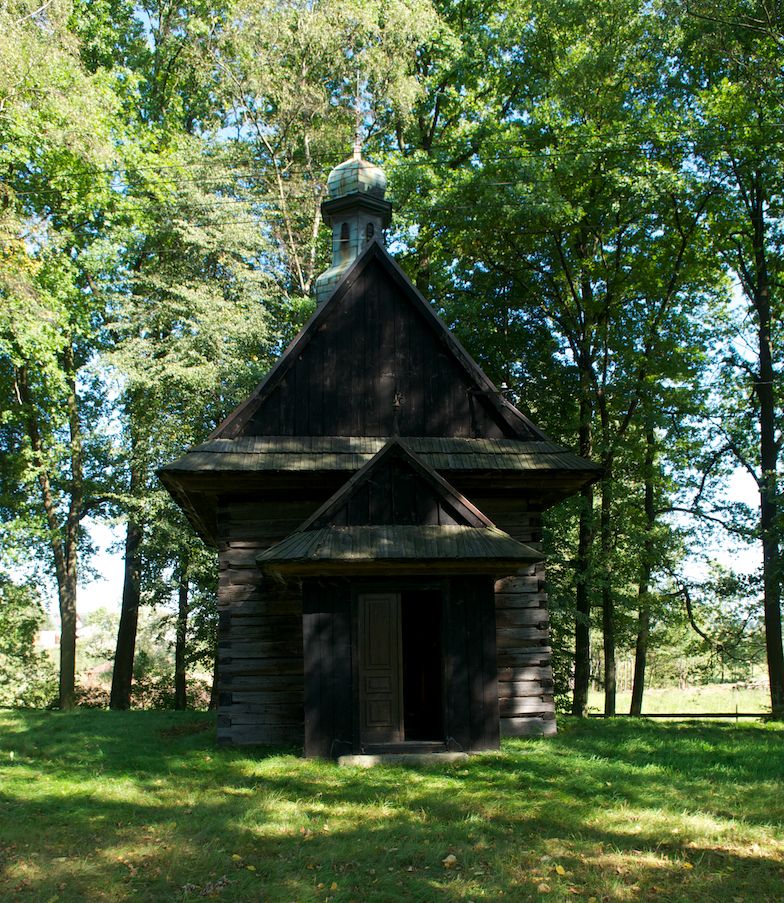 Dwa otwory okienne w ścianie południowej i północnej, w formie stojącego prostokąta zamkniętego łukiem odcinkowym, skrzynkowe, obwiedzione listwowymi opaskami, z kwaterowymi podziałami. Otwory wejściowe: w wejściu do przedsionka od zachodu drzwi dwuskrzydłowe, płycinowe w futrynie skrzynkowej; w przejściu do nawy drzwi deskowe-spągowe, dwuskrzydłowe, w odrzwiach belkowych.