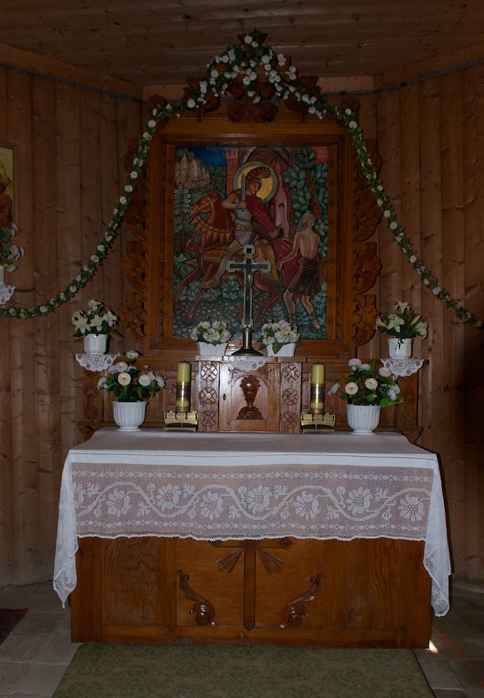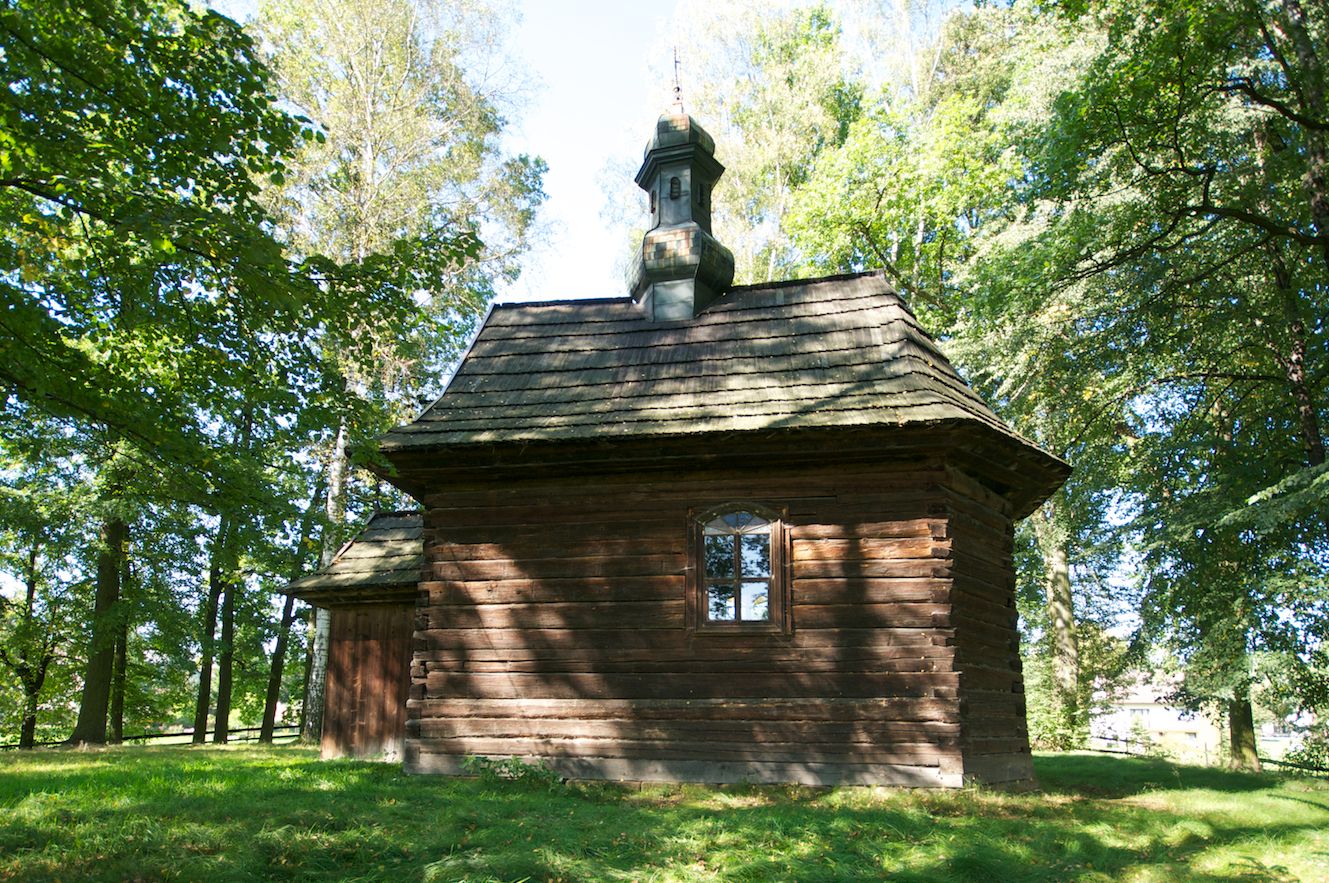 Kościół nakryty dachem siodłowym, jednokalenicowym, dwuspadowym, krytym gontem; o więźbie krokwiowo-siodłowej. Od zachodu nad korpusem i przedsionkiem wydatne daszki okapowe, kryte gontem. Szczyty szalowane deskami w układzie pionowym na styk, z listwowaniem. Nad nawą, na kalenicy wieżyczka na sygnaturkę z wydatnym z hełmem baniastym z latarnią, pobita blachą.