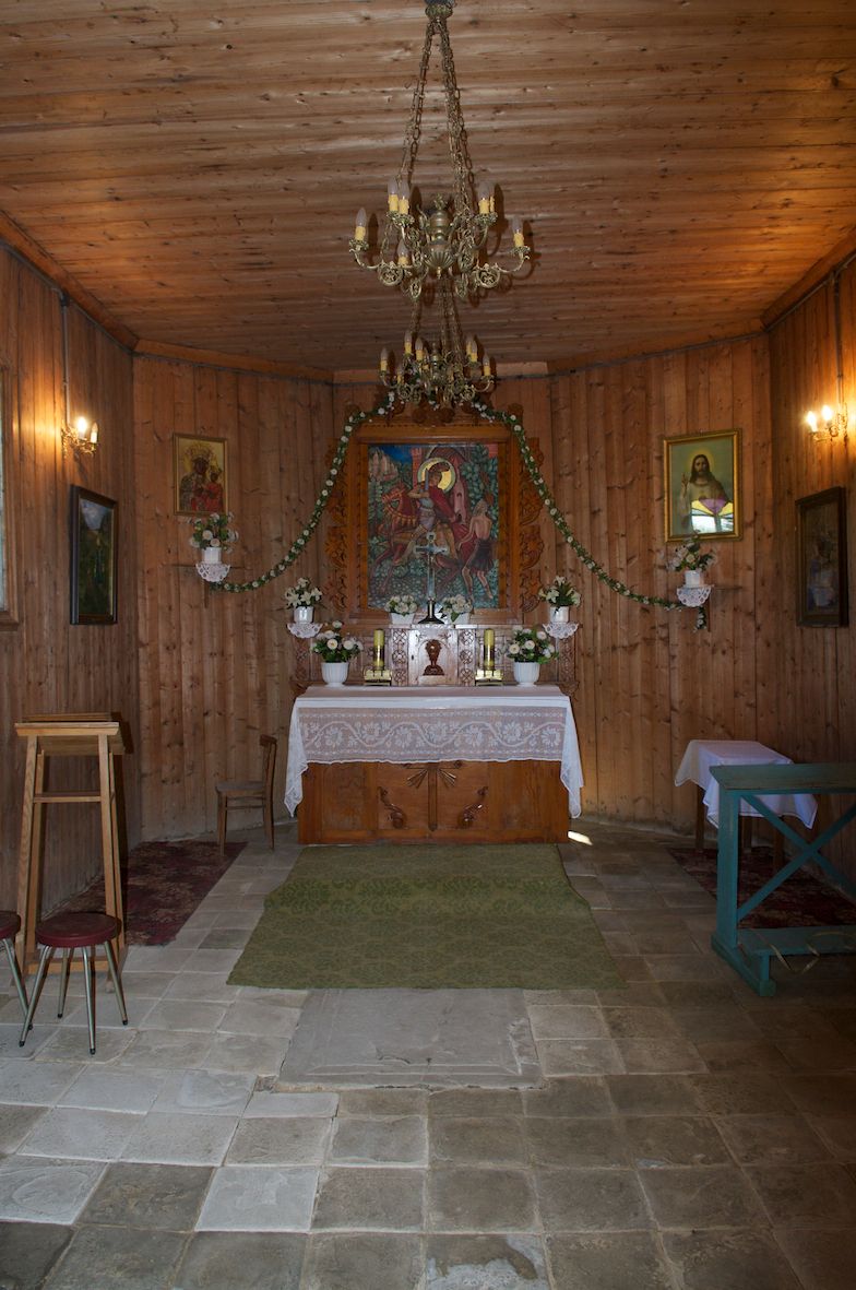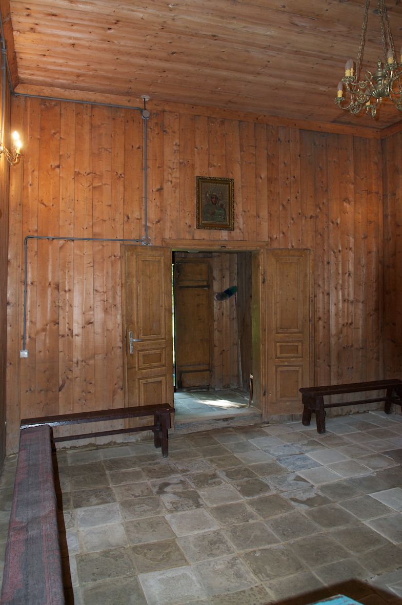 Wnętrze nakryte stropem belkowym z deskową podsufitką. Ściany pokryte listwowymi boazeriami. Posadzka kamienna, a w niej umieszczone trzy płyty nagrobne, kamienne.