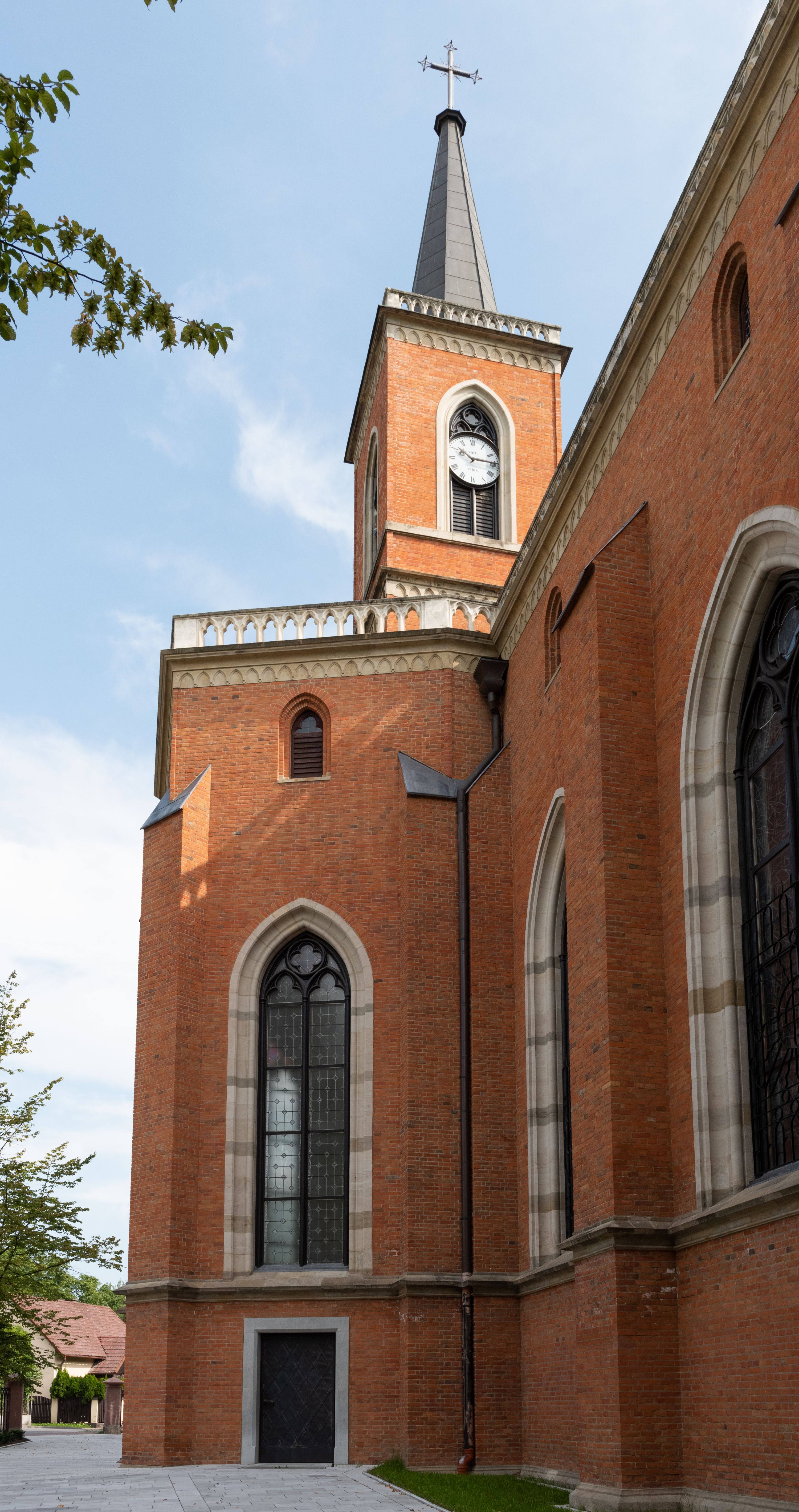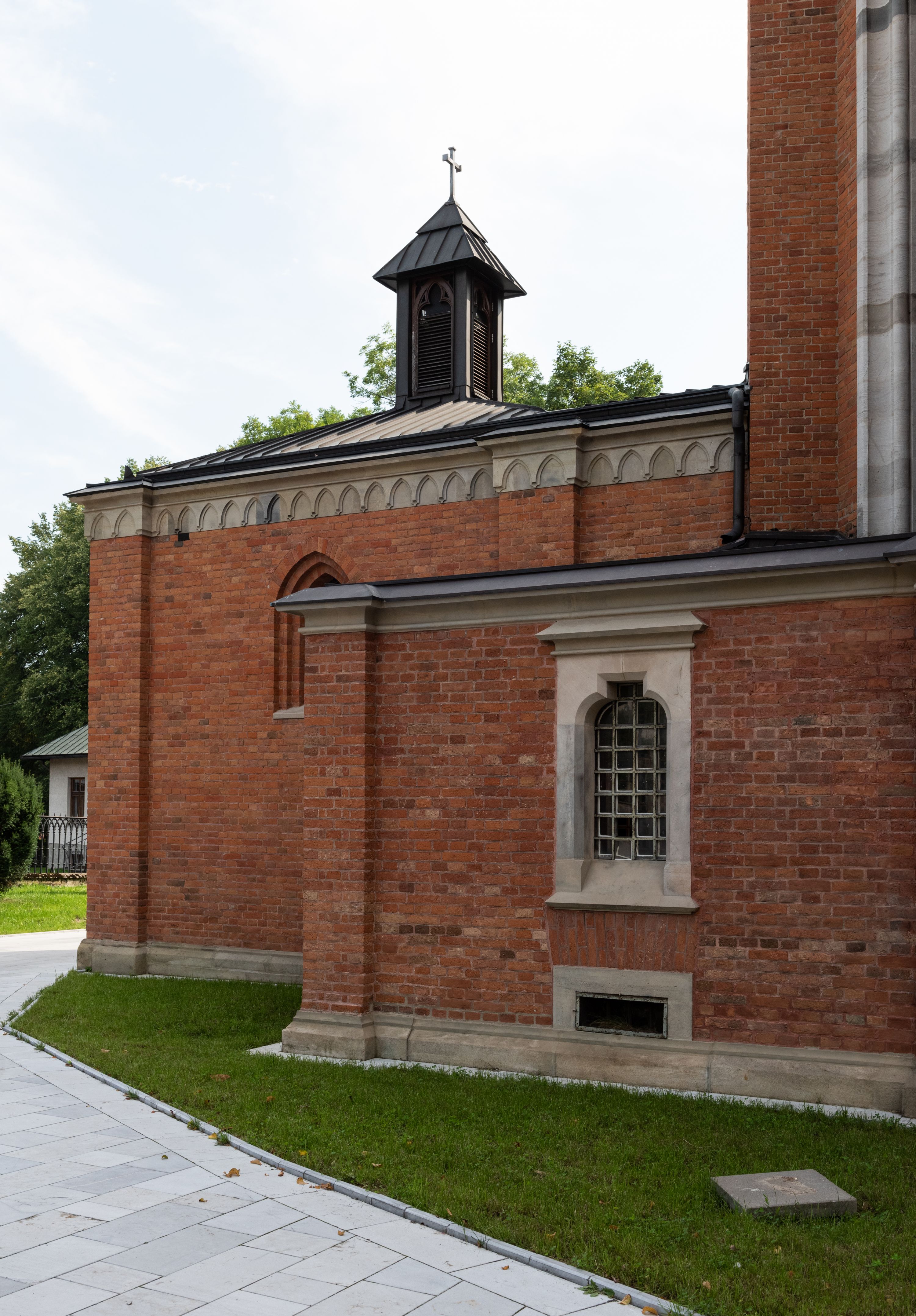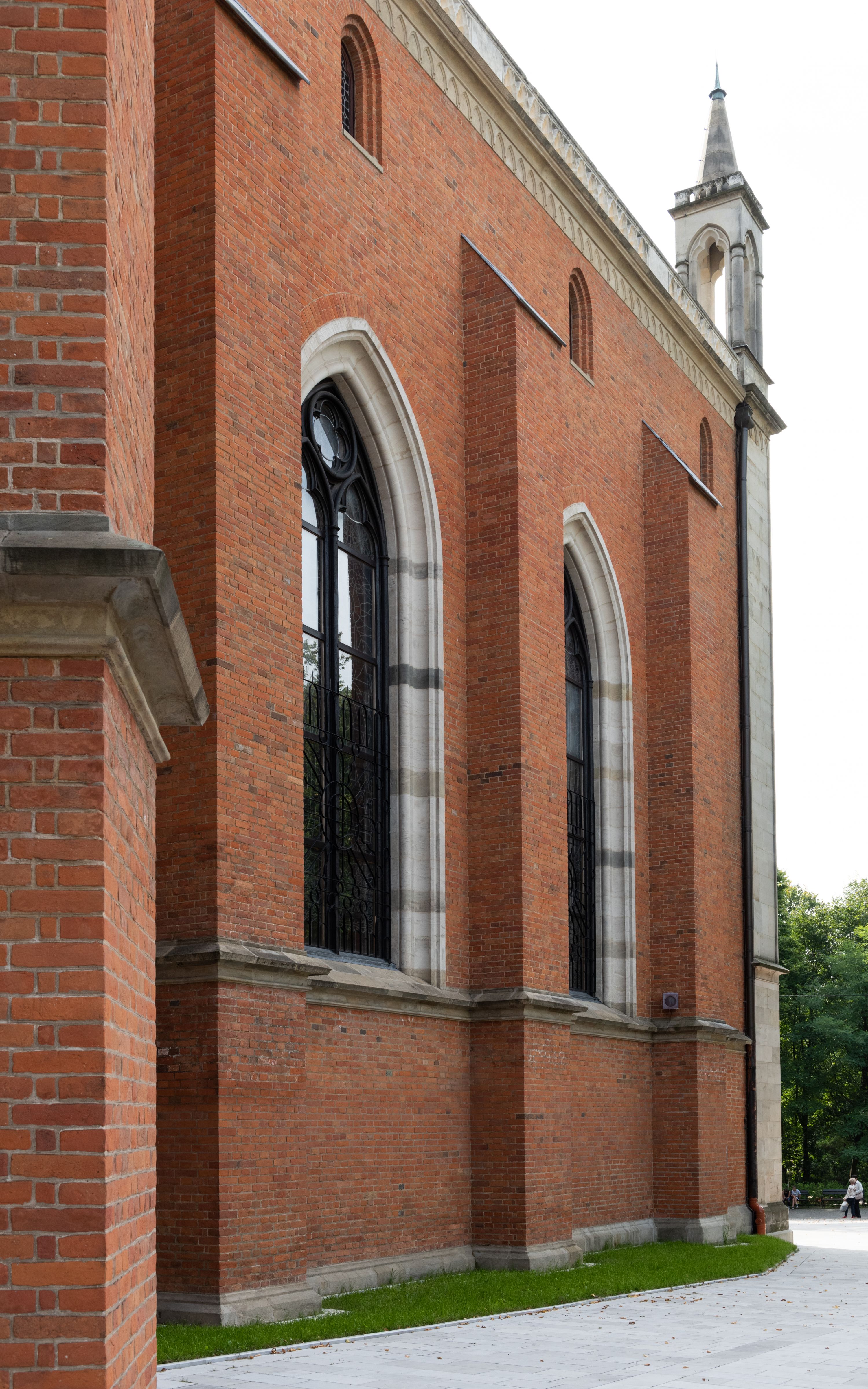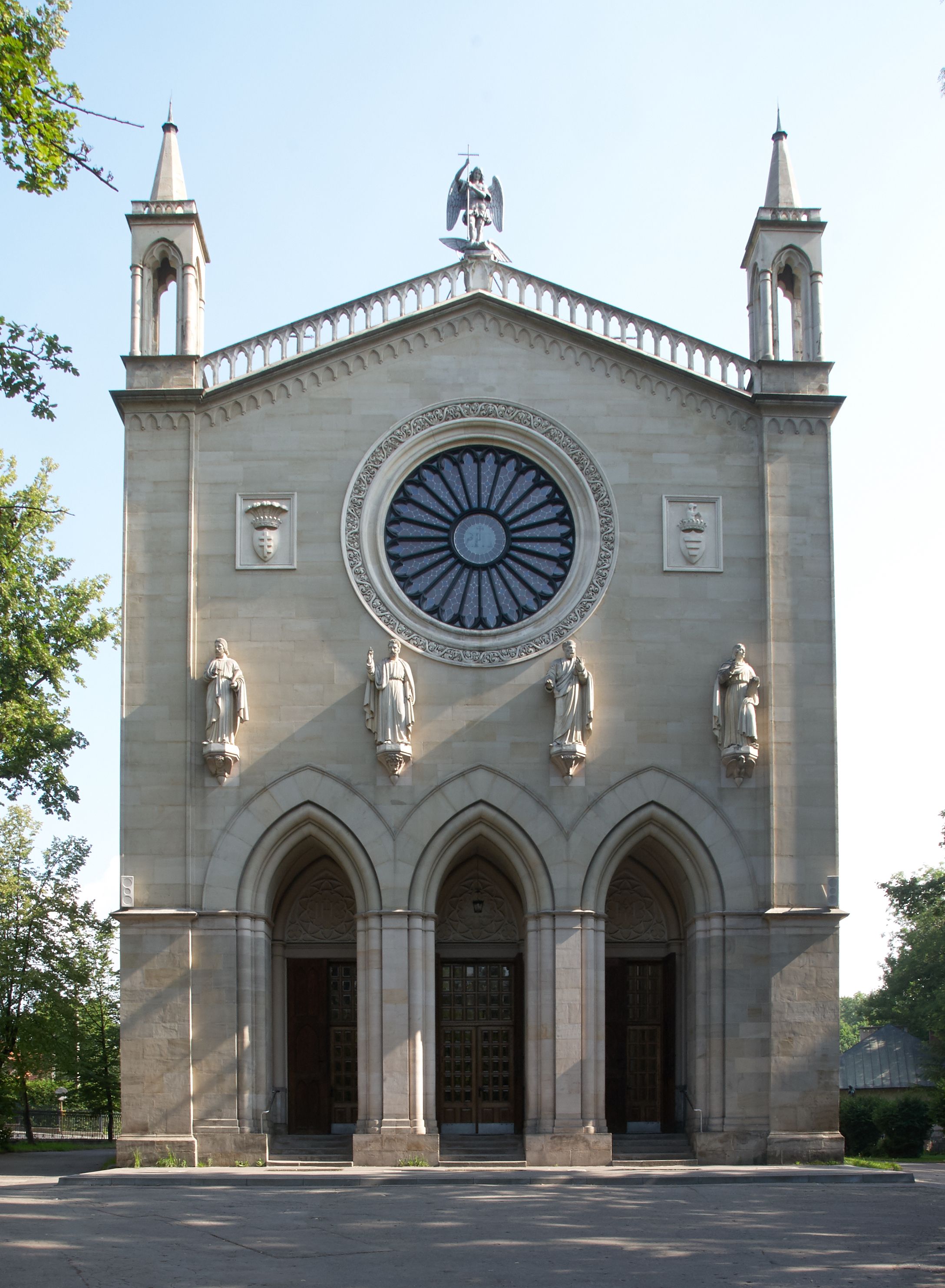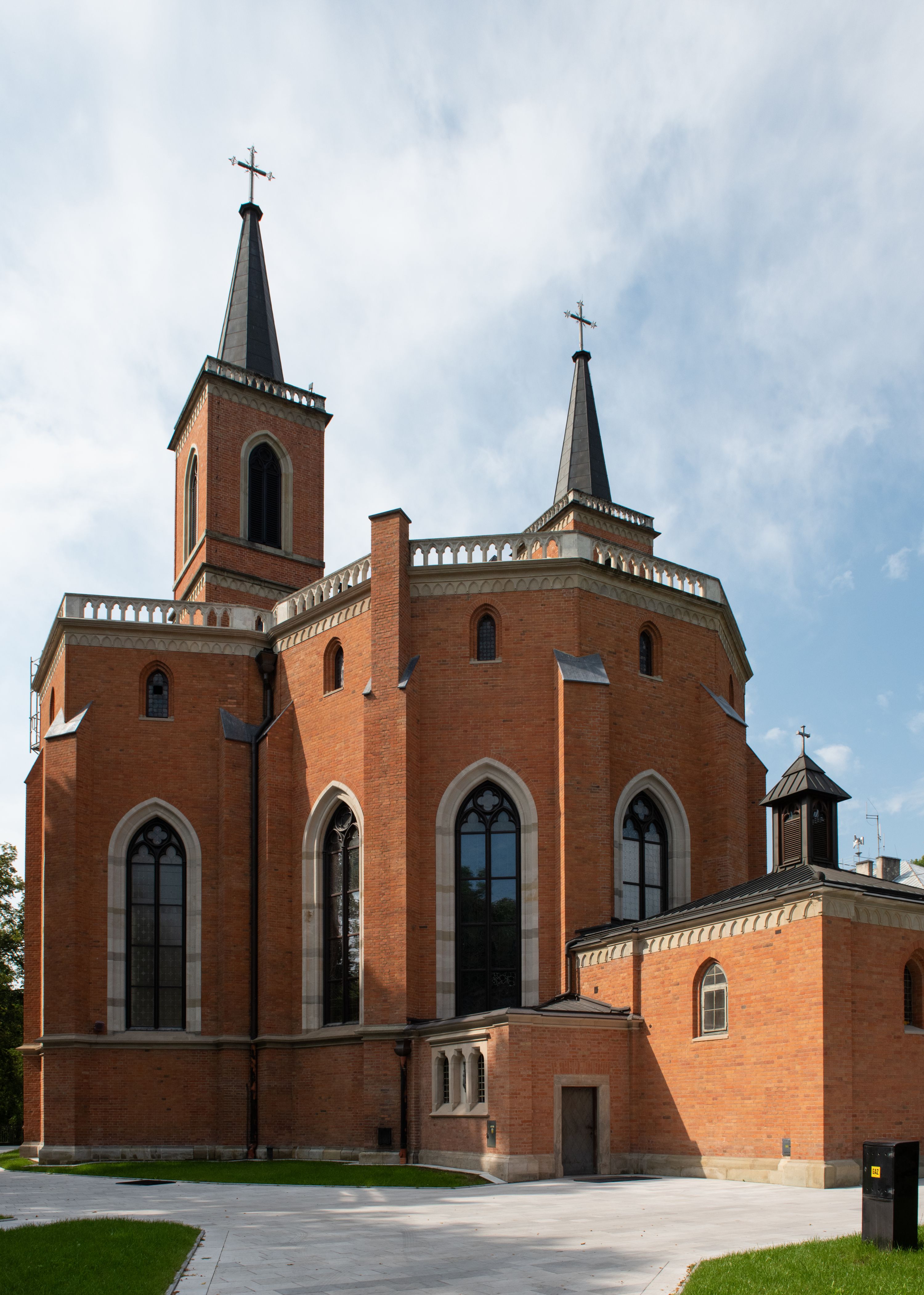 Kościół z cegły i kamienia. Na rzucie krzyża łacińskiego, jednonawowy z wciągniętymi do wnętrza przyporami. Prezbiterium krótkie, zamknięte pięcioma bokami ośmioboku. Korpus jednonawowy, czteroprzęsłowy, po bokach z płytkimi wnękami-kaplicami pomiędzy przyporami, poprzedzony od zach. przedsionkiem. Do pierwszego przęsła dostawione dwie symetryczne, trójboczne kaplice, nad nimi dwie czworoboczne wieże. Zakrystia przy prezbiterium na osi kościoła. Artykulacja ścian wnętrza za pomocą filarów opiętych półkolumnami z kapitelami z motywów liści. Między filarami rozpięte ostrołukowe arkady tworzące płytkie wnęki. Pierwsze przęsło wyróżnione przy pomocy masywnych filarów, ujętych niemal pełnoplastycznymi kolumnami. Okna ostrołukowe, dwudzielne z maswerkami, wsparte na gzymsach. Sklepienia krzyżowo-żebrowe na zaostrzonych gurtach. Kaplice artykułowane analogicznie do nawy kościoła, ze sklepieniami gwiaździstymi. Przedsionek otwiera się do kościoła trzema portalami ostrołukowymi opiętymi kolumnami. W polach archiwolt płaskorzeźby: Boże Narodzenie, Ukrzyżowanie, Wniebowstąpienie (K. Ceptowski). W prezbiterium, na osi kościoła prostokątny otwór drzwiowy prowadzący do zakrystii. Chór muzyczny umieszczony nad kruchtą kościoła, na rzucie prostokąta, z kamienną balustradą maswerkową. Fasada kamienna, trójosiowa, zamknięta trójkątnie, flankowana lizenami przechodzącymi w ażurowe wieżyczki-latarnie, na rzucie kwadratu. Wieżyczki zwieńczone gzymsem i balustradą arkadową, hełmy ostrosłupowy zakończony iglicą. W dolnej części trzy filarowe arkady ostrołukowe, otwierające się do kruchty, sklepienie kruchty krzyżowo-żebrowe. Nad arkadami wejściowymi trzy tonda: litery IHS, Oko Opatrzności i splecione litery imienia Maria. Pośrodku na osi kościoła duża rozeta z maswerkiem, profilowana, otoczona pierścieniem wypełnionym stylizowanym ornamentem roślinnym. Ponad arkadami pełnoplastyczne figury czterech ewangelistów ustawionych na konsolach z rzeźbionymi atrybutami (F. Kuhn). Po bokach rozety prostokątne płyciny z traczami herbowymi Potockich i Branickich. U góry, na osi fasady figura Archanioła Michała. Elewacje na kamiennym cokole, z gzymsem kapnikowym, opięte prostokątnymi przyporami zwieńczonymi kamiennymi nakrywami. W górnej części kamienny fryz arkadkowy. Nad nim gzyms koronujący podtrzymujący ażurową, arkadową balustradę. Przy prezbiterium kaplice zamknięte trójbocznie, prezbiterium zamknięte pięciobocznie. Zakrystia na osi prezbiterium, na rzucie prostokąta, zwieńczona sygnaturką i ceglanym kominem. Po bokach prostokątne aneksy, południowy aneks - trzy okna ostrołukowe w kamiennej opasce, w środkowym przedstawienie Ukrzyżowanego Chrystusa. W północnym aneksie pojedyncze analogiczne okno. Okna ostrołukowe w profilowanych kamiennych opaskach, pomiędzy nimi a gzymsem koronującym mniejsze ostrołukowe w uskokowych arkadach. Nad kaplicami bocznymi dwie symetryczne wieże na rzucie kwadratu, w połowie wysokości kamienny gzyms z fryzem arkadkowym. Okna ostrołukowe w kamiennej opasce. Całość zwieńczona ślepym fryzem arkadkowym, wyżej gzyms dźwigający ażurową arkadkową balustradę. Hełmy ostrosłupowe, miedziane. Zakrystia na rzucie prostokąta, nakryta sklepieniem kolebkowym zaostrzonym i krzyżowym z lunetami , oddzielone gurtem. Portale od wschodu i zachodu prostokątne zamknięte łukiem ostrym. Okna ostrołukowe.