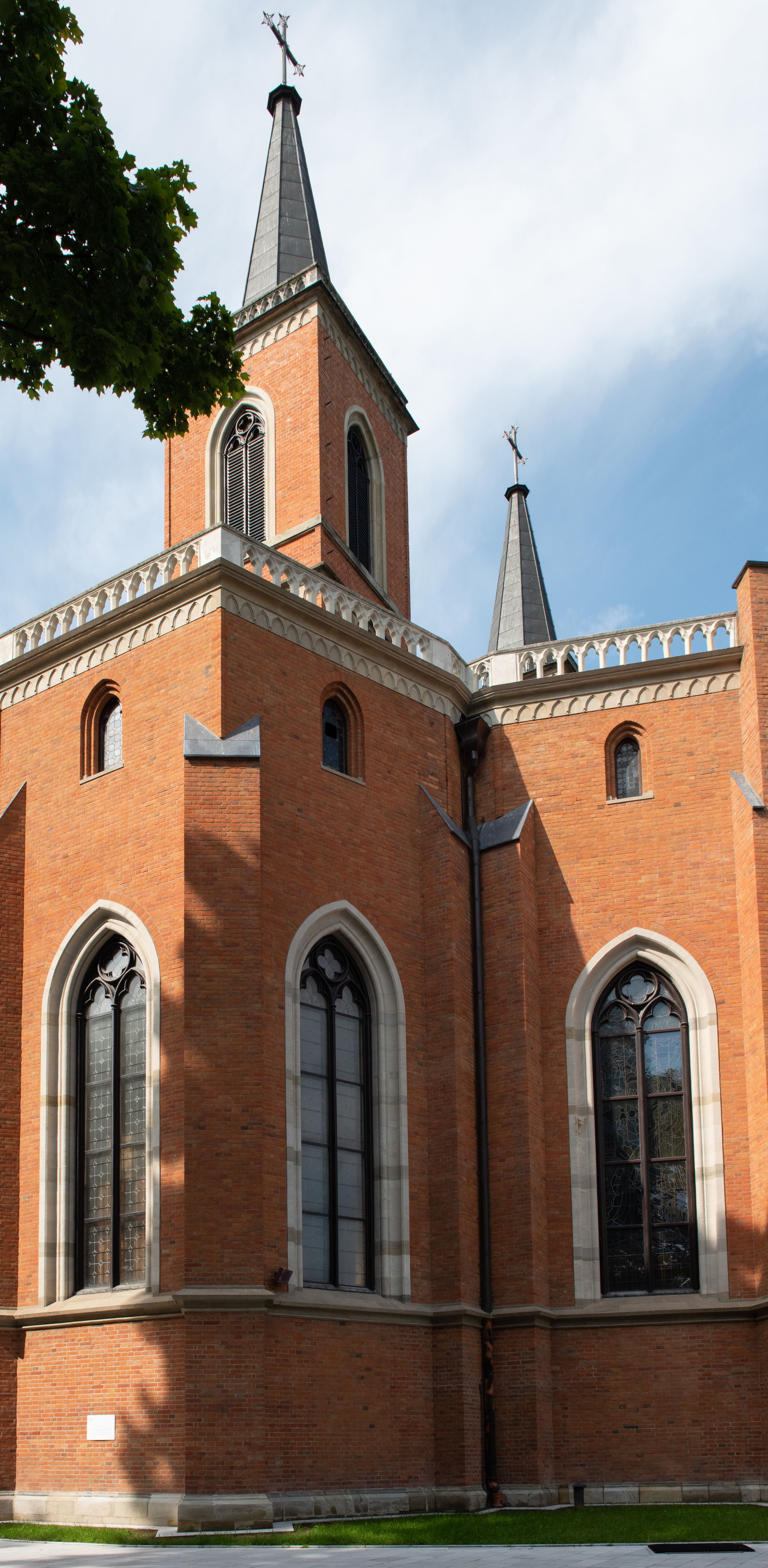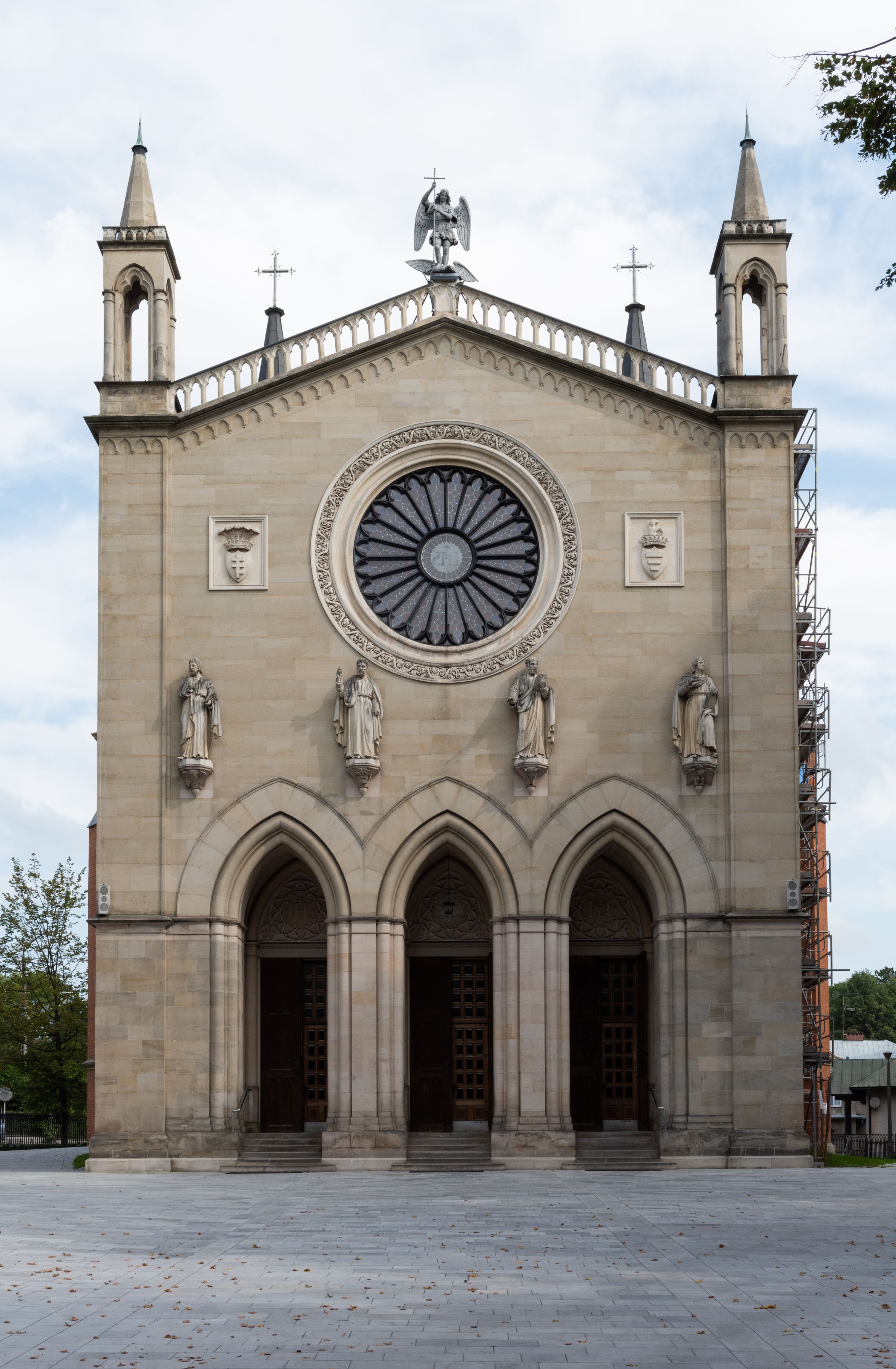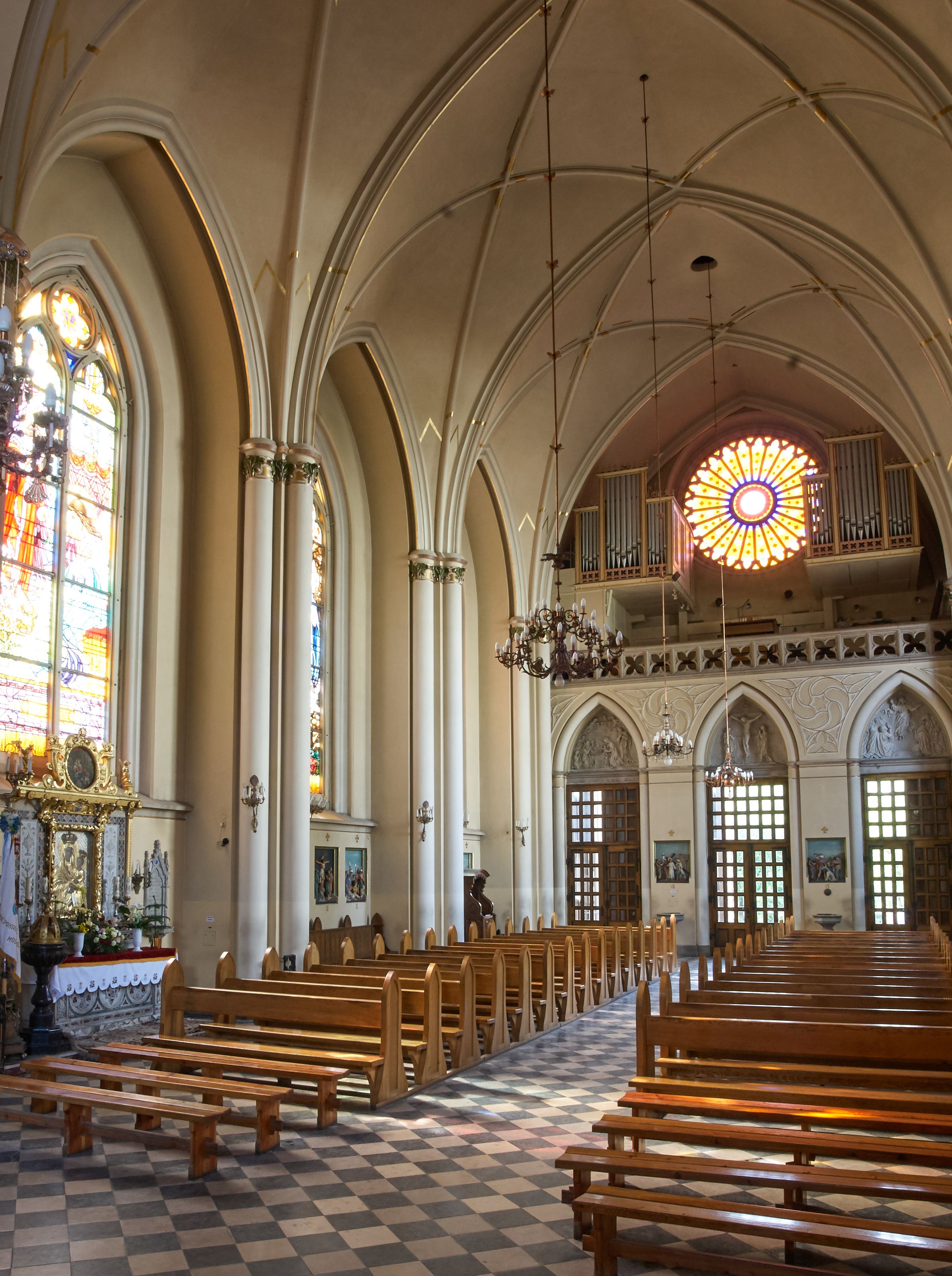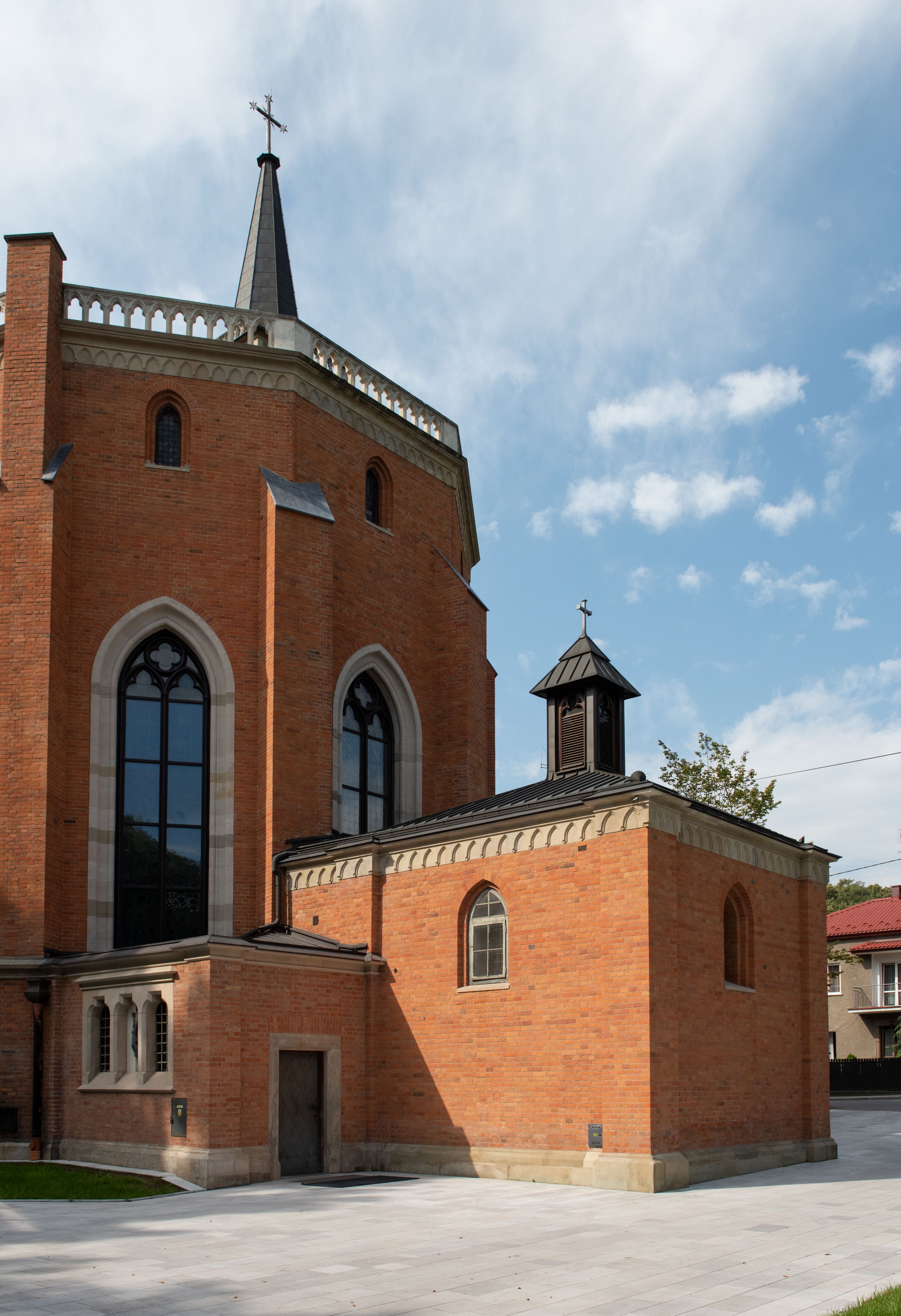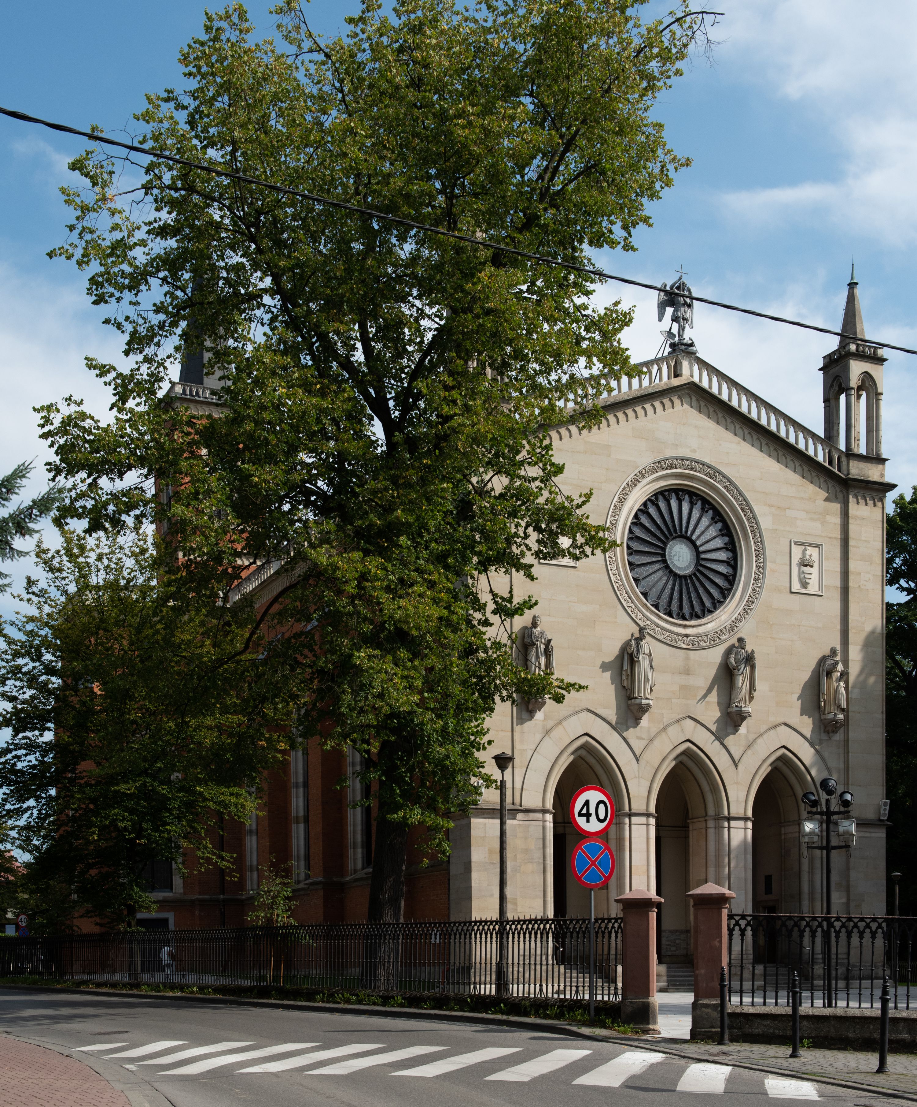 Kościół z cegły i kamienia. Na rzucie krzyża łacińskiego, jednonawowy z wciągniętymi do wnętrza przyporami. Prezbiterium krótkie, zamknięte pięcioma bokami ośmioboku. Korpus jednonawowy, czteroprzęsłowy, po bokach z płytkimi wnękami-kaplicami pomiędzy przyporami, poprzedzony od zach. przedsionkiem. Do pierwszego przęsła dostawione dwie symetryczne, trójboczne kaplice, nad nimi dwie czworoboczne wieże. Zakrystia przy prezbiterium na osi kościoła. Artykulacja ścian wnętrza za pomocą filarów opiętych półkolumnami z kapitelami z motywów liści. Między filarami rozpięte ostrołukowe arkady tworzące płytkie wnęki. Pierwsze przęsło wyróżnione przy pomocy masywnych filarów, ujętych niemal pełnoplastycznymi kolumnami. Okna ostrołukowe, dwudzielne z maswerkami, wsparte na gzymsach. Sklepienia krzyżowo-żebrowe na zaostrzonych gurtach. Kaplice artykułowane analogicznie do nawy kościoła, ze sklepieniami gwiaździstymi. Przedsionek otwiera się do kościoła trzema portalami ostrołukowymi opiętymi kolumnami. W polach archiwolt płaskorzeźby: Boże Narodzenie, Ukrzyżowanie, Wniebowstąpienie (K. Ceptowski). W prezbiterium, na osi kościoła prostokątny otwór drzwiowy prowadzący do zakrystii. Chór muzyczny umieszczony nad kruchtą kościoła, na rzucie prostokąta, z kamienną balustradą maswerkową. Fasada kamienna, trójosiowa, zamknięta trójkątnie, flankowana lizenami przechodzącymi w ażurowe wieżyczki-latarnie, na rzucie kwadratu. Wieżyczki zwieńczone gzymsem i balustradą arkadową, hełmy ostrosłupowy zakończony iglicą. W dolnej części trzy filarowe arkady ostrołukowe, otwierające się do kruchty, sklepienie kruchty krzyżowo-żebrowe. Nad arkadami wejściowymi trzy tonda: litery IHS, Oko Opatrzności i splecione litery imienia Maria. Pośrodku na osi kościoła duża rozeta z maswerkiem, profilowana, otoczona pierścieniem wypełnionym stylizowanym ornamentem roślinnym. Ponad arkadami pełnoplastyczne figury czterech ewangelistów ustawionych na konsolach z rzeźbionymi atrybutami (F. Kuhn). Po bokach rozety prostokątne płyciny z traczami herbowymi Potockich i Branickich. U góry, na osi fasady figura Archanioła Michała. Elewacje na kamiennym cokole, z gzymsem kapnikowym, opięte prostokątnymi przyporami zwieńczonymi kamiennymi nakrywami. W górnej części kamienny fryz arkadkowy. Nad nim gzyms koronujący podtrzymujący ażurową, arkadową balustradę. Przy prezbiterium kaplice zamknięte trójbocznie, prezbiterium zamknięte pięciobocznie. Zakrystia na osi prezbiterium, na rzucie prostokąta, zwieńczona sygnaturką i ceglanym kominem. Po bokach prostokątne aneksy, południowy aneks - trzy okna ostrołukowe w kamiennej opasce, w środkowym przedstawienie Ukrzyżowanego Chrystusa. W północnym aneksie pojedyncze analogiczne okno. Okna ostrołukowe w profilowanych kamiennych opaskach, pomiędzy nimi a gzymsem koronującym mniejsze ostrołukowe w uskokowych arkadach. Nad kaplicami bocznymi dwie symetryczne wieże na rzucie kwadratu, w połowie wysokości kamienny gzyms z fryzem arkadkowym. Okna ostrołukowe w kamiennej opasce. Całość zwieńczona ślepym fryzem arkadkowym, wyżej gzyms dźwigający ażurową arkadkową balustradę. Hełmy ostrosłupowe, miedziane. Zakrystia na rzucie prostokąta, nakryta sklepieniem kolebkowym zaostrzonym i krzyżowym z lunetami , oddzielone gurtem. Portale od wschodu i zachodu prostokątne zamknięte łukiem ostrym. Okna ostrołukowe.