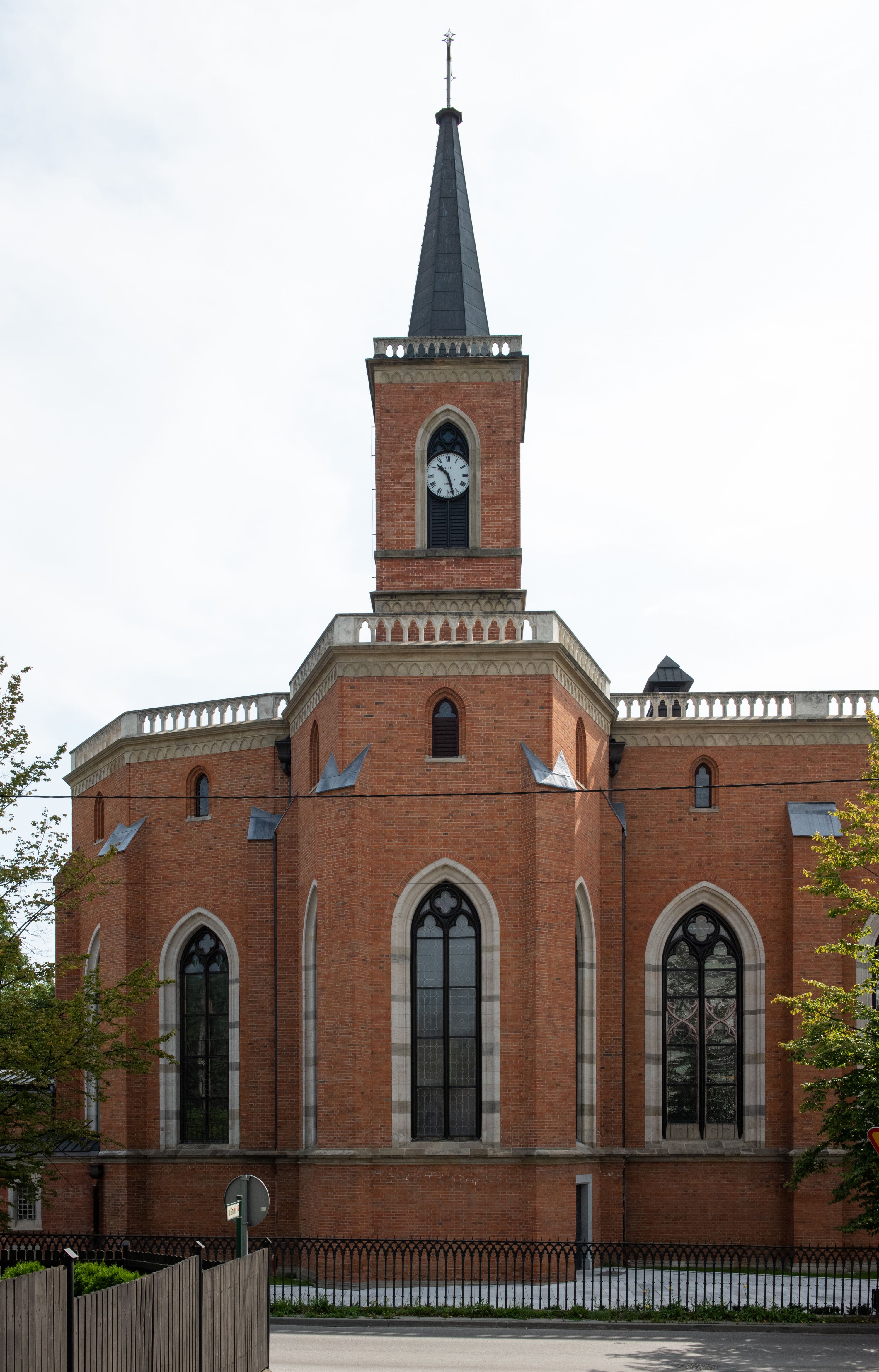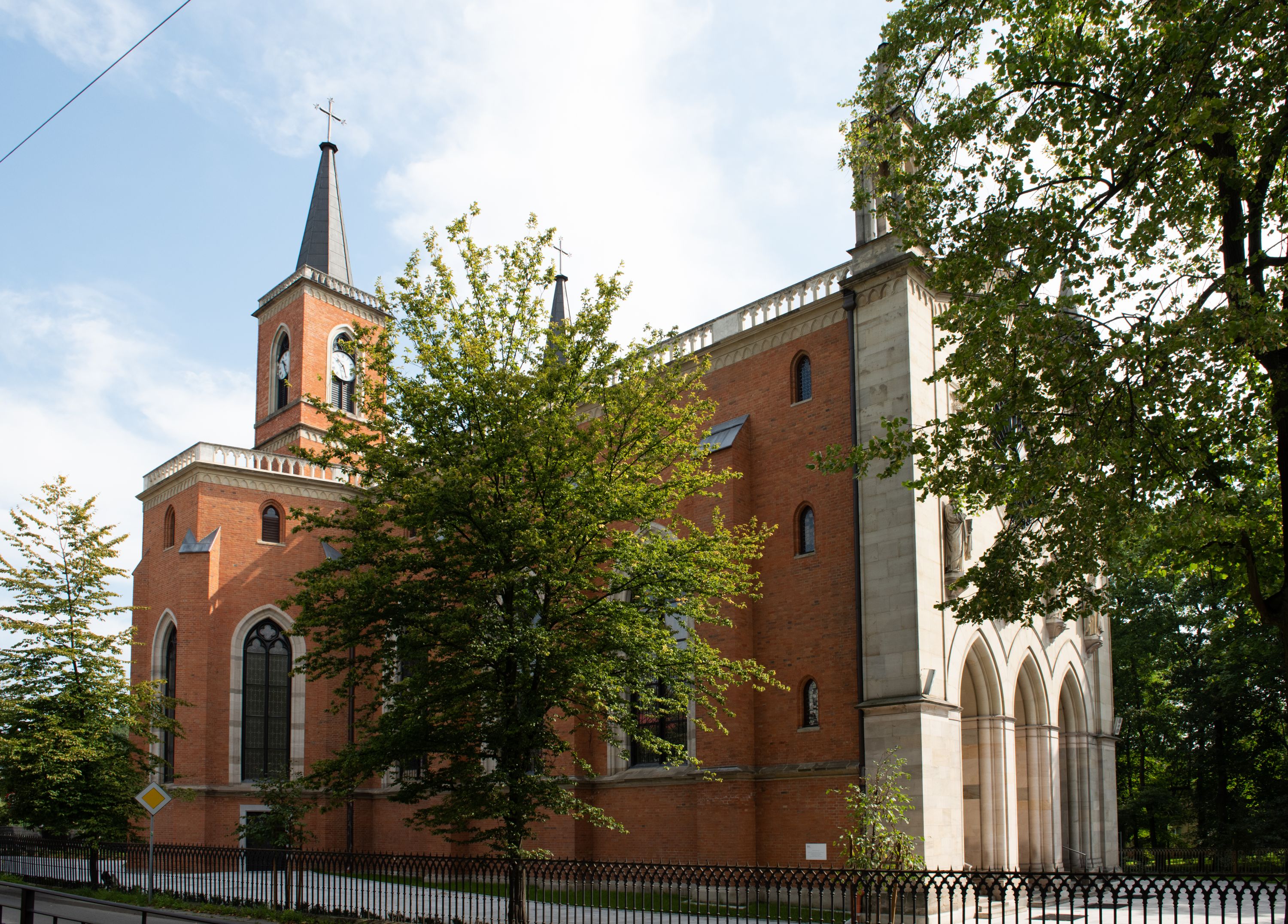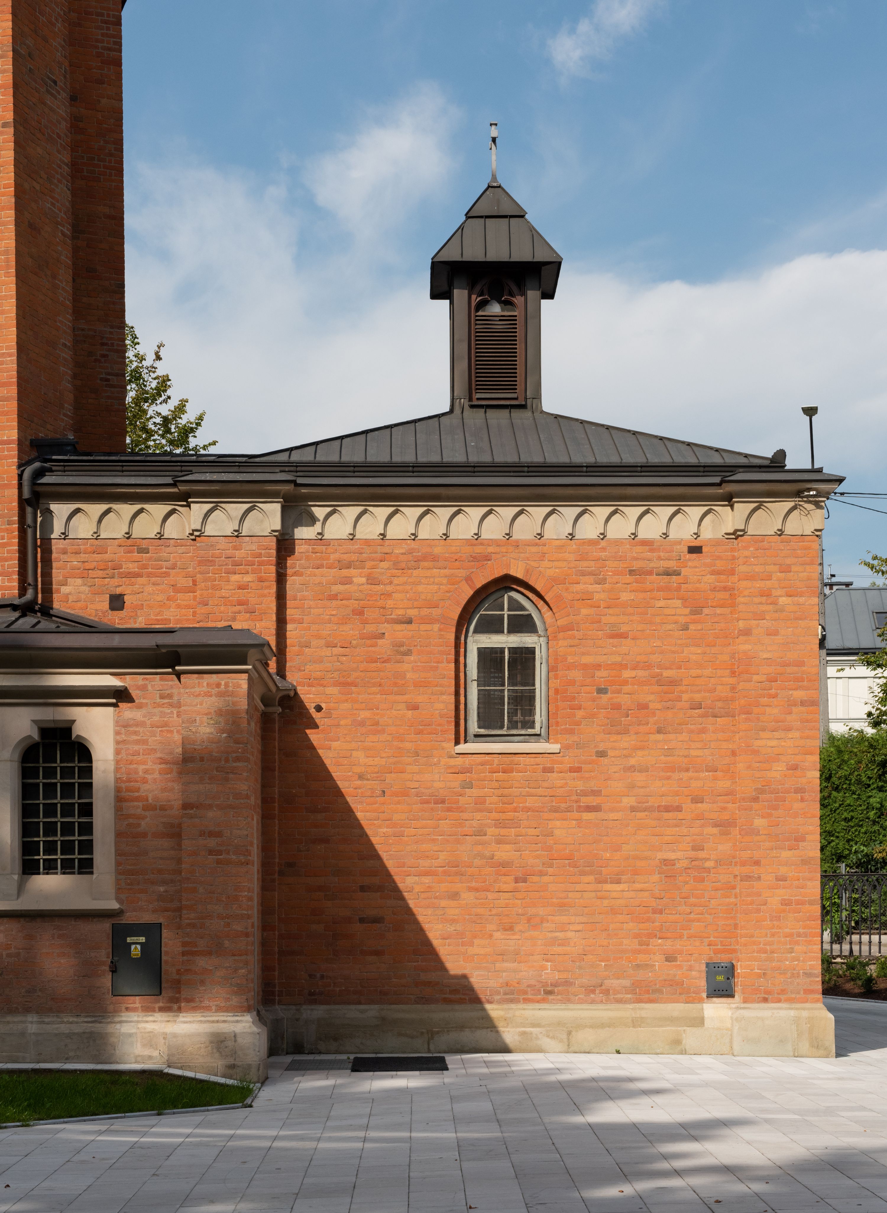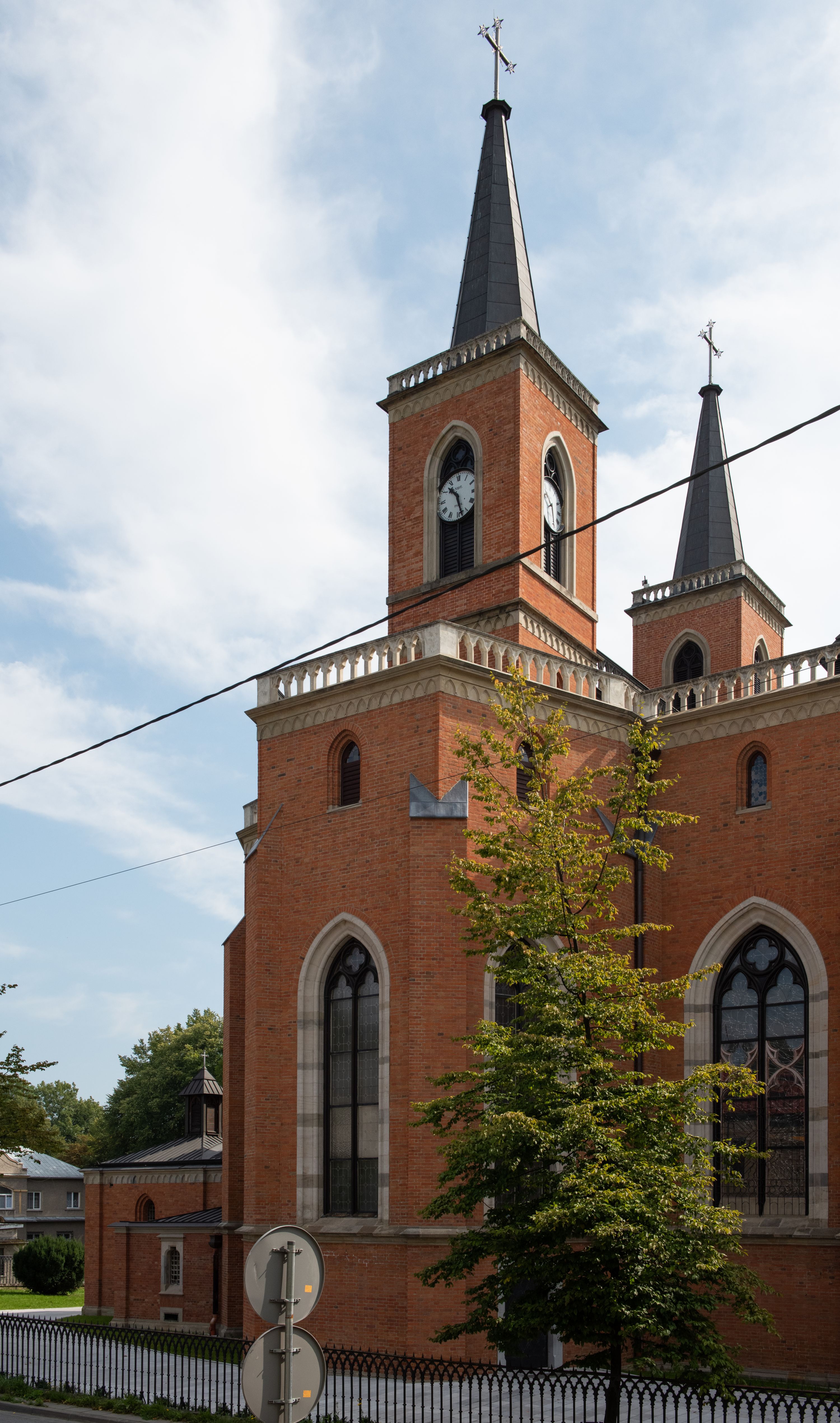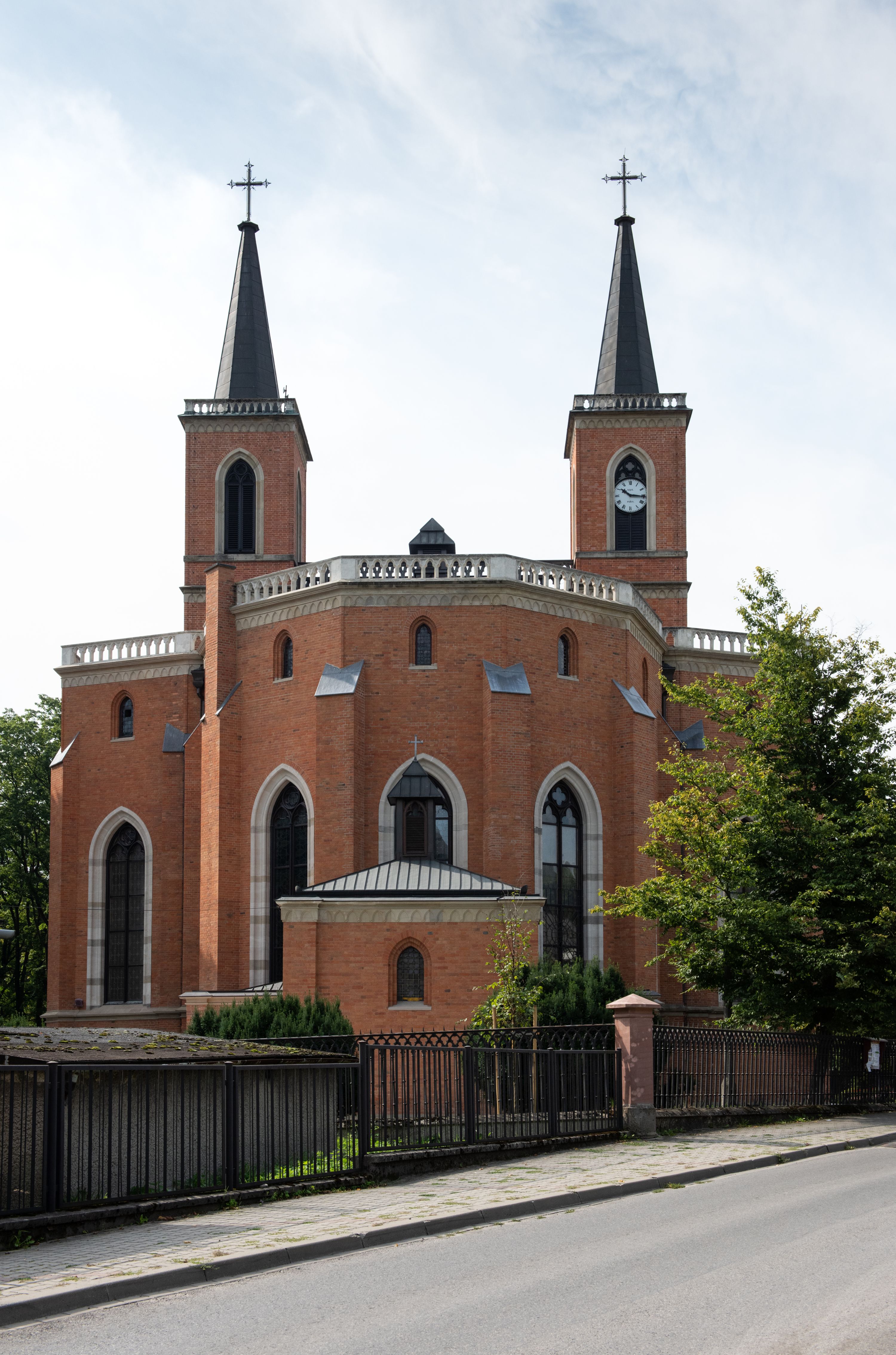 Kościół z cegły i kamienia. Na rzucie krzyża łacińskiego, jednonawowy z wciągniętymi do wnętrza przyporami. Prezbiterium krótkie, zamknięte pięcioma bokami ośmioboku. Korpus jednonawowy, czteroprzęsłowy, po bokach z płytkimi wnękami-kaplicami pomiędzy przyporami, poprzedzony od zach. przedsionkiem. Do pierwszego przęsła dostawione dwie symetryczne, trójboczne kaplice, nad nimi dwie czworoboczne wieże. Zakrystia przy prezbiterium na osi kościoła. Artykulacja ścian wnętrza za pomocą filarów opiętych półkolumnami z kapitelami z motywów liści. Między filarami rozpięte ostrołukowe arkady tworzące płytkie wnęki. Pierwsze przęsło wyróżnione przy pomocy masywnych filarów, ujętych niemal pełnoplastycznymi kolumnami. Okna ostrołukowe, dwudzielne z maswerkami, wsparte na gzymsach. Sklepienia krzyżowo-żebrowe na zaostrzonych gurtach. Kaplice artykułowane analogicznie do nawy kościoła, ze sklepieniami gwiaździstymi. Przedsionek otwiera się do kościoła trzema portalami ostrołukowymi opiętymi kolumnami. W polach archiwolt płaskorzeźby: Boże Narodzenie, Ukrzyżowanie, Wniebowstąpienie (K. Ceptowski). W prezbiterium, na osi kościoła prostokątny otwór drzwiowy prowadzący do zakrystii. Chór muzyczny umieszczony nad kruchtą kościoła, na rzucie prostokąta, z kamienną balustradą maswerkową. Fasada kamienna, trójosiowa, zamknięta trójkątnie, flankowana lizenami przechodzącymi w ażurowe wieżyczki-latarnie, na rzucie kwadratu. Wieżyczki zwieńczone gzymsem i balustradą arkadową, hełmy ostrosłupowy zakończony iglicą. W dolnej części trzy filarowe arkady ostrołukowe, otwierające się do kruchty, sklepienie kruchty krzyżowo-żebrowe. Nad arkadami wejściowymi trzy tonda: litery IHS, Oko Opatrzności i splecione litery imienia Maria. Pośrodku na osi kościoła duża rozeta z maswerkiem, profilowana, otoczona pierścieniem wypełnionym stylizowanym ornamentem roślinnym. Ponad arkadami pełnoplastyczne figury czterech ewangelistów ustawionych na konsolach z rzeźbionymi atrybutami (F. Kuhn). Po bokach rozety prostokątne płyciny z traczami herbowymi Potockich i Branickich. U góry, na osi fasady figura Archanioła Michała. Elewacje na kamiennym cokole, z gzymsem kapnikowym, opięte prostokątnymi przyporami zwieńczonymi kamiennymi nakrywami. W górnej części kamienny fryz arkadkowy. Nad nim gzyms koronujący podtrzymujący ażurową, arkadową balustradę. Przy prezbiterium kaplice zamknięte trójbocznie, prezbiterium zamknięte pięciobocznie. Zakrystia na osi prezbiterium, na rzucie prostokąta, zwieńczona sygnaturką i ceglanym kominem. Po bokach prostokątne aneksy, południowy aneks - trzy okna ostrołukowe w kamiennej opasce, w środkowym przedstawienie Ukrzyżowanego Chrystusa. W północnym aneksie pojedyncze analogiczne okno. Okna ostrołukowe w profilowanych kamiennych opaskach, pomiędzy nimi a gzymsem koronującym mniejsze ostrołukowe w uskokowych arkadach. Nad kaplicami bocznymi dwie symetryczne wieże na rzucie kwadratu, w połowie wysokości kamienny gzyms z fryzem arkadkowym. Okna ostrołukowe w kamiennej opasce. Całość zwieńczona ślepym fryzem arkadkowym, wyżej gzyms dźwigający ażurową arkadkową balustradę. Hełmy ostrosłupowe, miedziane. Zakrystia na rzucie prostokąta, nakryta sklepieniem kolebkowym zaostrzonym i krzyżowym z lunetami , oddzielone gurtem. Portale od wschodu i zachodu prostokątne zamknięte łukiem ostrym. Okna ostrołukowe.