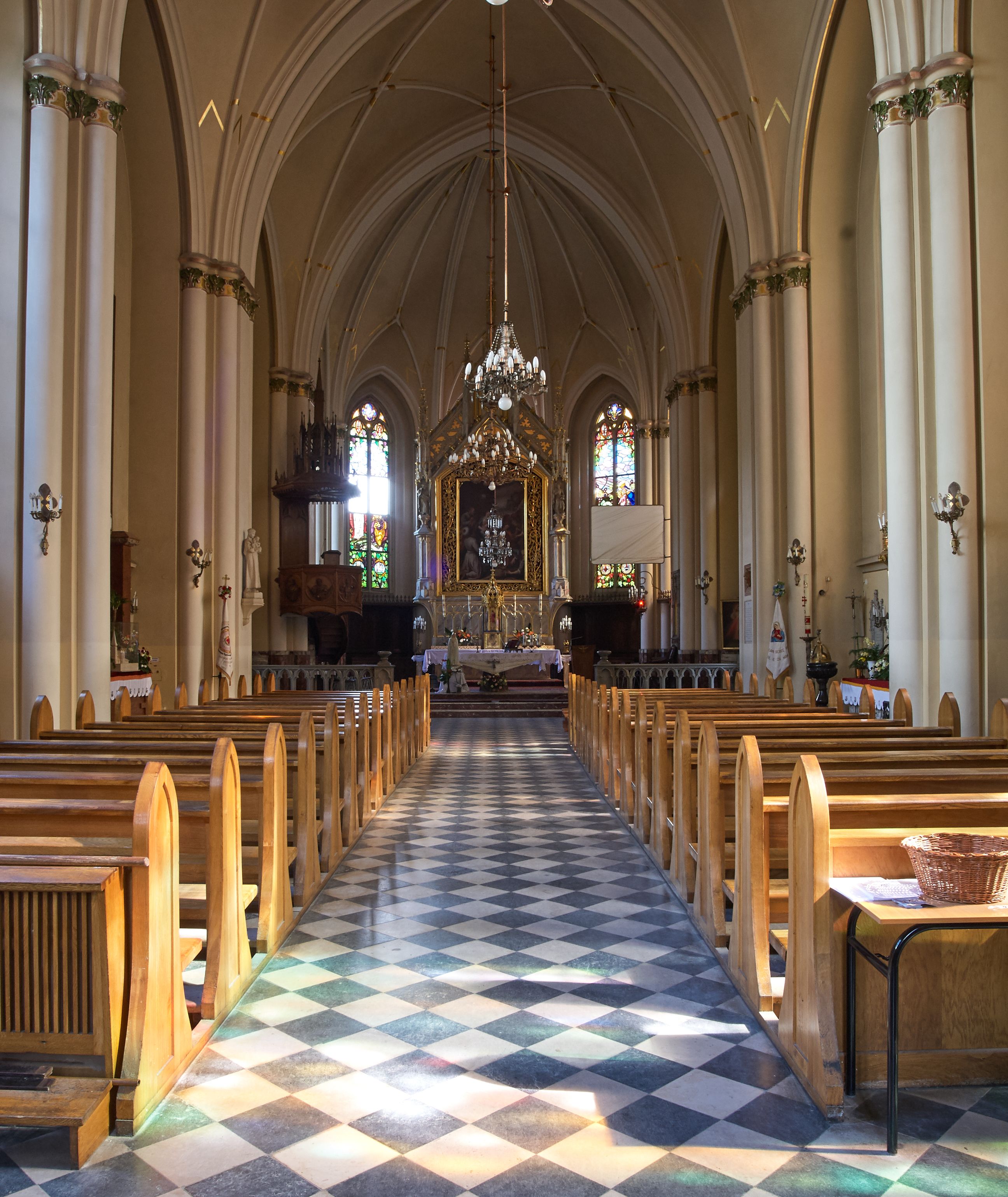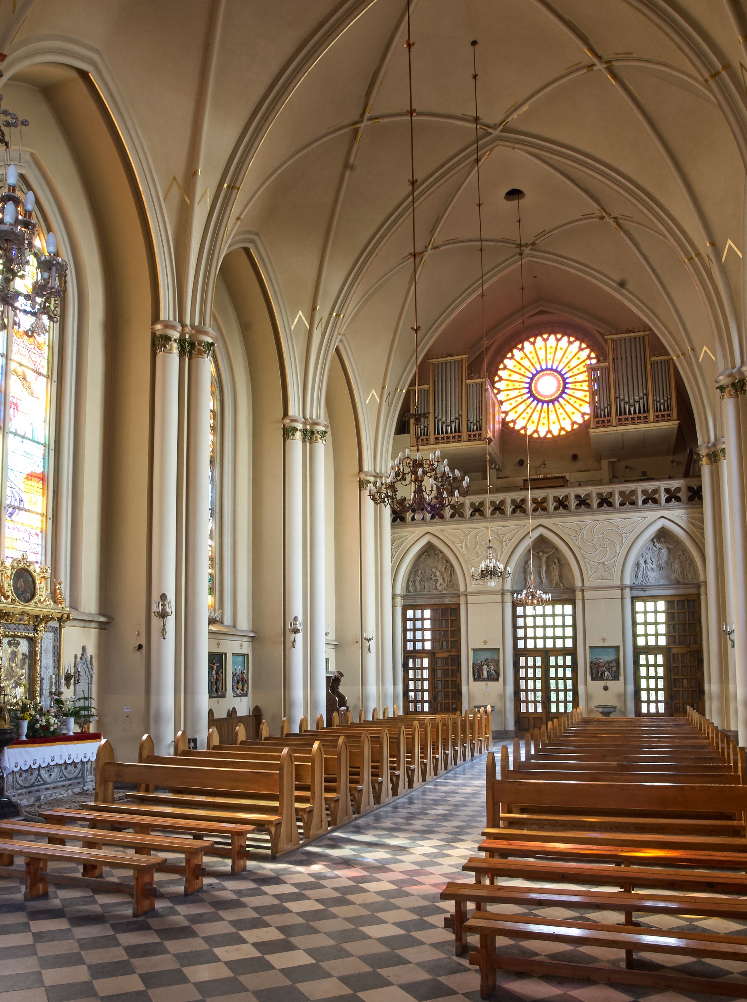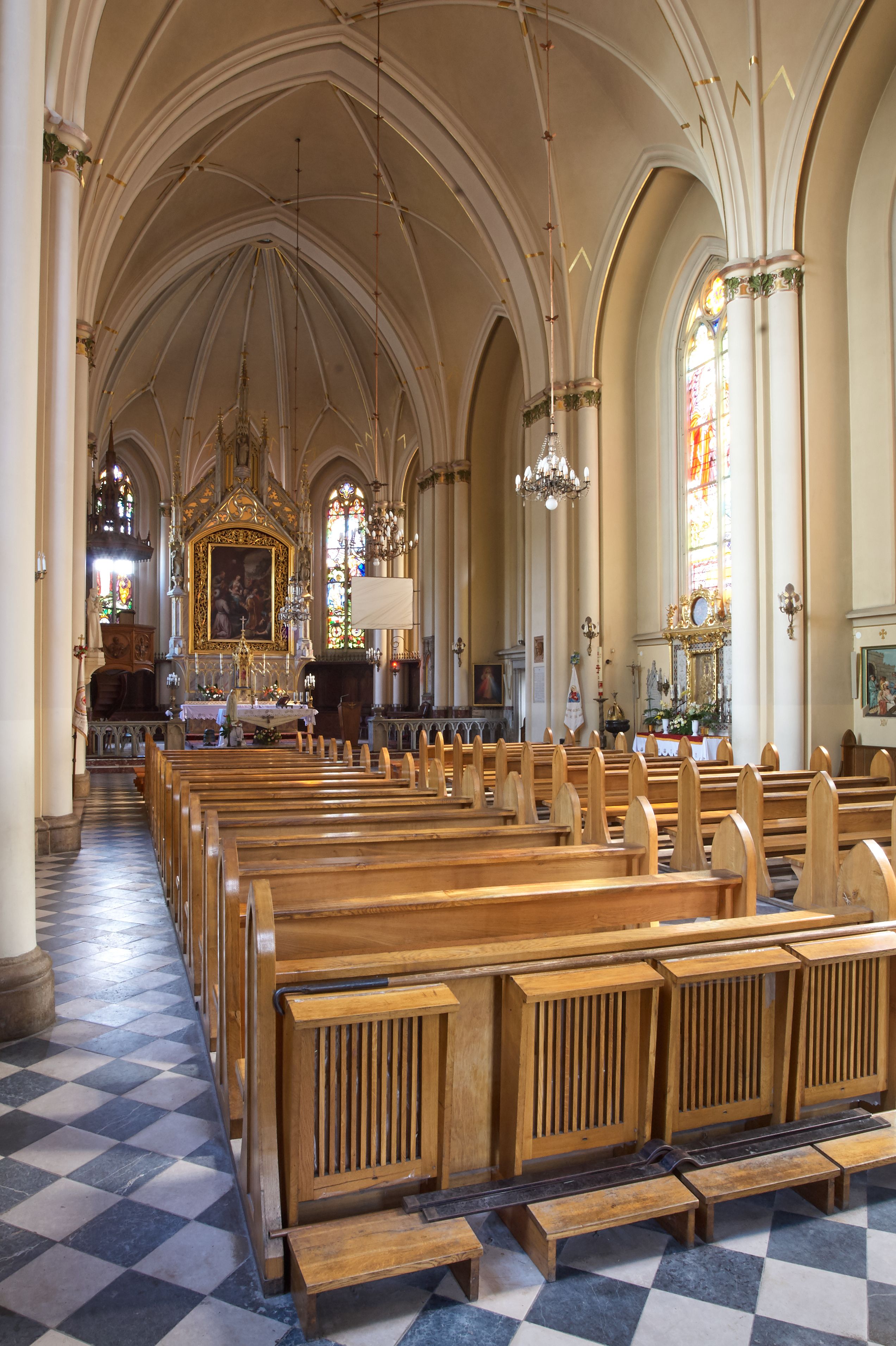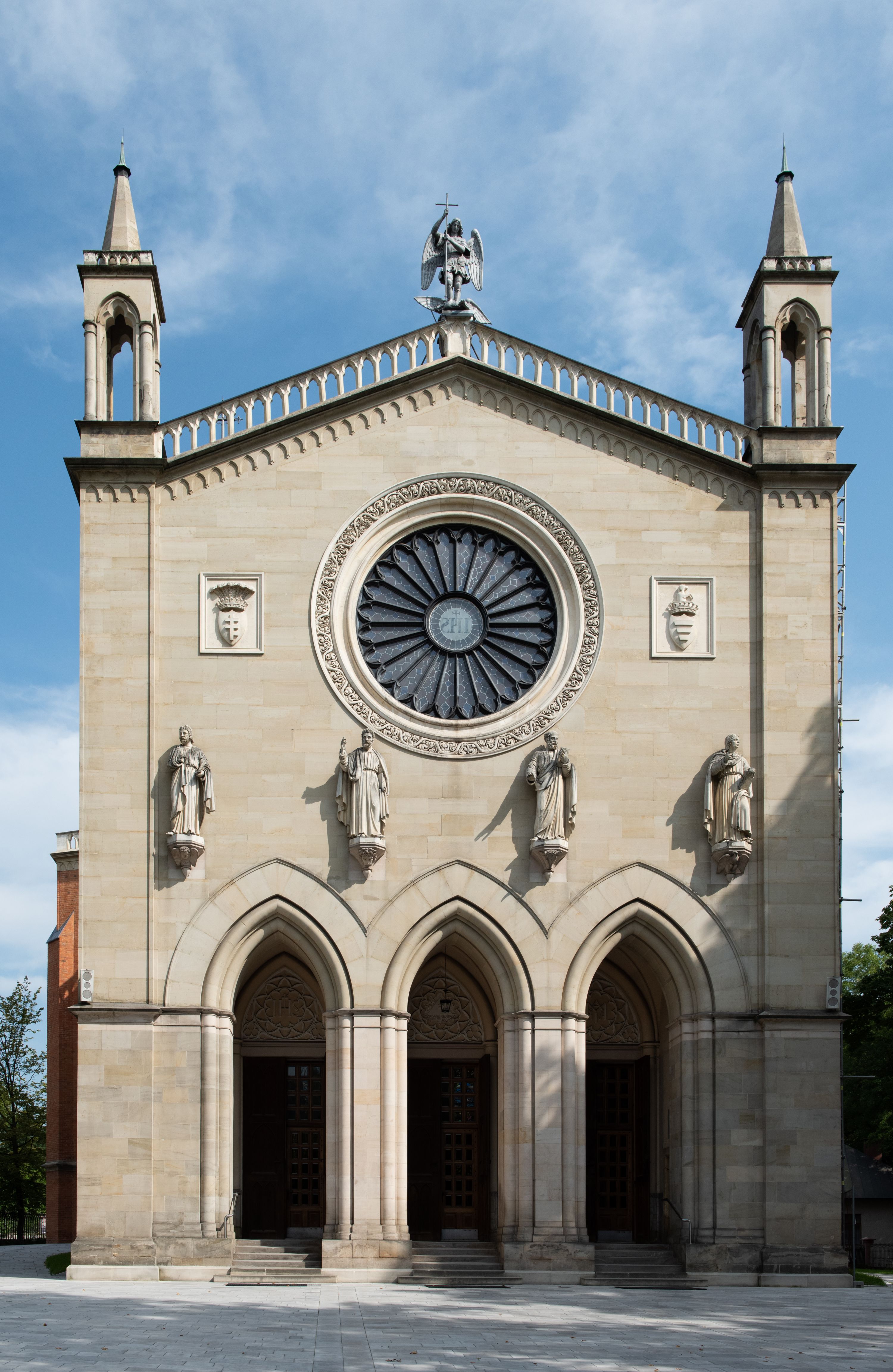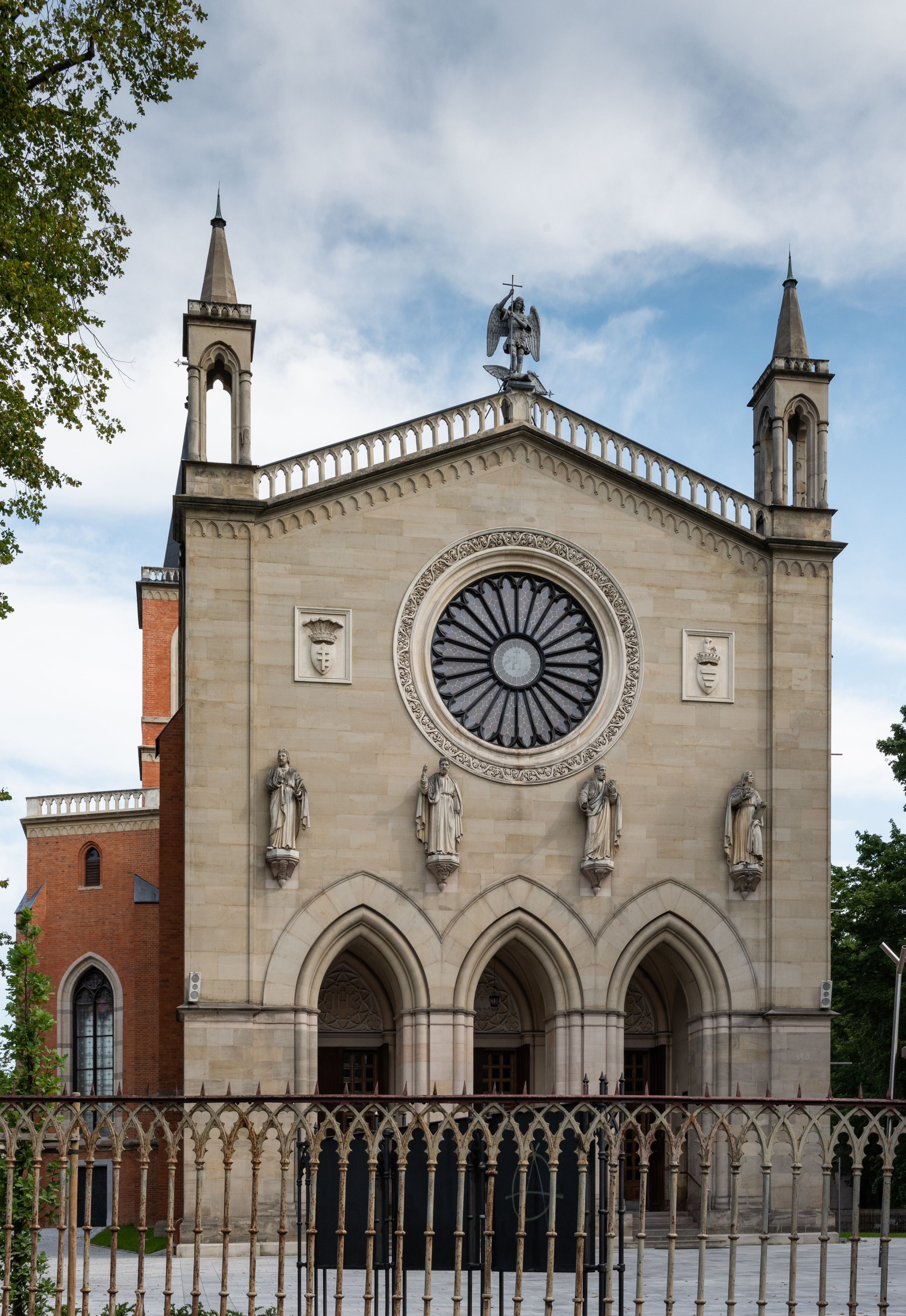 Kościół z cegły i kamienia. Na rzucie krzyża łacińskiego, jednonawowy z wciągniętymi do wnętrza przyporami. Prezbiterium krótkie, zamknięte pięcioma bokami ośmioboku. Korpus jednonawowy, czteroprzęsłowy, po bokach z płytkimi wnękami-kaplicami pomiędzy przyporami, poprzedzony od zach. przedsionkiem. Do pierwszego przęsła dostawione dwie symetryczne, trójboczne kaplice, nad nimi dwie czworoboczne wieże. Zakrystia przy prezbiterium na osi kościoła. Artykulacja ścian wnętrza za pomocą filarów opiętych półkolumnami z kapitelami z motywów liści. Między filarami rozpięte ostrołukowe arkady tworzące płytkie wnęki. Pierwsze przęsło wyróżnione przy pomocy masywnych filarów, ujętych niemal pełnoplastycznymi kolumnami. Okna ostrołukowe, dwudzielne z maswerkami, wsparte na gzymsach. Sklepienia krzyżowo-żebrowe na zaostrzonych gurtach. Kaplice artykułowane analogicznie do nawy kościoła, ze sklepieniami gwiaździstymi. Przedsionek otwiera się do kościoła trzema portalami ostrołukowymi opiętymi kolumnami. W polach archiwolt płaskorzeźby: Boże Narodzenie, Ukrzyżowanie, Wniebowstąpienie (K. Ceptowski). W prezbiterium, na osi kościoła prostokątny otwór drzwiowy prowadzący do zakrystii. Chór muzyczny umieszczony nad kruchtą kościoła, na rzucie prostokąta, z kamienną balustradą maswerkową. Fasada kamienna, trójosiowa, zamknięta trójkątnie, flankowana lizenami przechodzącymi w ażurowe wieżyczki-latarnie, na rzucie kwadratu. Wieżyczki zwieńczone gzymsem i balustradą arkadową, hełmy ostrosłupowy zakończony iglicą. W dolnej części trzy filarowe arkady ostrołukowe, otwierające się do kruchty, sklepienie kruchty krzyżowo-żebrowe. Nad arkadami wejściowymi trzy tonda: litery IHS, Oko Opatrzności i splecione litery imienia Maria. Pośrodku na osi kościoła duża rozeta z maswerkiem, profilowana, otoczona pierścieniem wypełnionym stylizowanym ornamentem roślinnym. Ponad arkadami pełnoplastyczne figury czterech ewangelistów ustawionych na konsolach z rzeźbionymi atrybutami (F. Kuhn). Po bokach rozety prostokątne płyciny z traczami herbowymi Potockich i Branickich. U góry, na osi fasady figura Archanioła Michała. Elewacje na kamiennym cokole, z gzymsem kapnikowym, opięte prostokątnymi przyporami zwieńczonymi kamiennymi nakrywami. W górnej części kamienny fryz arkadkowy. Nad nim gzyms koronujący podtrzymujący ażurową, arkadową balustradę. Przy prezbiterium kaplice zamknięte trójbocznie, prezbiterium zamknięte pięciobocznie. Zakrystia na osi prezbiterium, na rzucie prostokąta, zwieńczona sygnaturką i ceglanym kominem. Po bokach prostokątne aneksy, południowy aneks - trzy okna ostrołukowe w kamiennej opasce, w środkowym przedstawienie Ukrzyżowanego Chrystusa. W północnym aneksie pojedyncze analogiczne okno. Okna ostrołukowe w profilowanych kamiennych opaskach, pomiędzy nimi a gzymsem koronującym mniejsze ostrołukowe w uskokowych arkadach. Nad kaplicami bocznymi dwie symetryczne wieże na rzucie kwadratu, w połowie wysokości kamienny gzyms z fryzem arkadkowym. Okna ostrołukowe w kamiennej opasce. Całość zwieńczona ślepym fryzem arkadkowym, wyżej gzyms dźwigający ażurową arkadkową balustradę. Hełmy ostrosłupowe, miedziane. Zakrystia na rzucie prostokąta, nakryta sklepieniem kolebkowym zaostrzonym i krzyżowym z lunetami , oddzielone gurtem. Portale od wschodu i zachodu prostokątne zamknięte łukiem ostrym. Okna ostrołukowe.