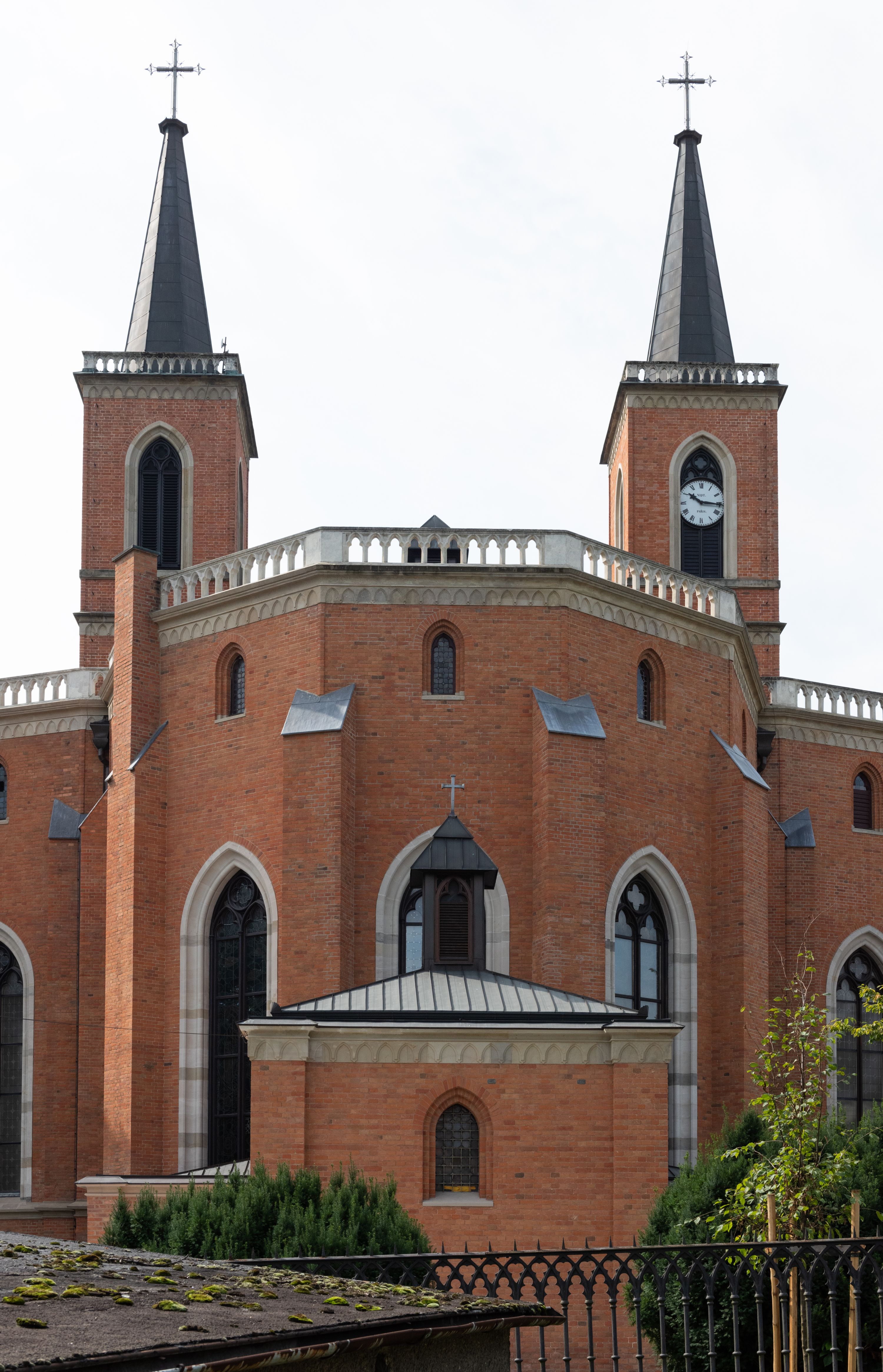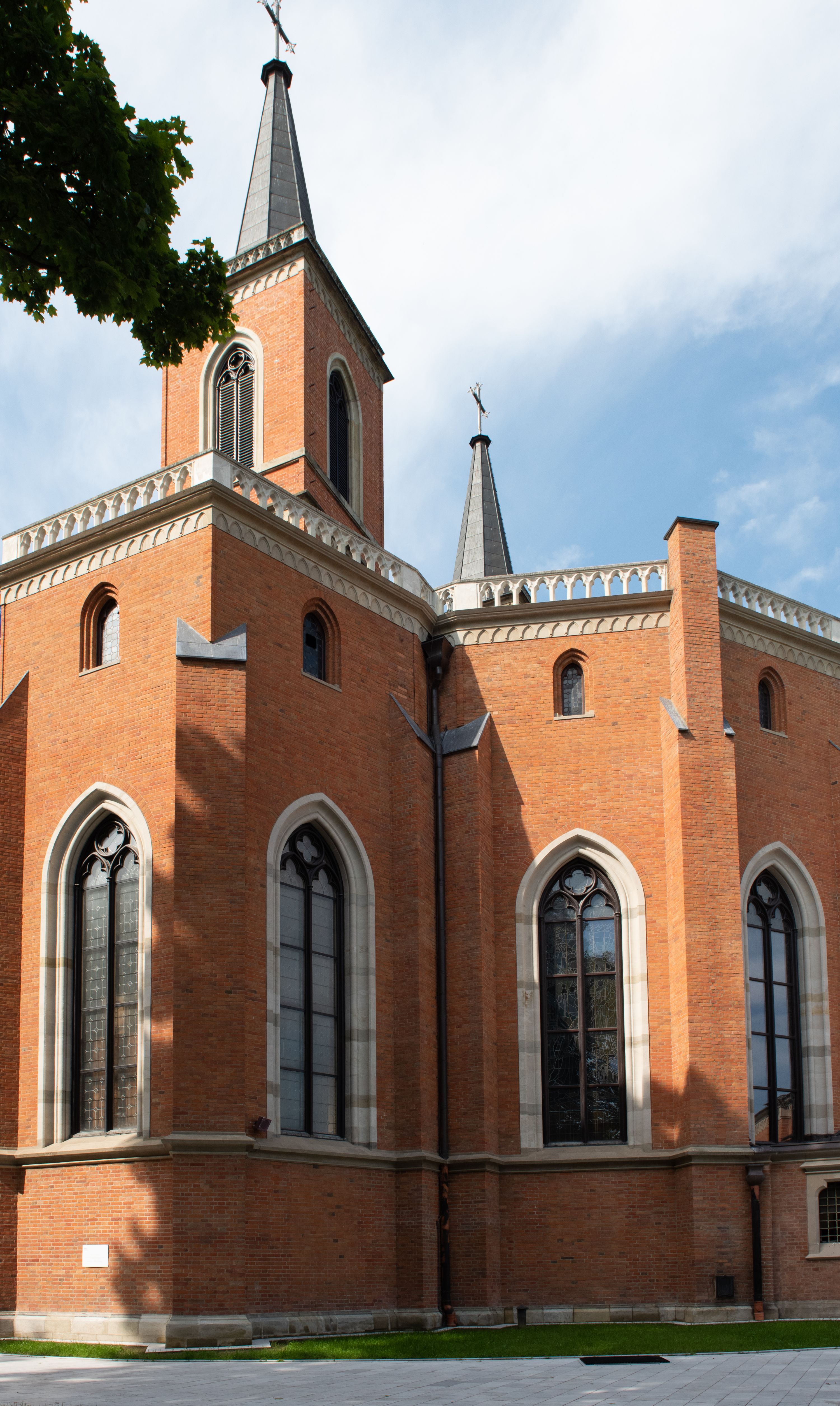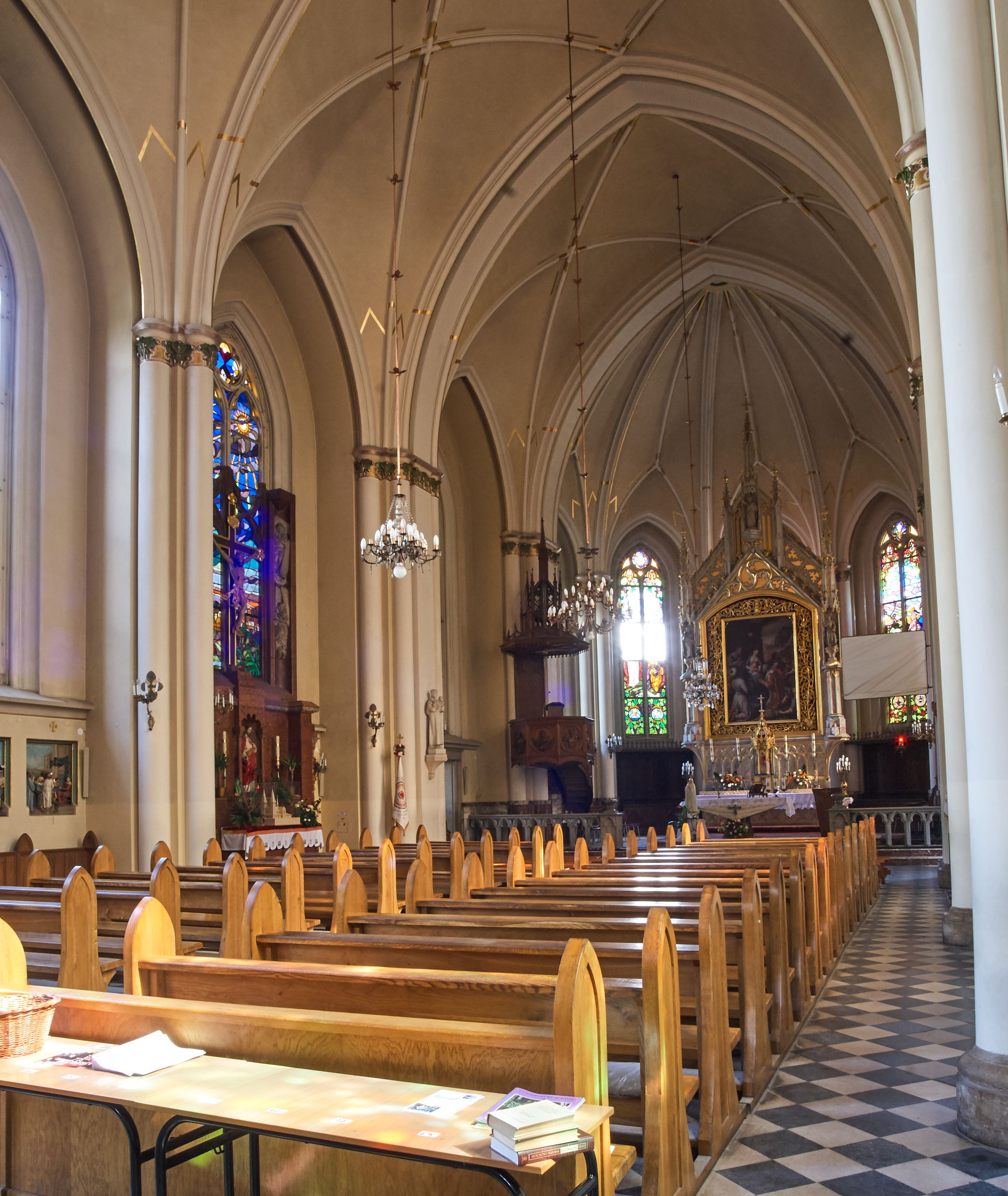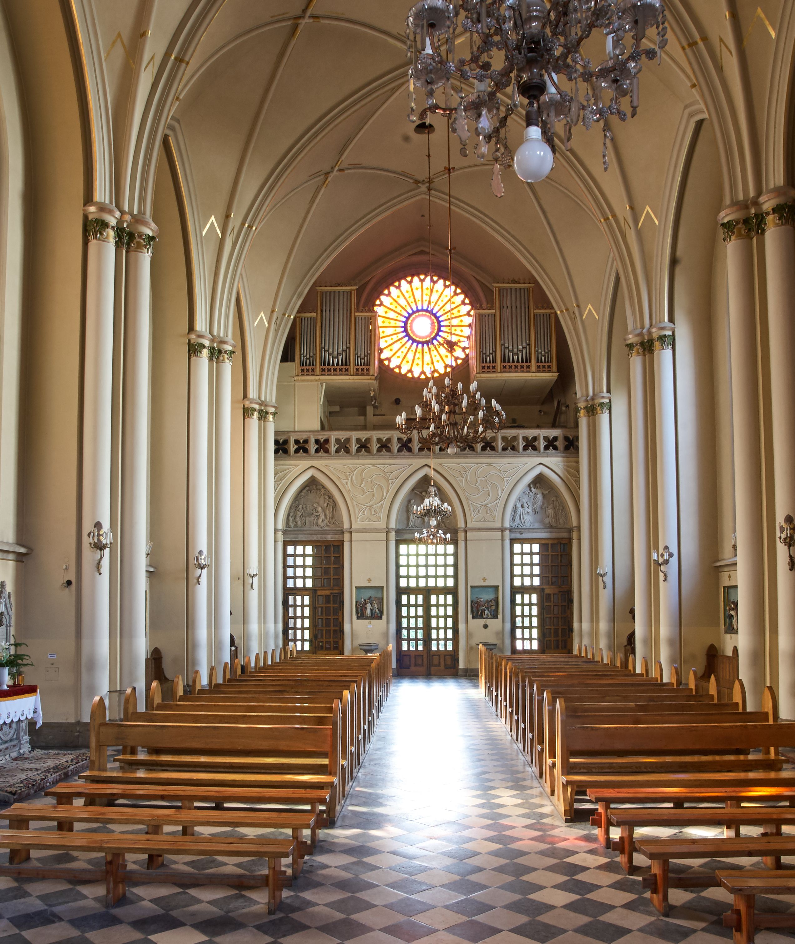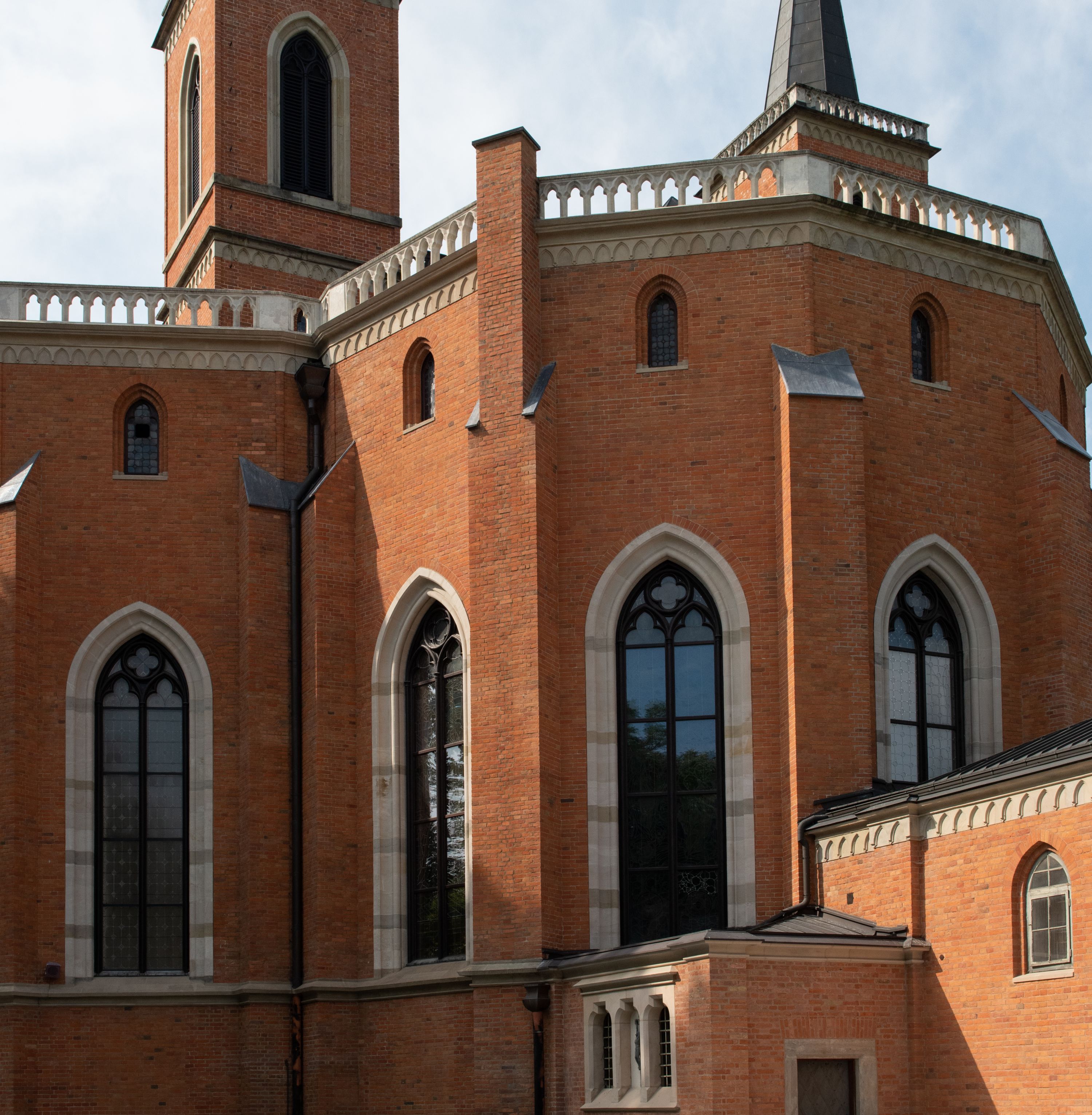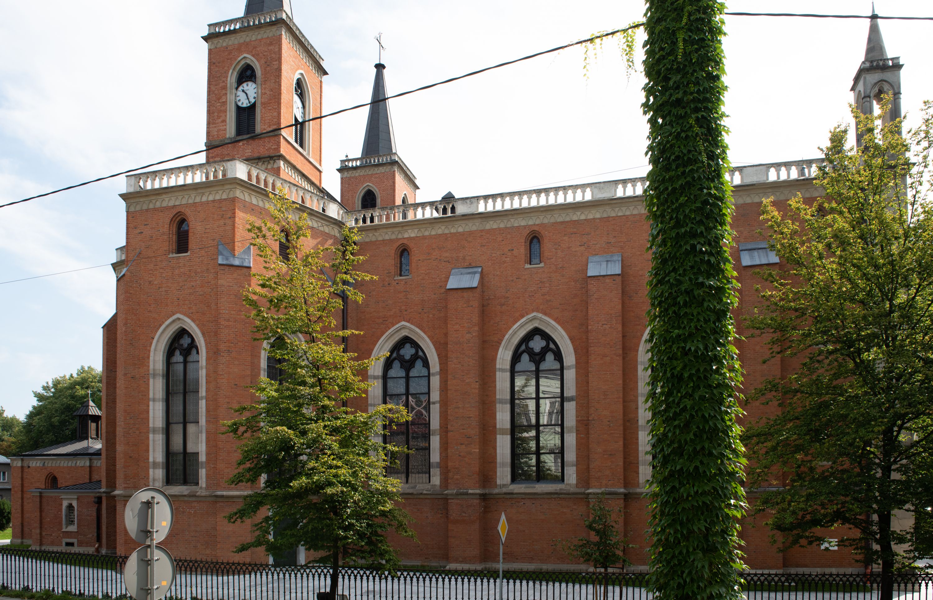 Kościół z cegły i kamienia. Na rzucie krzyża łacińskiego, jednonawowy z wciągniętymi do wnętrza przyporami. Prezbiterium krótkie, zamknięte pięcioma bokami ośmioboku. Korpus jednonawowy, czteroprzęsłowy, po bokach z płytkimi wnękami-kaplicami pomiędzy przyporami, poprzedzony od zach. przedsionkiem. Do pierwszego przęsła dostawione dwie symetryczne, trójboczne kaplice, nad nimi dwie czworoboczne wieże. Zakrystia przy prezbiterium na osi kościoła. Artykulacja ścian wnętrza za pomocą filarów opiętych półkolumnami z kapitelami z motywów liści. Między filarami rozpięte ostrołukowe arkady tworzące płytkie wnęki. Pierwsze przęsło wyróżnione przy pomocy masywnych filarów, ujętych niemal pełnoplastycznymi kolumnami. Okna ostrołukowe, dwudzielne z maswerkami, wsparte na gzymsach. Sklepienia krzyżowo-żebrowe na zaostrzonych gurtach. Kaplice artykułowane analogicznie do nawy kościoła, ze sklepieniami gwiaździstymi. Przedsionek otwiera się do kościoła trzema portalami ostrołukowymi opiętymi kolumnami. W polach archiwolt płaskorzeźby: Boże Narodzenie, Ukrzyżowanie, Wniebowstąpienie (K. Ceptowski). W prezbiterium, na osi kościoła prostokątny otwór drzwiowy prowadzący do zakrystii. Chór muzyczny umieszczony nad kruchtą kościoła, na rzucie prostokąta, z kamienną balustradą maswerkową. Fasada kamienna, trójosiowa, zamknięta trójkątnie, flankowana lizenami przechodzącymi w ażurowe wieżyczki-latarnie, na rzucie kwadratu. Wieżyczki zwieńczone gzymsem i balustradą arkadową, hełmy ostrosłupowy zakończony iglicą. W dolnej części trzy filarowe arkady ostrołukowe, otwierające się do kruchty, sklepienie kruchty krzyżowo-żebrowe. Nad arkadami wejściowymi trzy tonda: litery IHS, Oko Opatrzności i splecione litery imienia Maria. Pośrodku na osi kościoła duża rozeta z maswerkiem, profilowana, otoczona pierścieniem wypełnionym stylizowanym ornamentem roślinnym. Ponad arkadami pełnoplastyczne figury czterech ewangelistów ustawionych na konsolach z rzeźbionymi atrybutami (F. Kuhn). Po bokach rozety prostokątne płyciny z traczami herbowymi Potockich i Branickich. U góry, na osi fasady figura Archanioła Michała. Elewacje na kamiennym cokole, z gzymsem kapnikowym, opięte prostokątnymi przyporami zwieńczonymi kamiennymi nakrywami. W górnej części kamienny fryz arkadkowy. Nad nim gzyms koronujący podtrzymujący ażurową, arkadową balustradę. Przy prezbiterium kaplice zamknięte trójbocznie, prezbiterium zamknięte pięciobocznie. Zakrystia na osi prezbiterium, na rzucie prostokąta, zwieńczona sygnaturką i ceglanym kominem. Po bokach prostokątne aneksy, południowy aneks - trzy okna ostrołukowe w kamiennej opasce, w środkowym przedstawienie Ukrzyżowanego Chrystusa. W północnym aneksie pojedyncze analogiczne okno. Okna ostrołukowe w profilowanych kamiennych opaskach, pomiędzy nimi a gzymsem koronującym mniejsze ostrołukowe w uskokowych arkadach. Nad kaplicami bocznymi dwie symetryczne wieże na rzucie kwadratu, w połowie wysokości kamienny gzyms z fryzem arkadkowym. Okna ostrołukowe w kamiennej opasce. Całość zwieńczona ślepym fryzem arkadkowym, wyżej gzyms dźwigający ażurową arkadkową balustradę. Hełmy ostrosłupowe, miedziane. Zakrystia na rzucie prostokąta, nakryta sklepieniem kolebkowym zaostrzonym i krzyżowym z lunetami , oddzielone gurtem. Portale od wschodu i zachodu prostokątne zamknięte łukiem ostrym. Okna ostrołukowe.