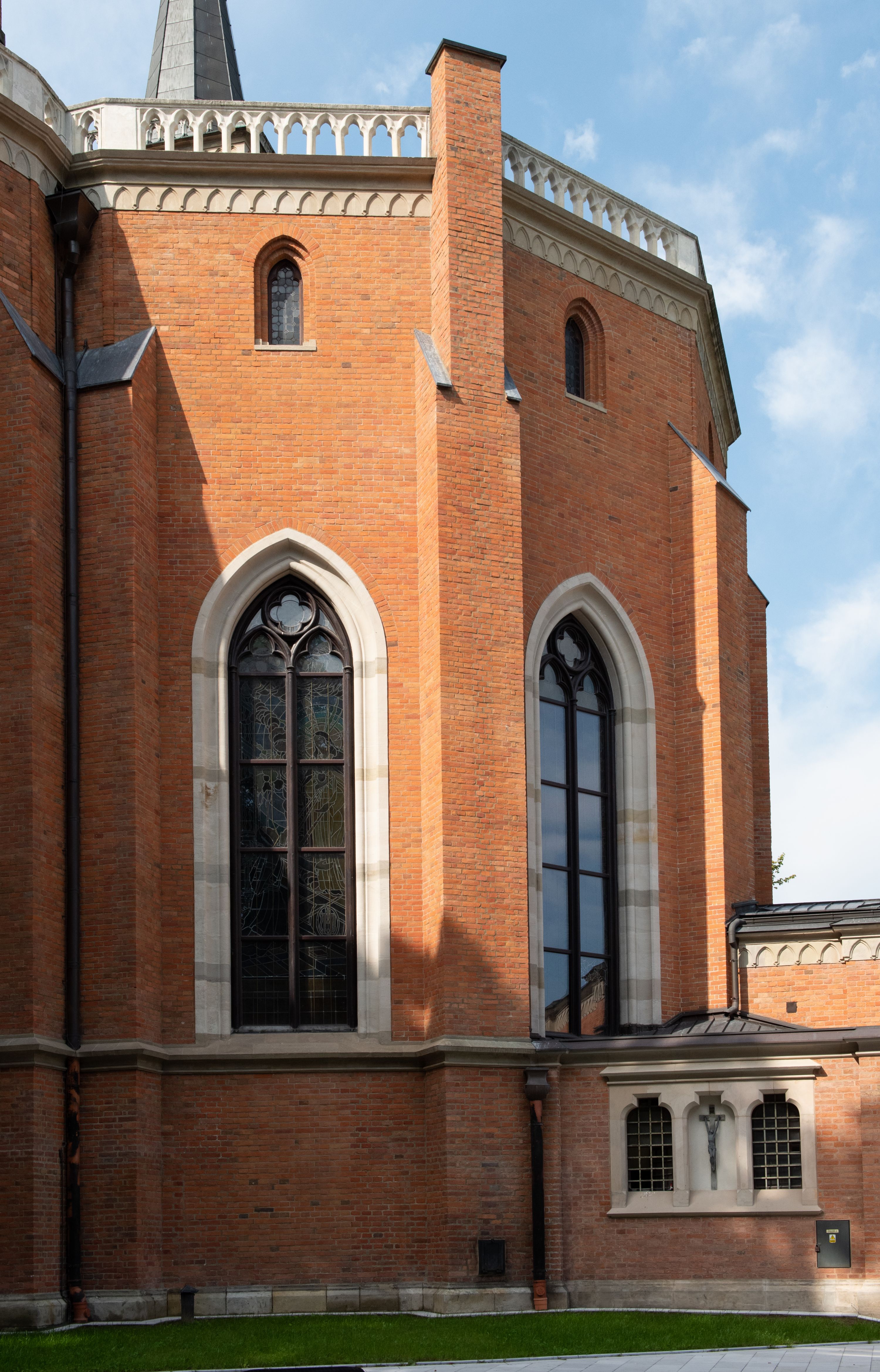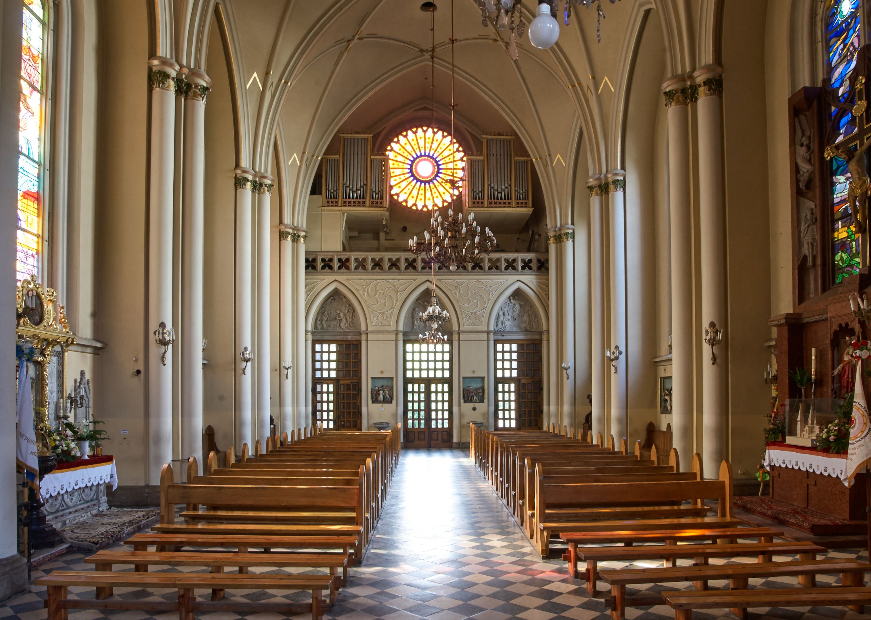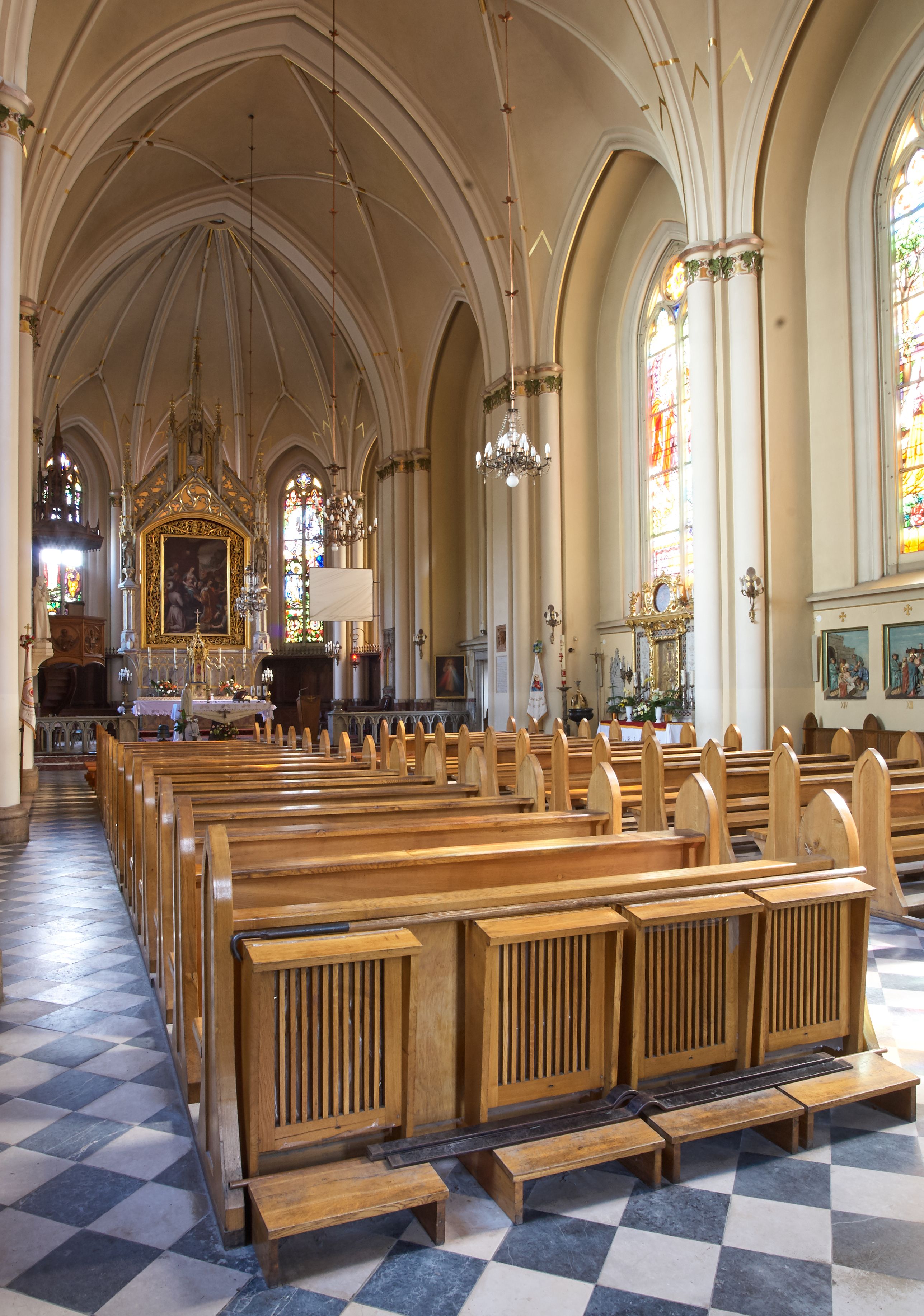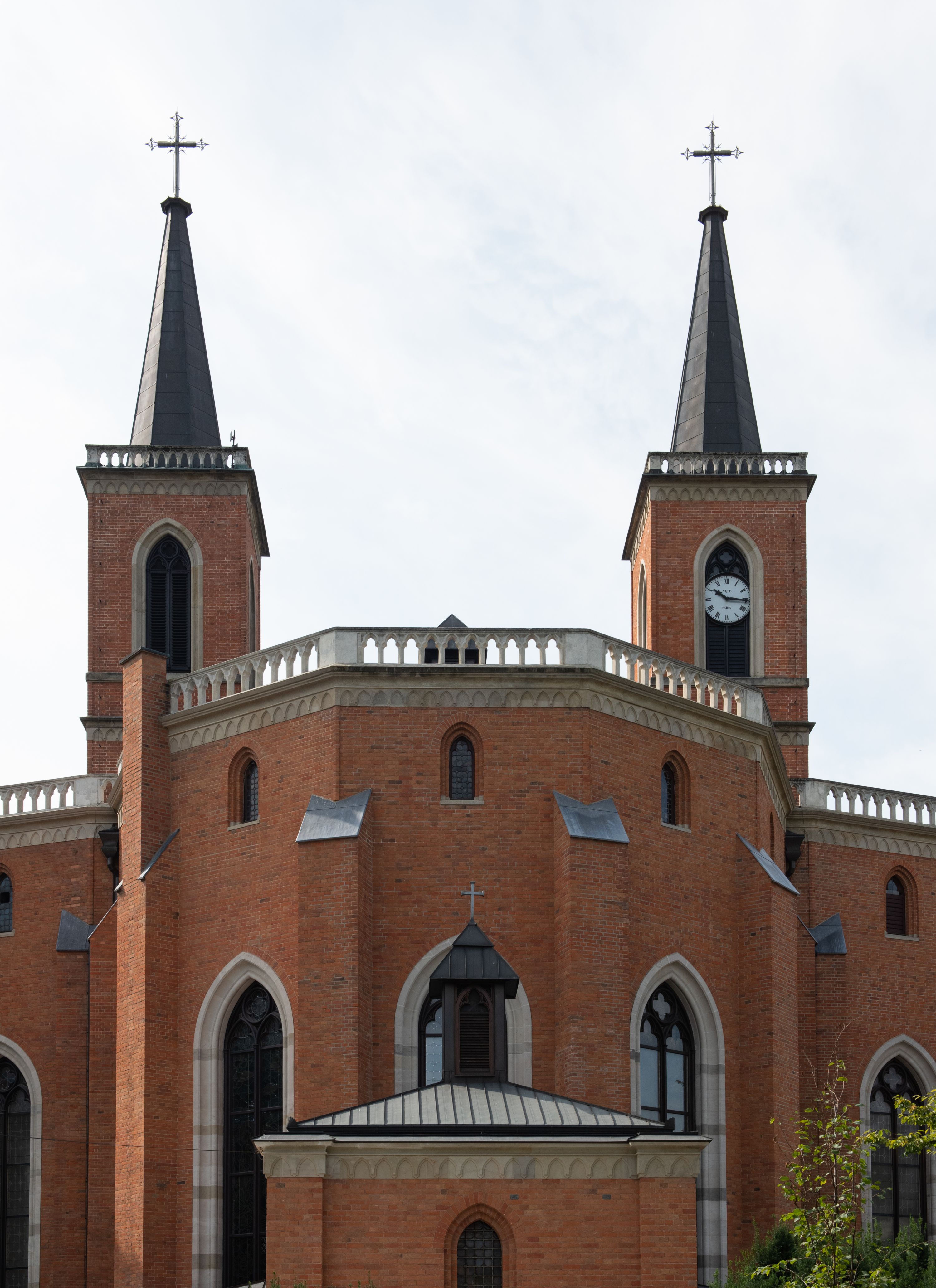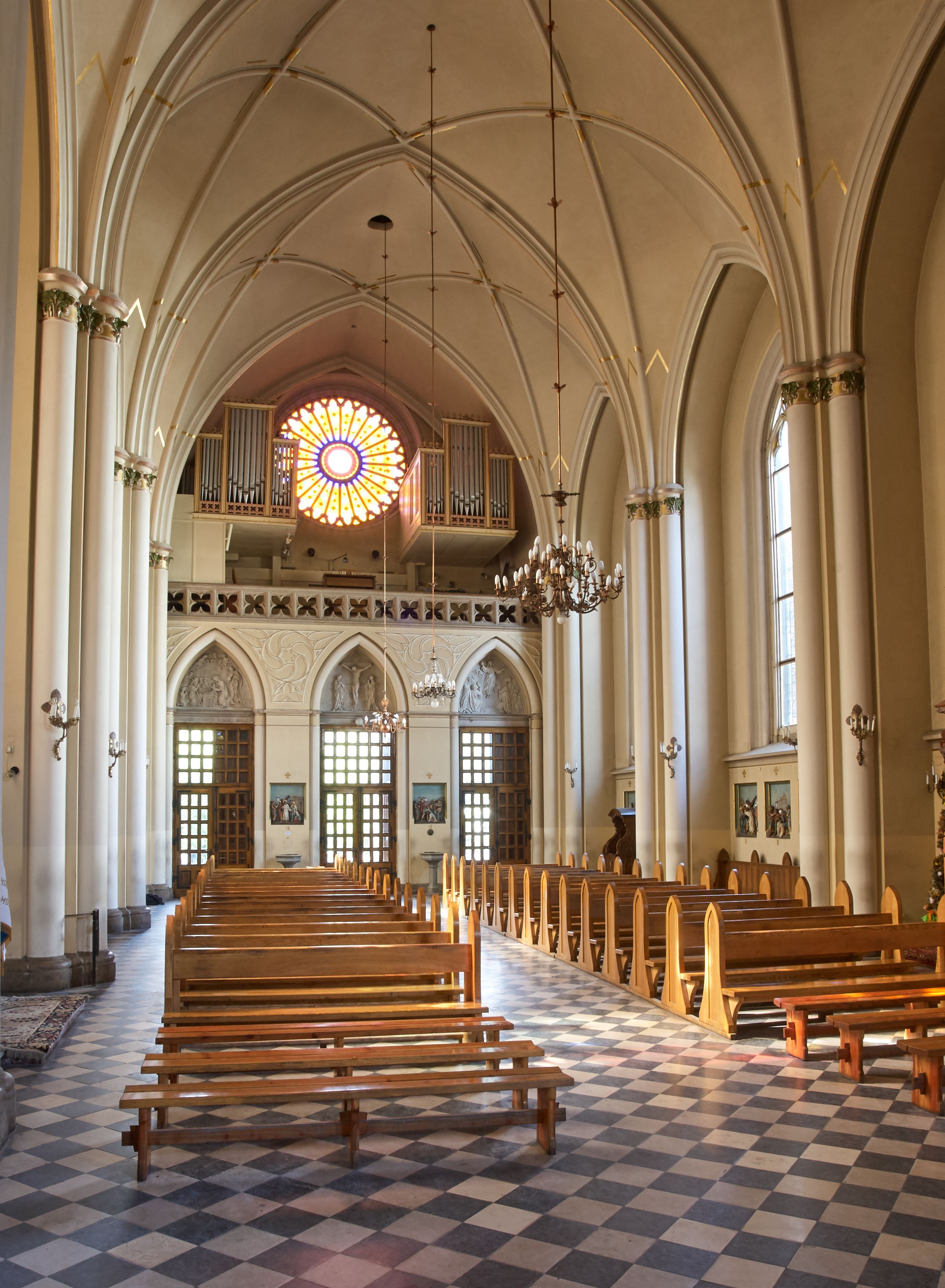 Kościół z cegły i kamienia. Na rzucie krzyża łacińskiego, jednonawowy z wciągniętymi do wnętrza przyporami. Prezbiterium krótkie, zamknięte pięcioma bokami ośmioboku. Korpus jednonawowy, czteroprzęsłowy, po bokach z płytkimi wnękami-kaplicami pomiędzy przyporami, poprzedzony od zach. przedsionkiem. Do pierwszego przęsła dostawione dwie symetryczne, trójboczne kaplice, nad nimi dwie czworoboczne wieże. Zakrystia przy prezbiterium na osi kościoła. Artykulacja ścian wnętrza za pomocą filarów opiętych półkolumnami z kapitelami z motywów liści. Między filarami rozpięte ostrołukowe arkady tworzące płytkie wnęki. Pierwsze przęsło wyróżnione przy pomocy masywnych filarów, ujętych niemal pełnoplastycznymi kolumnami. Okna ostrołukowe, dwudzielne z maswerkami, wsparte na gzymsach. Sklepienia krzyżowo-żebrowe na zaostrzonych gurtach. Kaplice artykułowane analogicznie do nawy kościoła, ze sklepieniami gwiaździstymi. Przedsionek otwiera się do kościoła trzema portalami ostrołukowymi opiętymi kolumnami. W polach archiwolt płaskorzeźby: Boże Narodzenie, Ukrzyżowanie, Wniebowstąpienie (K. Ceptowski). W prezbiterium, na osi kościoła prostokątny otwór drzwiowy prowadzący do zakrystii. Chór muzyczny umieszczony nad kruchtą kościoła, na rzucie prostokąta, z kamienną balustradą maswerkową. Fasada kamienna, trójosiowa, zamknięta trójkątnie, flankowana lizenami przechodzącymi w ażurowe wieżyczki-latarnie, na rzucie kwadratu. Wieżyczki zwieńczone gzymsem i balustradą arkadową, hełmy ostrosłupowy zakończony iglicą. W dolnej części trzy filarowe arkady ostrołukowe, otwierające się do kruchty, sklepienie kruchty krzyżowo-żebrowe. Nad arkadami wejściowymi trzy tonda: litery IHS, Oko Opatrzności i splecione litery imienia Maria. Pośrodku na osi kościoła duża rozeta z maswerkiem, profilowana, otoczona pierścieniem wypełnionym stylizowanym ornamentem roślinnym. Ponad arkadami pełnoplastyczne figury czterech ewangelistów ustawionych na konsolach z rzeźbionymi atrybutami (F. Kuhn). Po bokach rozety prostokątne płyciny z traczami herbowymi Potockich i Branickich. U góry, na osi fasady figura Archanioła Michała. Elewacje na kamiennym cokole, z gzymsem kapnikowym, opięte prostokątnymi przyporami zwieńczonymi kamiennymi nakrywami. W górnej części kamienny fryz arkadkowy. Nad nim gzyms koronujący podtrzymujący ażurową, arkadową balustradę. Przy prezbiterium kaplice zamknięte trójbocznie, prezbiterium zamknięte pięciobocznie. Zakrystia na osi prezbiterium, na rzucie prostokąta, zwieńczona sygnaturką i ceglanym kominem. Po bokach prostokątne aneksy, południowy aneks - trzy okna ostrołukowe w kamiennej opasce, w środkowym przedstawienie Ukrzyżowanego Chrystusa. W północnym aneksie pojedyncze analogiczne okno. Okna ostrołukowe w profilowanych kamiennych opaskach, pomiędzy nimi a gzymsem koronującym mniejsze ostrołukowe w uskokowych arkadach. Nad kaplicami bocznymi dwie symetryczne wieże na rzucie kwadratu, w połowie wysokości kamienny gzyms z fryzem arkadkowym. Okna ostrołukowe w kamiennej opasce. Całość zwieńczona ślepym fryzem arkadkowym, wyżej gzyms dźwigający ażurową arkadkową balustradę. Hełmy ostrosłupowe, miedziane. Zakrystia na rzucie prostokąta, nakryta sklepieniem kolebkowym zaostrzonym i krzyżowym z lunetami , oddzielone gurtem. Portale od wschodu i zachodu prostokątne zamknięte łukiem ostrym. Okna ostrołukowe.
