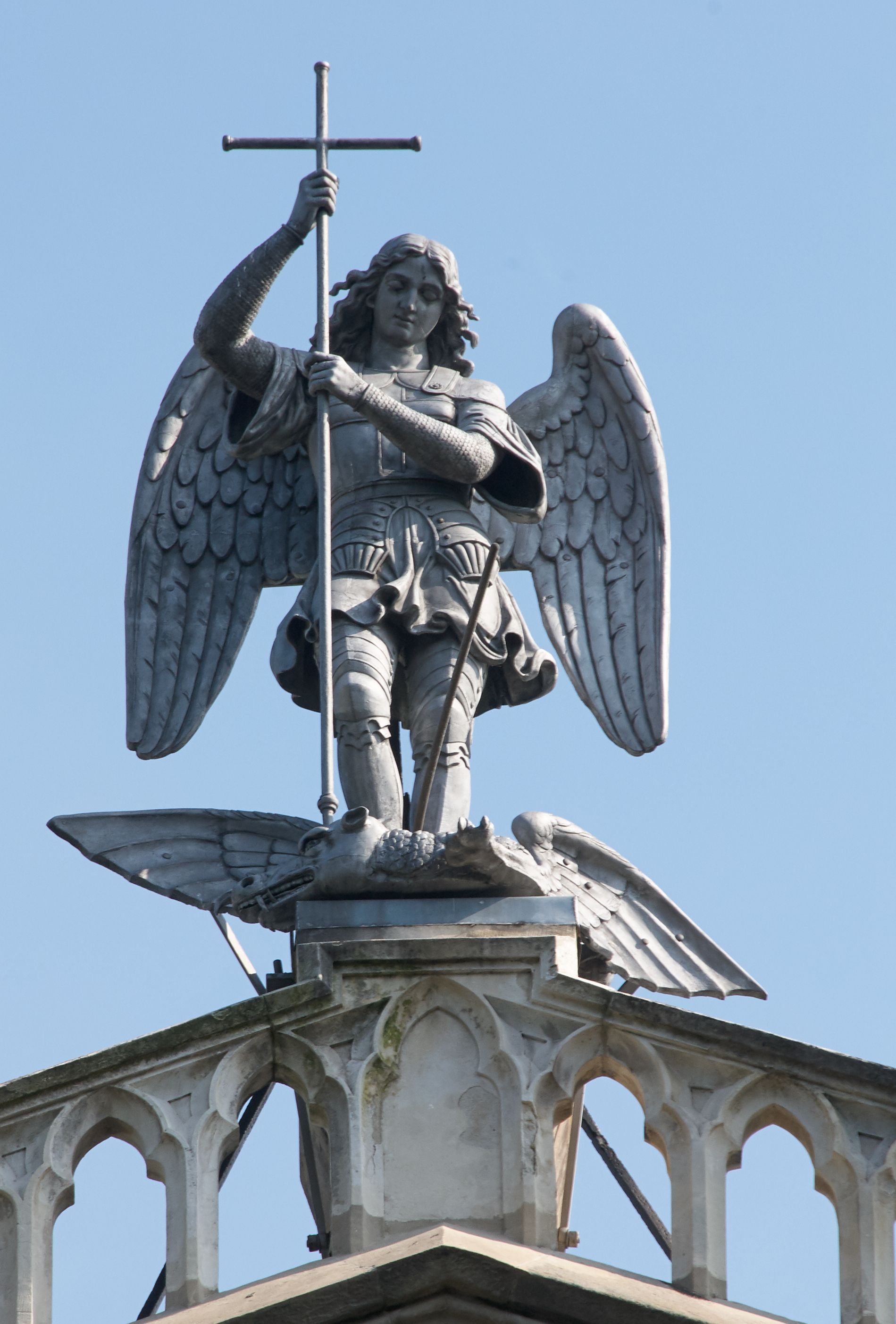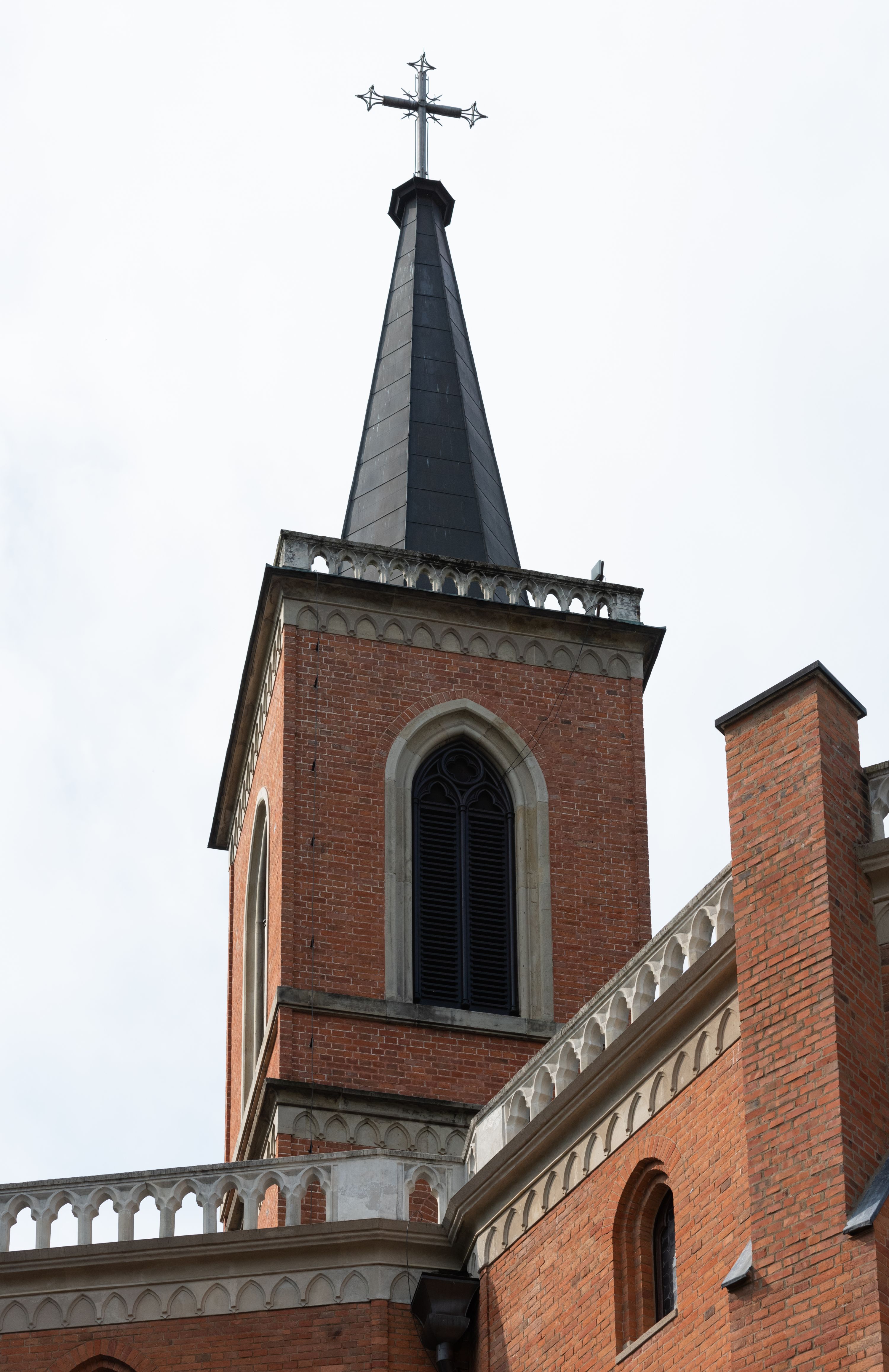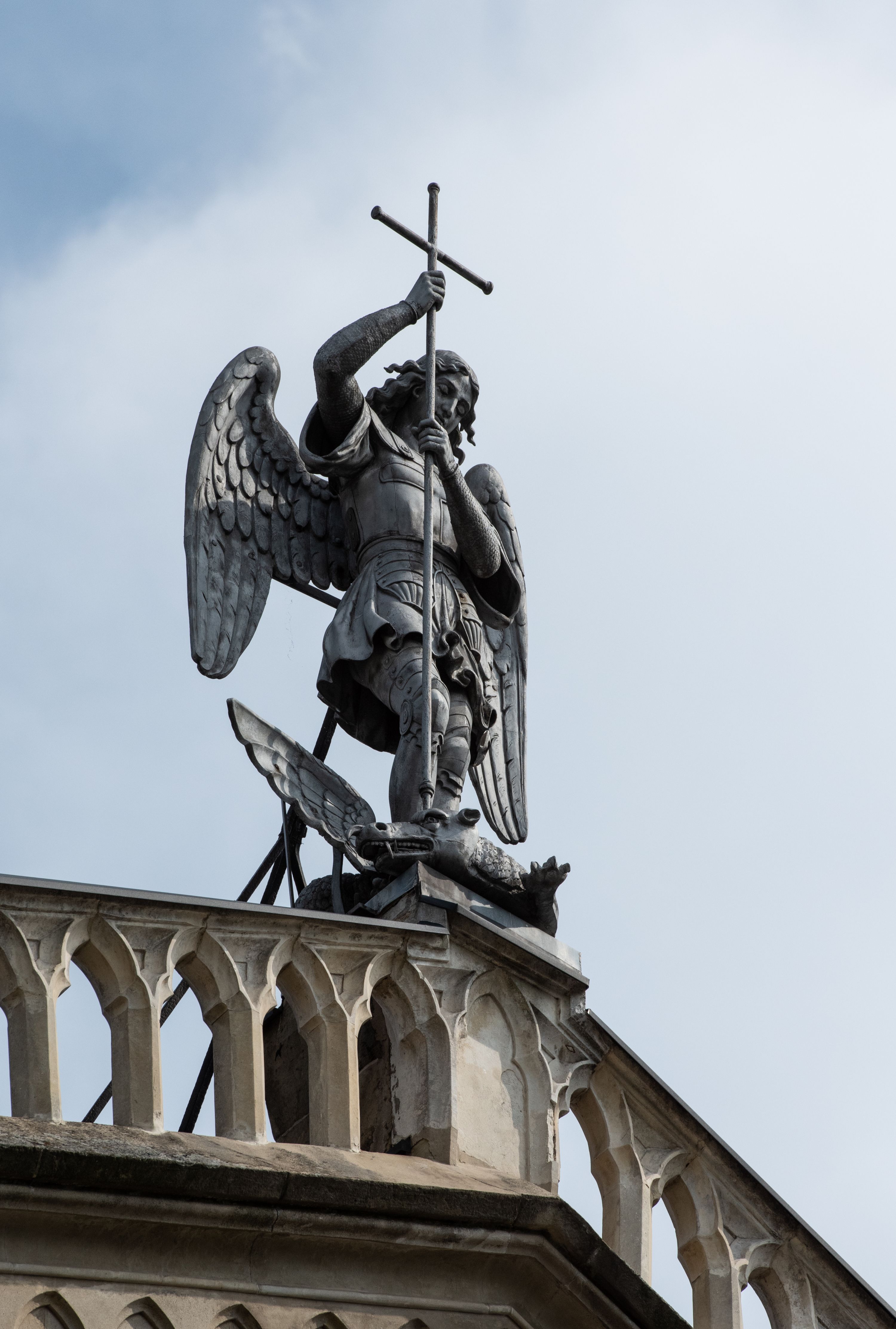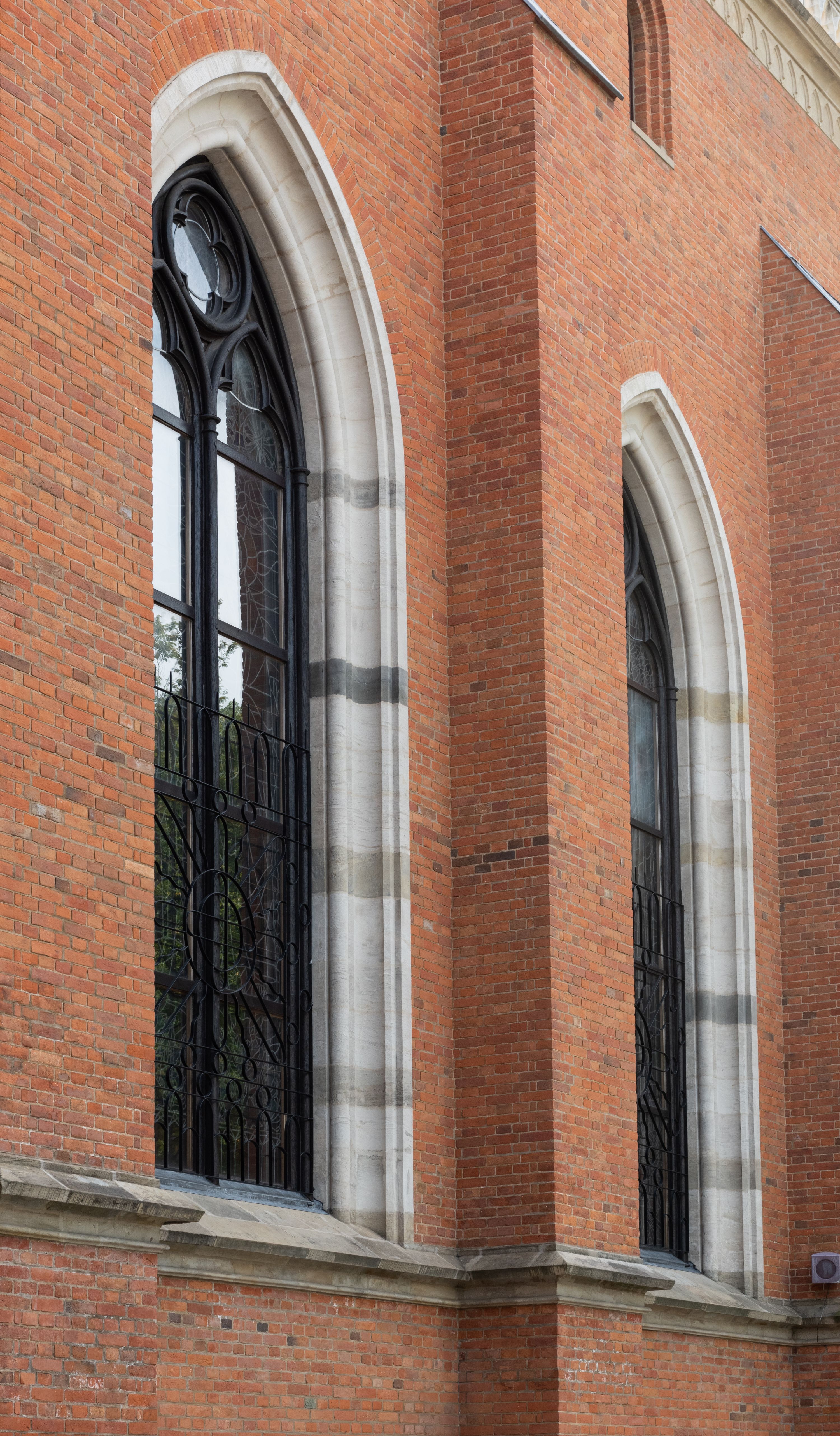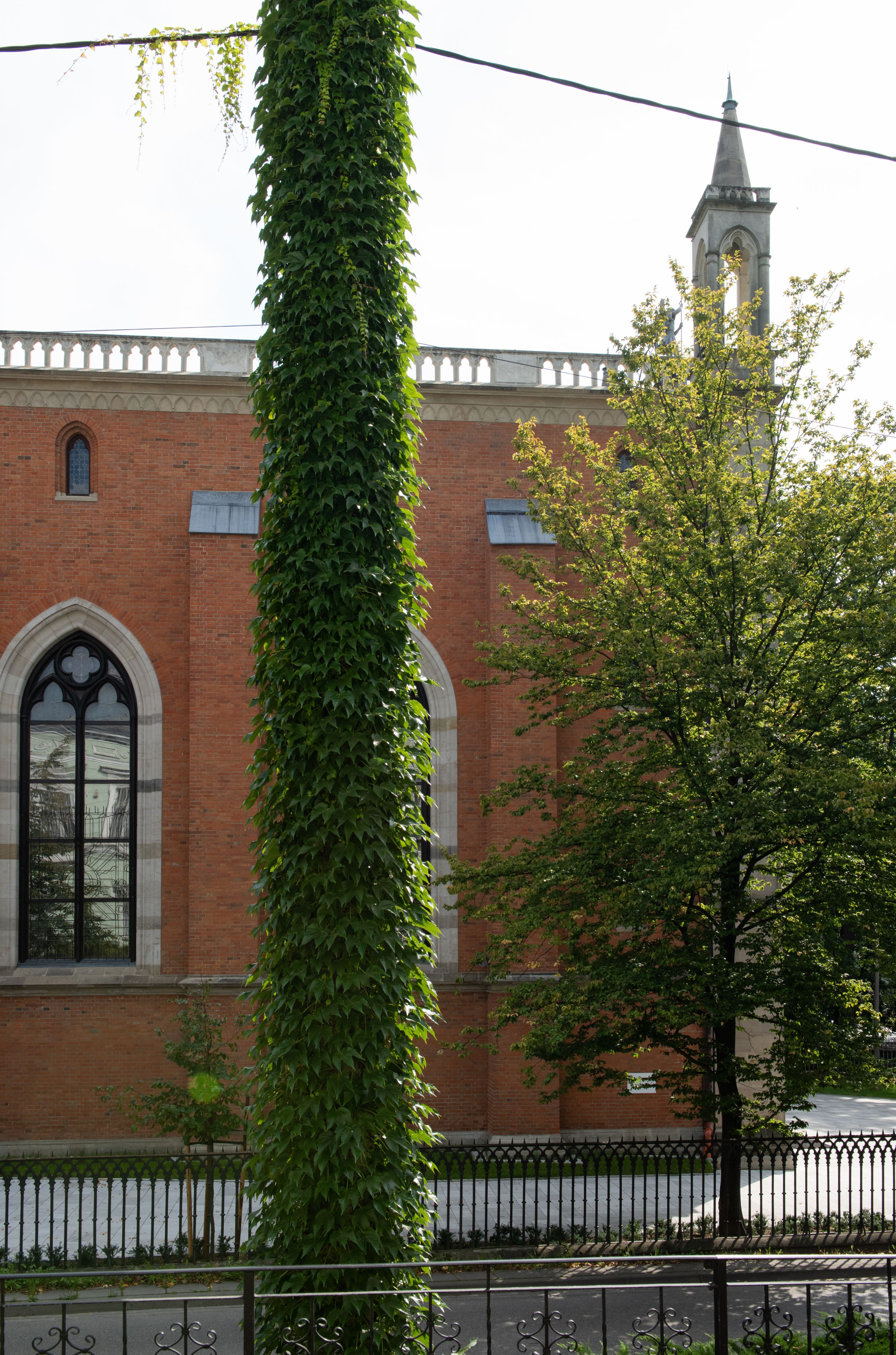 Kościół z cegły i kamienia. Na rzucie krzyża łacińskiego, jednonawowy z wciągniętymi do wnętrza przyporami. Prezbiterium krótkie, zamknięte pięcioma bokami ośmioboku. Korpus jednonawowy, czteroprzęsłowy, po bokach z płytkimi wnękami-kaplicami pomiędzy przyporami, poprzedzony od zach. przedsionkiem. Do pierwszego przęsła dostawione dwie symetryczne, trójboczne kaplice, nad nimi dwie czworoboczne wieże. Zakrystia przy prezbiterium na osi kościoła. Artykulacja ścian wnętrza za pomocą filarów opiętych półkolumnami z kapitelami z motywów liści. Między filarami rozpięte ostrołukowe arkady tworzące płytkie wnęki. Pierwsze przęsło wyróżnione przy pomocy masywnych filarów, ujętych niemal pełnoplastycznymi kolumnami. Okna ostrołukowe, dwudzielne z maswerkami, wsparte na gzymsach. Sklepienia krzyżowo-żebrowe na zaostrzonych gurtach. Kaplice artykułowane analogicznie do nawy kościoła, ze sklepieniami gwiaździstymi. Przedsionek otwiera się do kościoła trzema portalami ostrołukowymi opiętymi kolumnami. W polach archiwolt płaskorzeźby: Boże Narodzenie, Ukrzyżowanie, Wniebowstąpienie (K. Ceptowski). W prezbiterium, na osi kościoła prostokątny otwór drzwiowy prowadzący do zakrystii. Chór muzyczny umieszczony nad kruchtą kościoła, na rzucie prostokąta, z kamienną balustradą maswerkową. Fasada kamienna, trójosiowa, zamknięta trójkątnie, flankowana lizenami przechodzącymi w ażurowe wieżyczki-latarnie, na rzucie kwadratu. Wieżyczki zwieńczone gzymsem i balustradą arkadową, hełmy ostrosłupowy zakończony iglicą. W dolnej części trzy filarowe arkady ostrołukowe, otwierające się do kruchty, sklepienie kruchty krzyżowo-żebrowe. Nad arkadami wejściowymi trzy tonda: litery IHS, Oko Opatrzności i splecione litery imienia Maria. Pośrodku na osi kościoła duża rozeta z maswerkiem, profilowana, otoczona pierścieniem wypełnionym stylizowanym ornamentem roślinnym. Ponad arkadami pełnoplastyczne figury czterech ewangelistów ustawionych na konsolach z rzeźbionymi atrybutami (F. Kuhn). Po bokach rozety prostokątne płyciny z traczami herbowymi Potockich i Branickich. U góry, na osi fasady figura Archanioła Michała. Elewacje na kamiennym cokole, z gzymsem kapnikowym, opięte prostokątnymi przyporami zwieńczonymi kamiennymi nakrywami. W górnej części kamienny fryz arkadkowy. Nad nim gzyms koronujący podtrzymujący ażurową, arkadową balustradę. Przy prezbiterium kaplice zamknięte trójbocznie, prezbiterium zamknięte pięciobocznie. Zakrystia na osi prezbiterium, na rzucie prostokąta, zwieńczona sygnaturką i ceglanym kominem. Po bokach prostokątne aneksy, południowy aneks - trzy okna ostrołukowe w kamiennej opasce, w środkowym przedstawienie Ukrzyżowanego Chrystusa. W północnym aneksie pojedyncze analogiczne okno. Okna ostrołukowe w profilowanych kamiennych opaskach, pomiędzy nimi a gzymsem koronującym mniejsze ostrołukowe w uskokowych arkadach. Nad kaplicami bocznymi dwie symetryczne wieże na rzucie kwadratu, w połowie wysokości kamienny gzyms z fryzem arkadkowym. Okna ostrołukowe w kamiennej opasce. Całość zwieńczona ślepym fryzem arkadkowym, wyżej gzyms dźwigający ażurową arkadkową balustradę. Hełmy ostrosłupowe, miedziane. Zakrystia na rzucie prostokąta, nakryta sklepieniem kolebkowym zaostrzonym i krzyżowym z lunetami , oddzielone gurtem. Portale od wschodu i zachodu prostokątne zamknięte łukiem ostrym. Okna ostrołukowe.