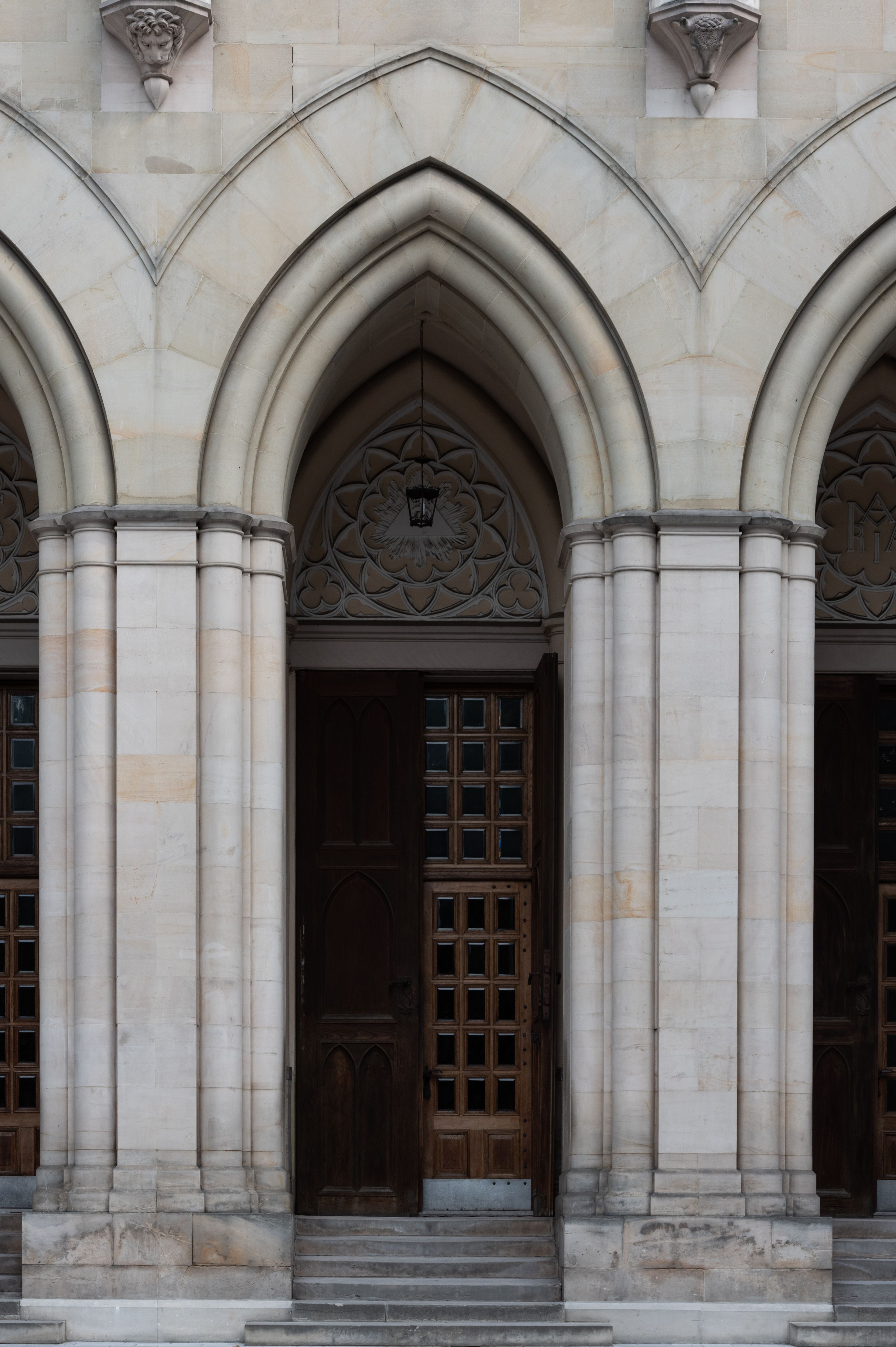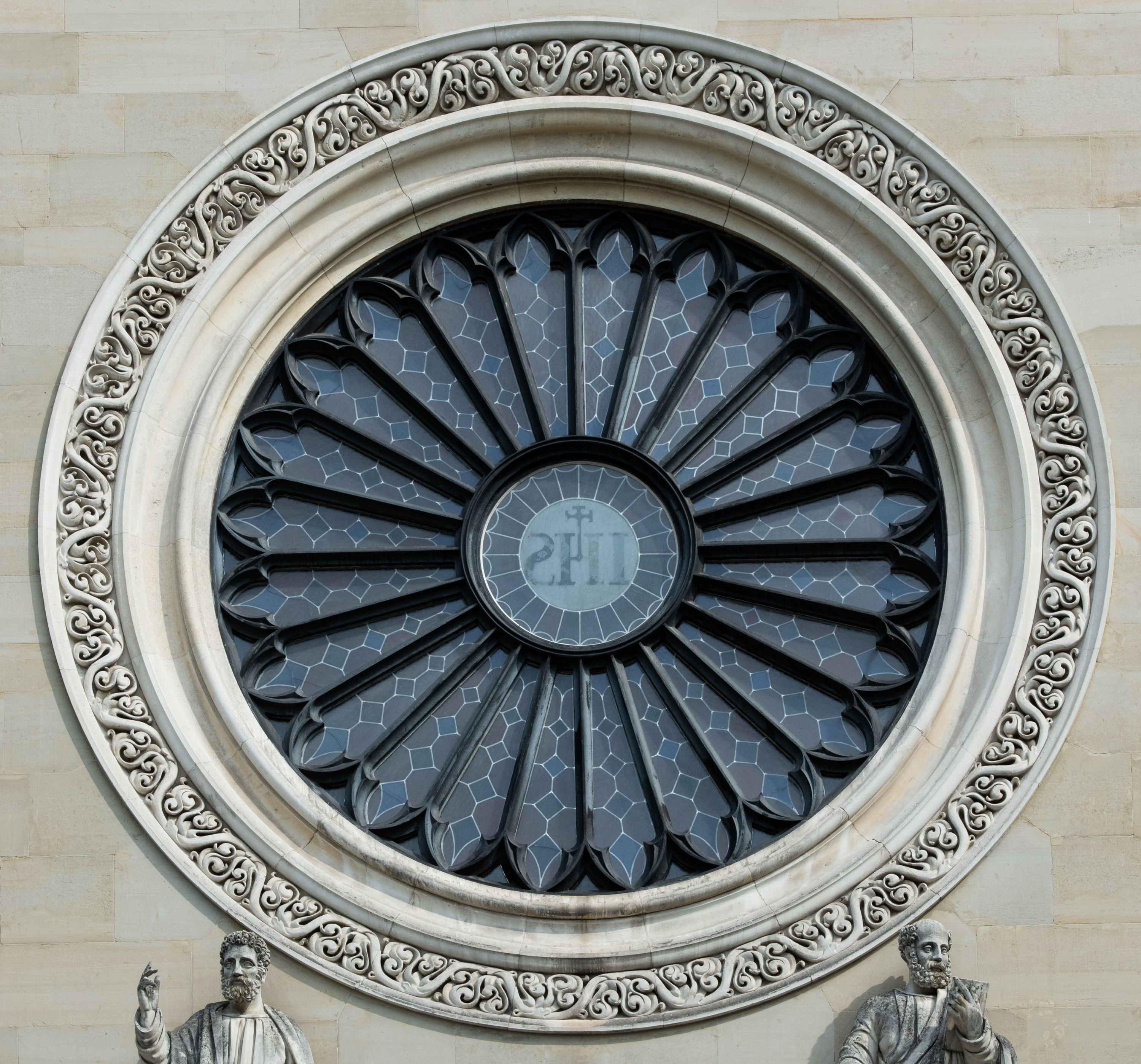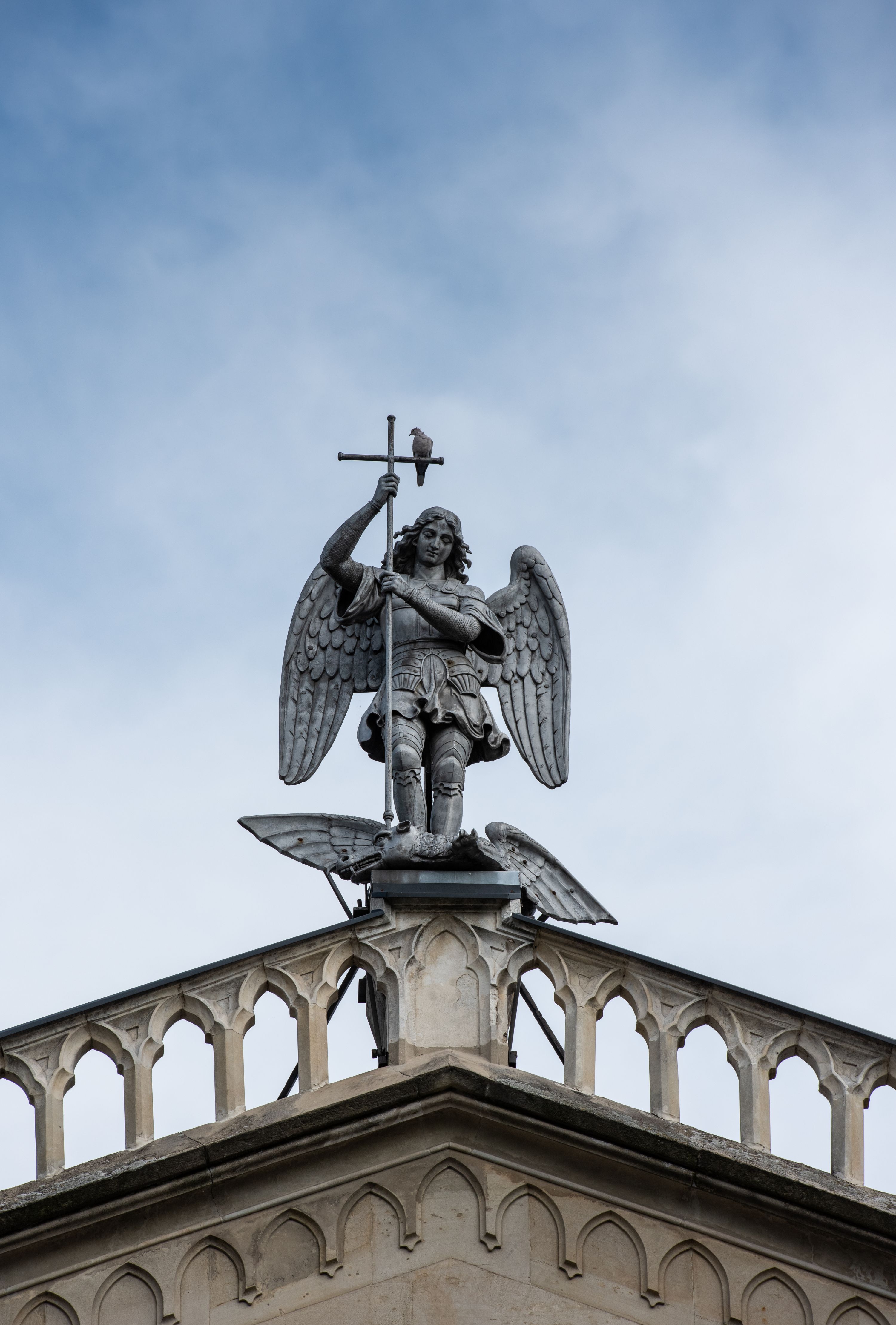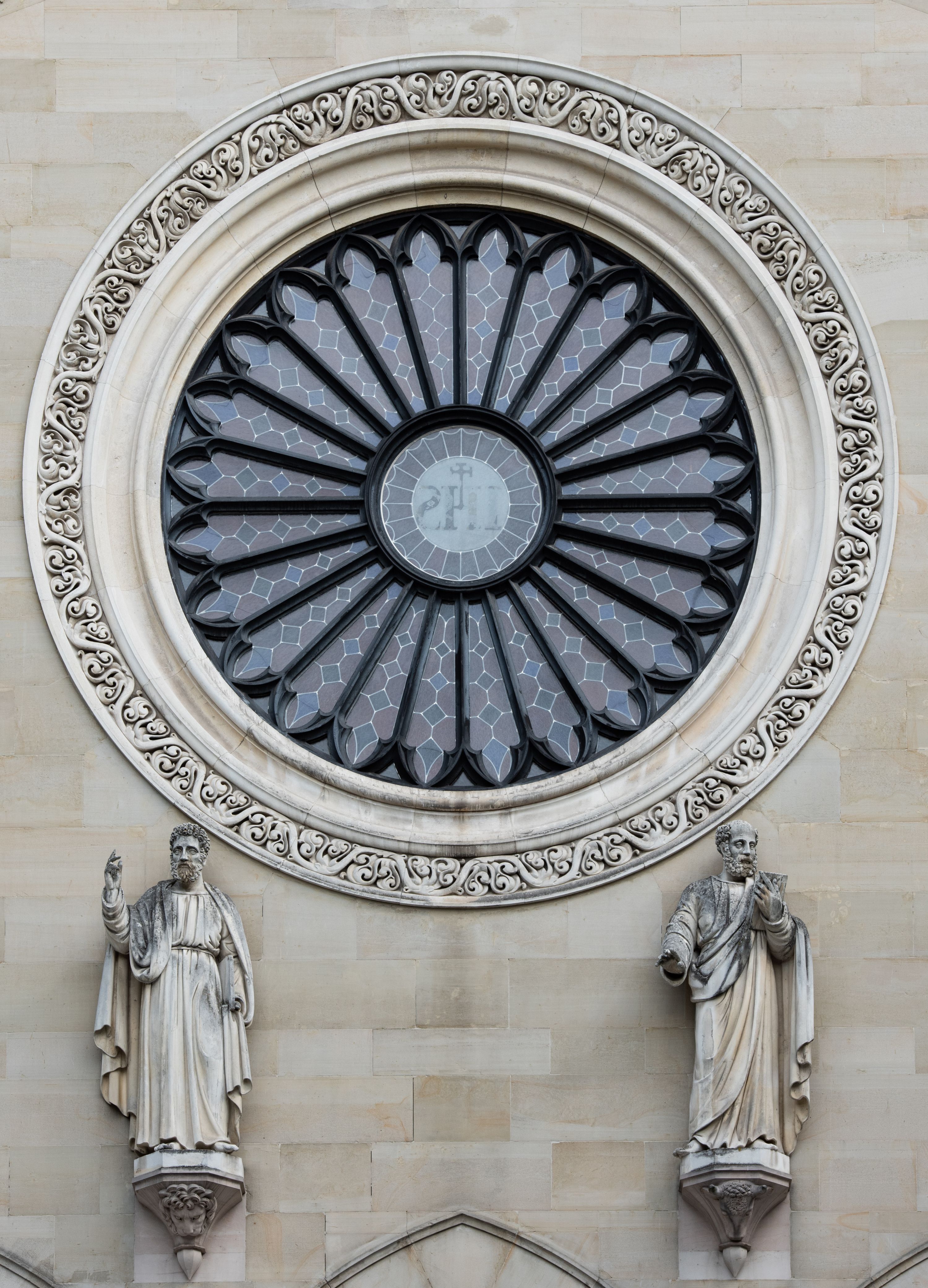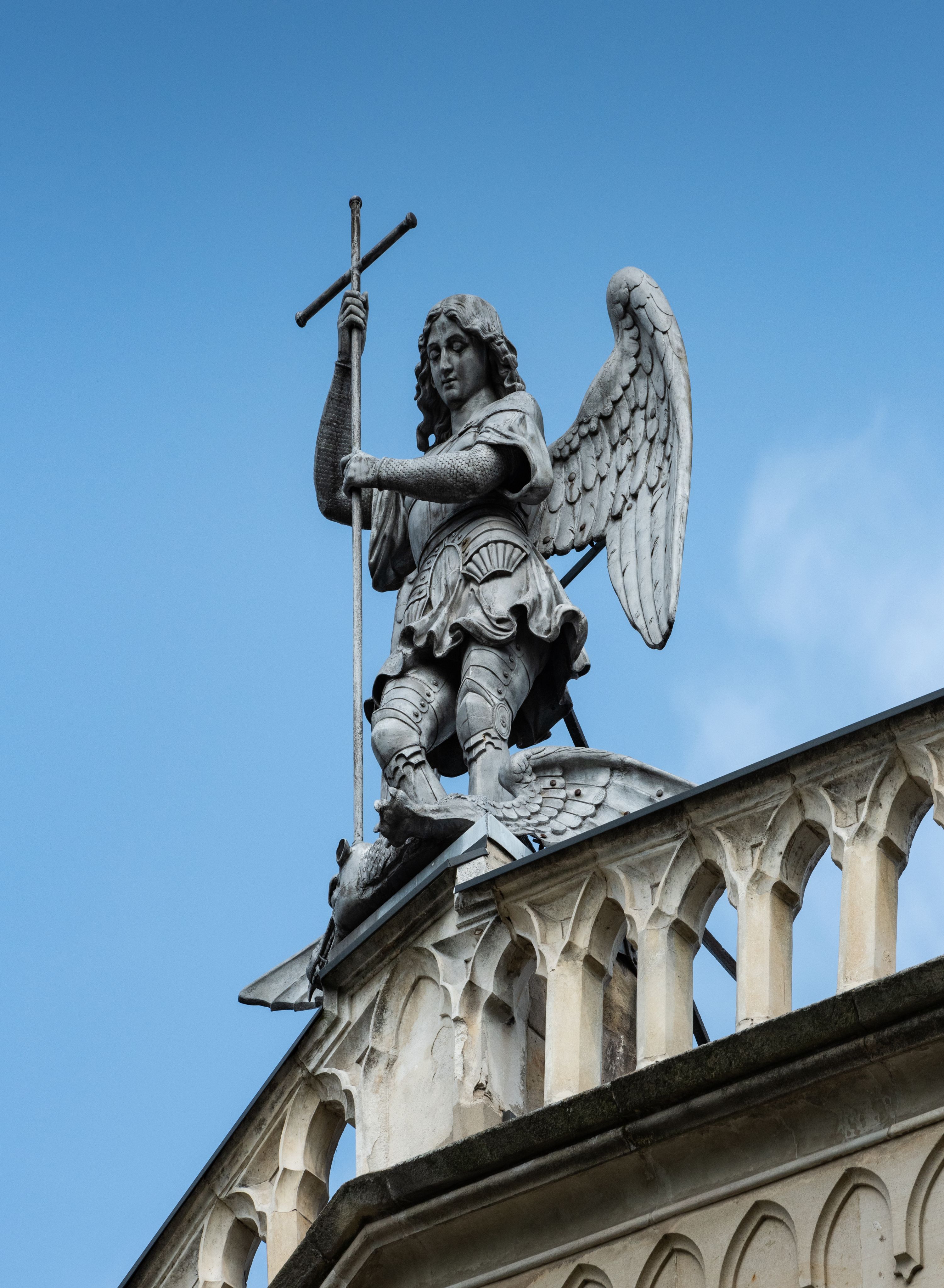 Kościół z cegły i kamienia. Na rzucie krzyża łacińskiego, jednonawowy z wciągniętymi do wnętrza przyporami. Prezbiterium krótkie, zamknięte pięcioma bokami ośmioboku. Korpus jednonawowy, czteroprzęsłowy, po bokach z płytkimi wnękami-kaplicami pomiędzy przyporami, poprzedzony od zach. przedsionkiem. Do pierwszego przęsła dostawione dwie symetryczne, trójboczne kaplice, nad nimi dwie czworoboczne wieże. Zakrystia przy prezbiterium na osi kościoła. Artykulacja ścian wnętrza za pomocą filarów opiętych półkolumnami z kapitelami z motywów liści. Między filarami rozpięte ostrołukowe arkady tworzące płytkie wnęki. Pierwsze przęsło wyróżnione przy pomocy masywnych filarów, ujętych niemal pełnoplastycznymi kolumnami. Okna ostrołukowe, dwudzielne z maswerkami, wsparte na gzymsach. Sklepienia krzyżowo-żebrowe na zaostrzonych gurtach. Kaplice artykułowane analogicznie do nawy kościoła, ze sklepieniami gwiaździstymi. Przedsionek otwiera się do kościoła trzema portalami ostrołukowymi opiętymi kolumnami. W polach archiwolt płaskorzeźby: Boże Narodzenie, Ukrzyżowanie, Wniebowstąpienie (K. Ceptowski). W prezbiterium, na osi kościoła prostokątny otwór drzwiowy prowadzący do zakrystii. Chór muzyczny umieszczony nad kruchtą kościoła, na rzucie prostokąta, z kamienną balustradą maswerkową. Fasada kamienna, trójosiowa, zamknięta trójkątnie, flankowana lizenami przechodzącymi w ażurowe wieżyczki-latarnie, na rzucie kwadratu. Wieżyczki zwieńczone gzymsem i balustradą arkadową, hełmy ostrosłupowy zakończony iglicą. W dolnej części trzy filarowe arkady ostrołukowe, otwierające się do kruchty, sklepienie kruchty krzyżowo-żebrowe. Nad arkadami wejściowymi trzy tonda: litery IHS, Oko Opatrzności i splecione litery imienia Maria. Pośrodku na osi kościoła duża rozeta z maswerkiem, profilowana, otoczona pierścieniem wypełnionym stylizowanym ornamentem roślinnym. Ponad arkadami pełnoplastyczne figury czterech ewangelistów ustawionych na konsolach z rzeźbionymi atrybutami (F. Kuhn). Po bokach rozety prostokątne płyciny z traczami herbowymi Potockich i Branickich. U góry, na osi fasady figura Archanioła Michała. Elewacje na kamiennym cokole, z gzymsem kapnikowym, opięte prostokątnymi przyporami zwieńczonymi kamiennymi nakrywami. W górnej części kamienny fryz arkadkowy. Nad nim gzyms koronujący podtrzymujący ażurową, arkadową balustradę. Przy prezbiterium kaplice zamknięte trójbocznie, prezbiterium zamknięte pięciobocznie. Zakrystia na osi prezbiterium, na rzucie prostokąta, zwieńczona sygnaturką i ceglanym kominem. Po bokach prostokątne aneksy, południowy aneks - trzy okna ostrołukowe w kamiennej opasce, w środkowym przedstawienie Ukrzyżowanego Chrystusa. W północnym aneksie pojedyncze analogiczne okno. Okna ostrołukowe w profilowanych kamiennych opaskach, pomiędzy nimi a gzymsem koronującym mniejsze ostrołukowe w uskokowych arkadach. Nad kaplicami bocznymi dwie symetryczne wieże na rzucie kwadratu, w połowie wysokości kamienny gzyms z fryzem arkadkowym. Okna ostrołukowe w kamiennej opasce. Całość zwieńczona ślepym fryzem arkadkowym, wyżej gzyms dźwigający ażurową arkadkową balustradę. Hełmy ostrosłupowe, miedziane. Zakrystia na rzucie prostokąta, nakryta sklepieniem kolebkowym zaostrzonym i krzyżowym z lunetami , oddzielone gurtem. Portale od wschodu i zachodu prostokątne zamknięte łukiem ostrym. Okna ostrołukowe.