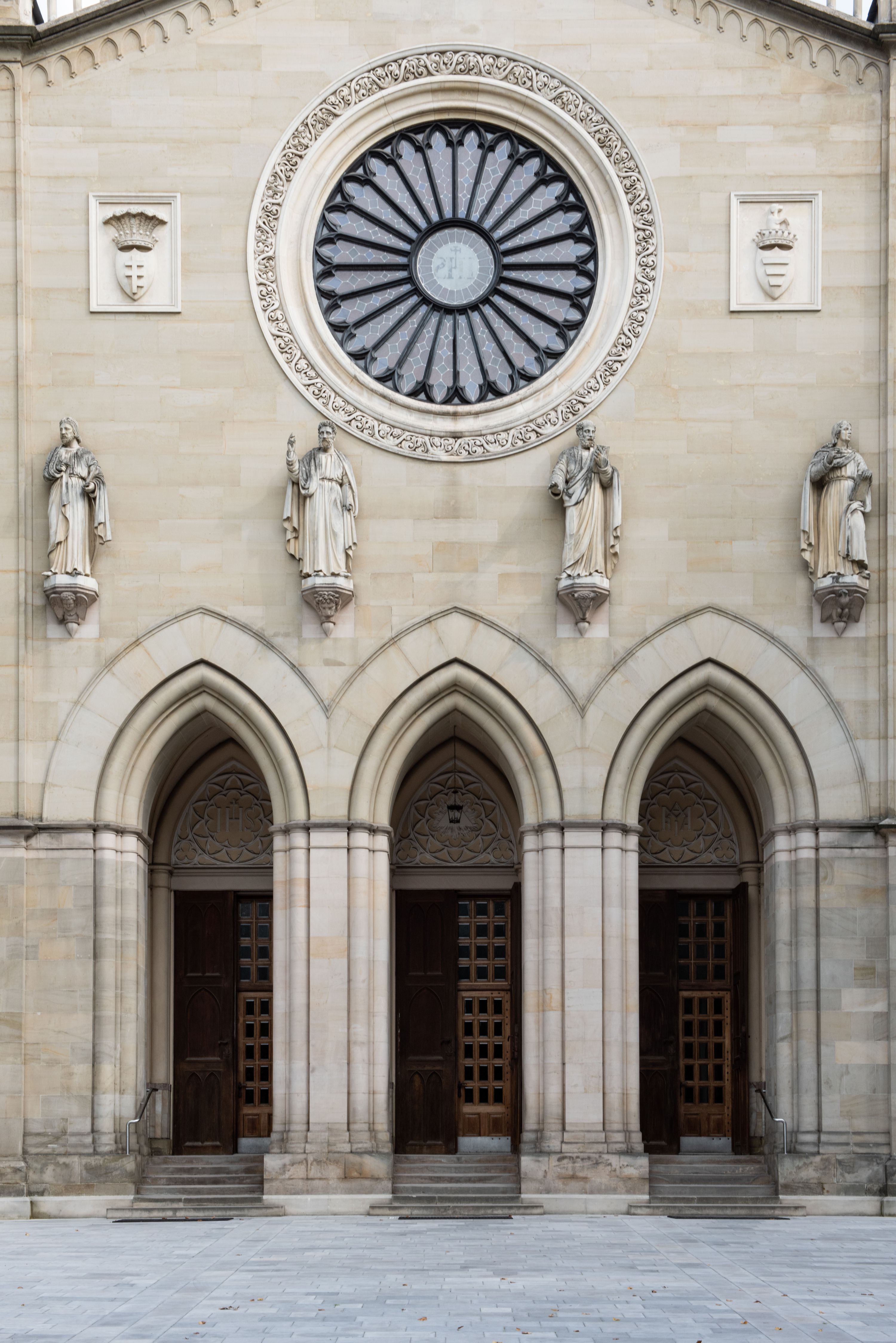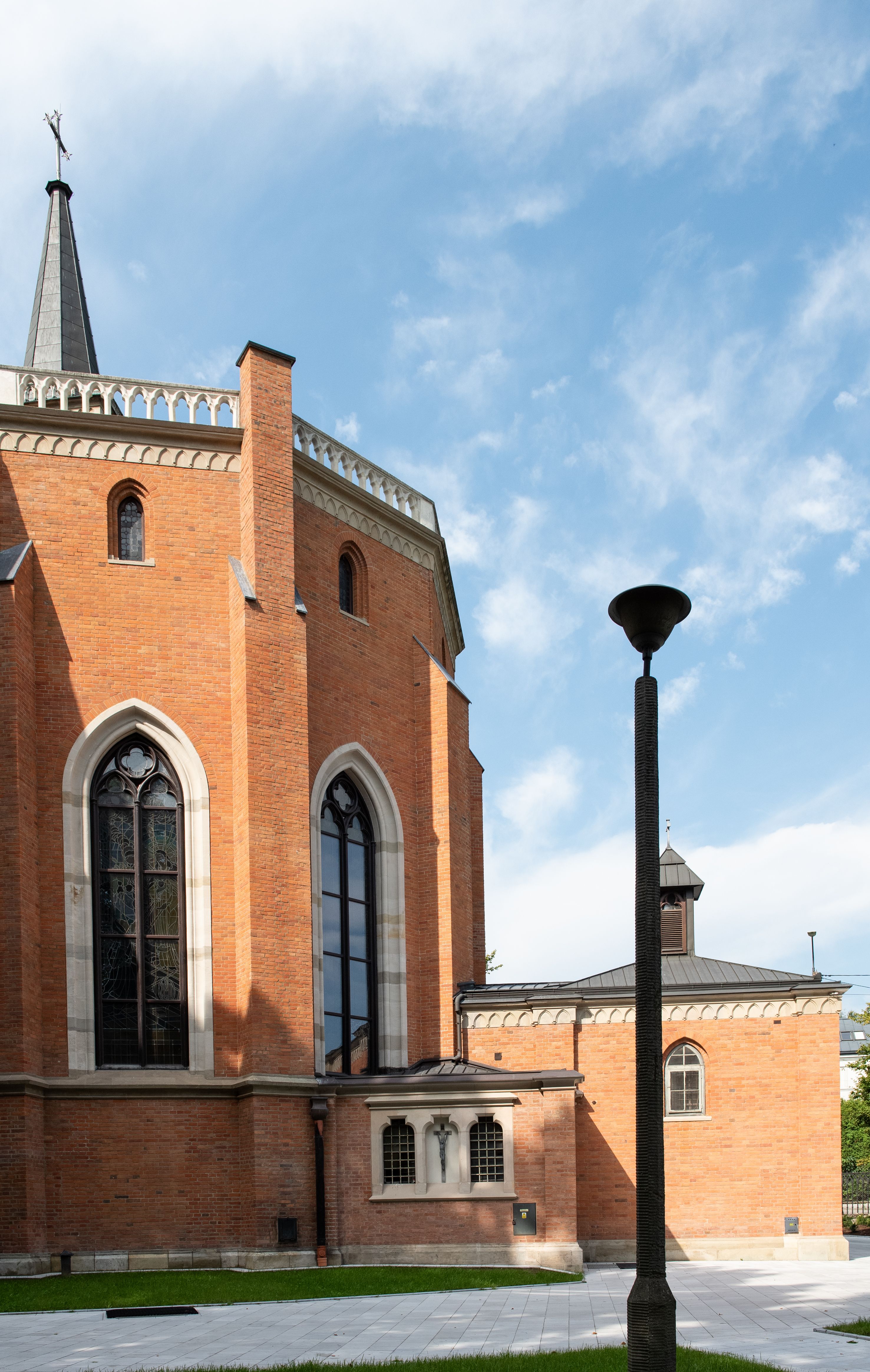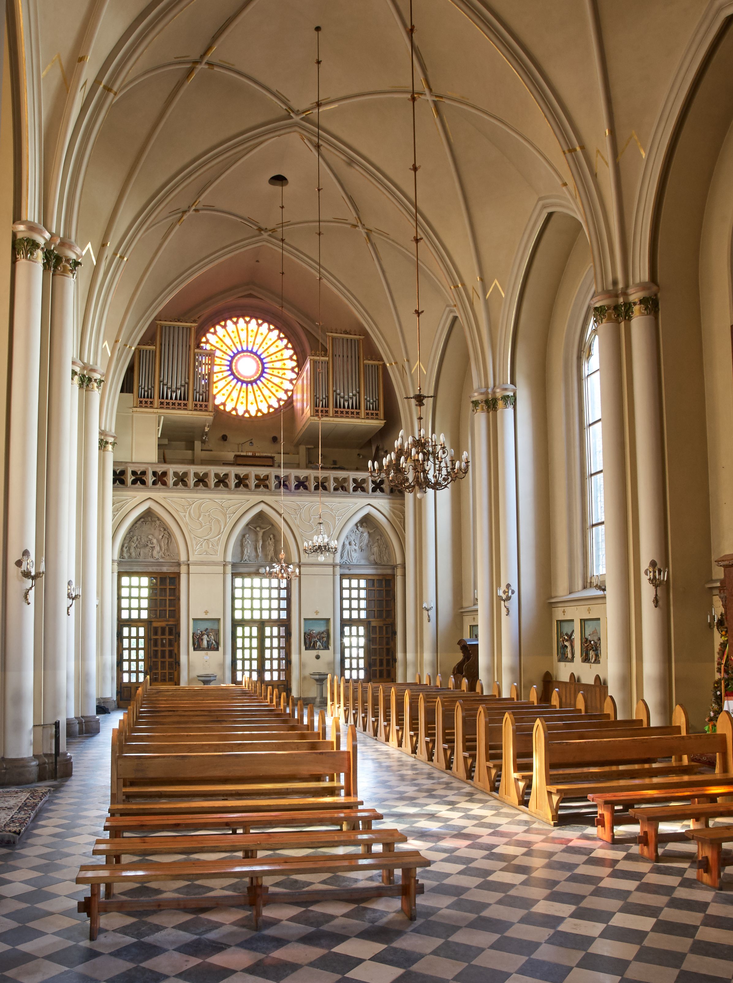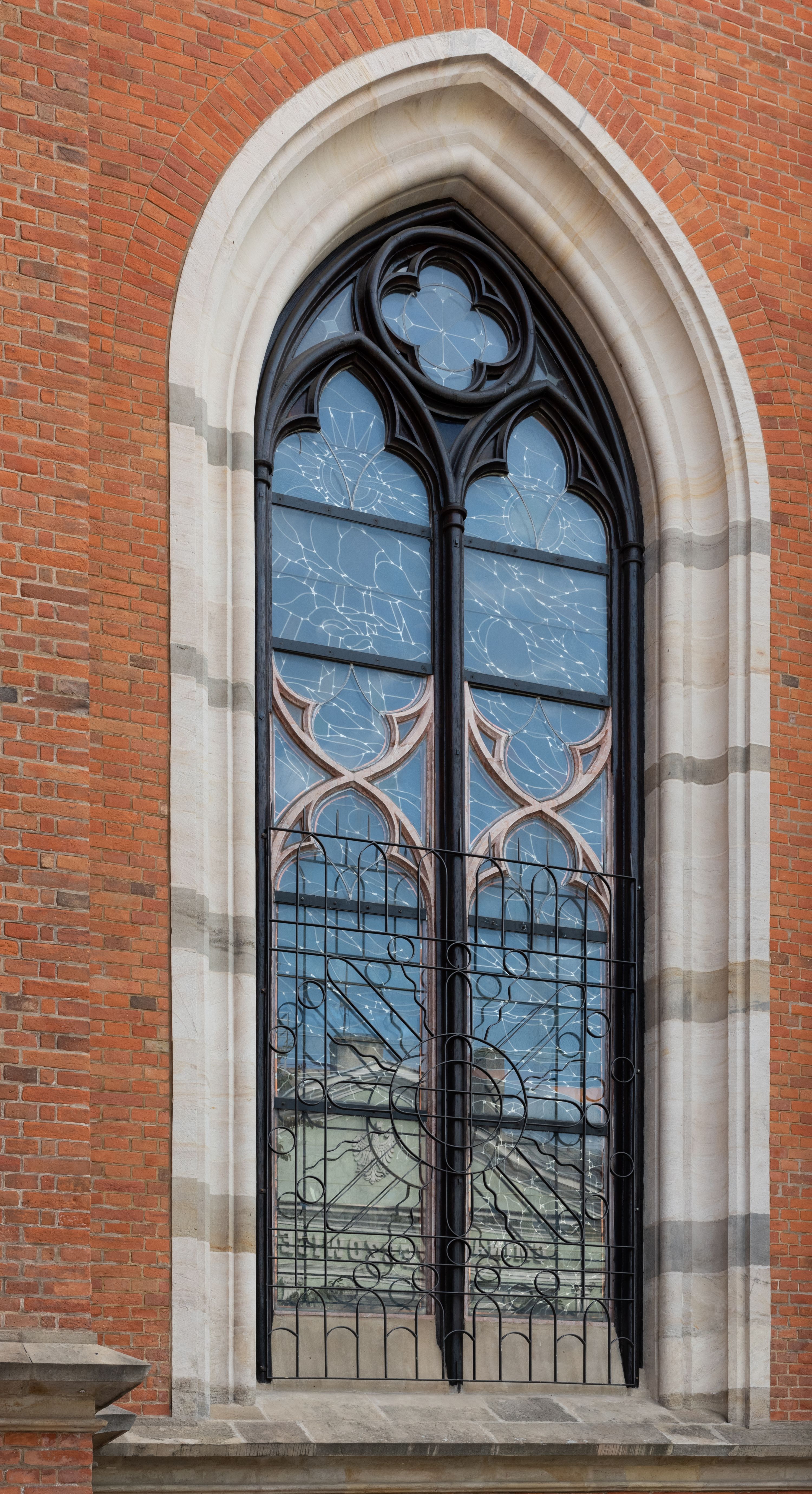 Kościół z cegły i kamienia. Na rzucie krzyża łacińskiego, jednonawowy z wciągniętymi do wnętrza przyporami. Prezbiterium krótkie, zamknięte pięcioma bokami ośmioboku. Korpus jednonawowy, czteroprzęsłowy, po bokach z płytkimi wnękami-kaplicami pomiędzy przyporami, poprzedzony od zach. przedsionkiem. Do pierwszego przęsła dostawione dwie symetryczne, trójboczne kaplice, nad nimi dwie czworoboczne wieże. Zakrystia przy prezbiterium na osi kościoła. Sklepienia krzyżowo-żebrowe, w kaplicach gwiaździste, w zakrystii kolebkowe zaostrzone i krzyżowe z lunetami. Fasada z kamienną okładziną, trójosiowa, z trzema ostrołukowymi, profilowanymi arkadami u dołu, rzeźbami czterech Ewangelistów powyżej i rozetą na osi; flankowana lizenami zwieńczonymi czworobocznymi latarniami nakrytymi ostrosłupowymi hełmami. Neogotycki, wzniesiony według projektu architekta K.F. Schinkla, w latach 1829-1844 (z przerwą 1832-1840).