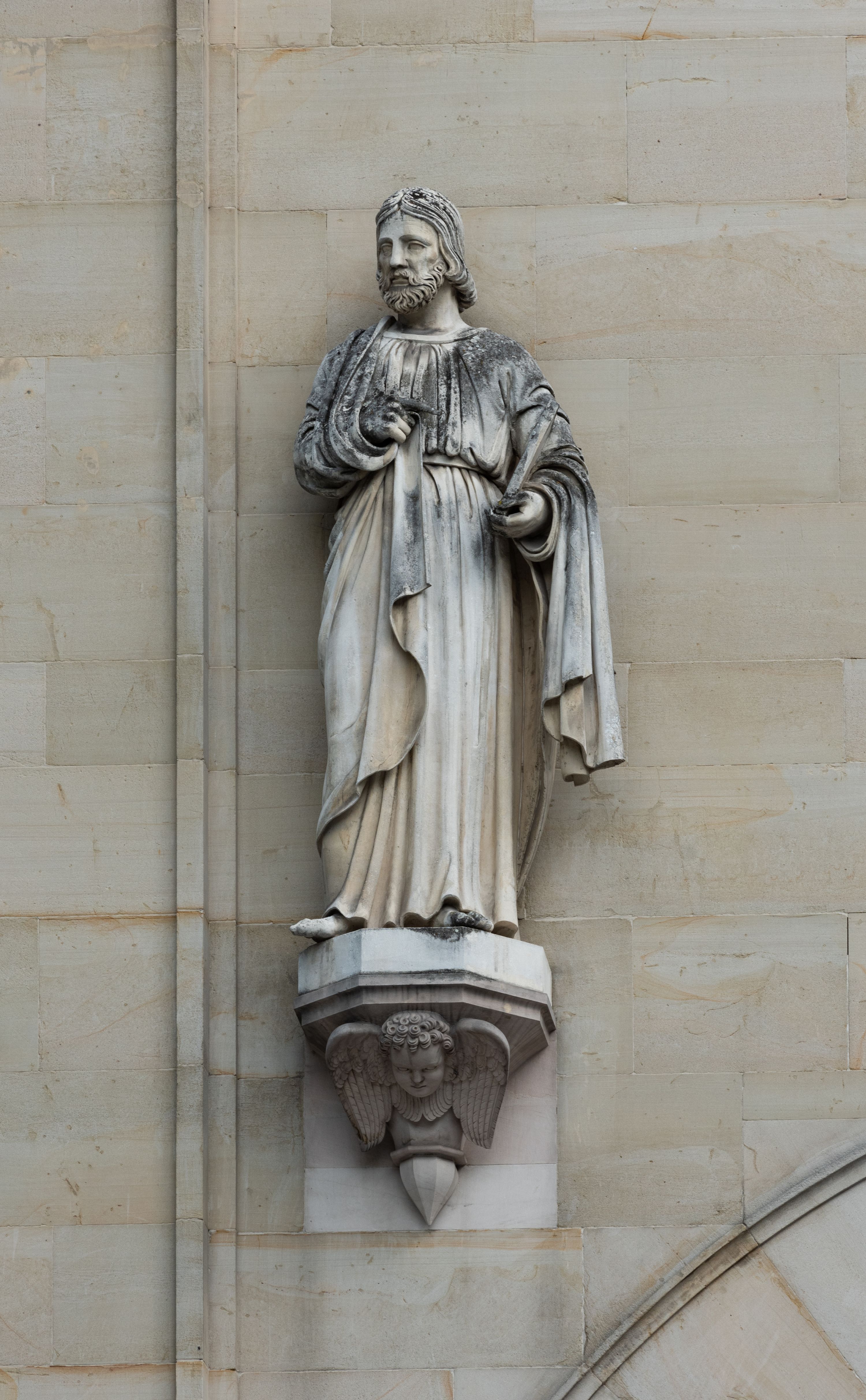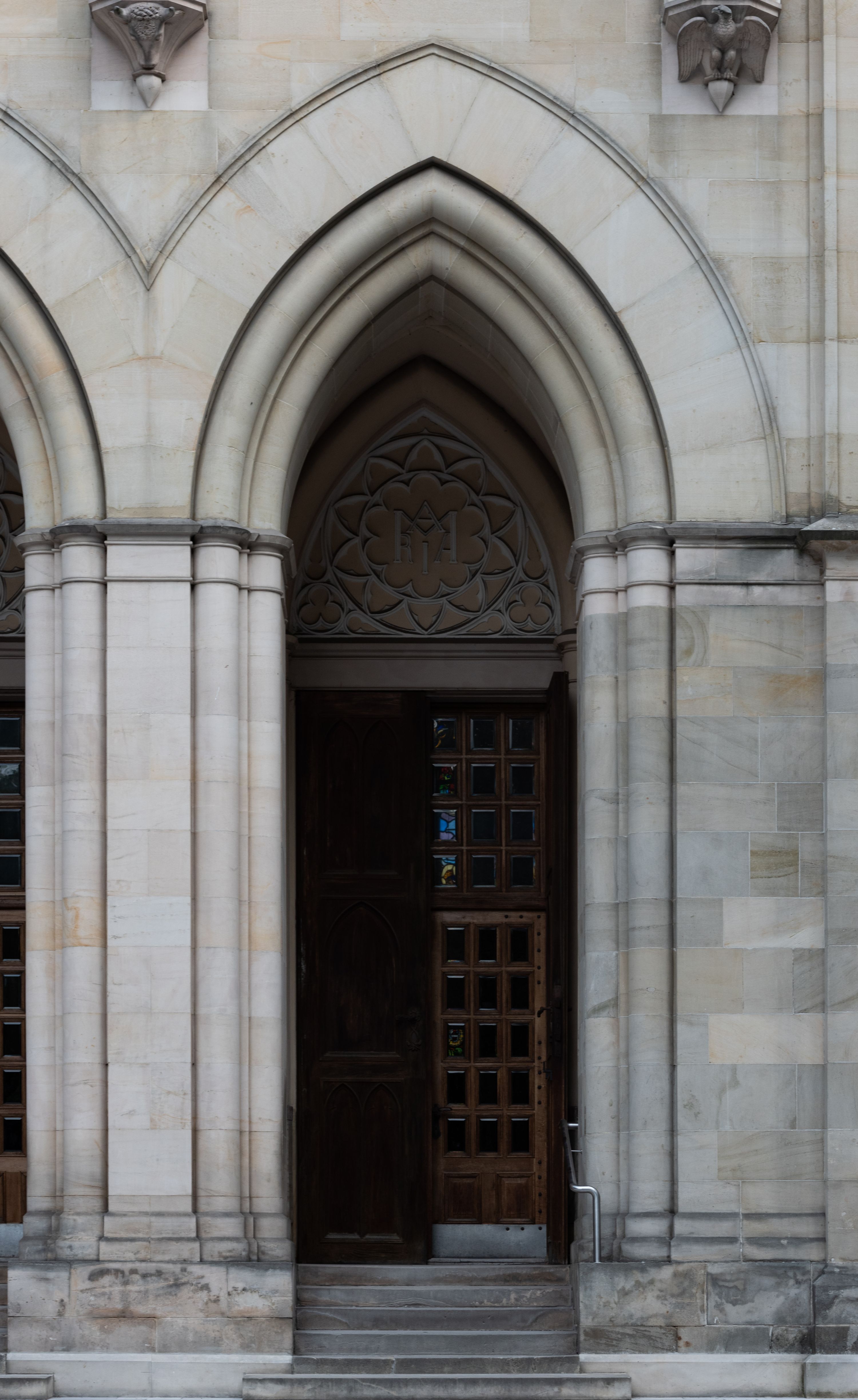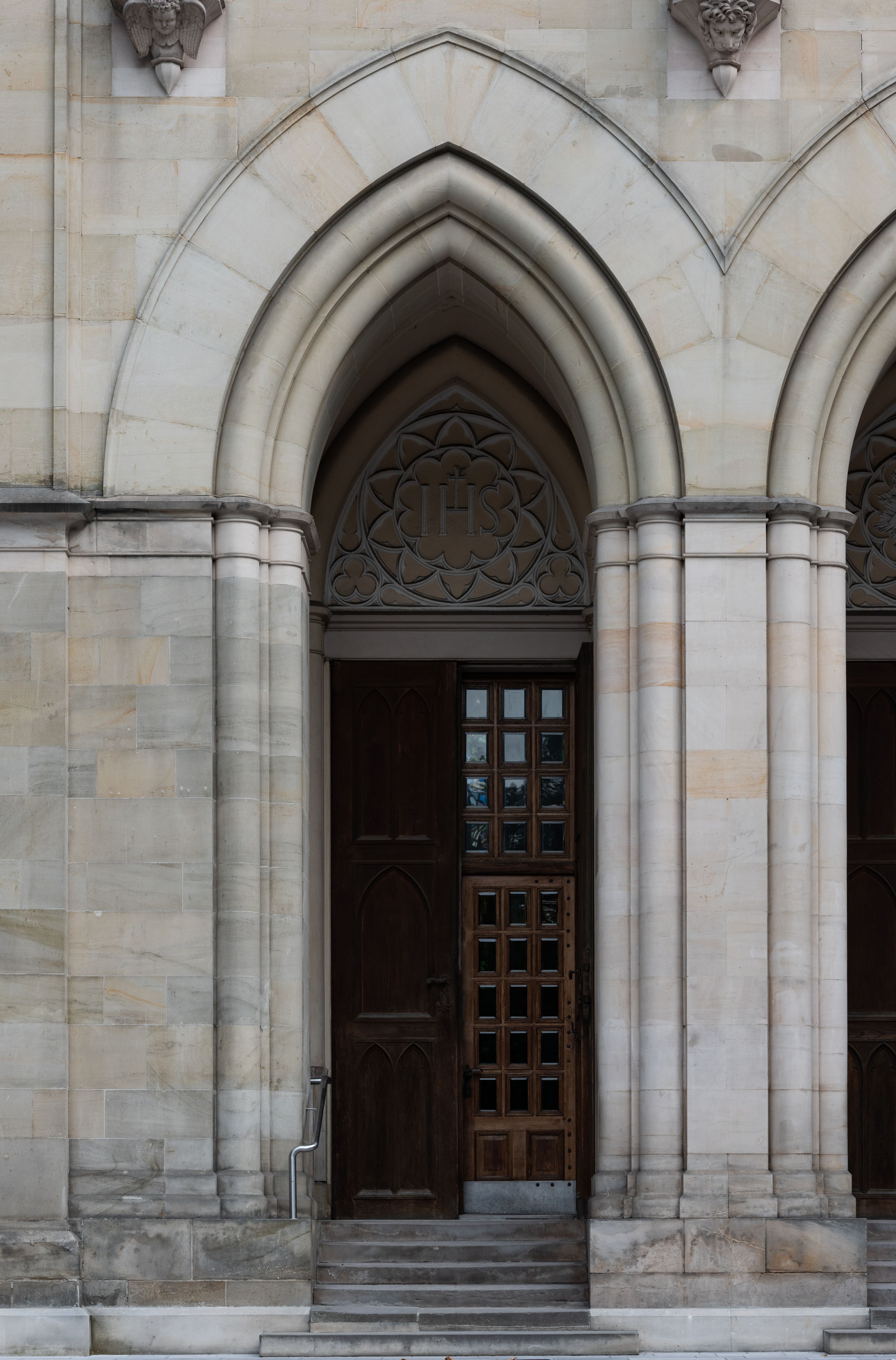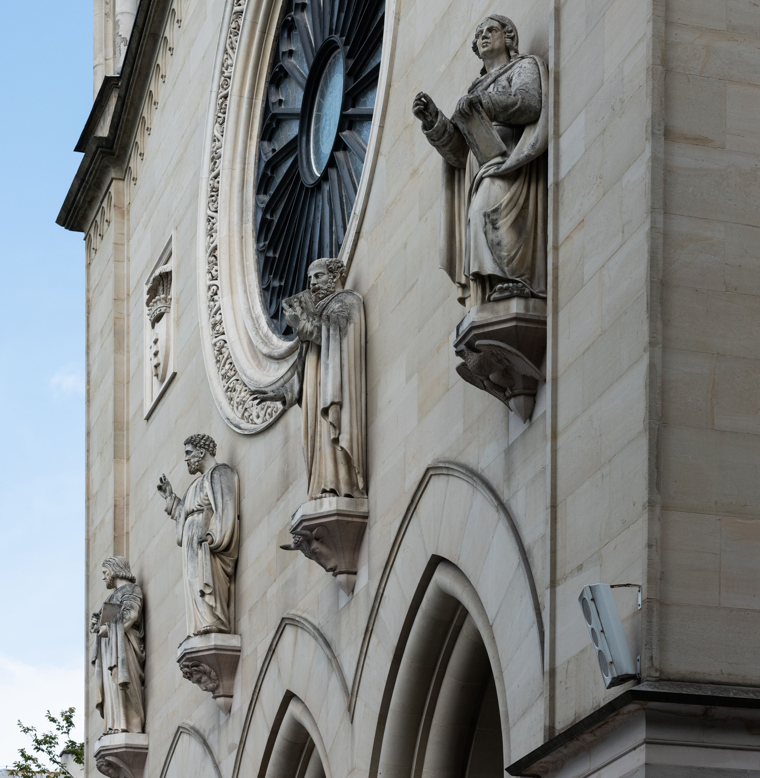 Kościół z cegły i kamienia. Na rzucie krzyża łacińskiego, jednonawowy z wciągniętymi do wnętrza przyporami. Prezbiterium krótkie, zamknięte pięcioma bokami ośmioboku. Korpus jednonawowy, czteroprzęsłowy, po bokach z płytkimi wnękami-kaplicami pomiędzy przyporami, poprzedzony od zach. przedsionkiem. Do pierwszego przęsła dostawione dwie symetryczne, trójboczne kaplice, nad nimi dwie czworoboczne wieże. Zakrystia przy prezbiterium na osi kościoła. Sklepienia krzyżowo-żebrowe, w kaplicach gwiaździste, w zakrystii kolebkowe zaostrzone i krzyżowe z lunetami. Fasada z kamienną okładziną, trójosiowa, z trzema ostrołukowymi, profilowanymi arkadami u dołu, rzeźbami czterech Ewangelistów powyżej i rozetą na osi; flankowana lizenami zwieńczonymi czworobocznymi latarniami nakrytymi ostrosłupowymi hełmami. Neogotycki, wzniesiony według projektu architekta K.F. Schinkla, w latach 1829-1844 (z przerwą 1832-1840).