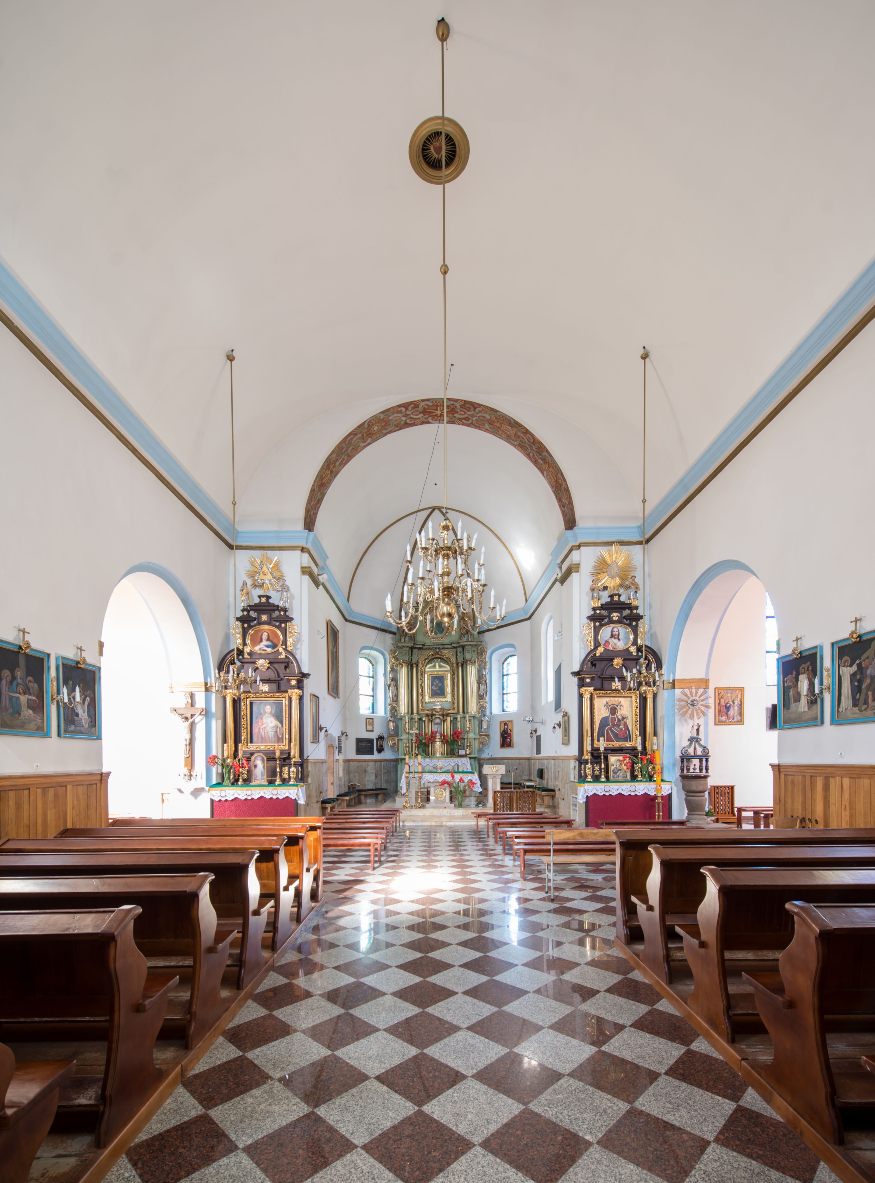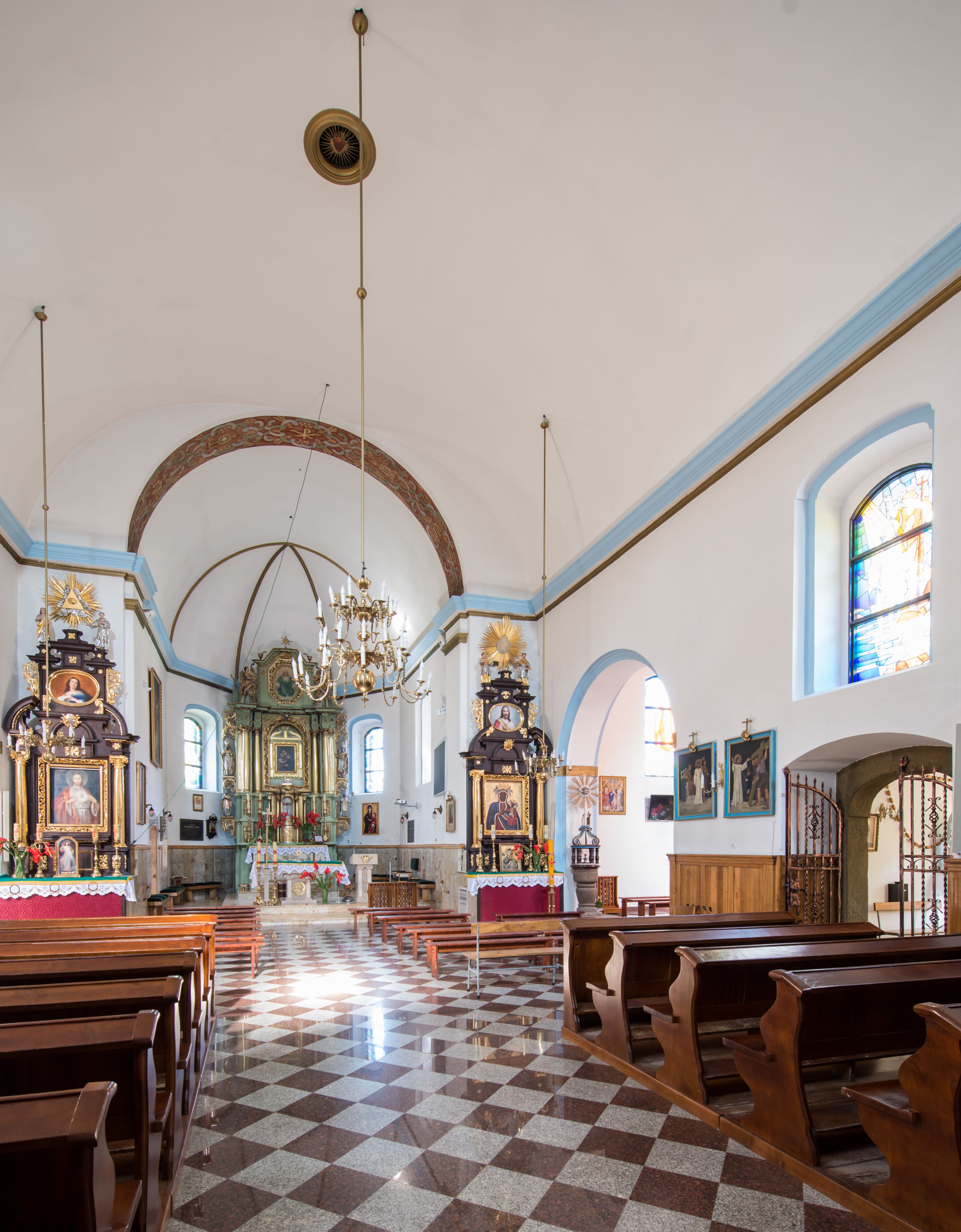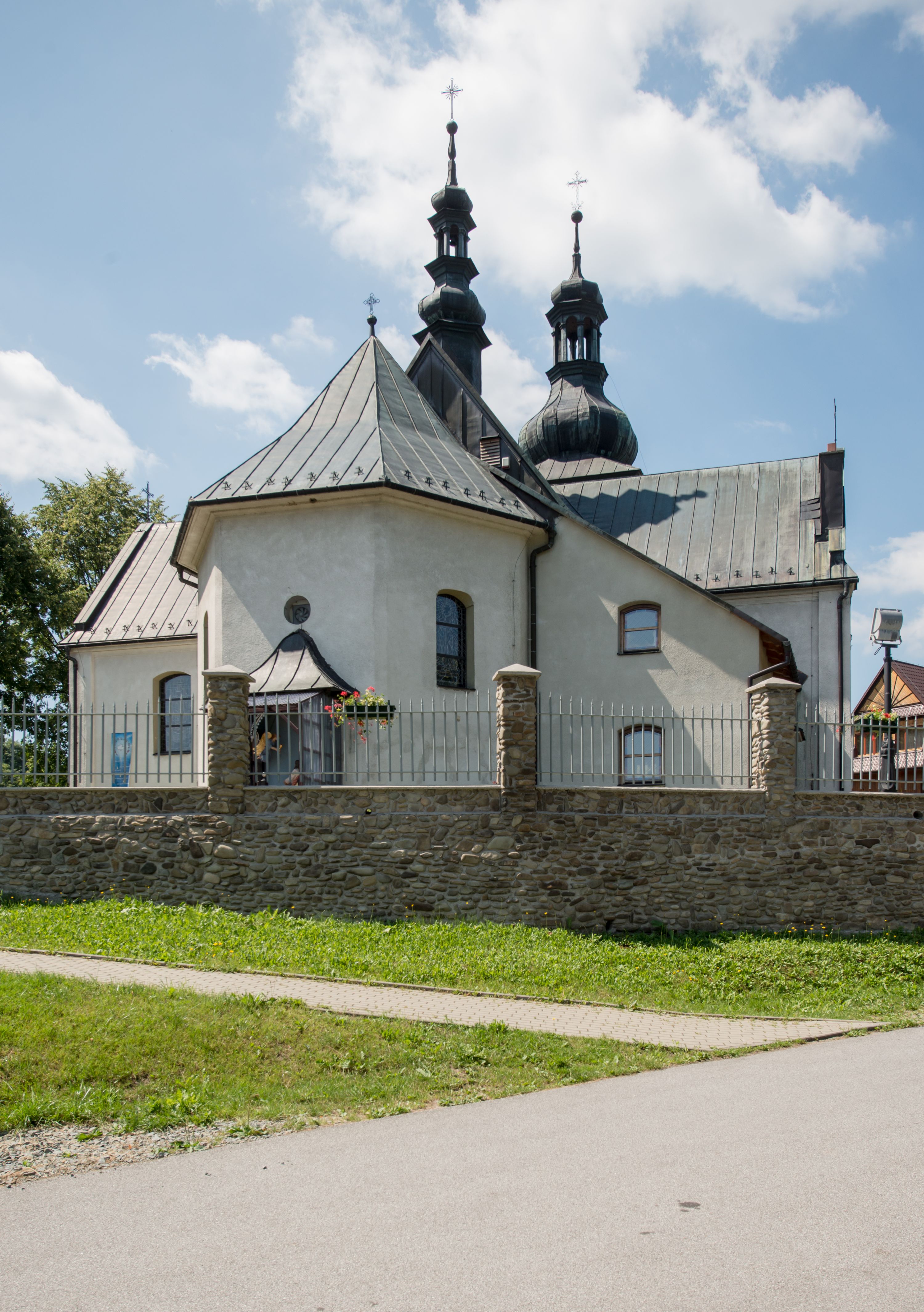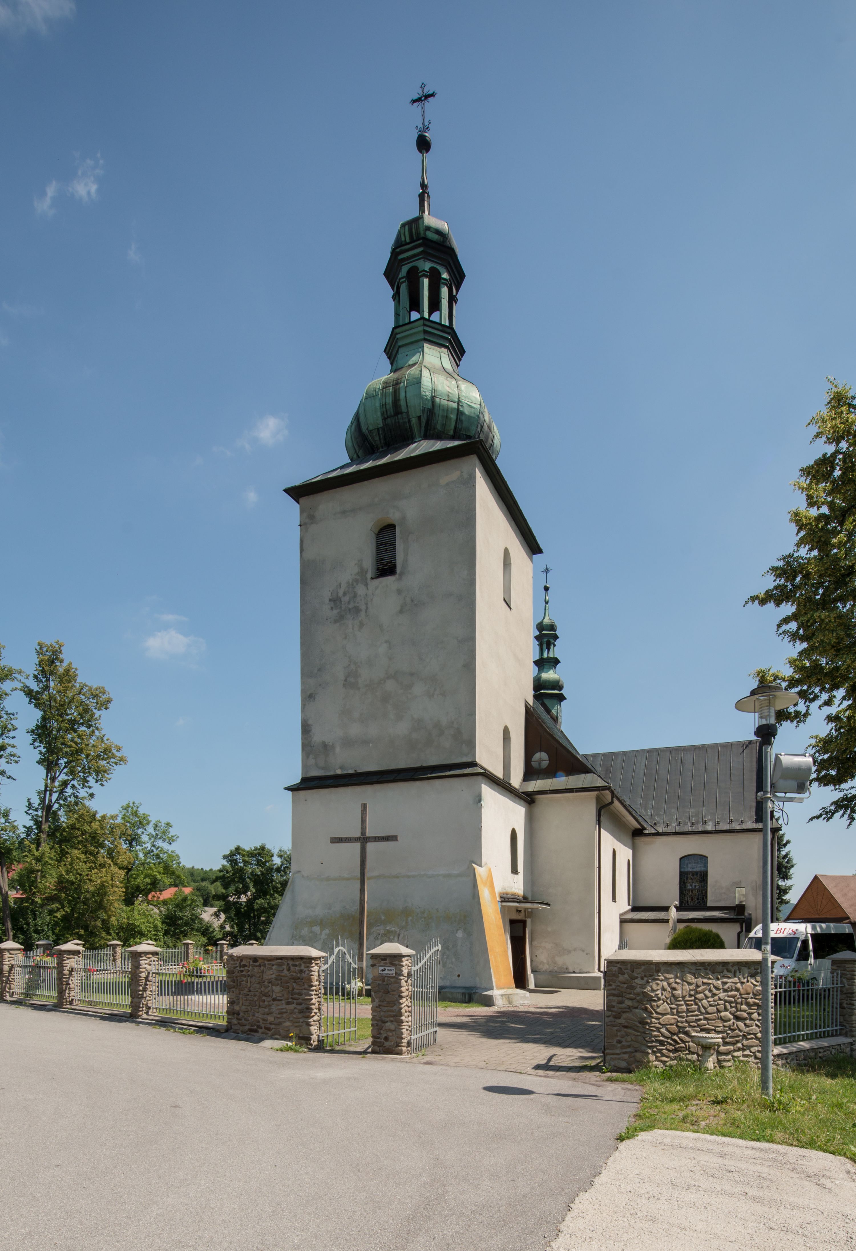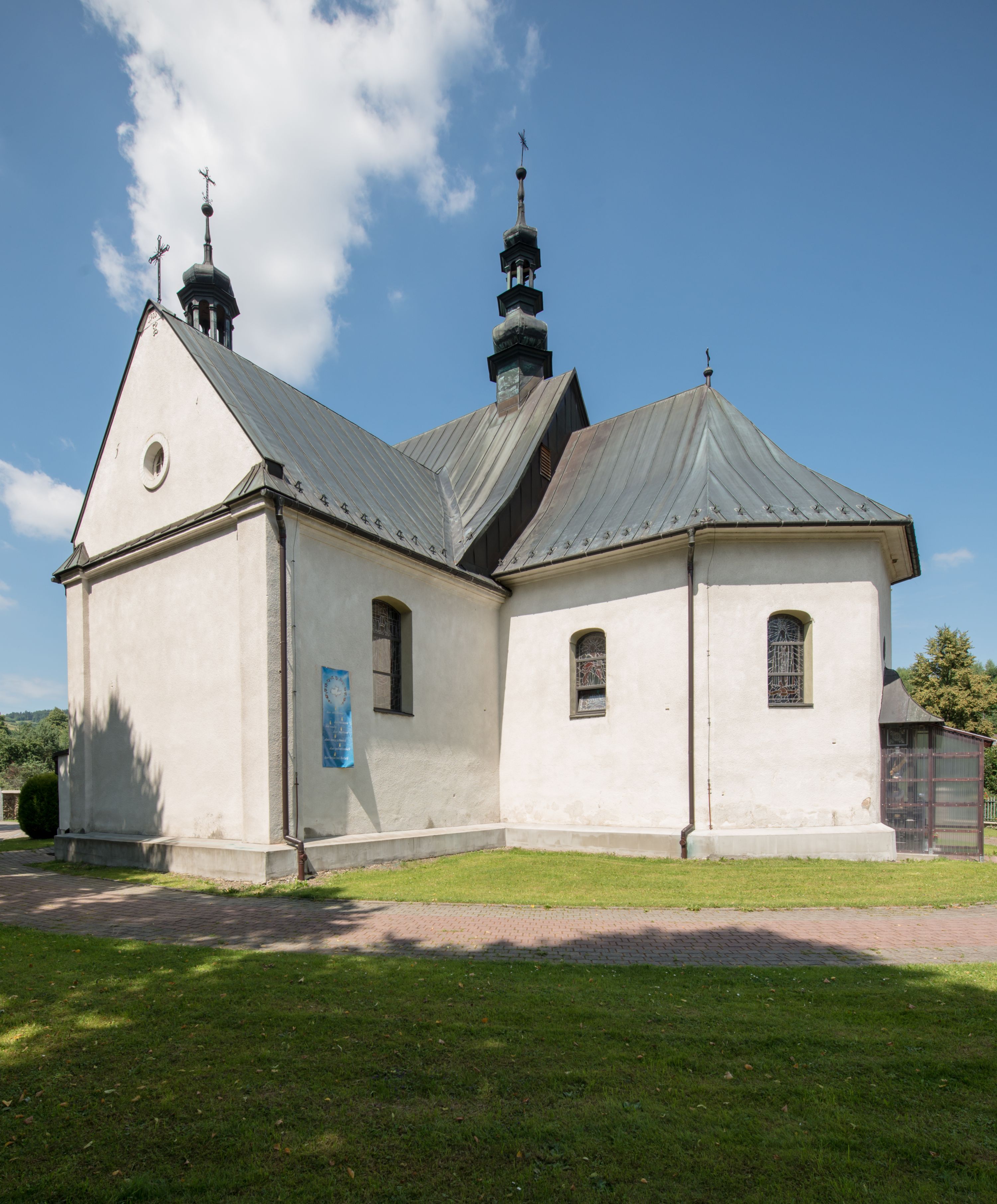 Kościół orientowany, murowany, jednonawowy, z prezbiterium, z zakrystią od północy i nawą z dwiema kaplicami – jedną od południa i drugą od północy. Od południa przylega do niego kruchta, a od zachodu wieża. Prezbiterium jest węższe od nawy, zamknięte wielobocznie, oddziela je tęcza o łuku półkolistym wsparta na pilastrach. Od zachodu chór na dwóch filarach, zamknięty balustradą wysuniętą przed lico w części środkowej i dekorowaną płycinami z umieszczonymi symetrycznie krzyżami łacińskimi. Ściany wnętrza gładkie, brak podziałów pionowych, partię ścian od sklepienia oddziela niebieski gzyms. Dół ścian wyłożony drewnianą boazerią, w prezbiterium kamiennymi płytami. Ściany przeprute oknami – prezbiterium czterema, nawa sześcioma w kształcie stojącego prostokąta zamkniętego łukiem odcinkowym, kolejne w kaplicach; większość wypełniają witraże. Główne wejście przez korpus wieżowy od zachodu, drugie od zakrystii. Elewacje kościoła są gładkie, narożniki podkreślone lizenami, wieża o dwóch kondygnacjach przedzielonych kapnikiem. W pierwszej wejście poniżej okna, od zachodu przypora, w drugiej cztery niewielkie okna. Dach jednokalenicowy, wieżyczka na sygnaturkę o kształcie barokowym, wieża przekryta hełmem baniastym z latarnią. Od zewnątrz, na wschodniej ścianie prezbiterium ogrójec w formie drewnianej altany. Do najstarszych elementów wyposażenia należą ołtarz główny z końca XVII wieku z wizerunkiem Matki Boskiej z Dzieciątkiem oraz osiemnastowieczne ołtarze boczne ustawione w nawie głównej.