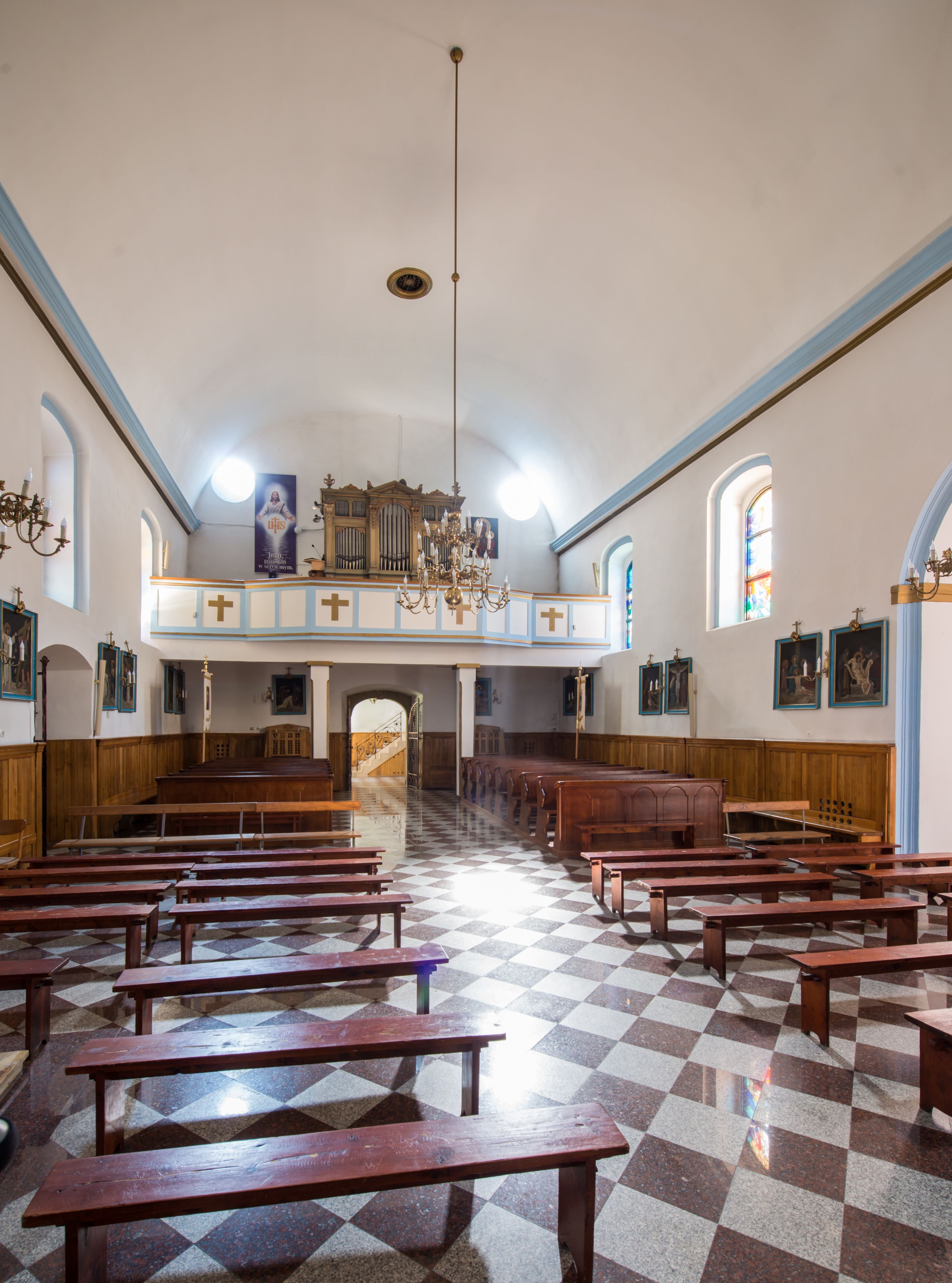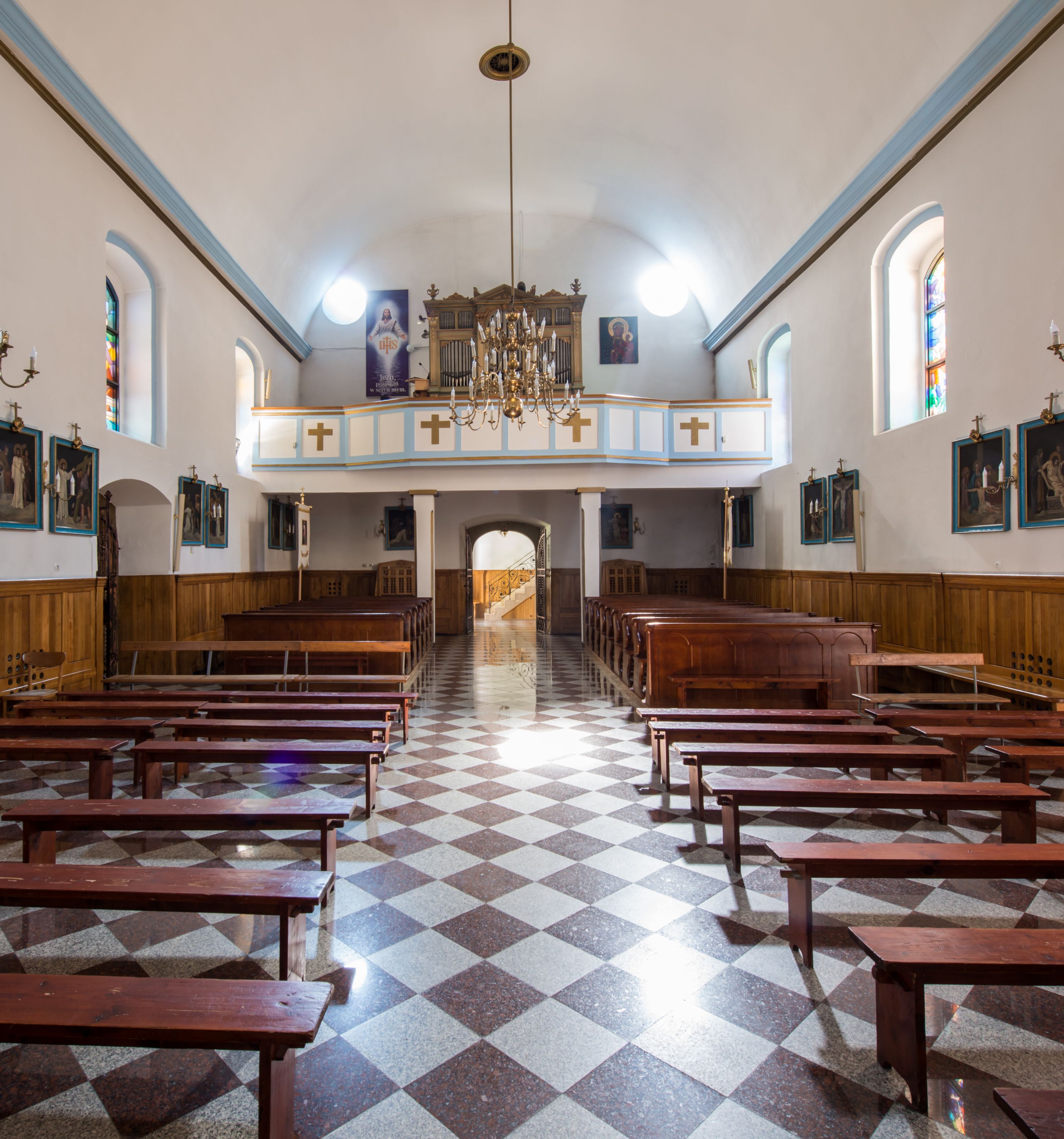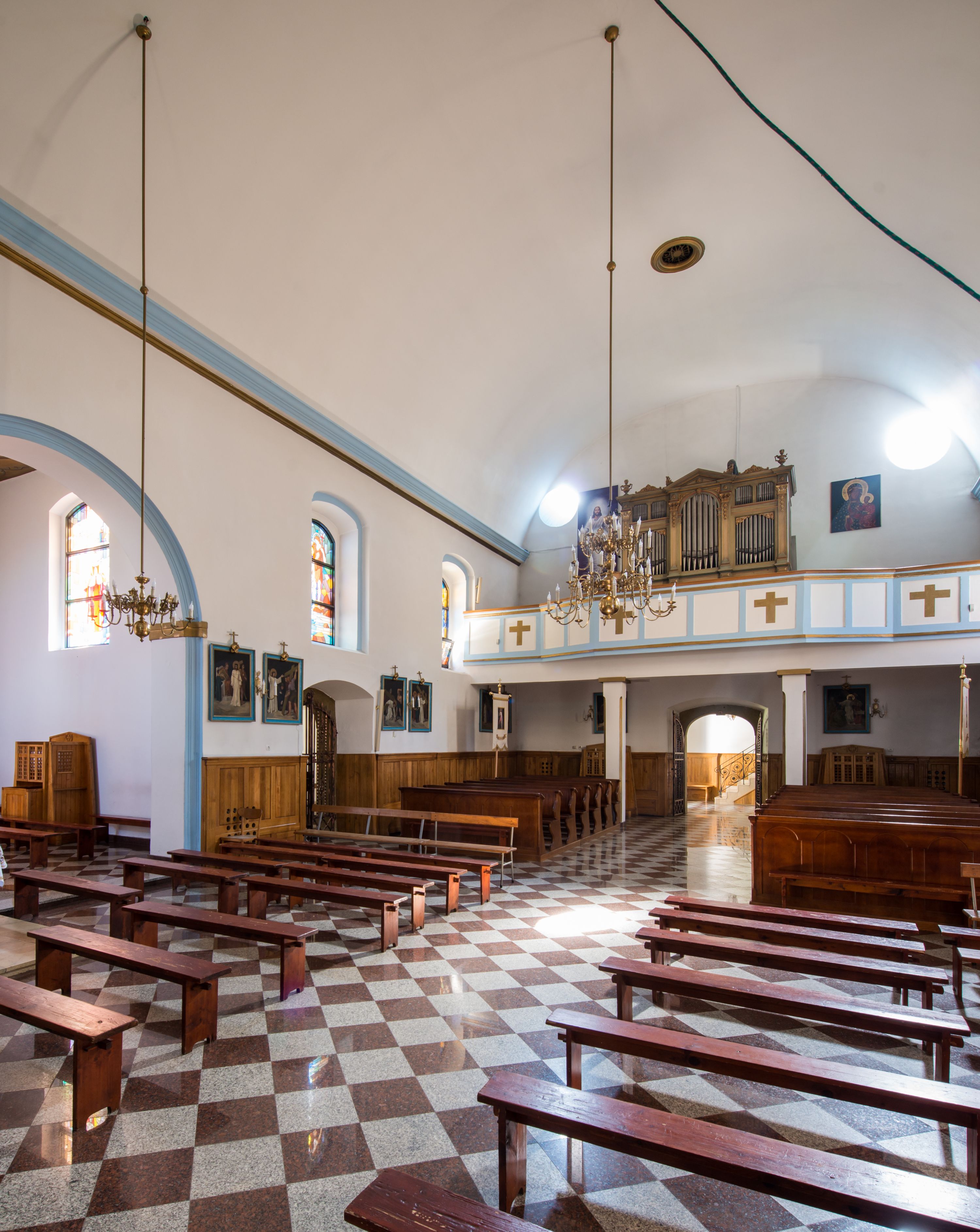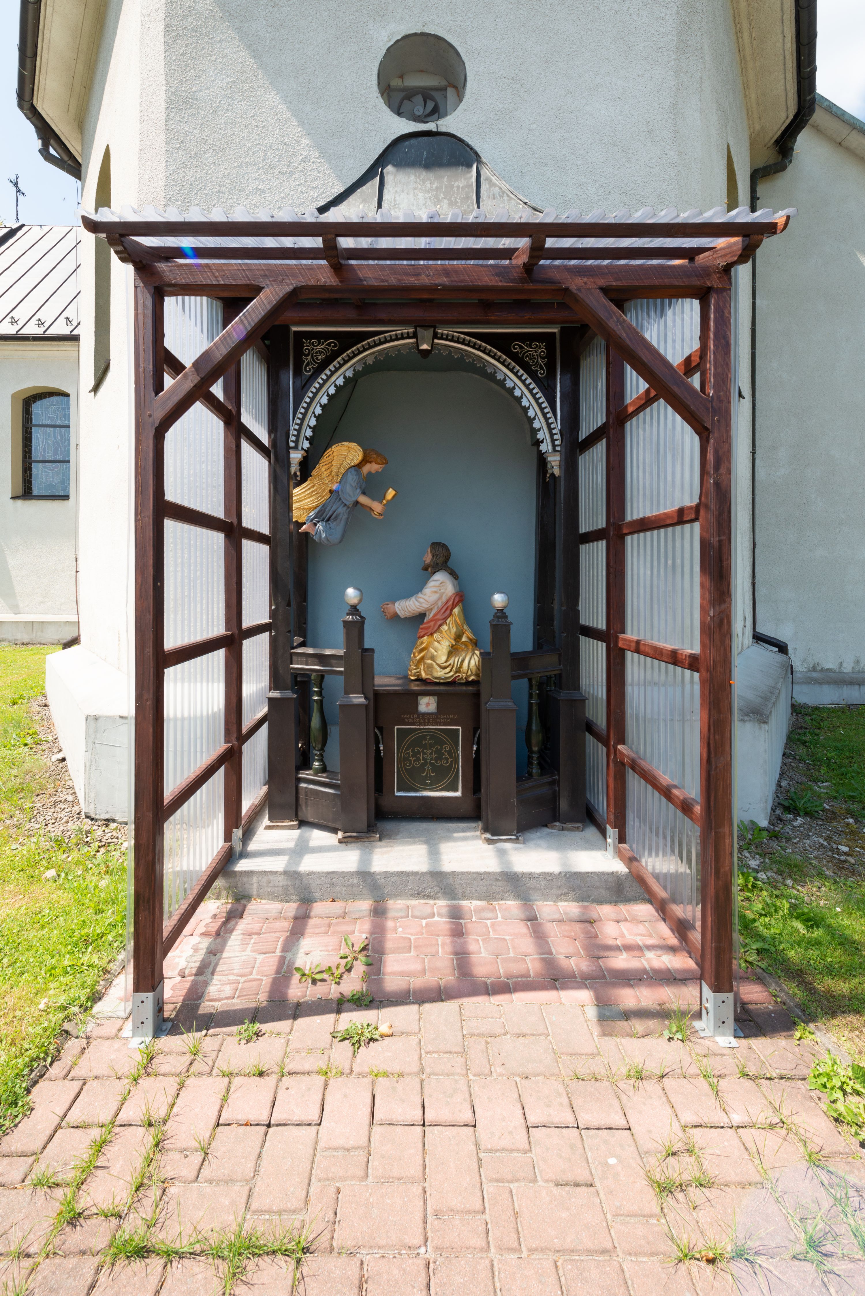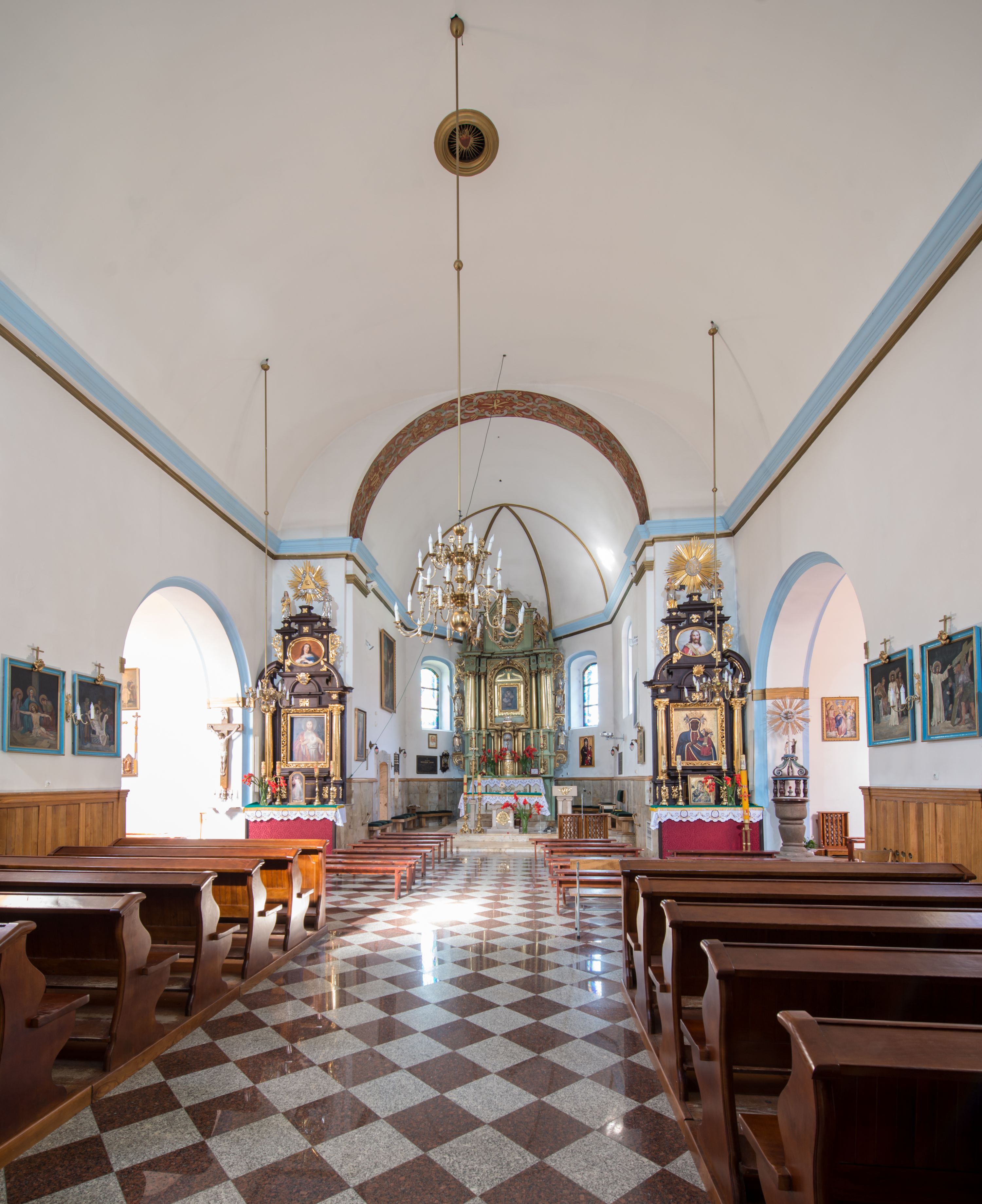 Kościół orientowany, murowany, jednonawowy, z prezbiterium, z zakrystią od północy i nawą z dwiema kaplicami – jedną od południa i drugą od północy. Od południa przylega do niego kruchta, a od zachodu wieża. Prezbiterium jest węższe od nawy, zamknięte wielobocznie, oddziela je tęcza o łuku półkolistym wsparta na pilastrach. Od zachodu chór na dwóch filarach, zamknięty balustradą wysuniętą przed lico w części środkowej i dekorowaną płycinami z umieszczonymi symetrycznie krzyżami łacińskimi. Ściany wnętrza gładkie, brak podziałów pionowych, partię ścian od sklepienia oddziela niebieski gzyms. Dół ścian wyłożony drewnianą boazerią, w prezbiterium kamiennymi płytami. Ściany przeprute oknami – prezbiterium czterema, nawa sześcioma w kształcie stojącego prostokąta zamkniętego łukiem odcinkowym, kolejne w kaplicach; większość wypełniają witraże. Główne wejście przez korpus wieżowy od zachodu, drugie od zakrystii. Elewacje kościoła są gładkie, narożniki podkreślone lizenami, wieża o dwóch kondygnacjach przedzielonych kapnikiem. W pierwszej wejście poniżej okna, od zachodu przypora, w drugiej cztery niewielkie okna. Dach jednokalenicowy, wieżyczka na sygnaturkę o kształcie barokowym, wieża przekryta hełmem baniastym z latarnią. Od zewnątrz, na wschodniej ścianie prezbiterium ogrójec w formie drewnianej altany. Do najstarszych elementów wyposażenia należą ołtarz główny z końca XVII wieku z wizerunkiem Matki Boskiej z Dzieciątkiem oraz osiemnastowieczne ołtarze boczne ustawione w nawie głównej.