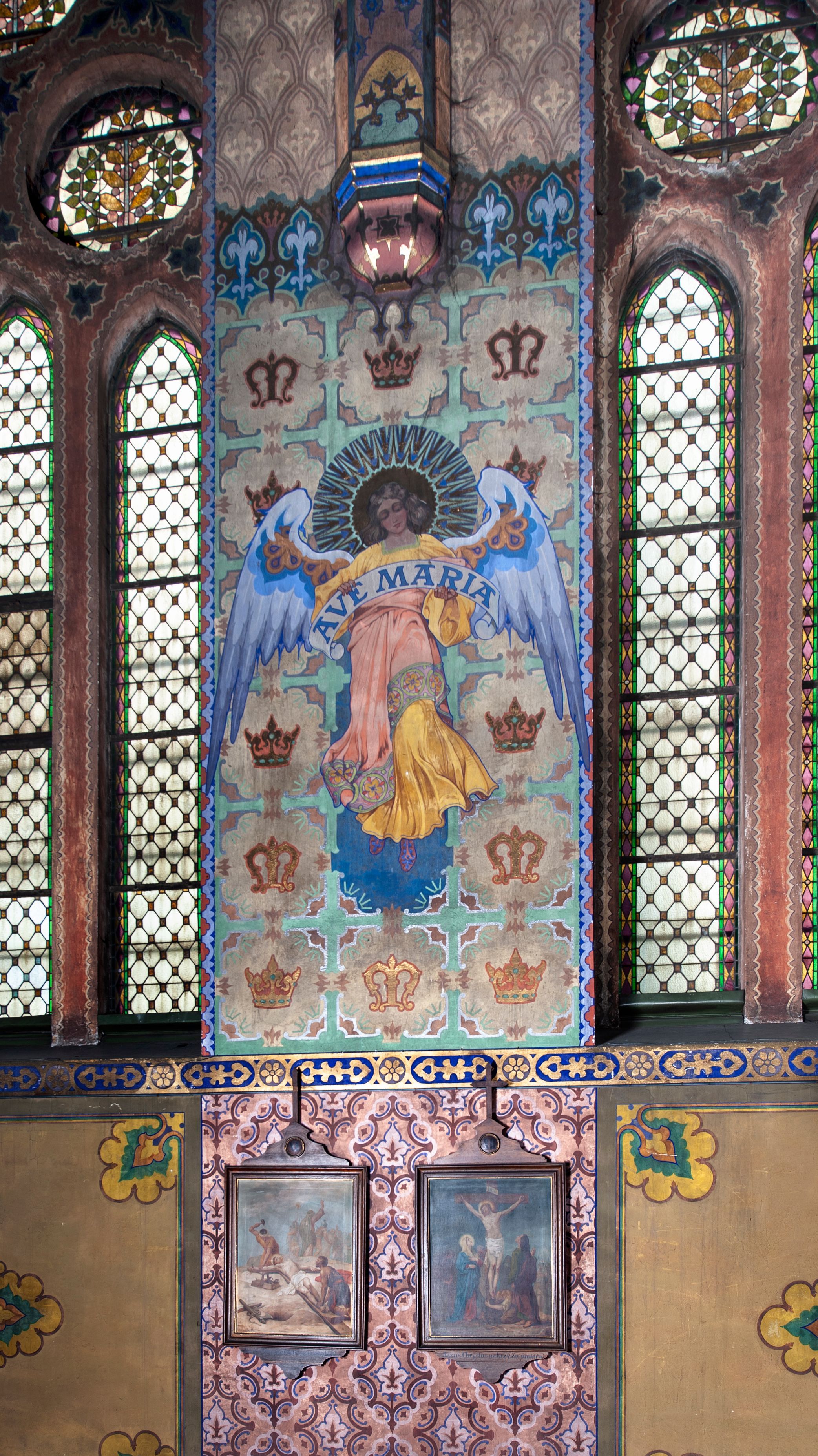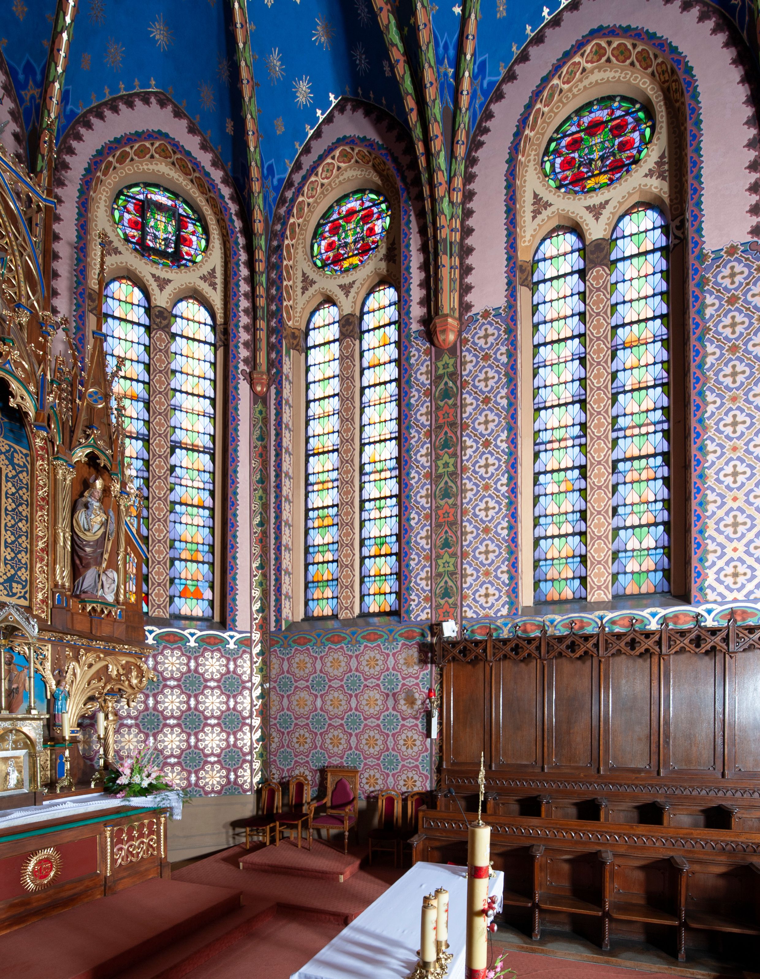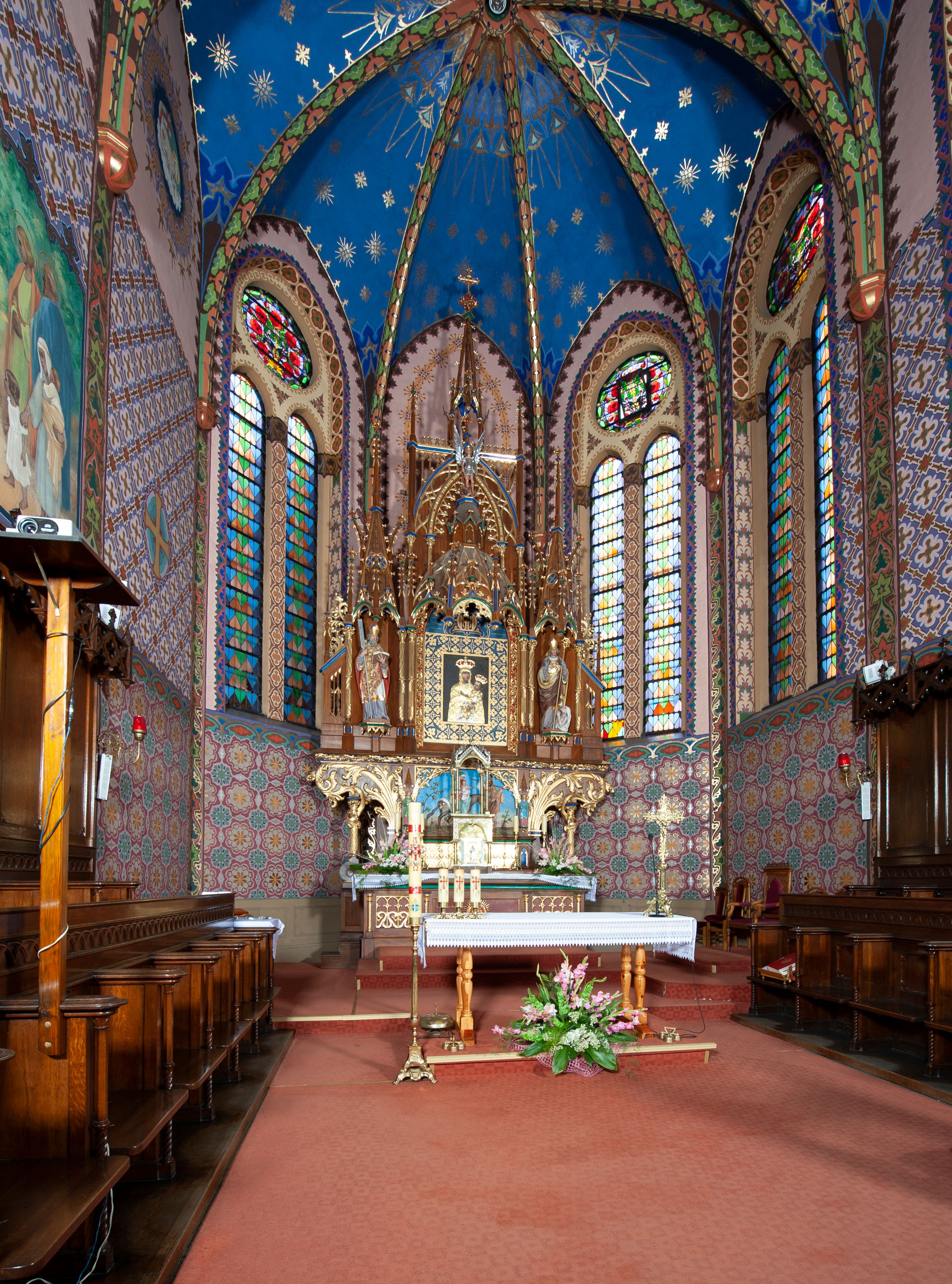 Wnętrze artykułowe ostrołukowymi arkadami wspartymi na filarach. Korpus sześcioprzęsłowy, nakryty sklepieniem krzyżowo-żebrowym; prezbiterium dwuprzęsłowe, węższe od korpusu ze sklepieniem gwiaździstym. Chór muzyczny wsparty na trzech arkadach. W kościele duże okna pseudomaswerkowe w kształcie stojących prostokątów, zamkniętych ostrołukowo, wypełnione witrażami.
