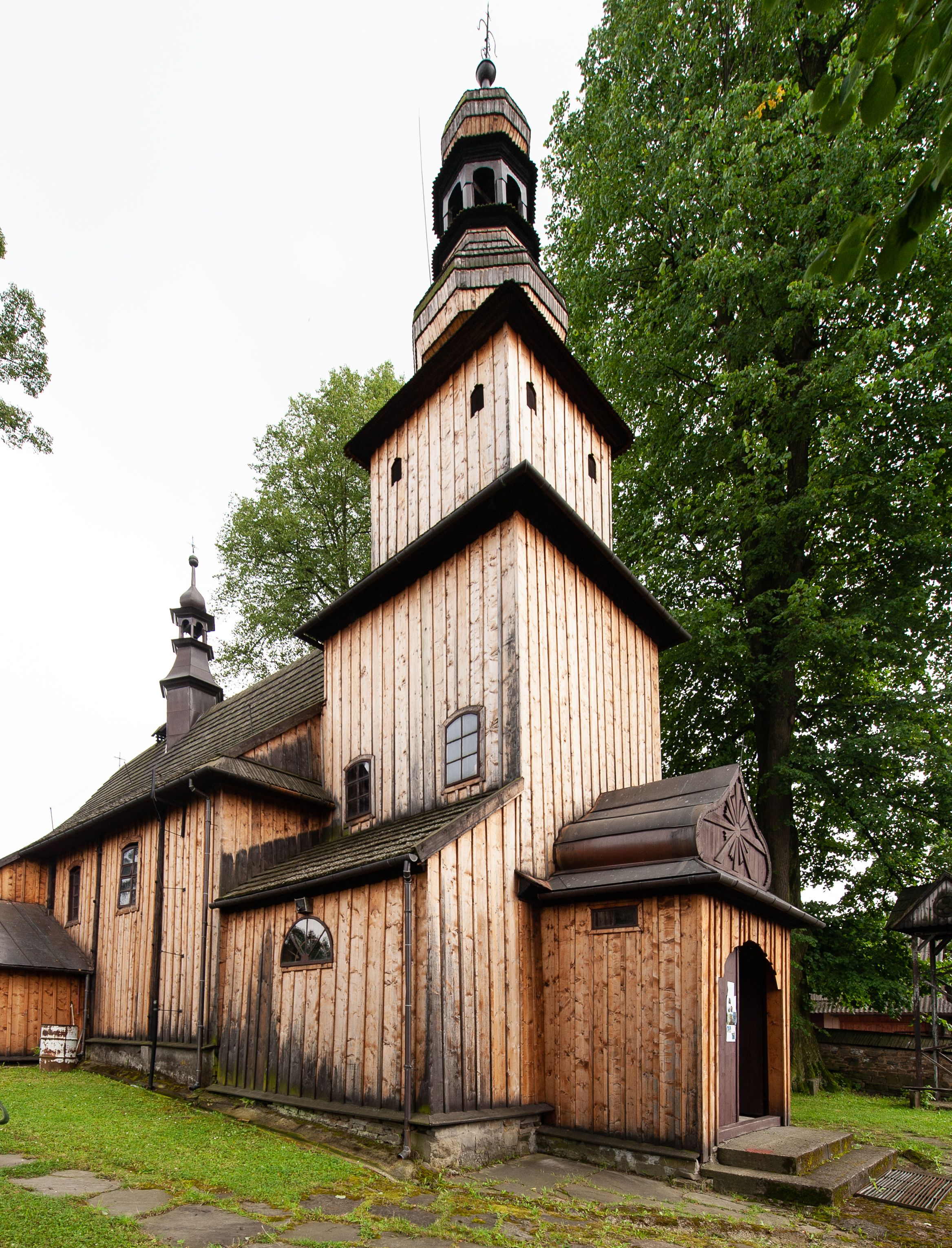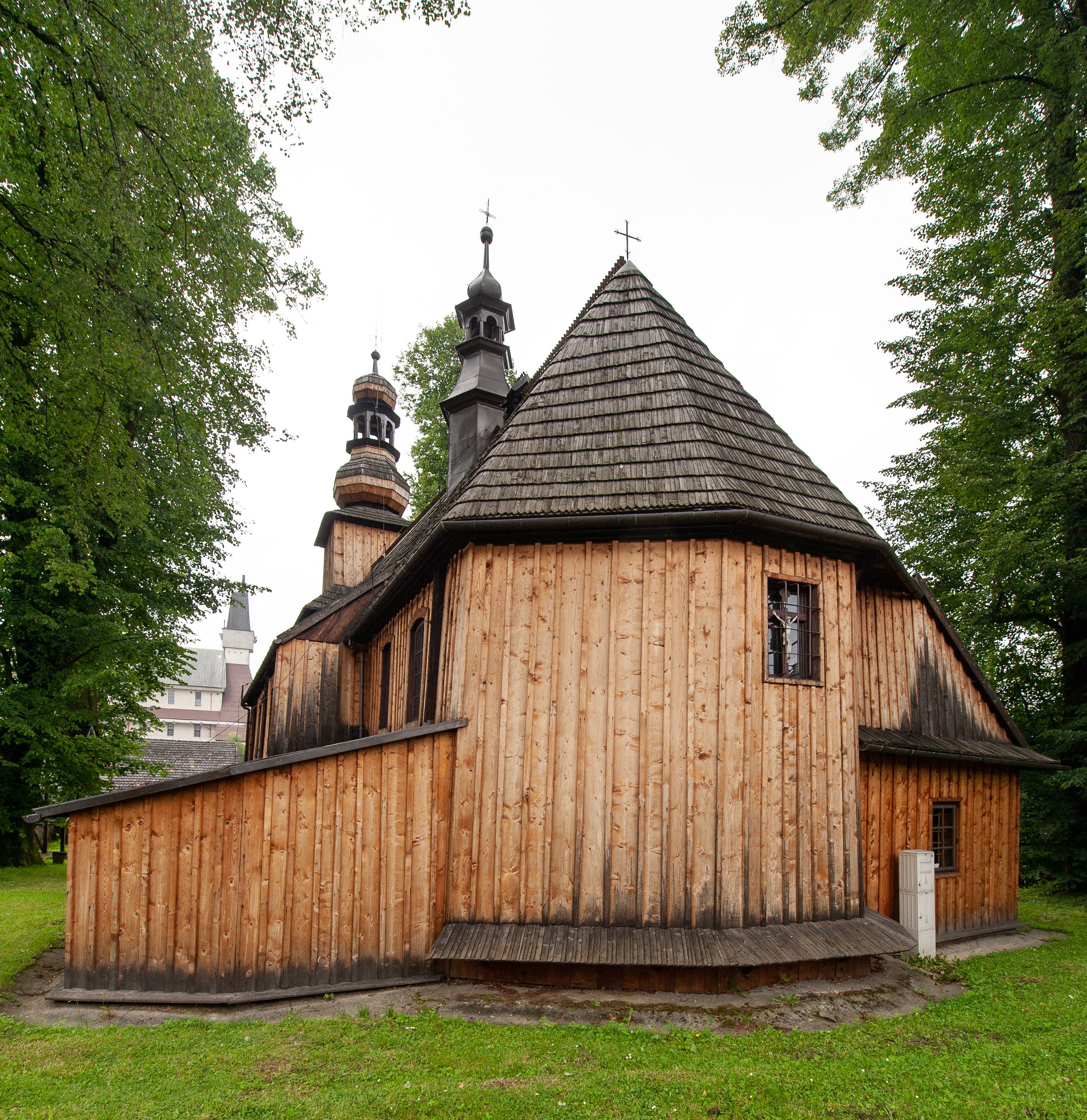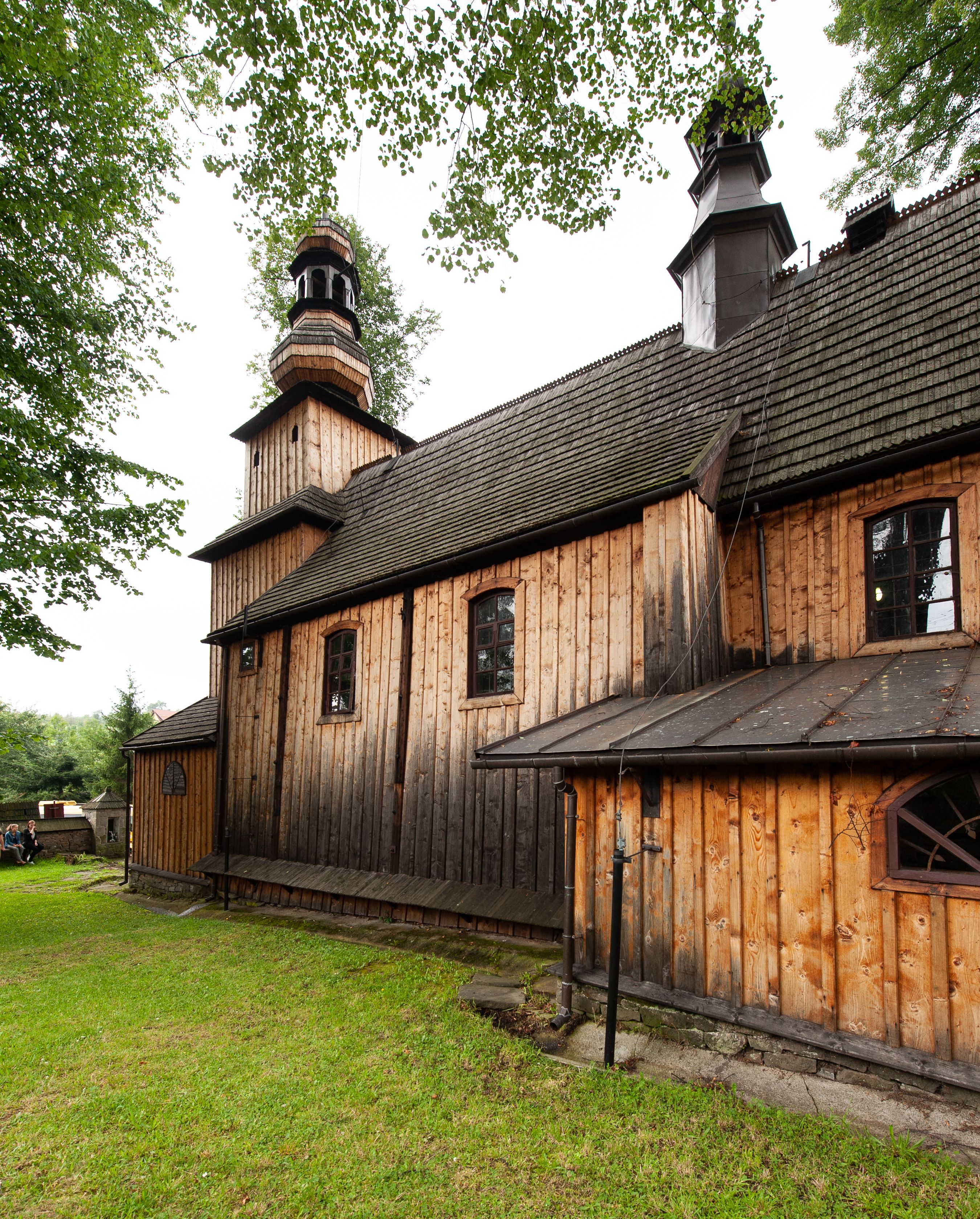 Kościół drewniany, konstrukcji zrębowej, z wieżą na słup, szalowany; orientowany, nawa prostokątna, z węższym, zamkniętym wielobocznie prezbiterium, przy którym zakrystia od północy, od południa kaplica. Przy nawie od zachodu wieża na rzucie kwadratu. Wewnątrz stropy, w nawie z zaskrzynieniami na słupach. Wzniesiony w 1678 roku przez małopolski warsztat ciesielski, odnowiony w 1760 roku.