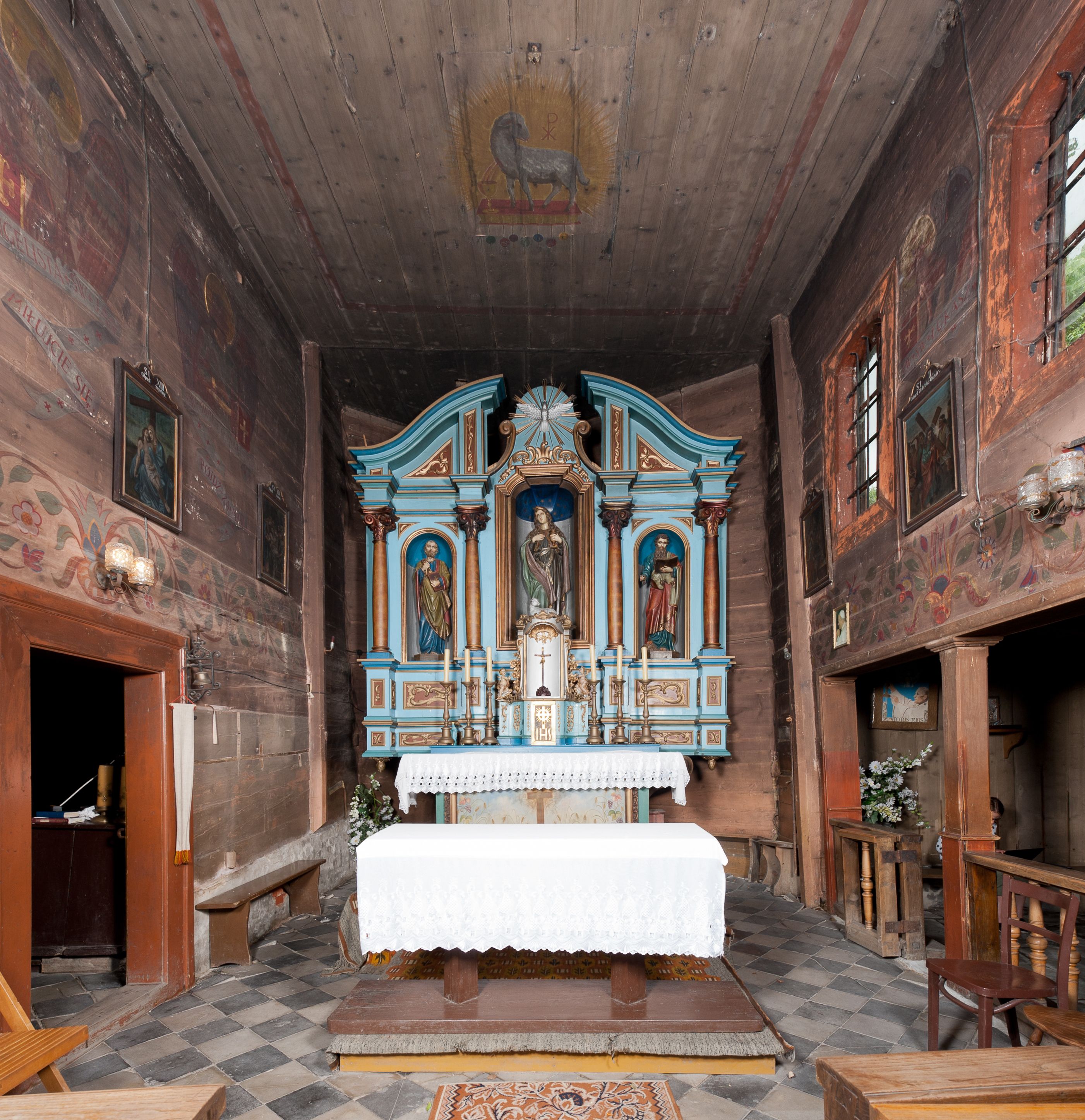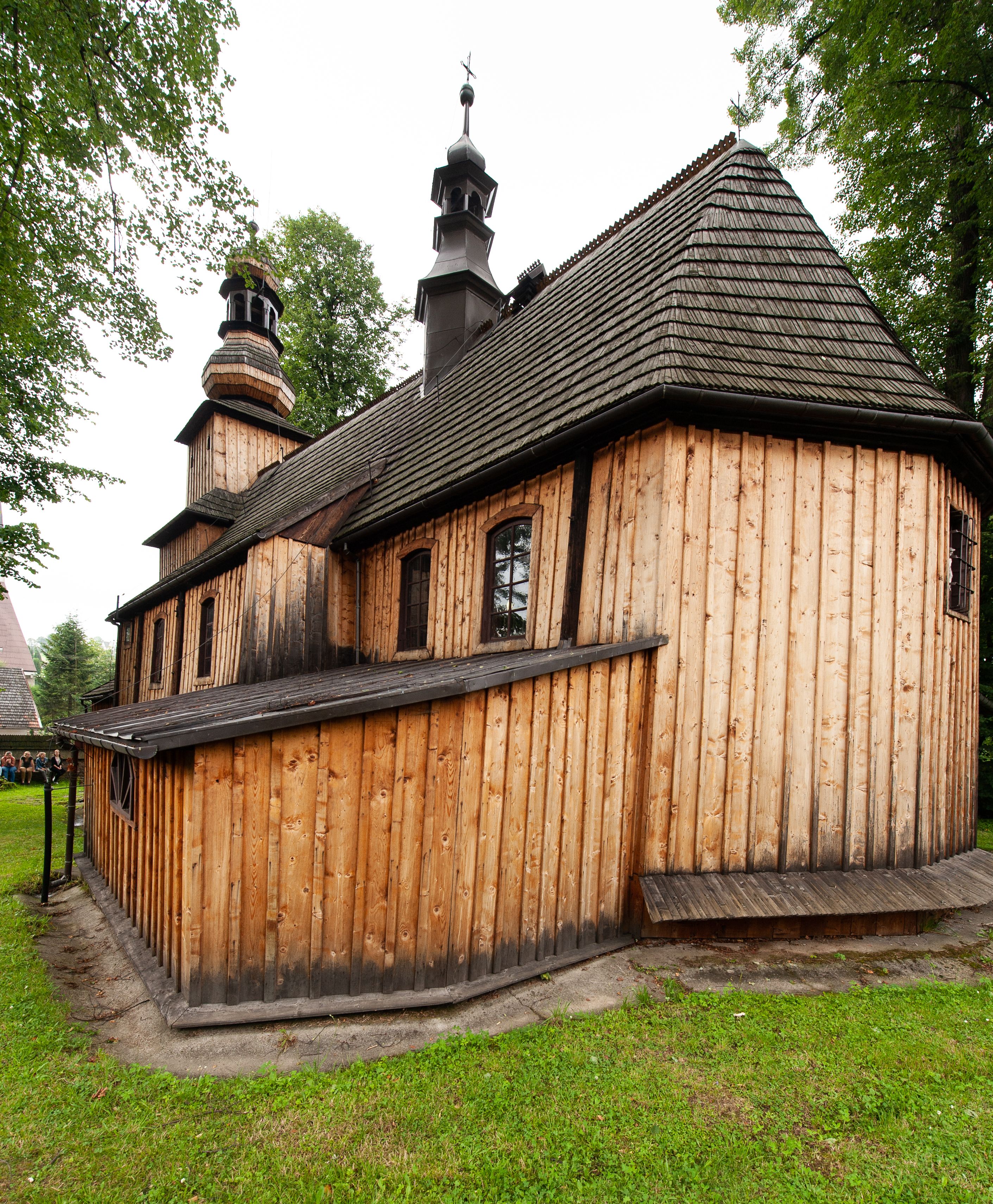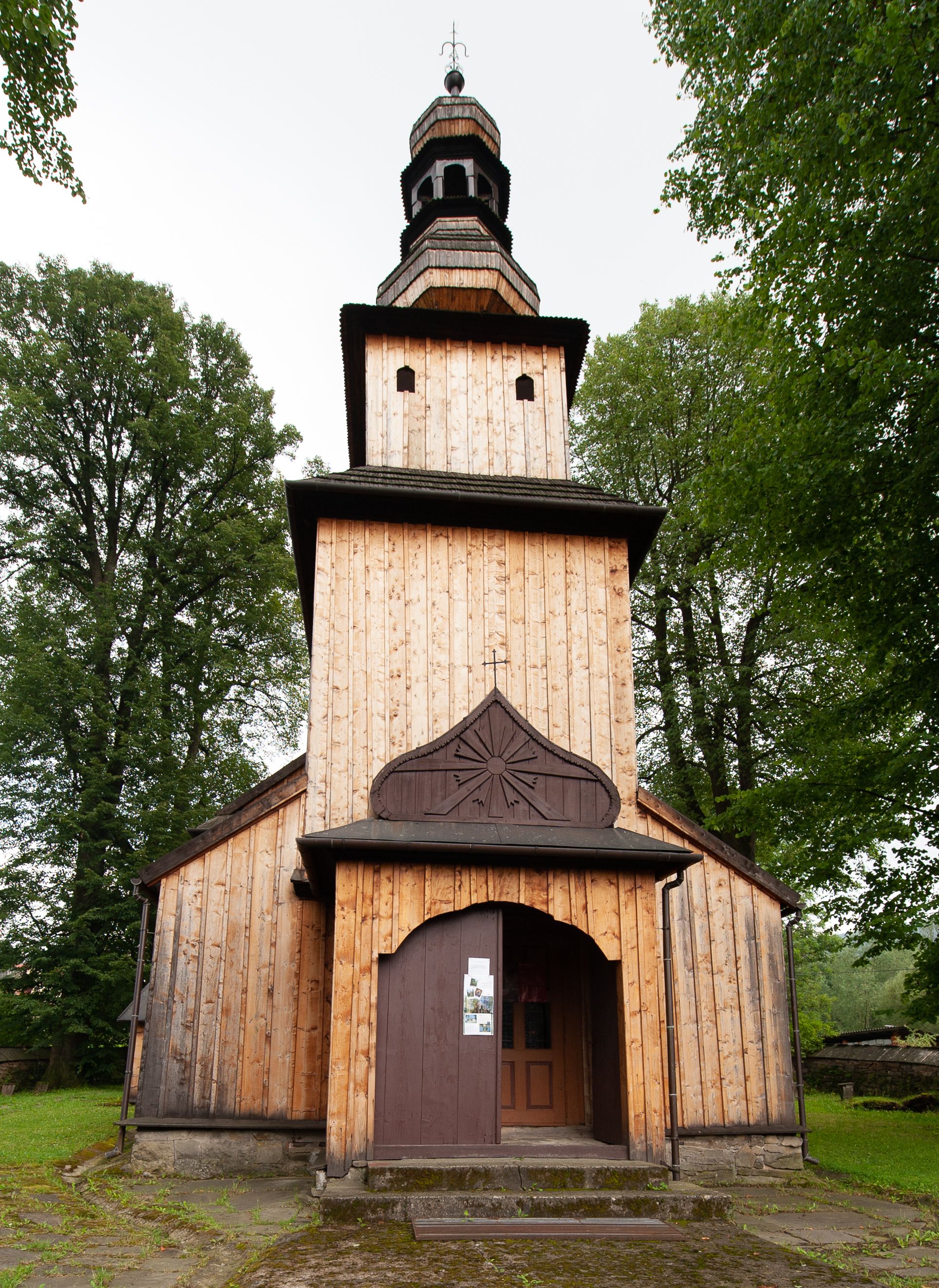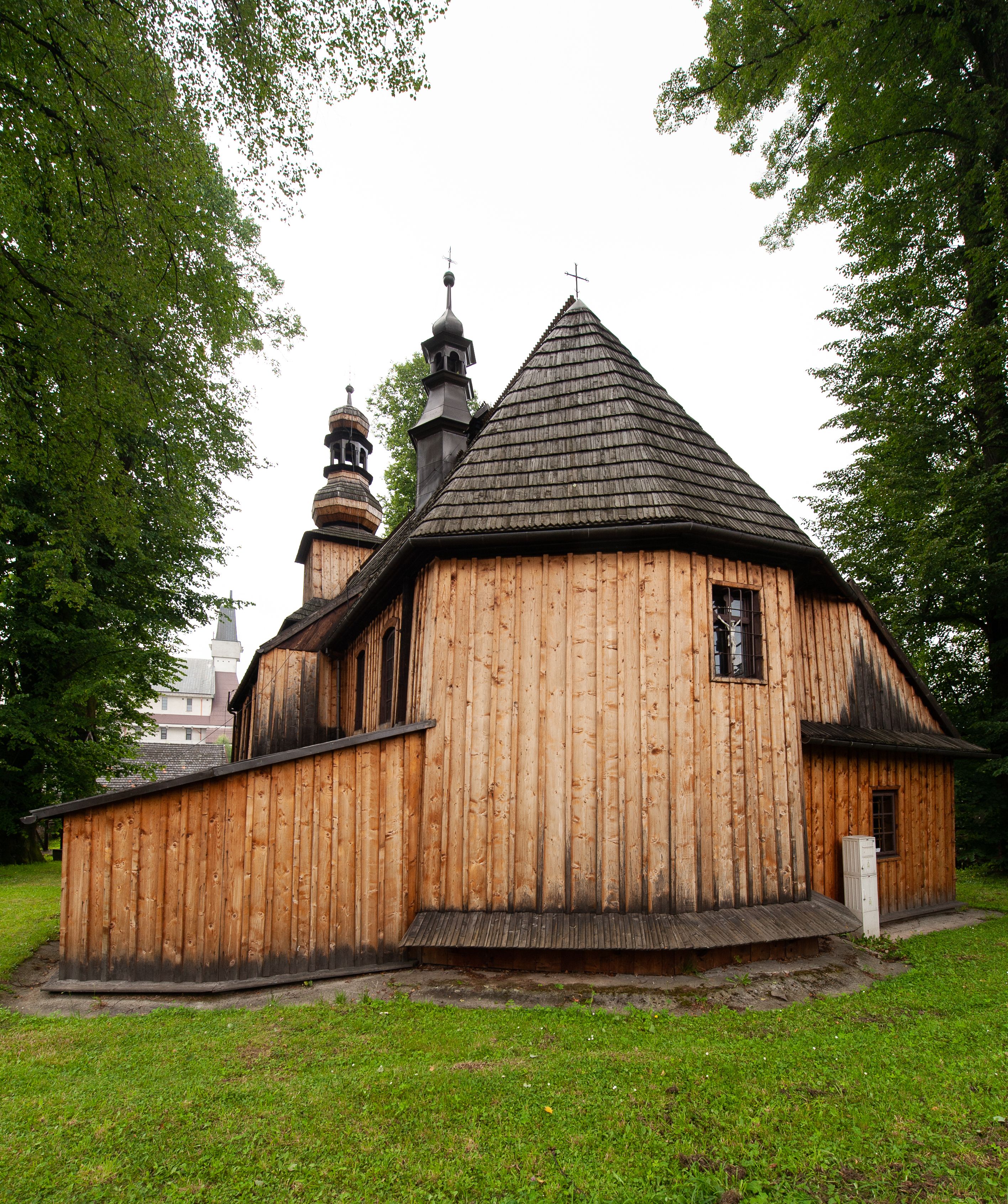 Kościół drewniany, konstrukcji zrębowej, z wieżą na słup, szalowany; orientowany, nawa prostokątna, z węższym, zamkniętym wielobocznie prezbiterium, przy którym zakrystia od północy, od południa kaplica. Przy nawie od zachodu wieża na rzucie kwadratu. Wewnątrz stropy, w nawie z zaskrzynieniami na słupach. Wzniesiony w 1678 roku przez małopolski warsztat ciesielski, odnowiony w 1760 roku.