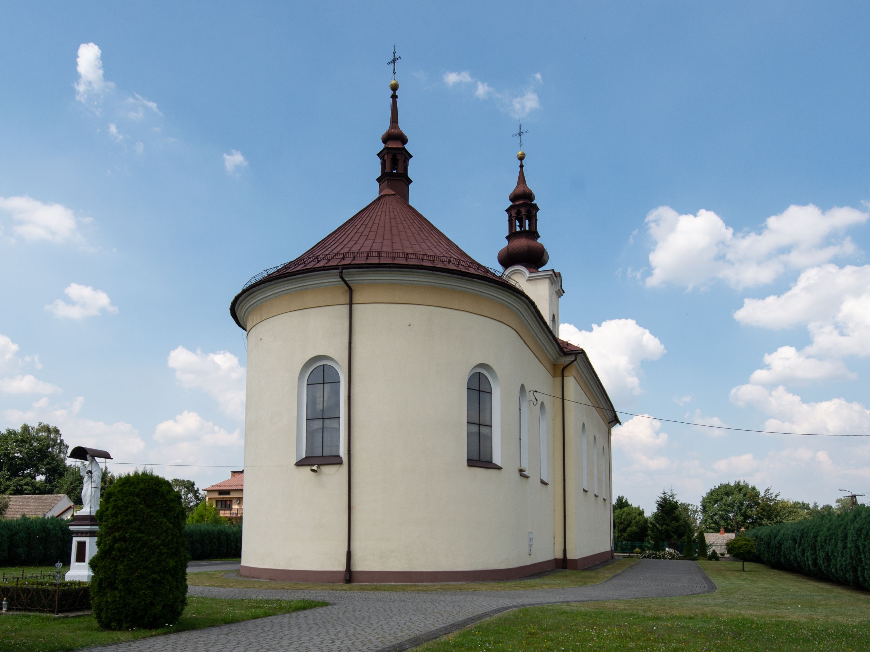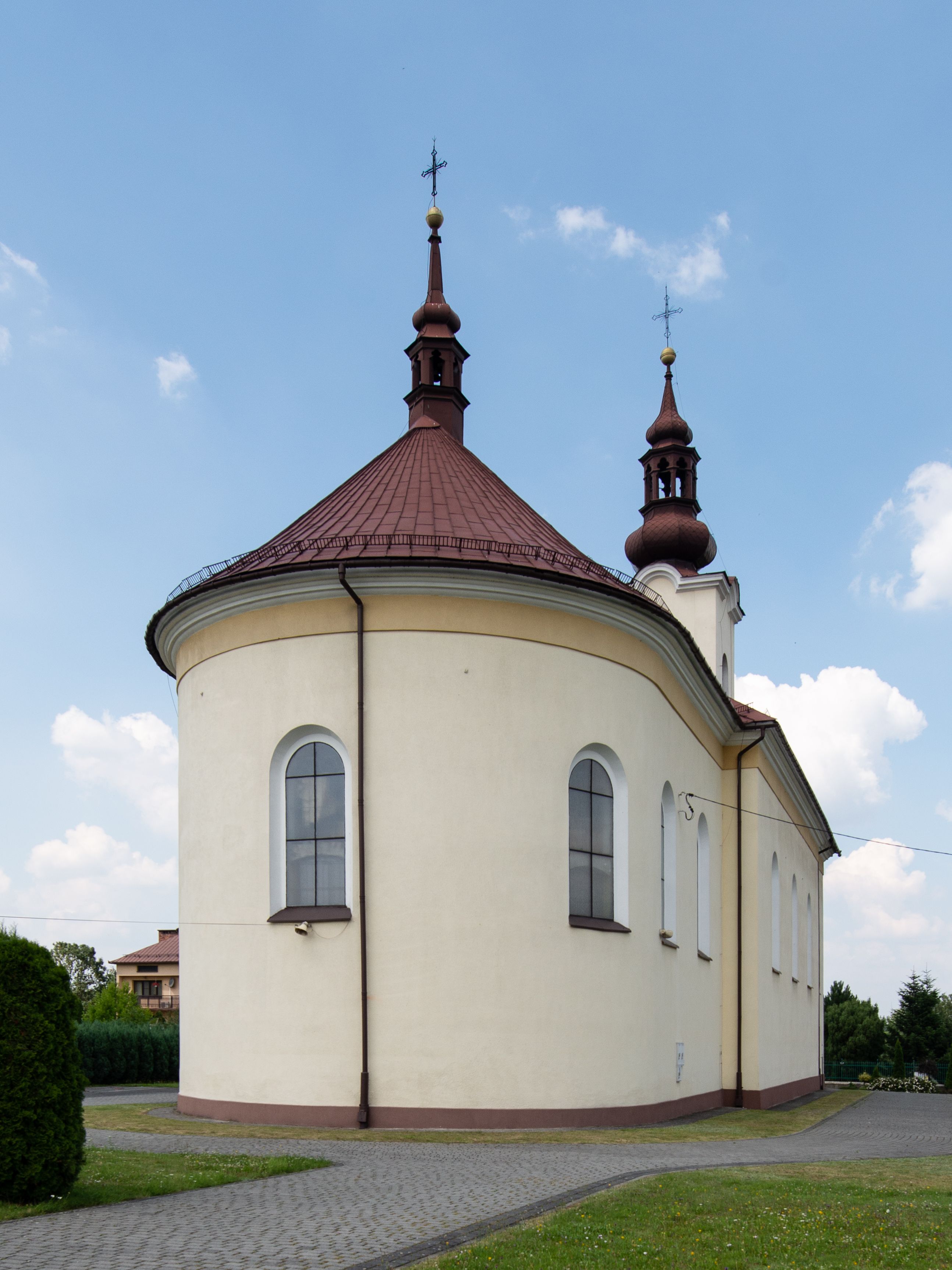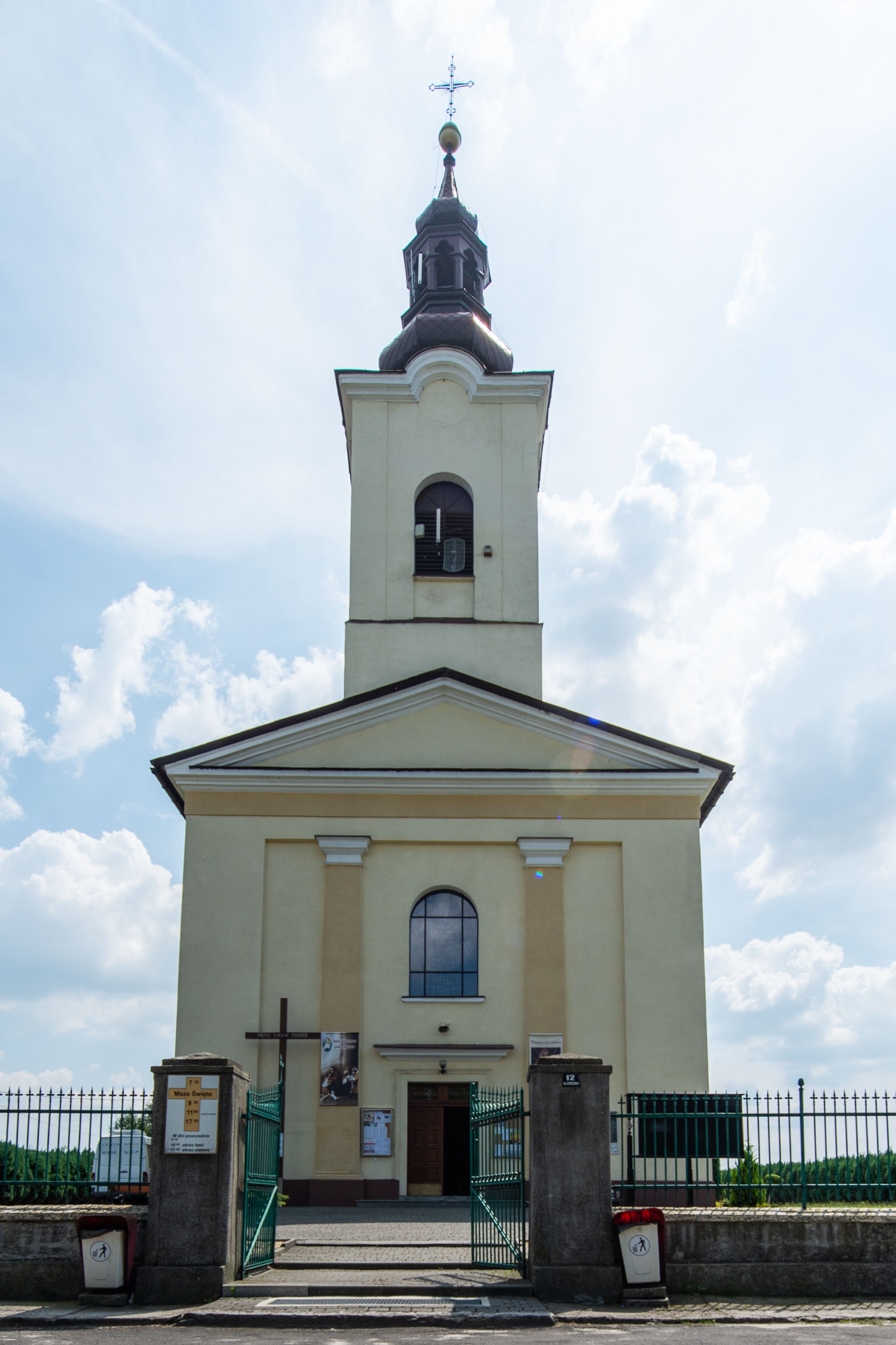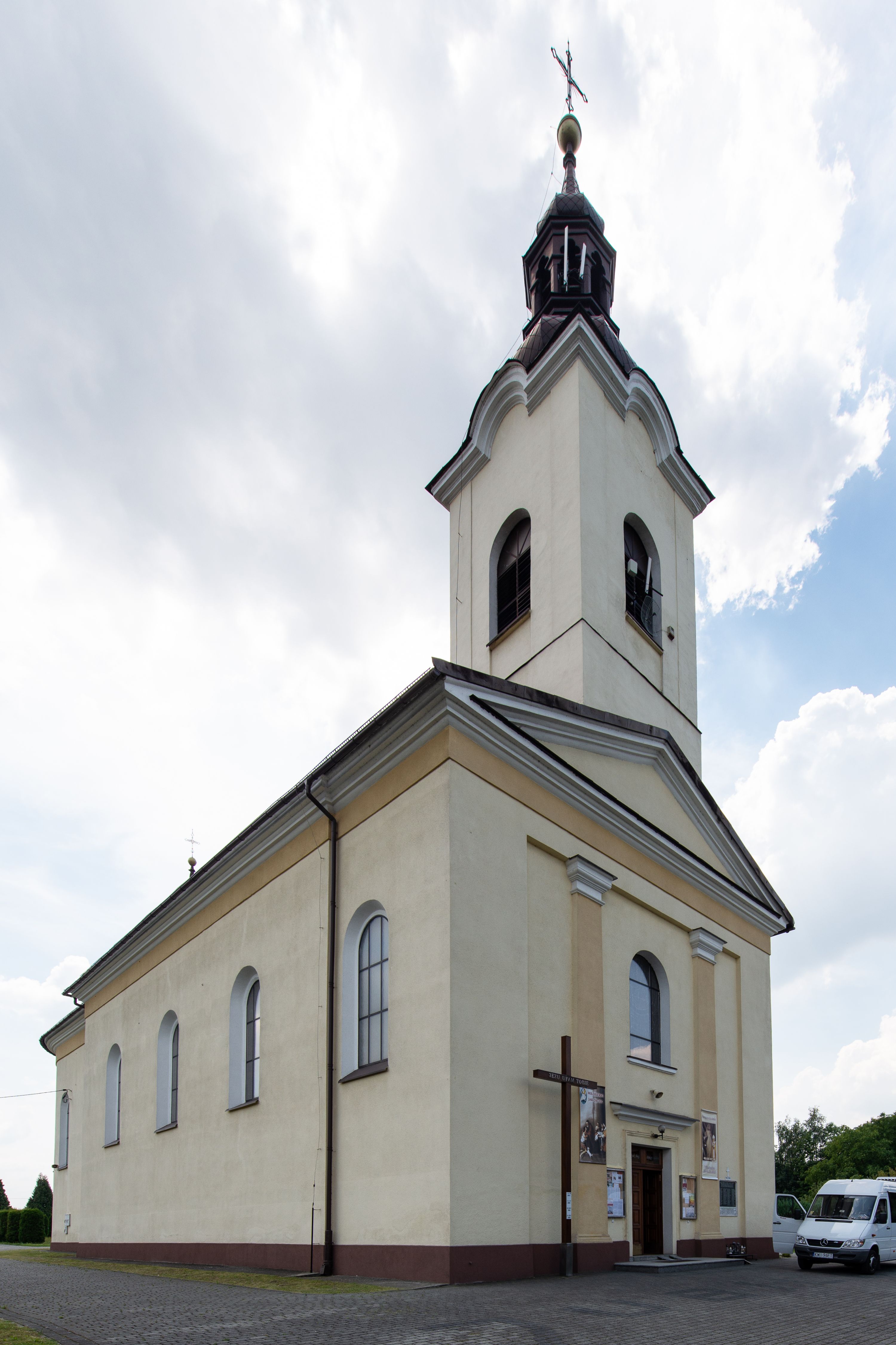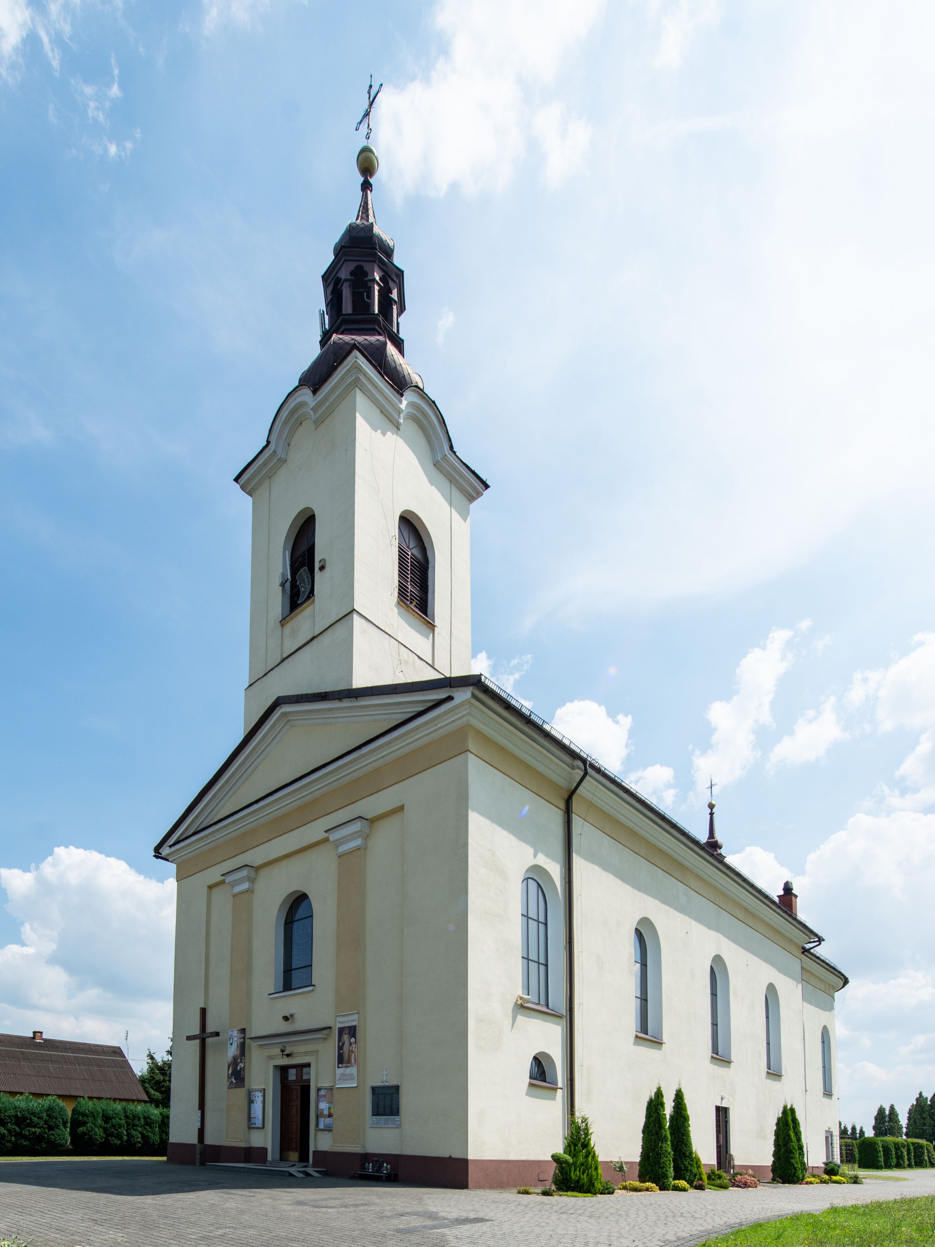 Kościół, zwrócony w kierunku południowo-wschodnim, jest budowlą murowaną z cegły na zaprawie wapiennej, na rzucie podłużnym. Powierzchnia budynku wynosi około 550 m2. Kościół charakteryzuje zwarta, prosta bryła. Korpus jest jednonawowy i trójprzęsłowy. Szerokie, dwuprzęsłowe, prezbiterium jest zamknięte półkoliście. Na osi kościoła, w przedłużeniu północnego przęsła przylega jednokondygnacyjna wieża, ujęta po bokach piętrowymi lokalnościami. Nawa przekryta jest sklepieniem kolebkowym z gurtami, wspartymi na osadzonych na wysokich cokołach parach przyściennych, czworobocznych filarów z przylegającymi do nich pilastrami o gładkich trzonach. Przestrzeń prezbiterium od korpusu nawowego oddziela półkoliście zamknięta arkada łuku tęczowego i drewniana balustrada. Zamknięte prostą ścianą prezbiterium zajmuje przestrzeń jednego przęsła. Dalej znajduje się zakrystia. Artykulację ścian na zewnątrz kościoła stanowi niewysoki obiegający bryłę cokół oraz niepełne belkowanie wieńczące, składające się z fryzu i gzymsu. Fasadę artykułuje płycina podzielona parą wspartych na cokołach pilastrów. W polu środkowym znajduje się główny otwór wejściowy. Dwuskrzydłowe, drewniane drzwi z naświetlem ujęte są prostym, profilowanym portalem. Tuż nad nadprożem znajduje się krótki gzyms. Wyżej duże, prostokątne, zamknięte półkoliście okno. Fasadę wieńczy trójkątny przyczółek. Ściany korpusu nawowego i prezbiterium przeprute są prostokątnymi, zamkniętymi półkoliście oknami. Dodatkowo w ścianie zachodniej, na wysokości przyległości wieży, w dolnej partii muru znajduje się niewielkie, półkoliście zamknięte okno a w drugim przęśle nawy prostokątny otwór drzwiowy; podobny jest umiejscowiony w drugim przęśle prezbiterium po stronie zachodniej. Kondygnację czworobocznej wieży w dolnej partii obiega parapet, wyżej w każdej ze ścian znajduje się po jednym prostokątnym, zamkniętym półkoliście oknie. Górną partię wieży obiega gzyms wieńczący wyłamujący się półkoliście pośrodku każdej ze ścian. Wieża nakryta jest hełmem cebulastym z latarnią. Korpus nawowy i prezbiterium przekrywa dwuspadowy dach wykonany z blachy, z wieżyczką na sygnaturkę na zakończeniu prezbiterium. Kolorystyka tynków kościoła utrzymana jest w odcieniach żółci i bieli, cokół jest brązowy. Okna nawy, prezbiterium i fasady wypełniają witraże, wnętrze pokrywa polichromia z przedstawieniami figuralnymi w partii sklepień. Plac przykościelny, z wybrukowanymi alejkami i trawnikiem, otoczony jest żywopłotem z krzewów ozdobnych.