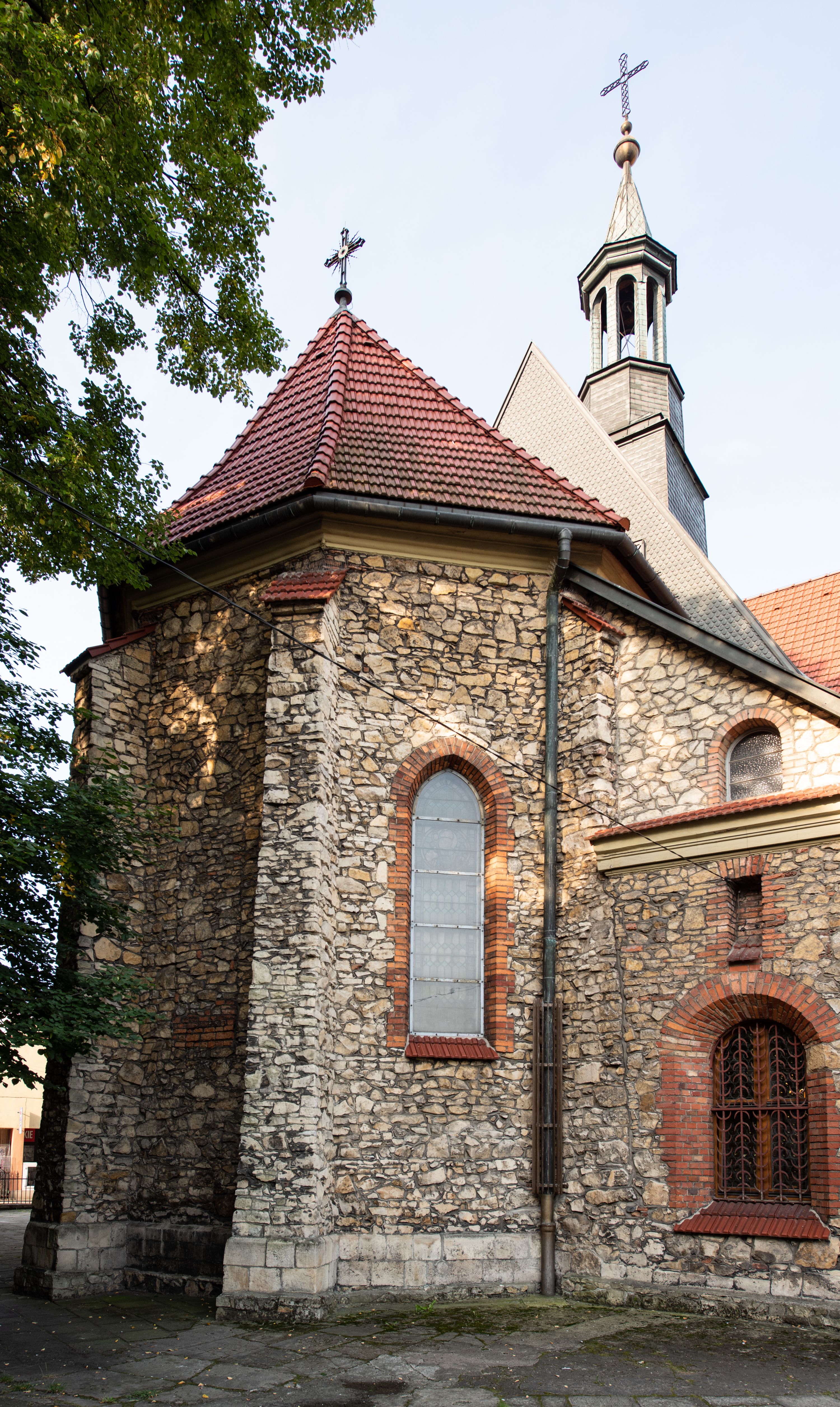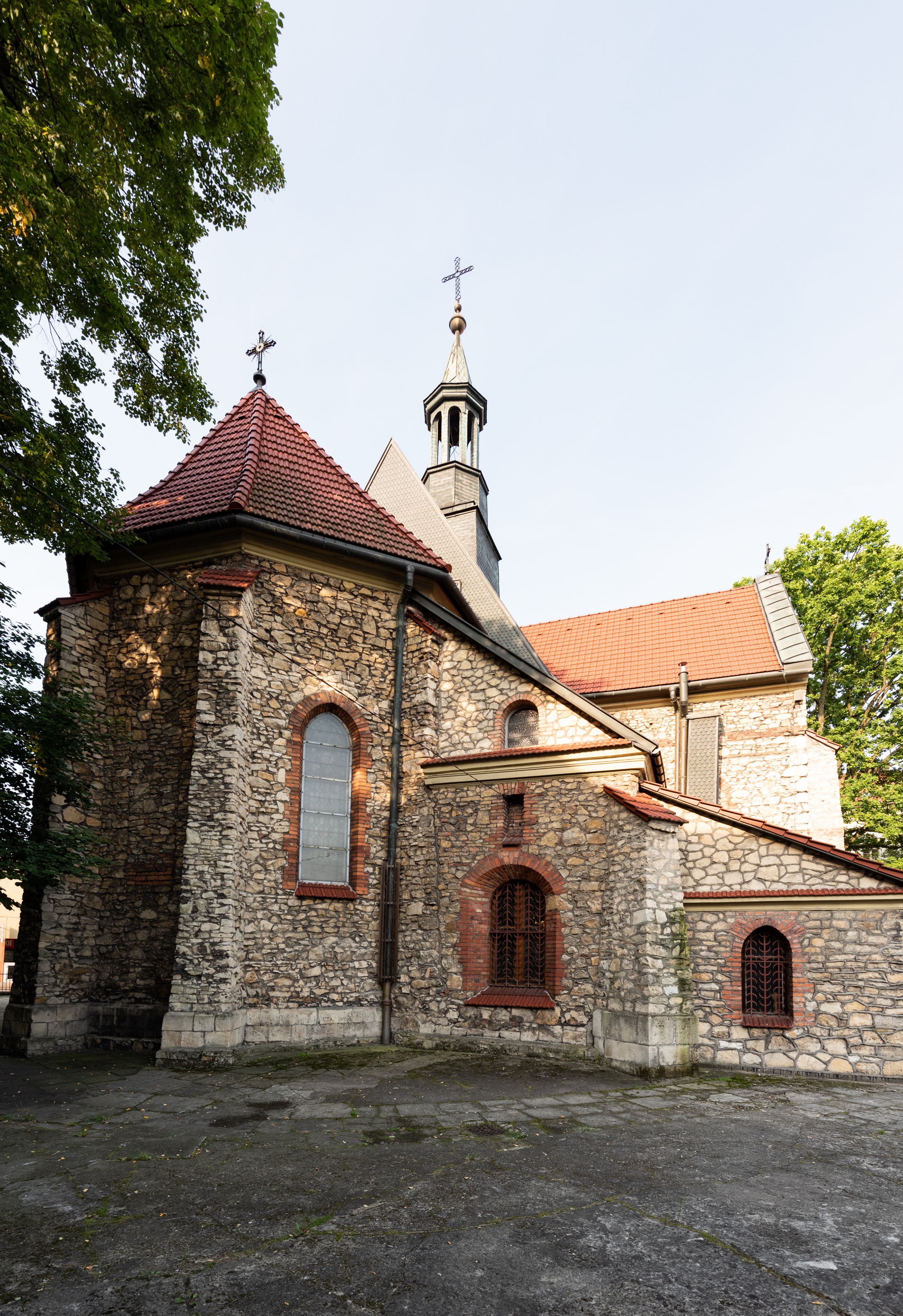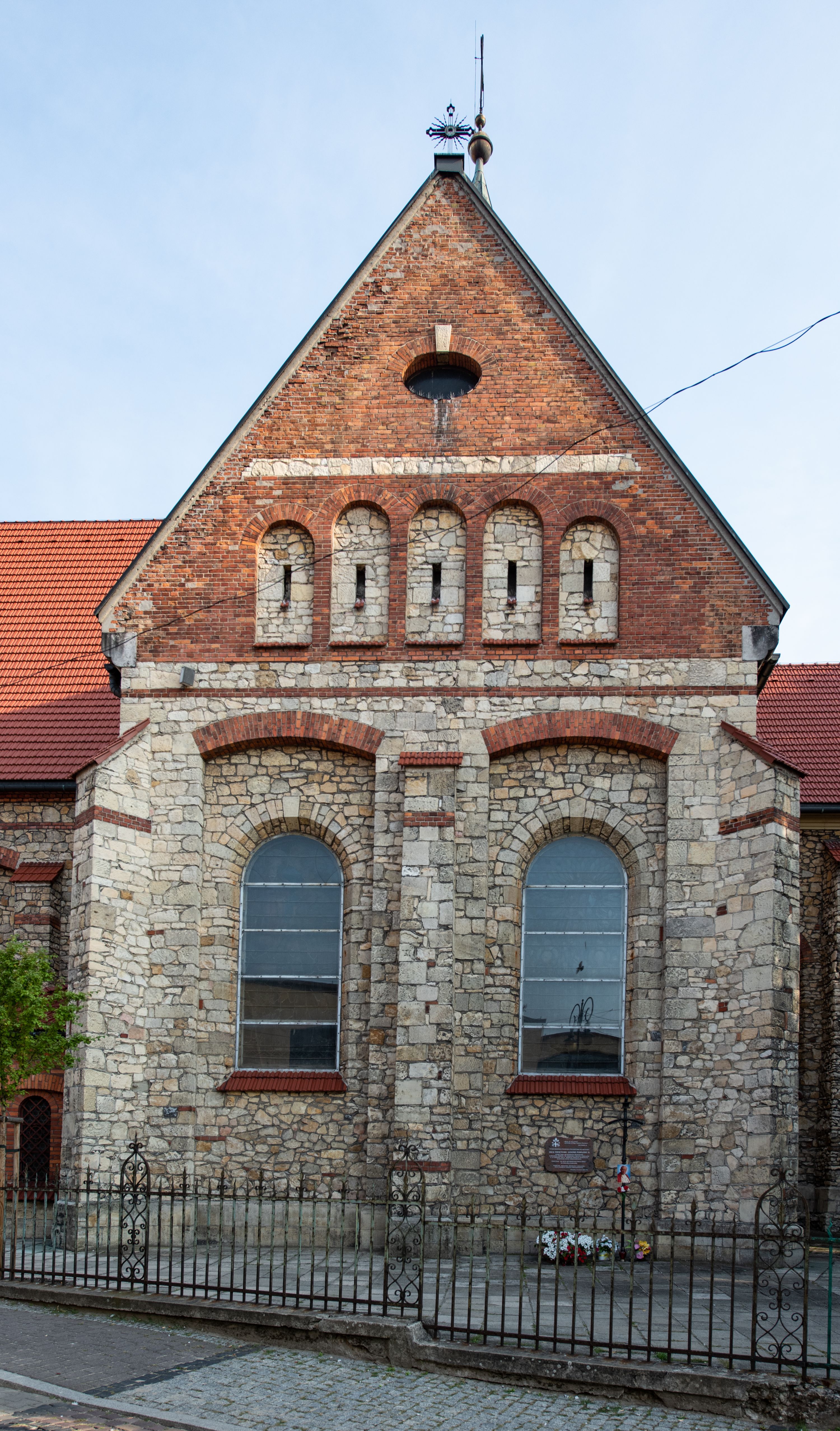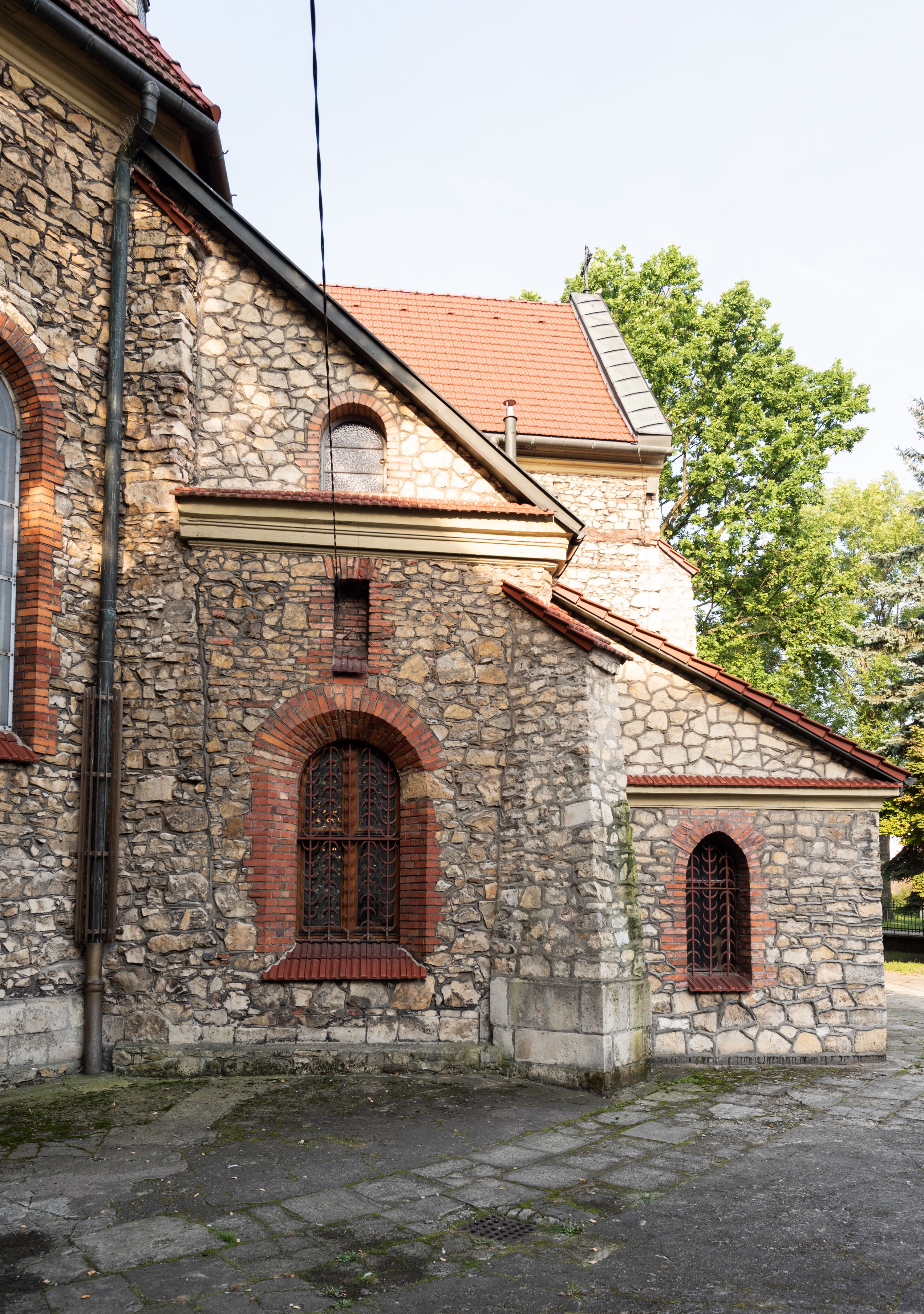 Kościół murowany, orientowany, jednonawowy, trójprzęsłowy, z transeptem i jednoprzęsłowym, węższym i niższym prezbiterium zamkniętym trójbocznie. Między nawą a transeptem po obu stronach znajdują się kruchty, do prezbiterium od strony północnej dostawiona kruchta złożona z dwóch lokalności. Ściany są rozczłonkowane filarami, tworzącymi płytkie arkadowe wnęki. Między nawą a prezbiterium arkada tęczowa. Sklepienie krzyżowe na gurtach spływających na filary. Prezbiterium oświetlają wąskie, prostokątne okna zamknięte ostrołukowo, w nawie i w transepcie znajdują się prostokątne okna prostokątne zamknięte półkoliście, w ścianie frontowej w dolnej części okna prostokątne zamknięte półkoliście, a w górnej podwójne okna prostokątne. Fasada ujęta dwiema narożnymi szkarpami, zwieńczona trójkątnie. Do niej dostawiona kruchta z dwuspadowym daszkiem i wejściem w kształcie prostokąta zamkniętego półkoliście. W kamiennej fasadzie znajdują się dołem okna prostokątne, zamknięte półkoliście, a górą prostokątne, biforialne okna z nadprożem łukowatym wykonanym z cegły. Szczyt ceglany, podzielony na trzy strefy kamiennym wątkiem, z pięcioma wnękami prostokątnymi, zamkniętymi półkoliście, z wąskimi otworami w dolnej strefie i z owalnym oknem w drugiej. Elewacje boczne nawy ujęte skarpami. Dachy dwuspadowe, kryte dachówką, z wieżyczką na sygnaturkę.