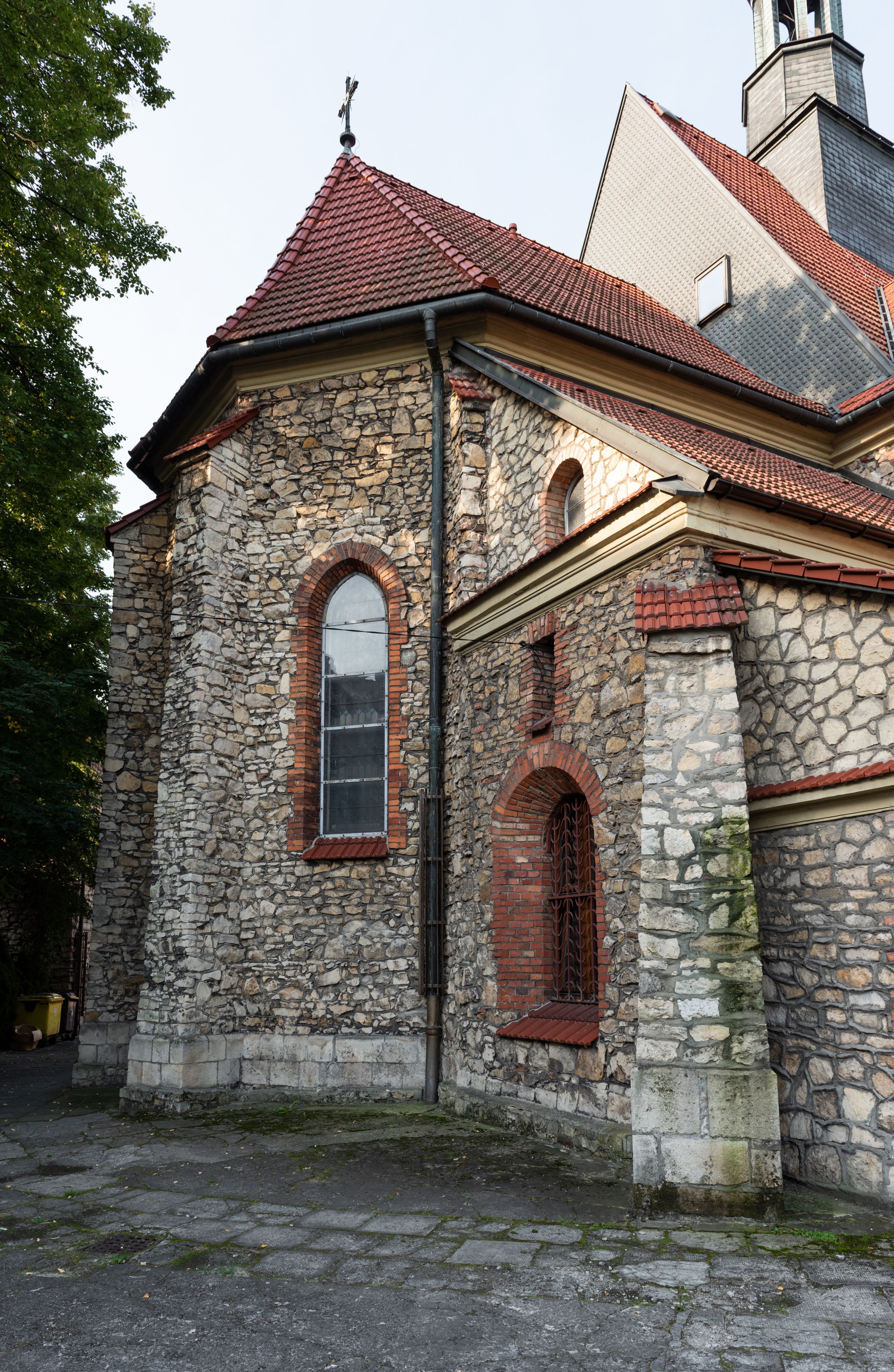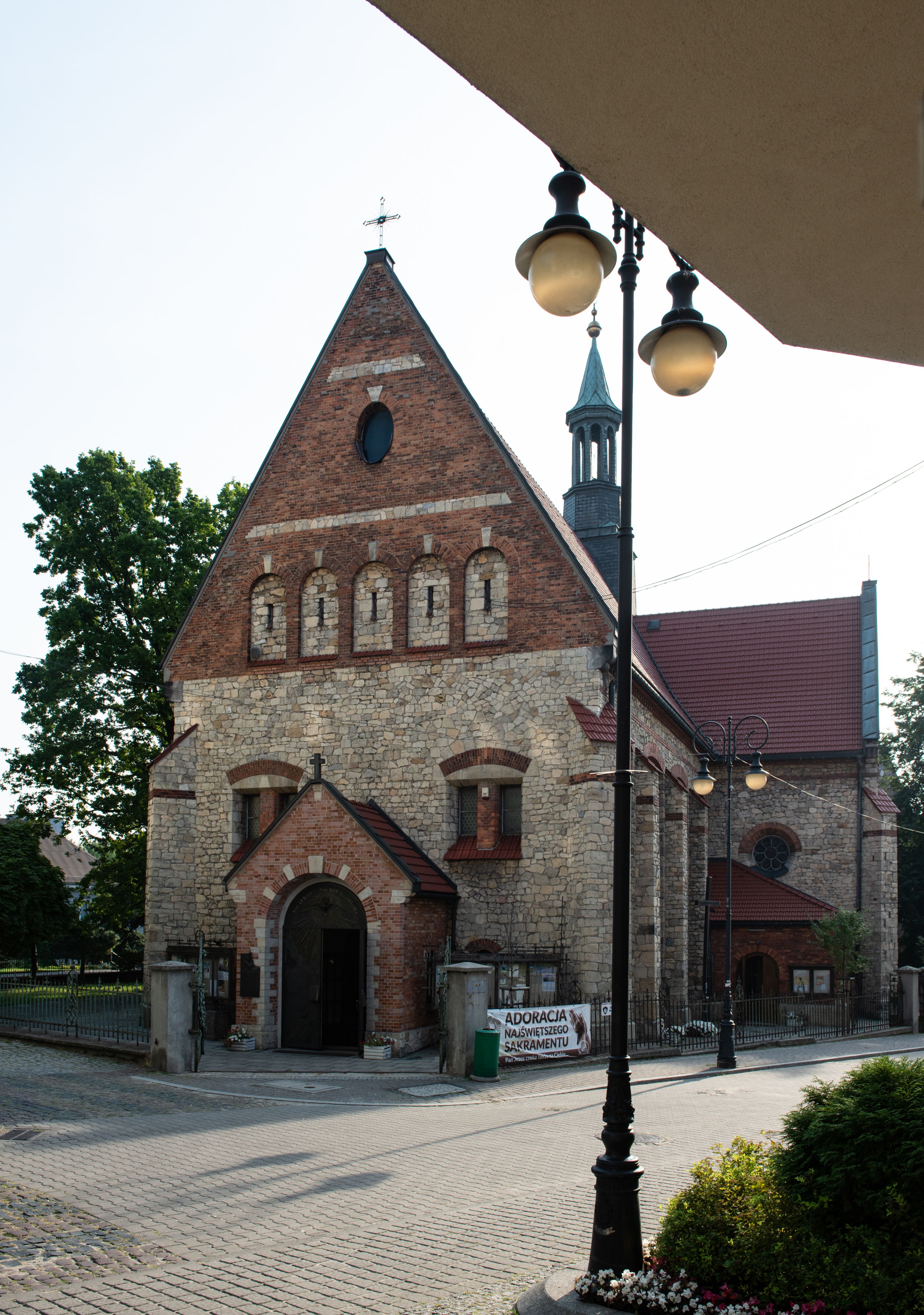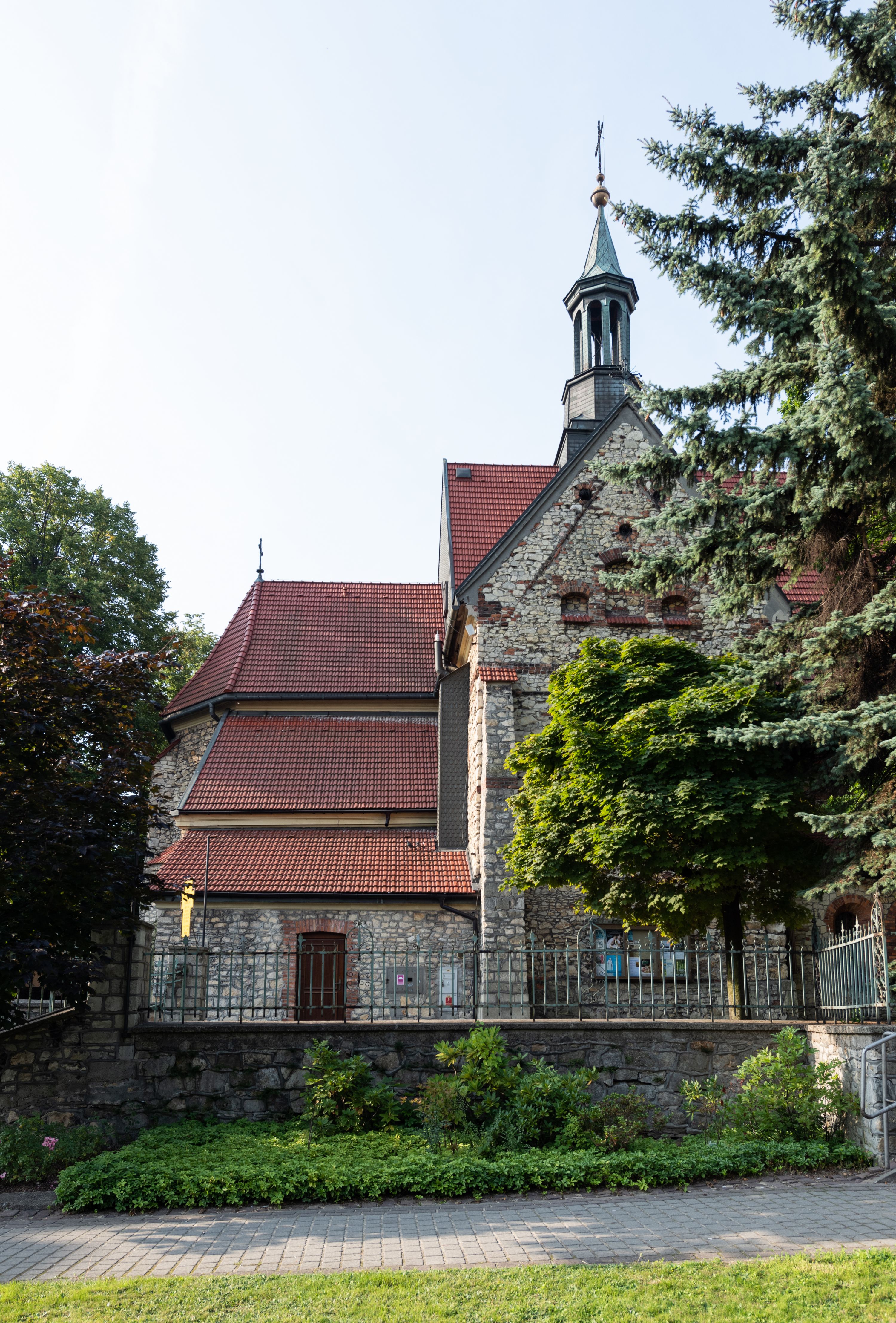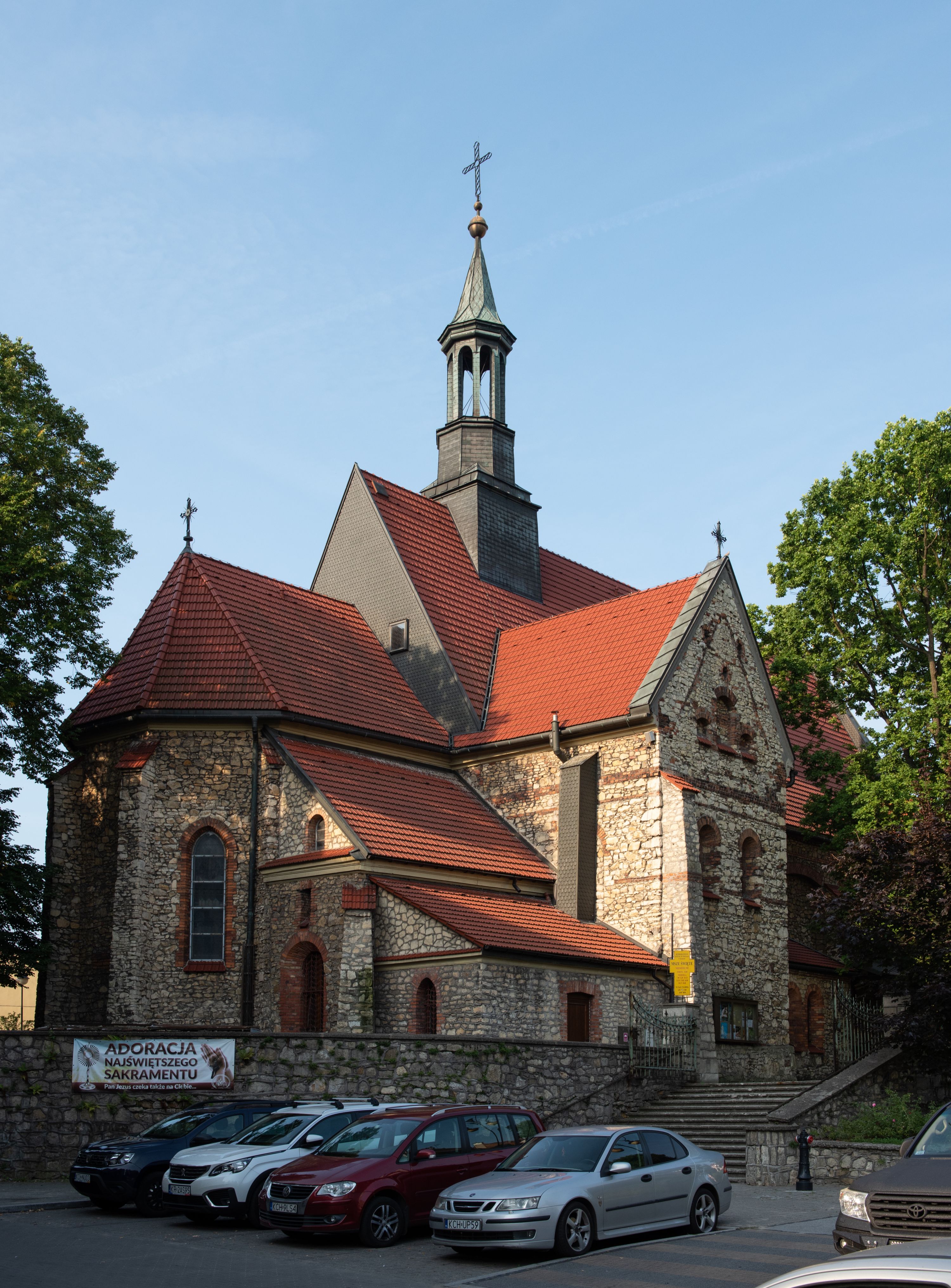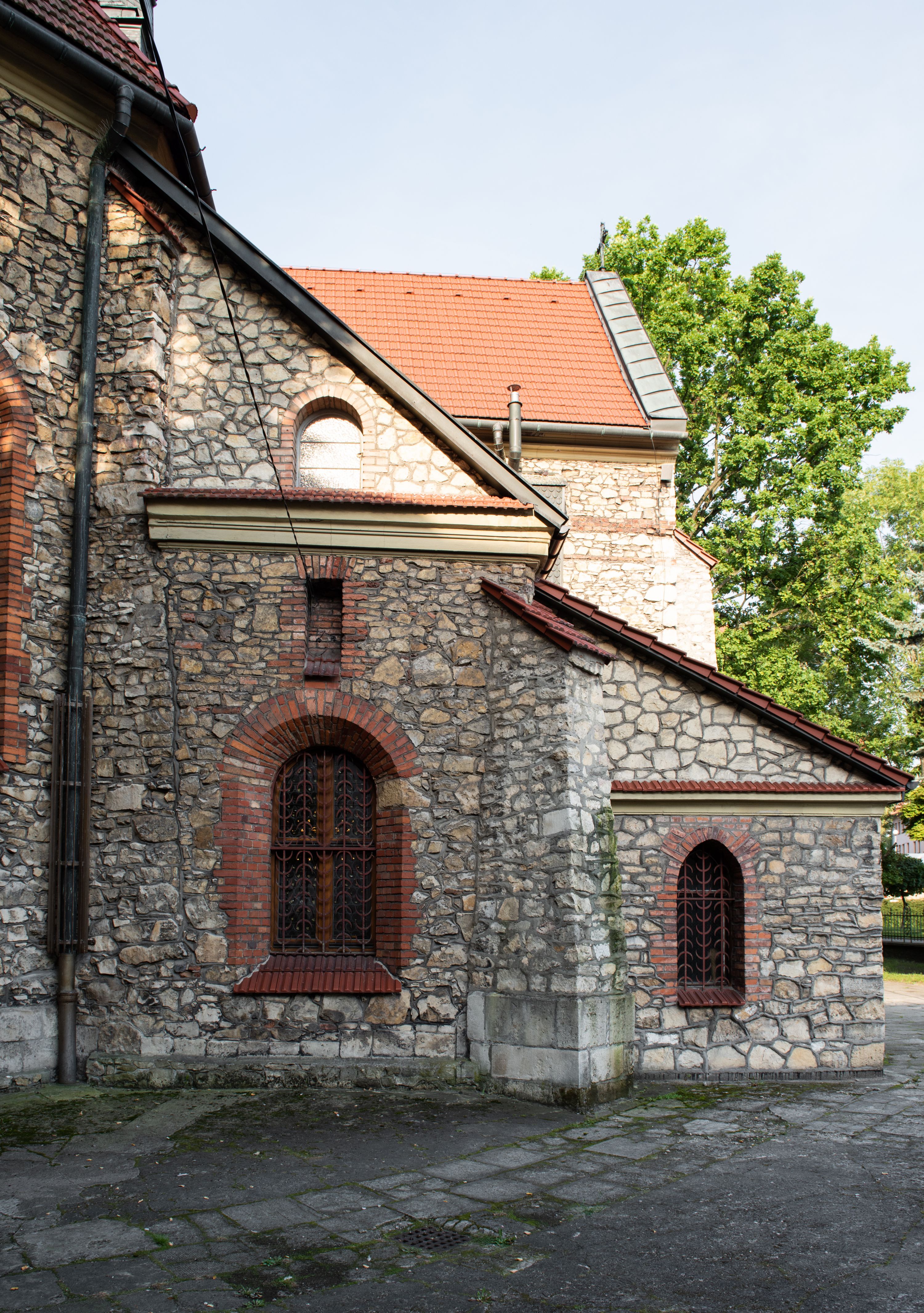 Kościół murowany, orientowany, jednonawowy, trójprzęsłowy, z transeptem i jednoprzęsłowym, węższym i niższym prezbiterium zamkniętym trójbocznie. Między nawą a transeptem po obu stronach znajdują się kruchty, do prezbiterium od strony północnej dostawiona kruchta złożona z dwóch lokalności. Ściany są rozczłonkowane filarami, tworzącymi płytkie arkadowe wnęki. Między nawą a prezbiterium arkada tęczowa. Sklepienie krzyżowe na gurtach spływających na filary. Prezbiterium oświetlają wąskie, prostokątne okna zamknięte ostrołukowo, w nawie i w transepcie znajdują się prostokątne okna prostokątne zamknięte półkoliście, w ścianie frontowej w dolnej części okna prostokątne zamknięte półkoliście, a w górnej podwójne okna prostokątne. Fasada ujęta dwiema narożnymi szkarpami, zwieńczona trójkątnie. Do niej dostawiona kruchta z dwuspadowym daszkiem i wejściem w kształcie prostokąta zamkniętego półkoliście. W kamiennej fasadzie znajdują się dołem okna prostokątne, zamknięte półkoliście, a górą prostokątne, biforialne okna z nadprożem łukowatym wykonanym z cegły. Szczyt ceglany, podzielony na trzy strefy kamiennym wątkiem, z pięcioma wnękami prostokątnymi, zamkniętymi półkoliście, z wąskimi otworami w dolnej strefie i z owalnym oknem w drugiej. Elewacje boczne nawy ujęte skarpami. Dachy dwuspadowe, kryte dachówką, z wieżyczką na sygnaturkę.