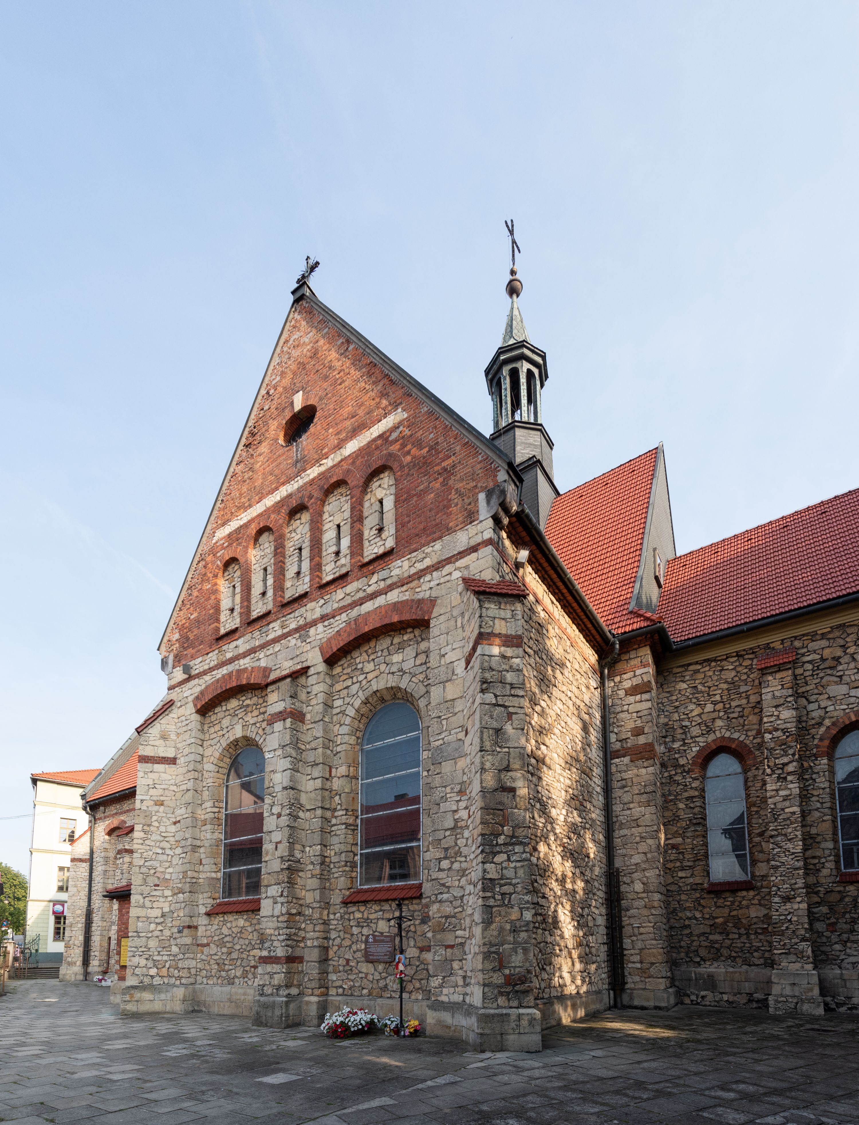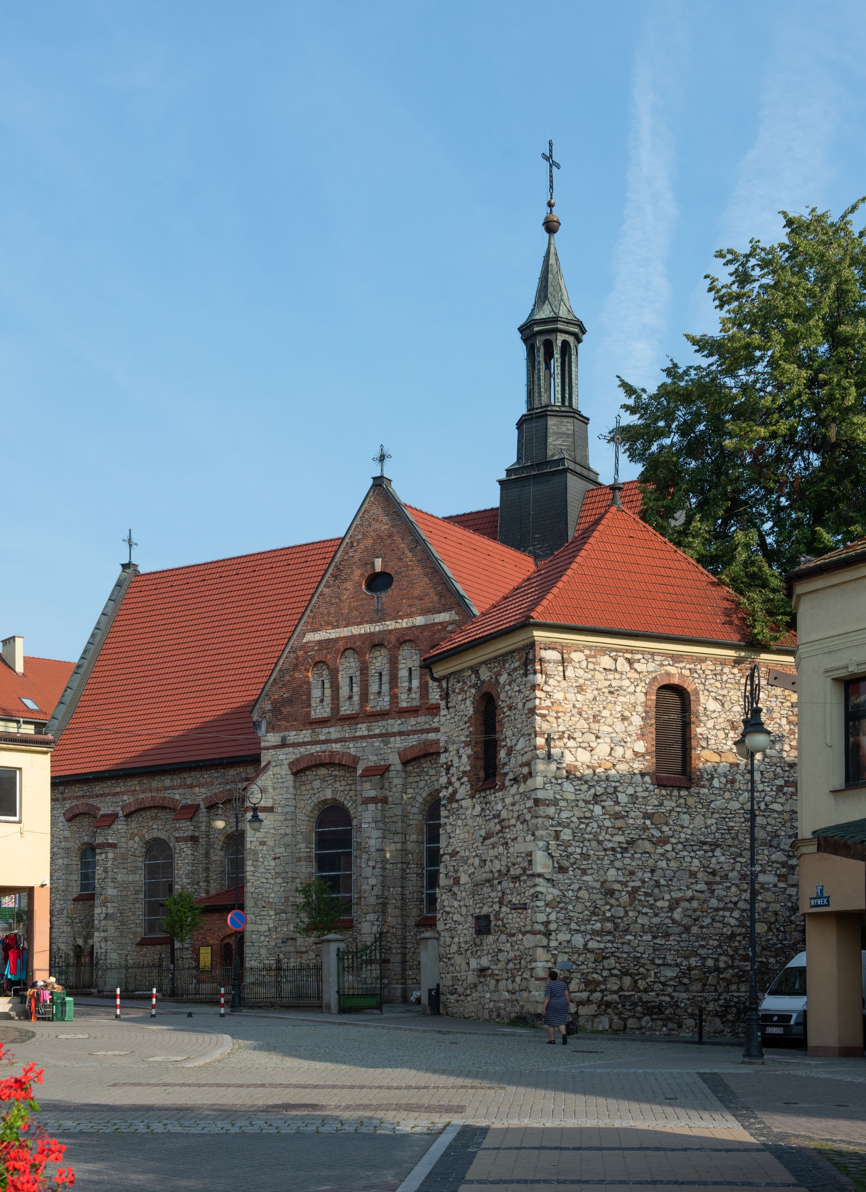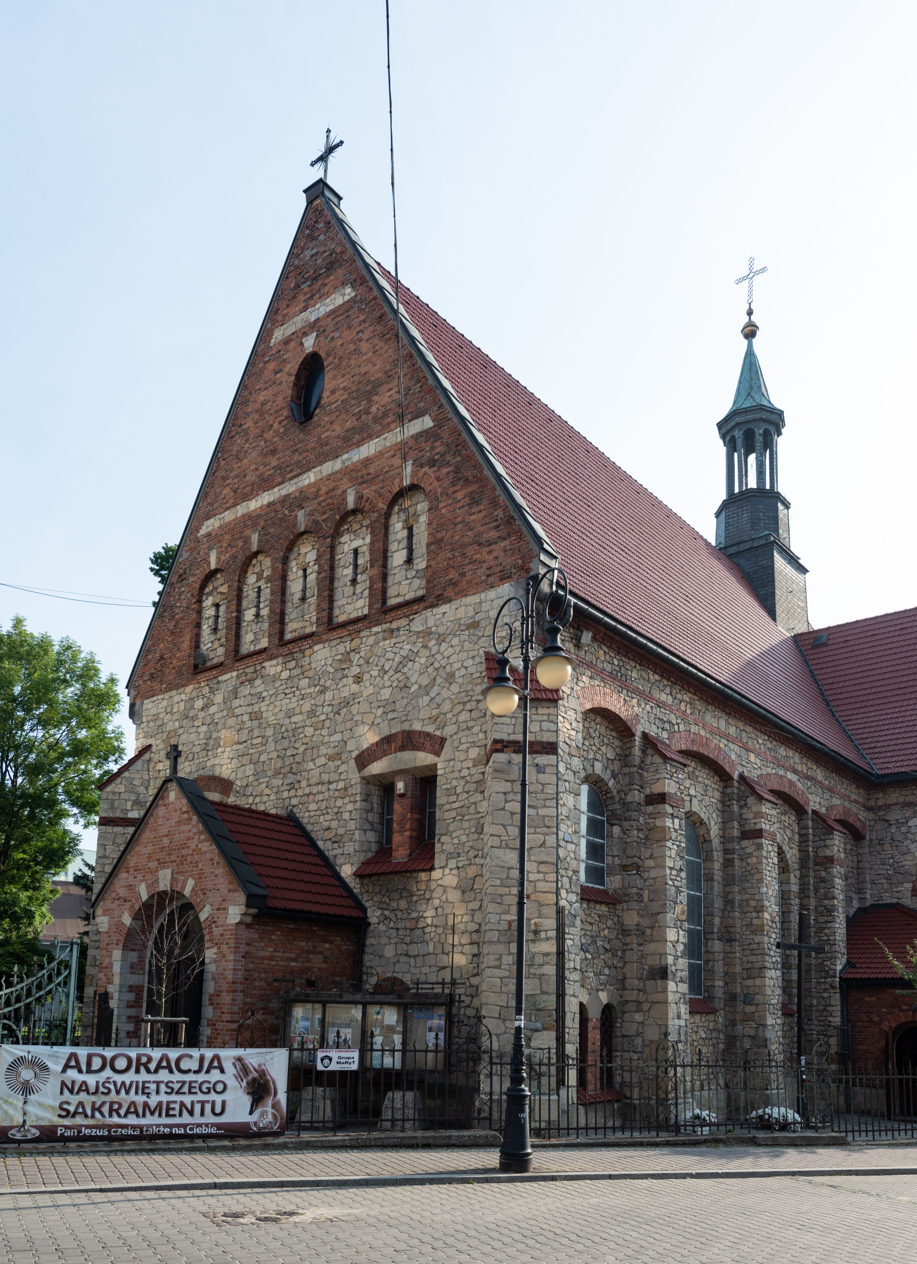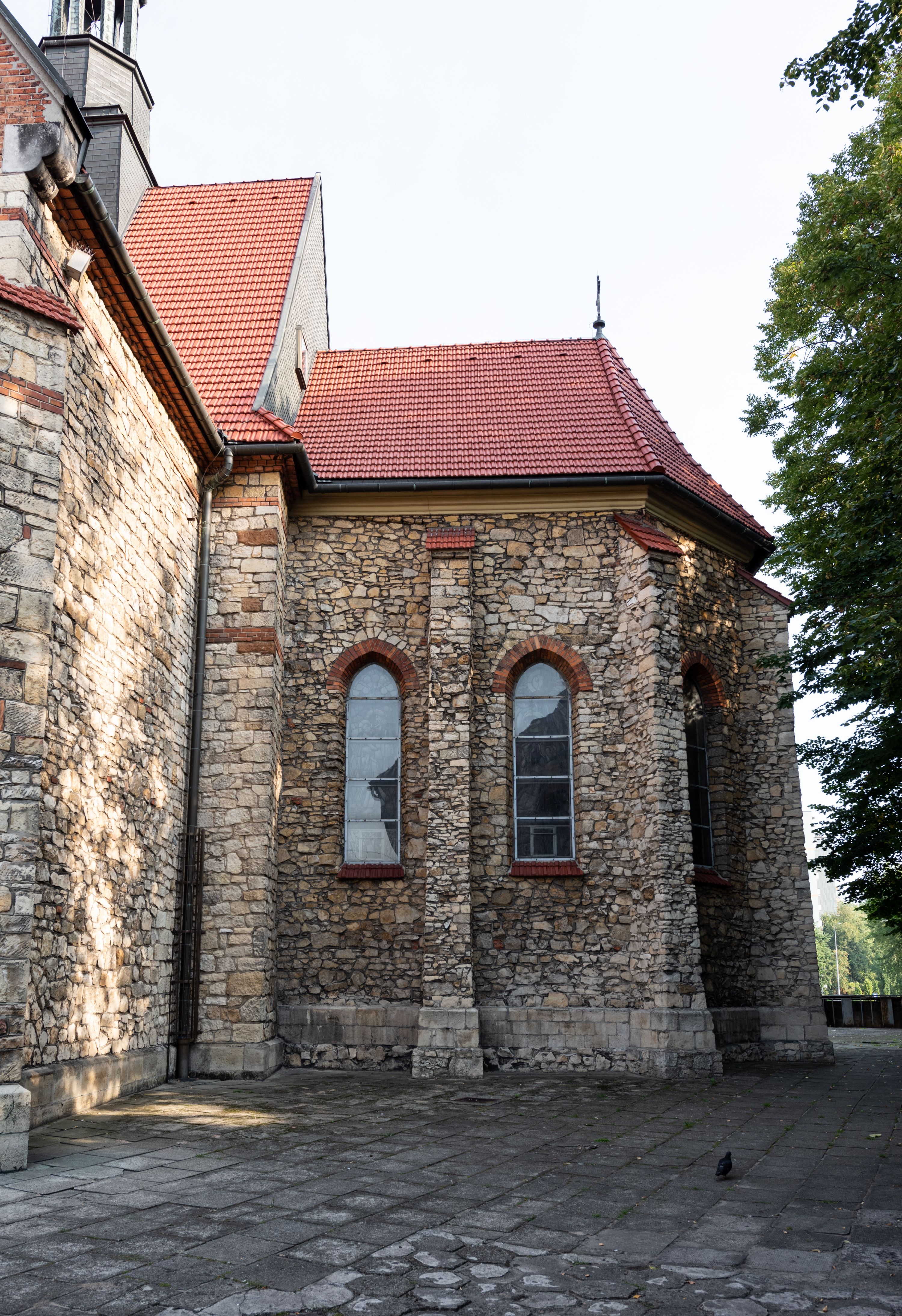 Kościół murowany, orientowany, jednonawowy, trójprzęsłowy, z transeptem i jednoprzęsłowym, węższym i niższym prezbiterium zamkniętym trójbocznie. Między nawą a transeptem po obu stronach znajdują się kruchty, do prezbiterium od strony północnej dostawiona kruchta złożona z dwóch lokalności. Ściany są rozczłonkowane filarami, tworzącymi płytkie arkadowe wnęki. Między nawą a prezbiterium arkada tęczowa. Sklepienie krzyżowe na gurtach spływających na filary. Prezbiterium oświetlają wąskie, prostokątne okna zamknięte ostrołukowo, w nawie i w transepcie znajdują się prostokątne okna prostokątne zamknięte półkoliście, w ścianie frontowej w dolnej części okna prostokątne zamknięte półkoliście, a w górnej podwójne okna prostokątne. Fasada ujęta dwiema narożnymi szkarpami, zwieńczona trójkątnie. Do niej dostawiona kruchta z dwuspadowym daszkiem i wejściem w kształcie prostokąta zamkniętego półkoliście. W kamiennej fasadzie znajdują się dołem okna prostokątne, zamknięte półkoliście, a górą prostokątne, biforialne okna z nadprożem łukowatym wykonanym z cegły. Szczyt ceglany, podzielony na trzy strefy kamiennym wątkiem, z pięcioma wnękami prostokątnymi, zamkniętymi półkoliście, z wąskimi otworami w dolnej strefie i z owalnym oknem w drugiej. Elewacje boczne nawy ujęte skarpami. Dachy dwuspadowe, kryte dachówką, z wieżyczką na sygnaturkę.