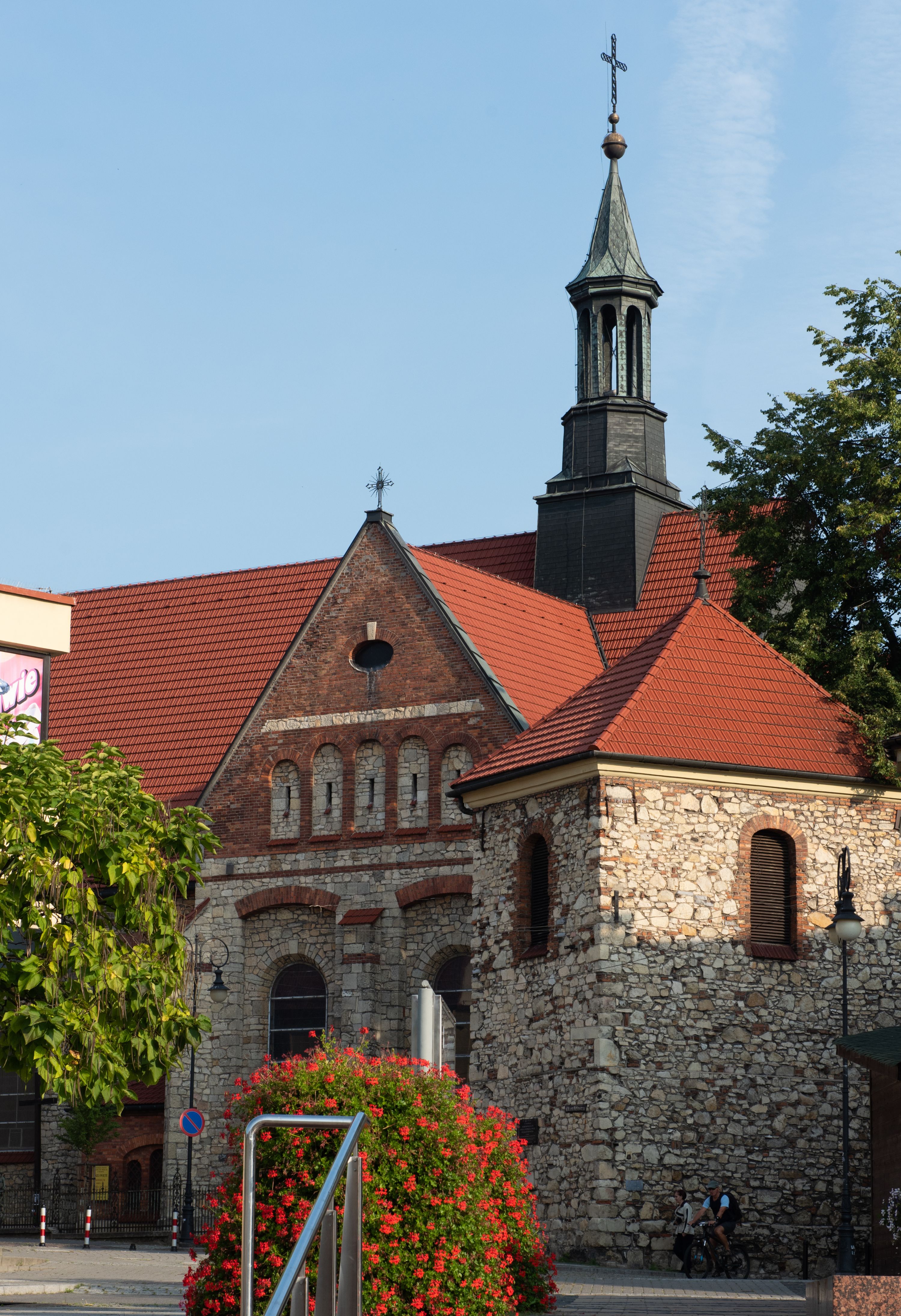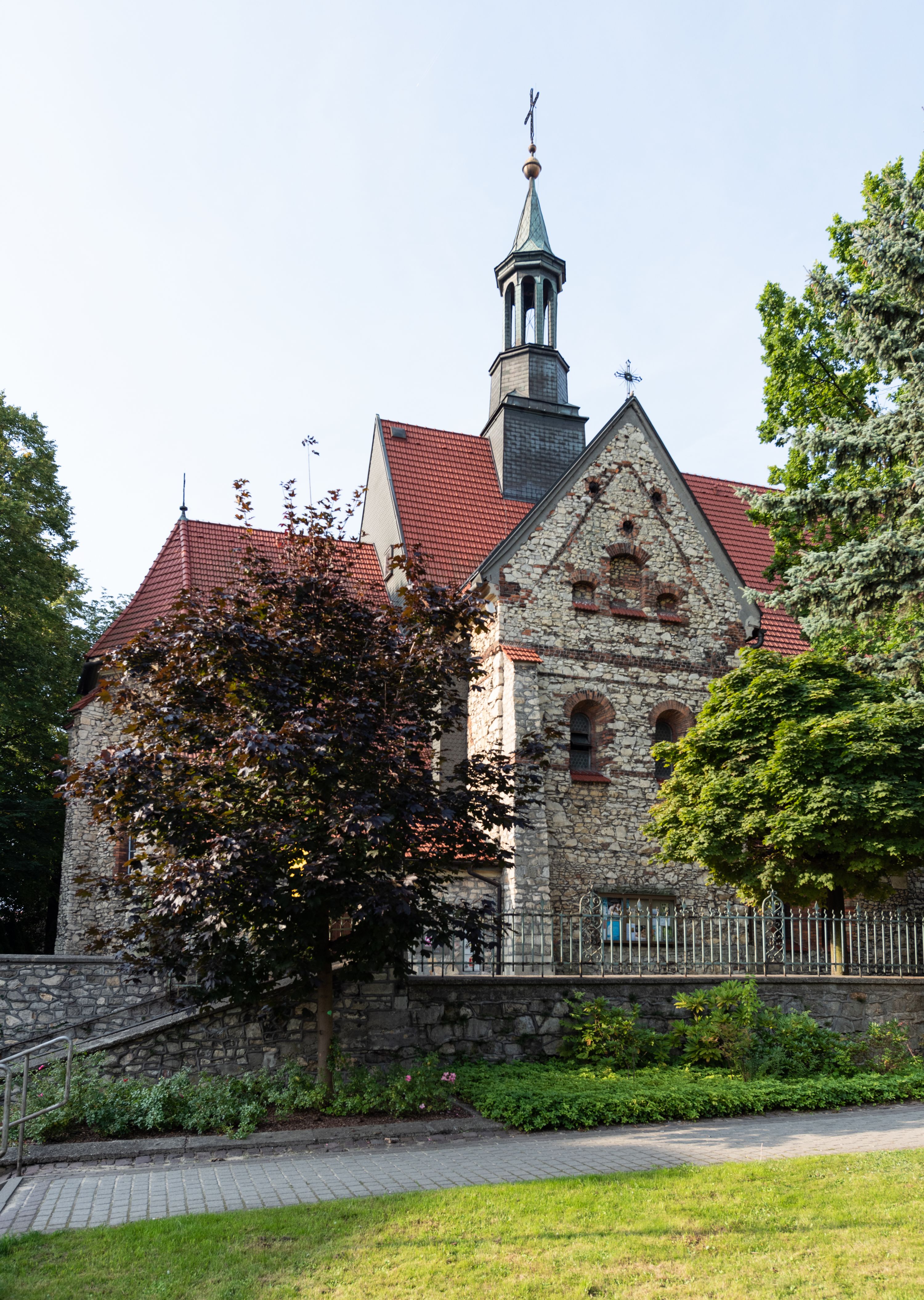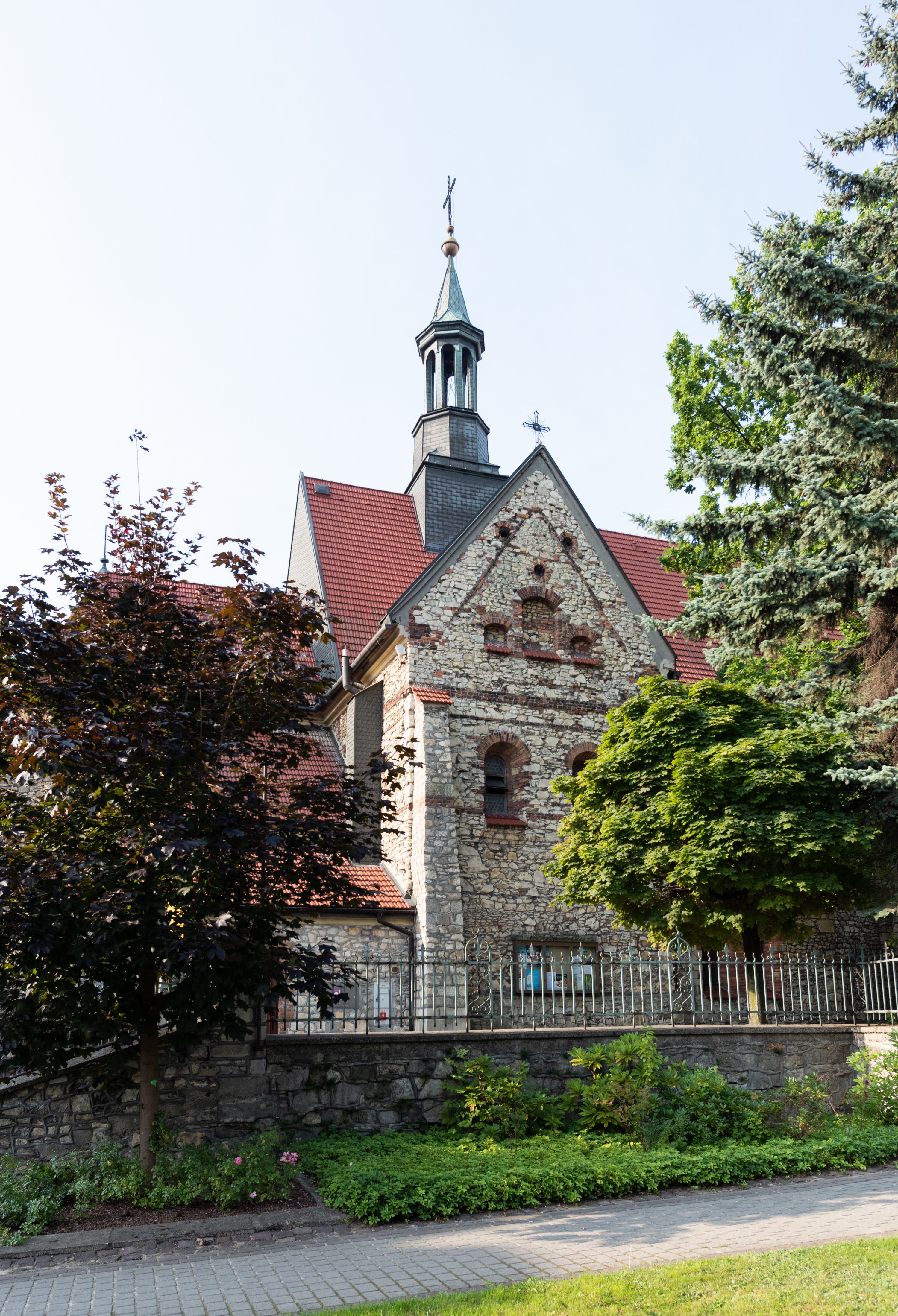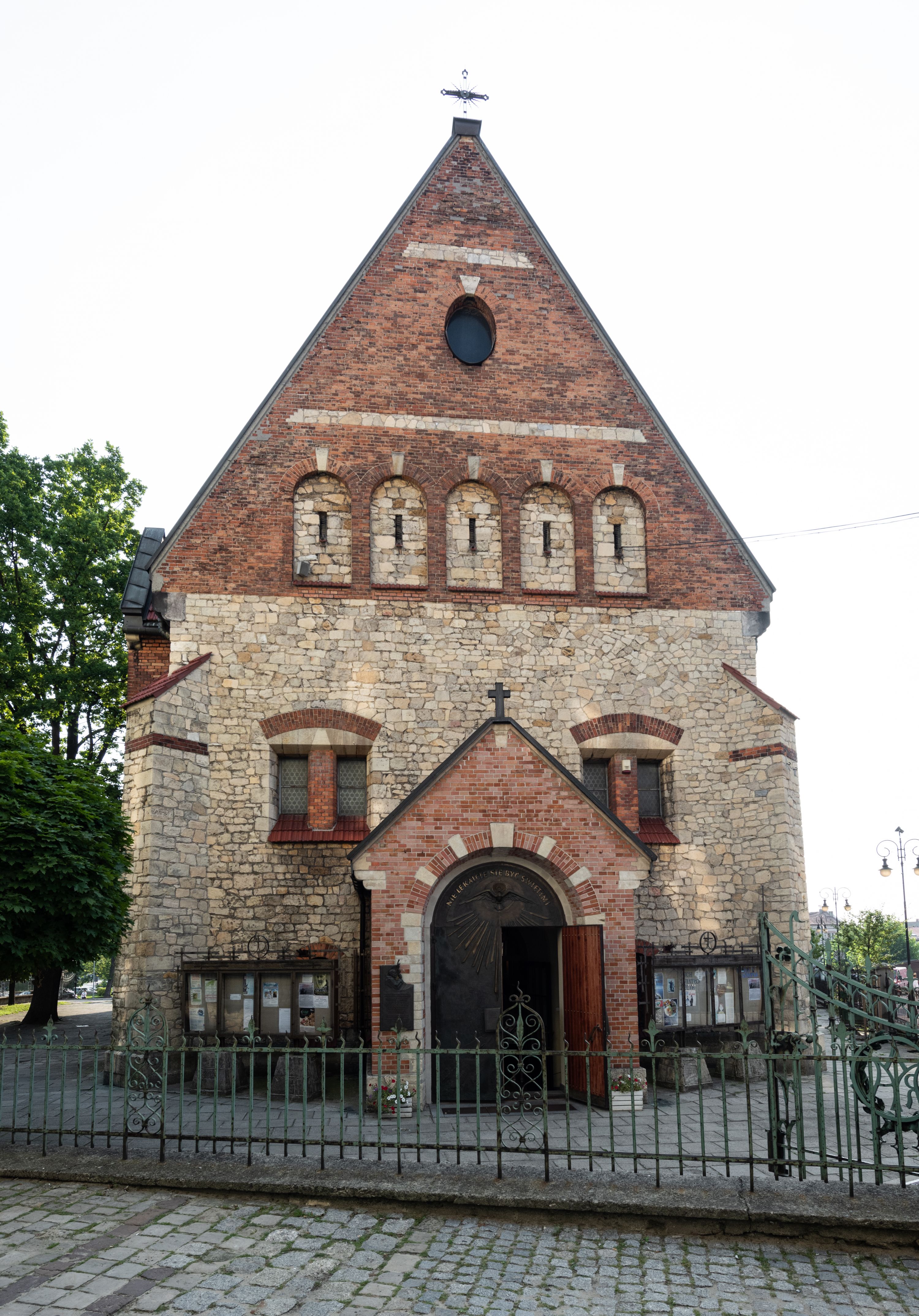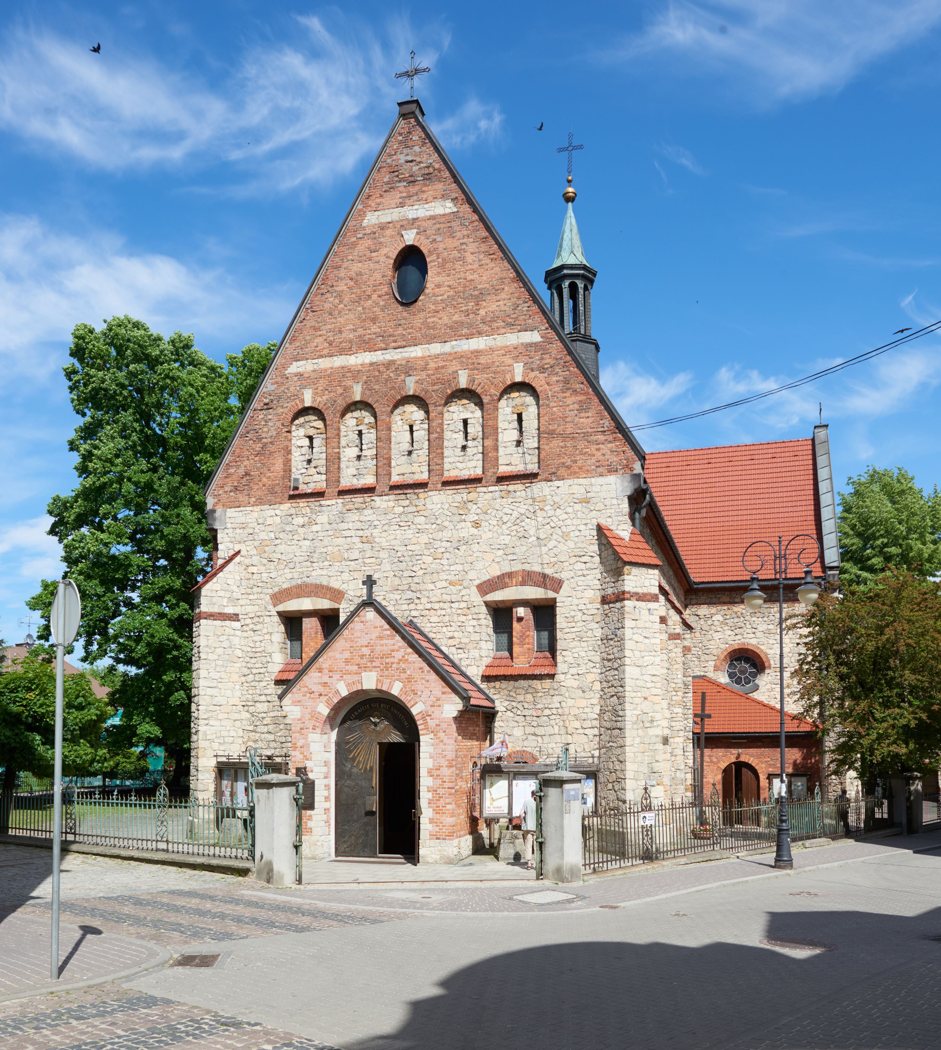 Kościół murowany, orientowany, jednonawowy, trójprzęsłowy, z transeptem i jednoprzęsłowym, węższym i niższym prezbiterium zamkniętym trójbocznie. Między nawą a transeptem po obu stronach znajdują się kruchty, do prezbiterium od strony północnej dostawiona kruchta złożona z dwóch lokalności. Ściany są rozczłonkowane filarami, tworzącymi płytkie arkadowe wnęki. Między nawą a prezbiterium arkada tęczowa. Sklepienie krzyżowe na gurtach spływających na filary. Prezbiterium oświetlają wąskie, prostokątne okna zamknięte ostrołukowo, w nawie i w transepcie znajdują się prostokątne okna prostokątne zamknięte półkoliście, w ścianie frontowej w dolnej części okna prostokątne zamknięte półkoliście, a w górnej podwójne okna prostokątne. Fasada ujęta dwiema narożnymi szkarpami, zwieńczona trójkątnie. Do niej dostawiona kruchta z dwuspadowym daszkiem i wejściem w kształcie prostokąta zamkniętego półkoliście. W kamiennej fasadzie znajdują się dołem okna prostokątne, zamknięte półkoliście, a górą prostokątne, biforialne okna z nadprożem łukowatym wykonanym z cegły. Szczyt ceglany, podzielony na trzy strefy kamiennym wątkiem, z pięcioma wnękami prostokątnymi, zamkniętymi półkoliście, z wąskimi otworami w dolnej strefie i z owalnym oknem w drugiej. Elewacje boczne nawy ujęte skarpami. Dachy dwuspadowe, kryte dachówką, z wieżyczką na sygnaturkę.
