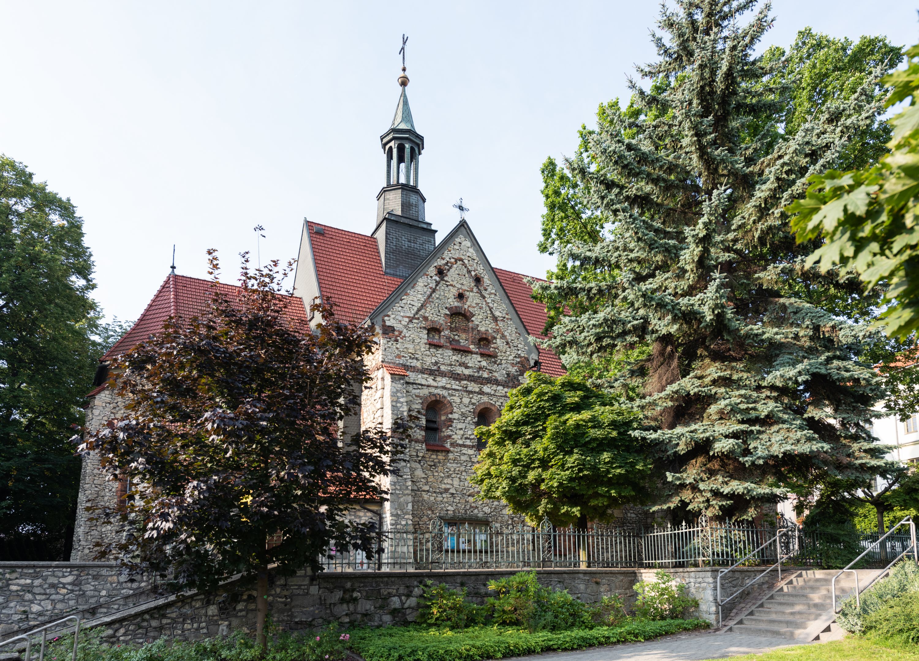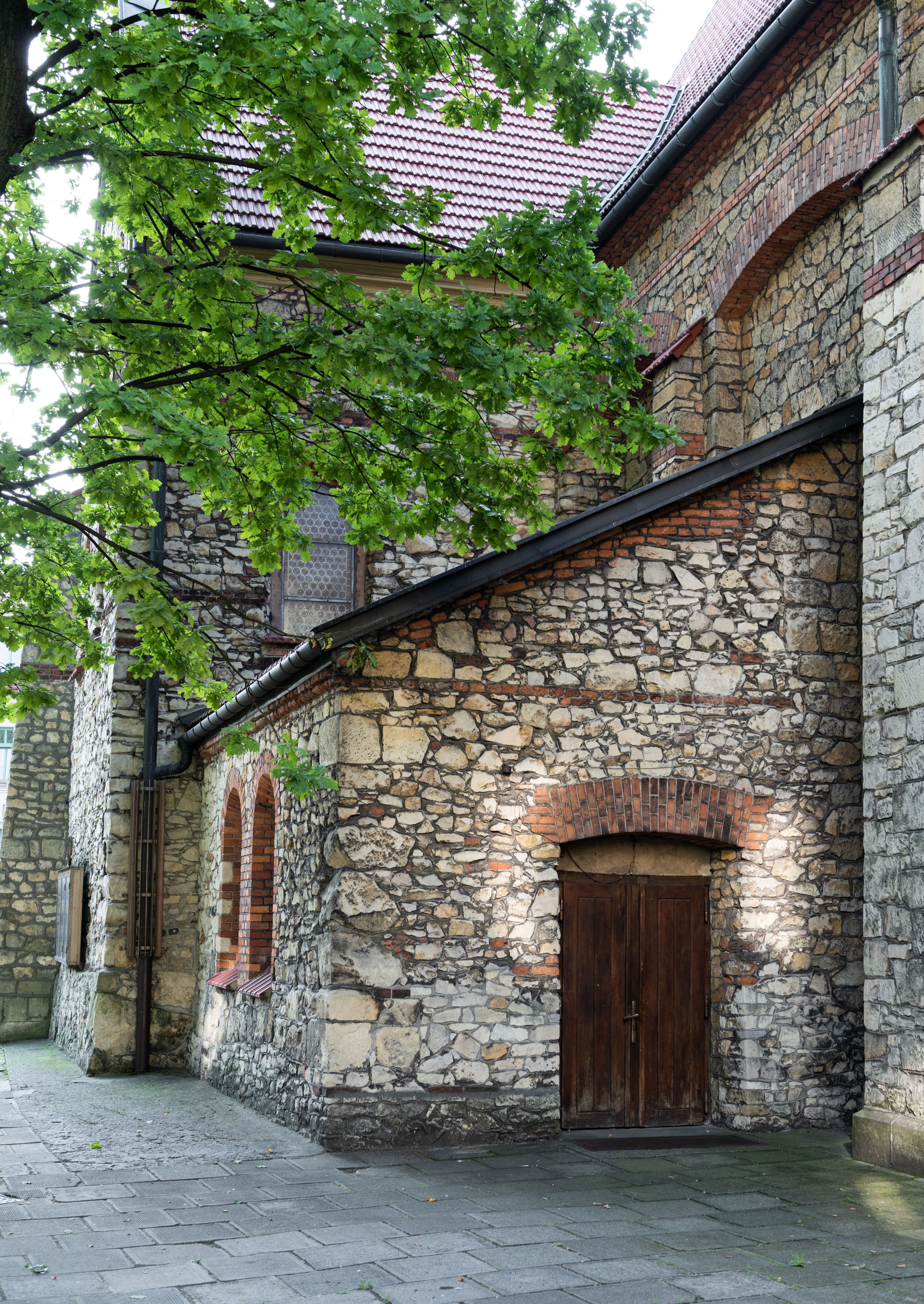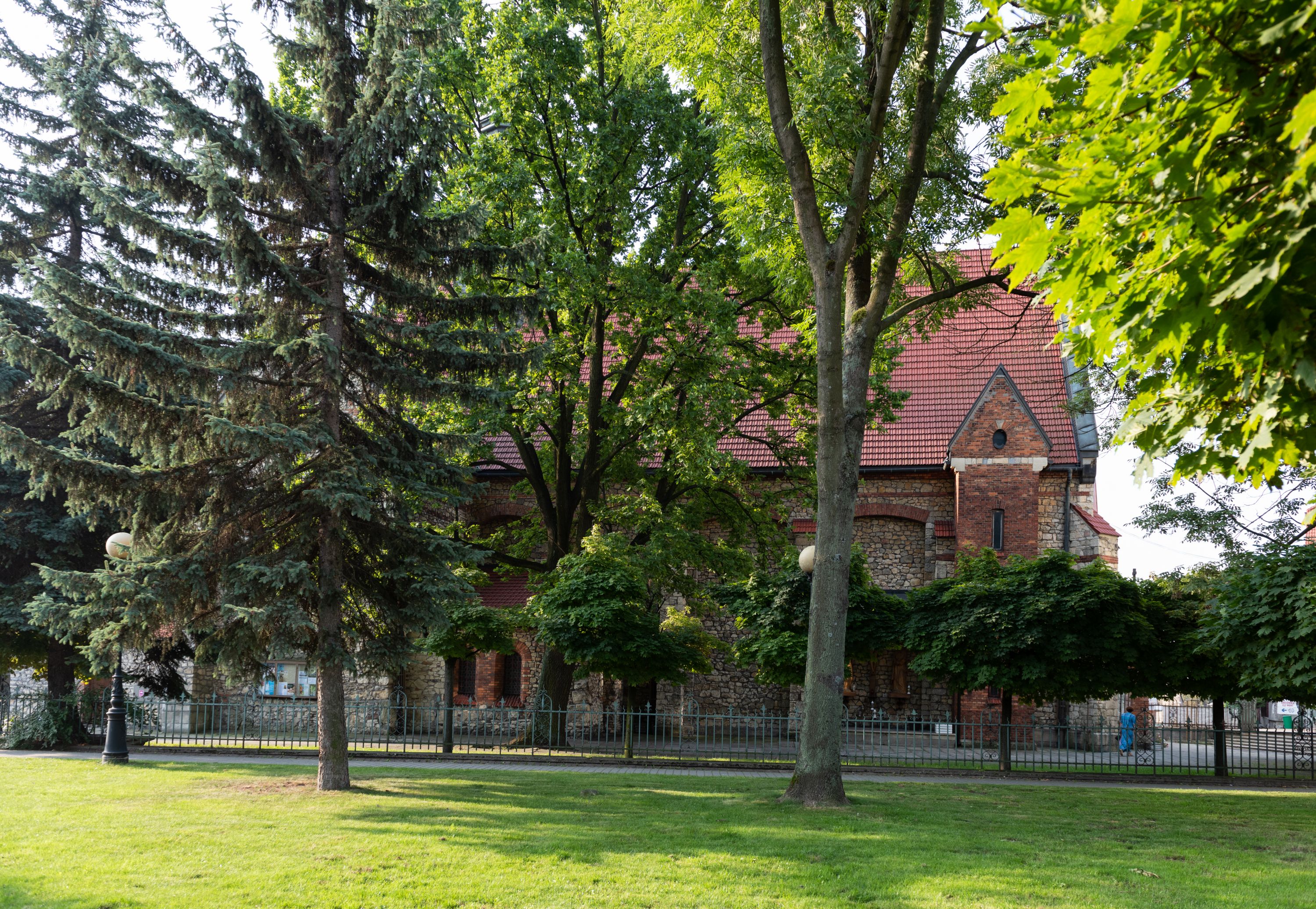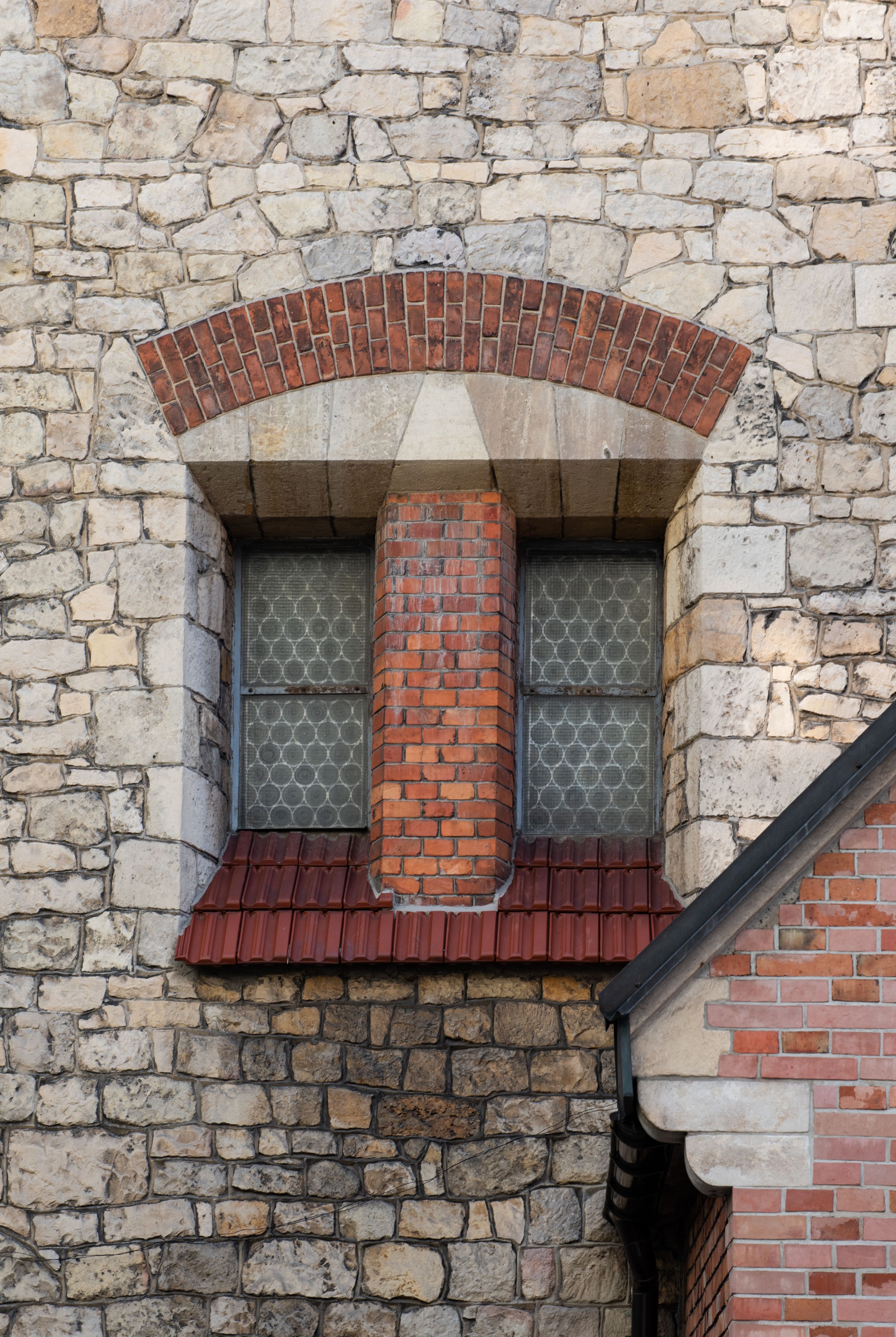 Kościół murowany, orientowany, jednonawowy, trójprzęsłowy, z transeptem i jednoprzęsłowym, węższym i niższym prezbiterium zamkniętym trójbocznie. Między nawą a transeptem po obu stronach znajdują się kruchty, do prezbiterium od strony północnej dostawiona kruchta złożona z dwóch lokalności. Ściany są rozczłonkowane filarami, tworzącymi płytkie arkadowe wnęki. Między nawą a prezbiterium arkada tęczowa. Sklepienie krzyżowe na gurtach spływających na filary. Prezbiterium oświetlają wąskie, prostokątne okna zamknięte ostrołukowo, w nawie i w transepcie znajdują się prostokątne okna prostokątne zamknięte półkoliście, w ścianie frontowej w dolnej części okna prostokątne zamknięte półkoliście, a w górnej podwójne okna prostokątne. Fasada ujęta dwiema narożnymi szkarpami, zwieńczona trójkątnie. Do niej dostawiona kruchta z dwuspadowym daszkiem i wejściem w kształcie prostokąta zamkniętego półkoliście. W kamiennej fasadzie znajdują się dołem okna prostokątne, zamknięte półkoliście, a górą prostokątne, biforialne okna z nadprożem łukowatym wykonanym z cegły. Szczyt ceglany, podzielony na trzy strefy kamiennym wątkiem, z pięcioma wnękami prostokątnymi, zamkniętymi półkoliście, z wąskimi otworami w dolnej strefie i z owalnym oknem w drugiej. Elewacje boczne nawy ujęte skarpami. Dachy dwuspadowe, kryte dachówką, z wieżyczką na sygnaturkę.