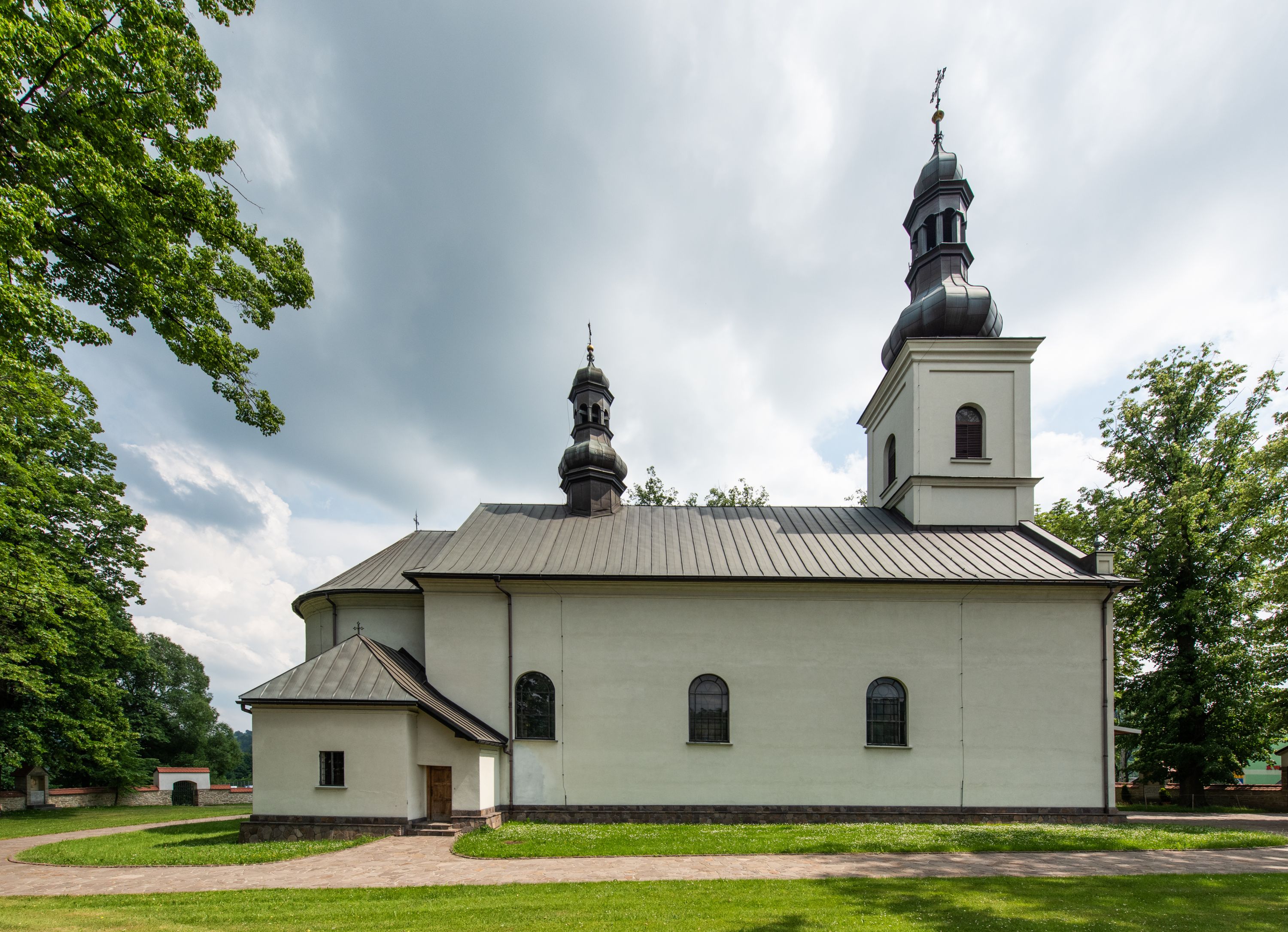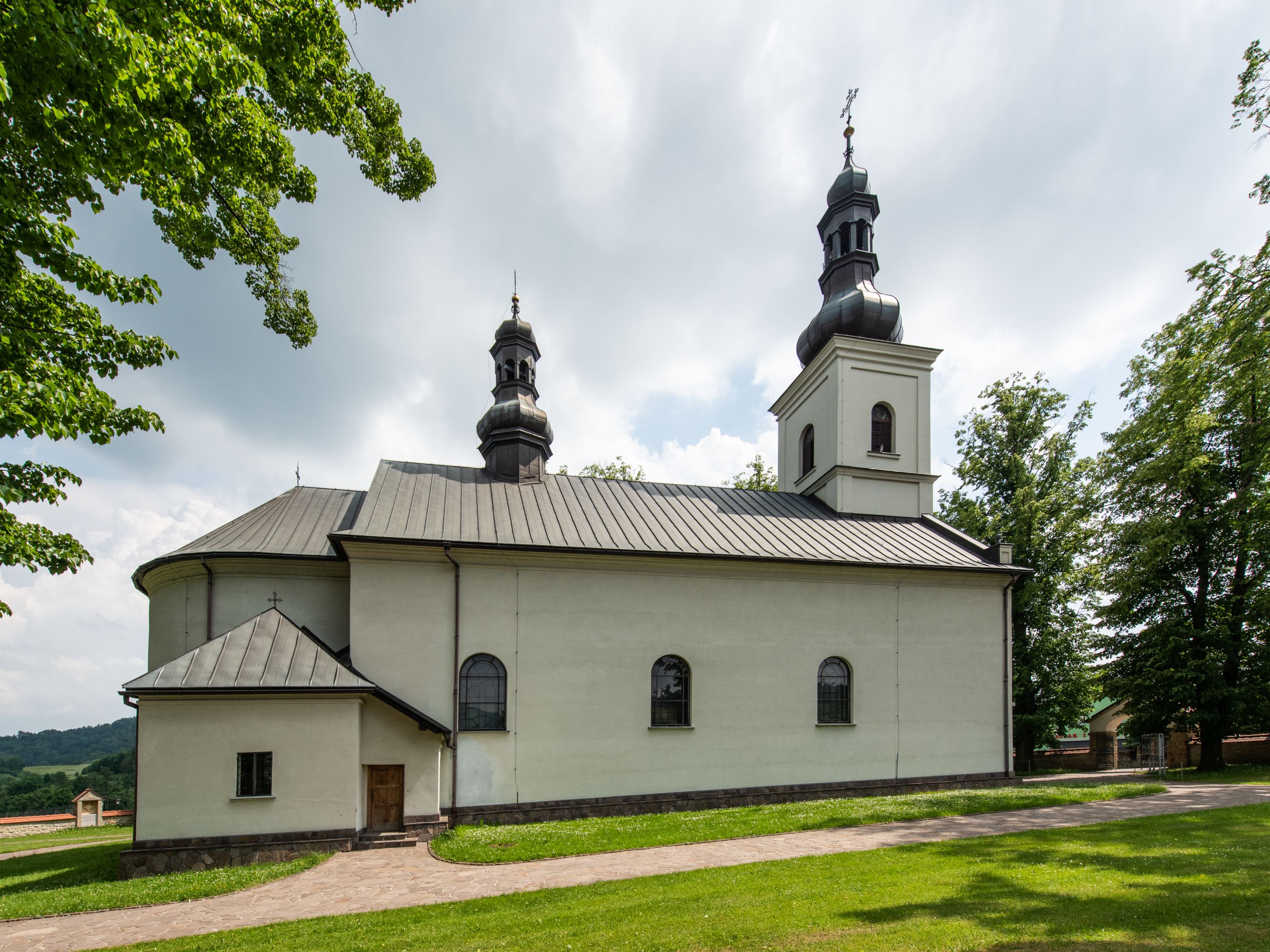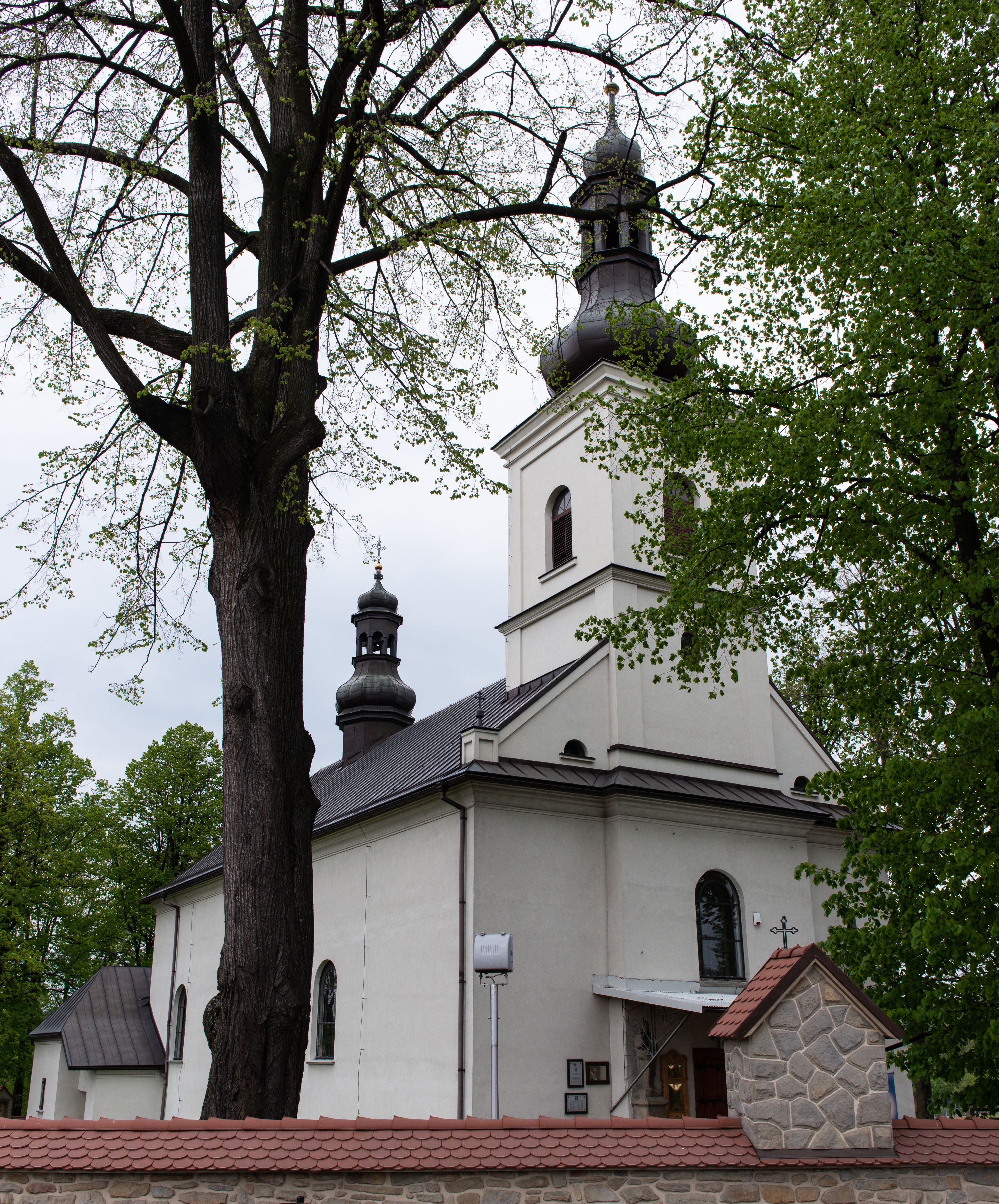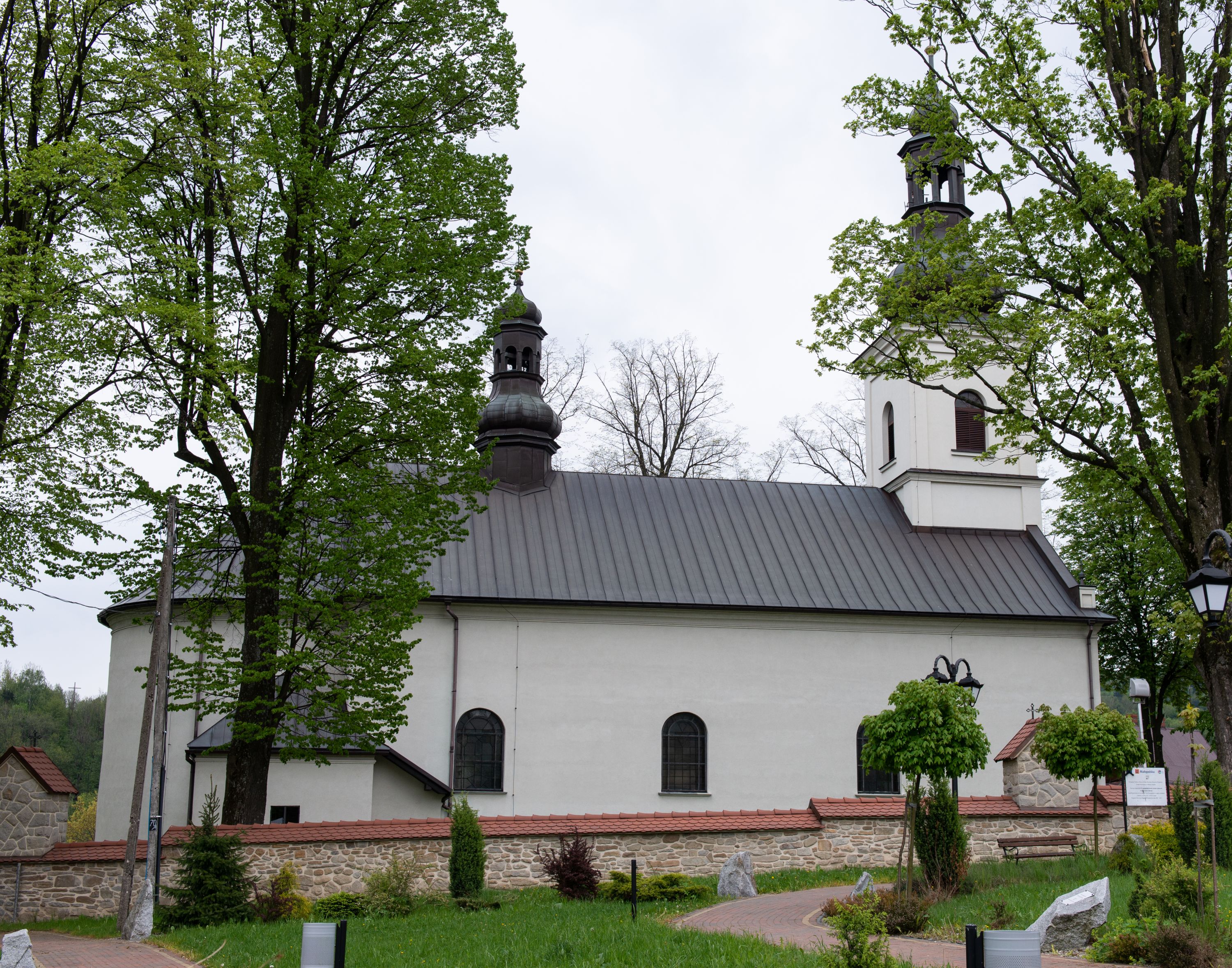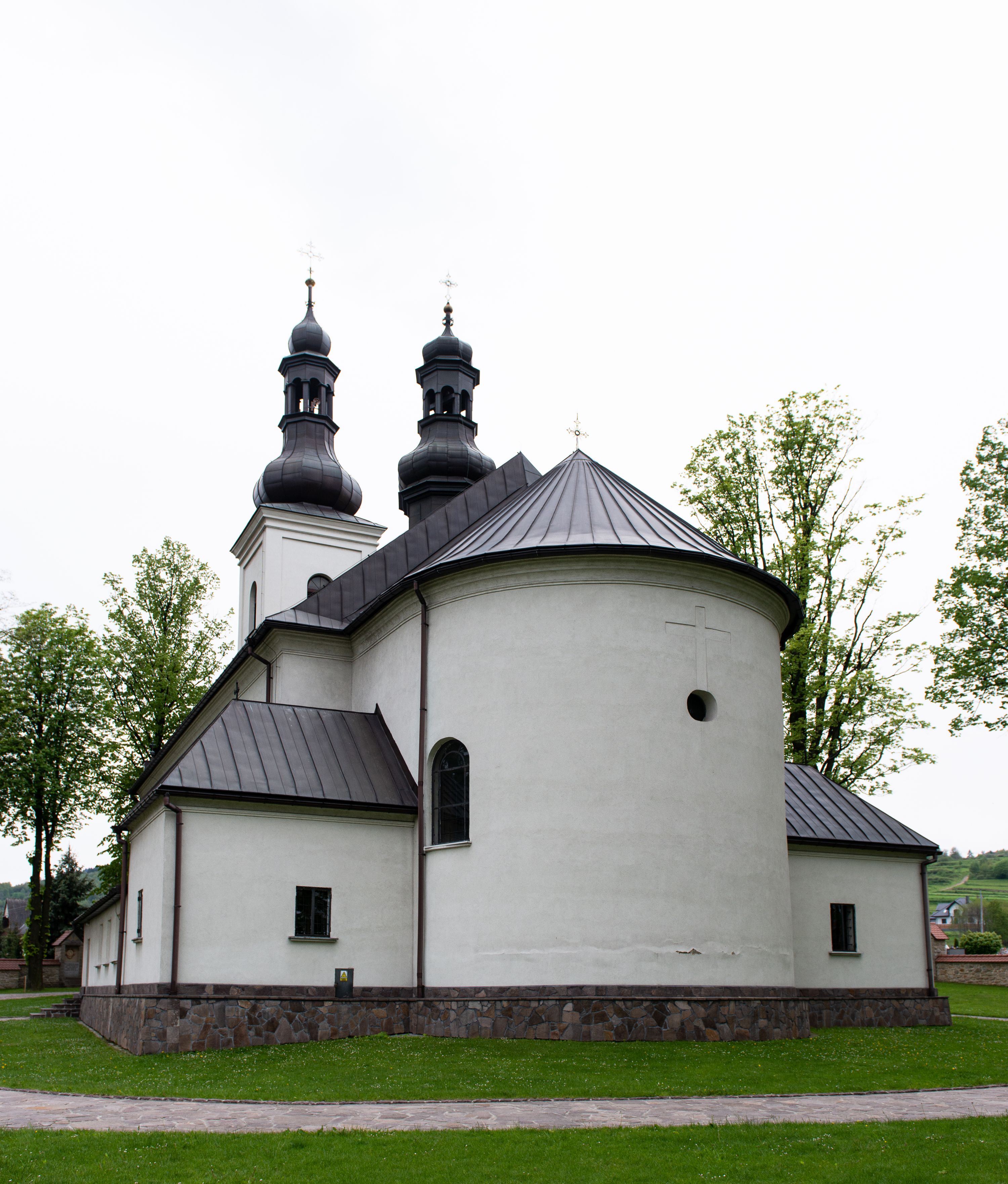 Kościół usytuowany jest w południowo-wschodniej części wsi, otoczony kamiennym murem, otynkowanym, krytym betonową płytą, w który wbudowano współczesne stacje drogi krzyżowej. Na plac kościelny prowadzą trzy bramy. Główna brama znajduje się w murze od strony zachodniej, nakryta jest ostrołukową arkadą. Dwie mniejsze bramy zlokalizowane są od strony południowej oraz od strony wschodniej. Na placu przed kościołem stoi pomnik z 1911 roku wystawiony na pamiątkę księdza Wojciecha Blaszyńskiego i działacza ludowego Stanisława Stojałowskiego.