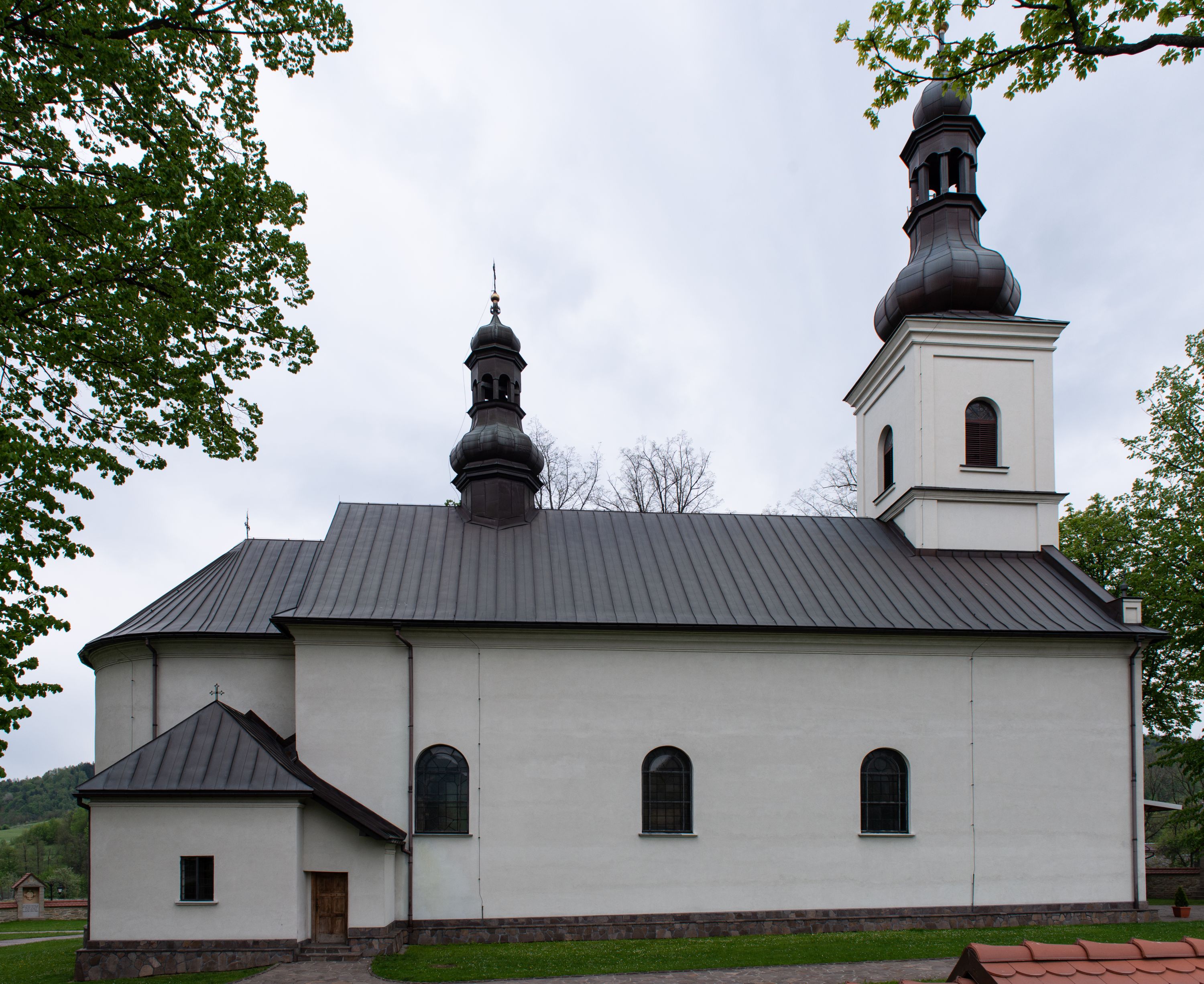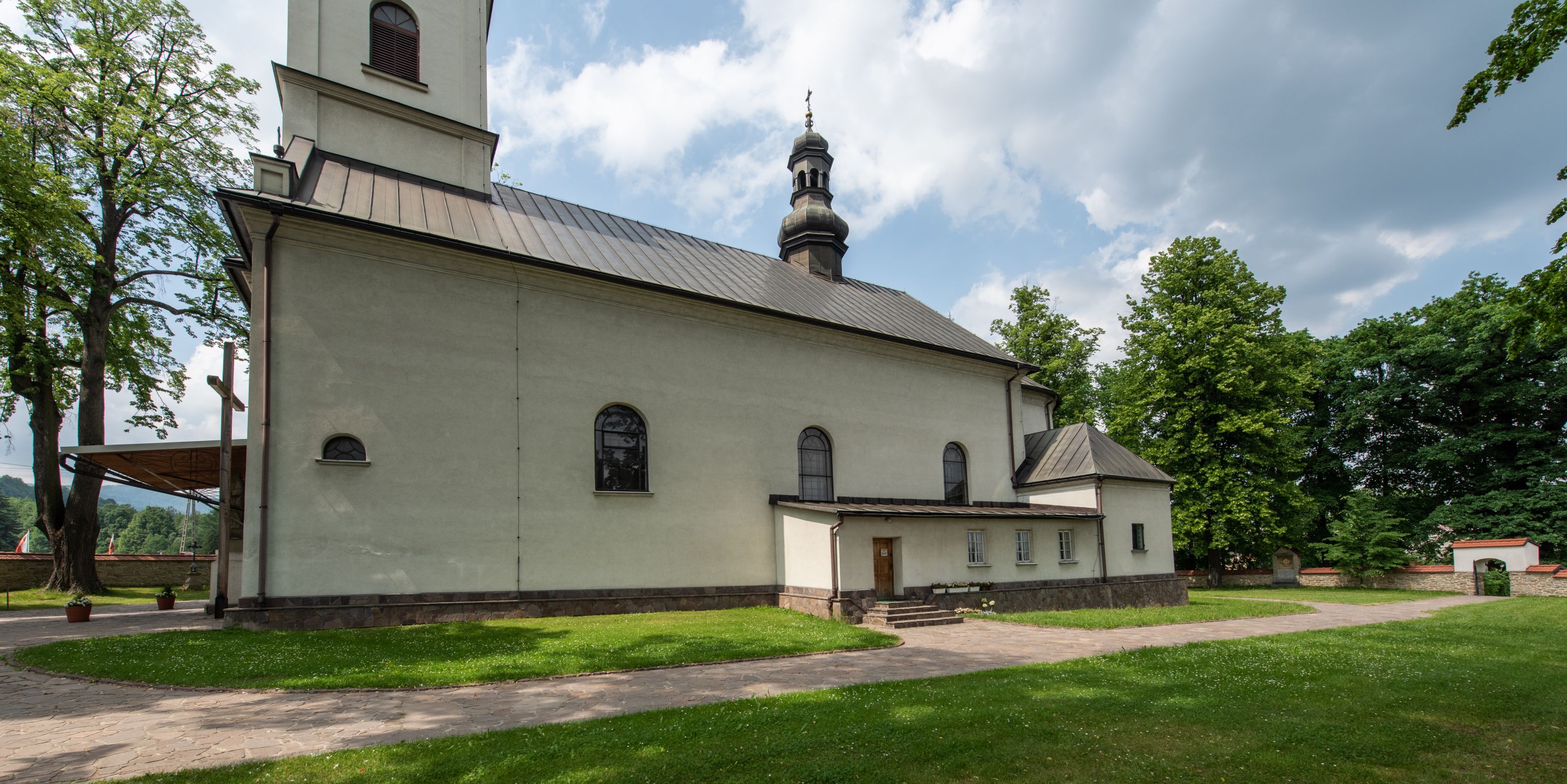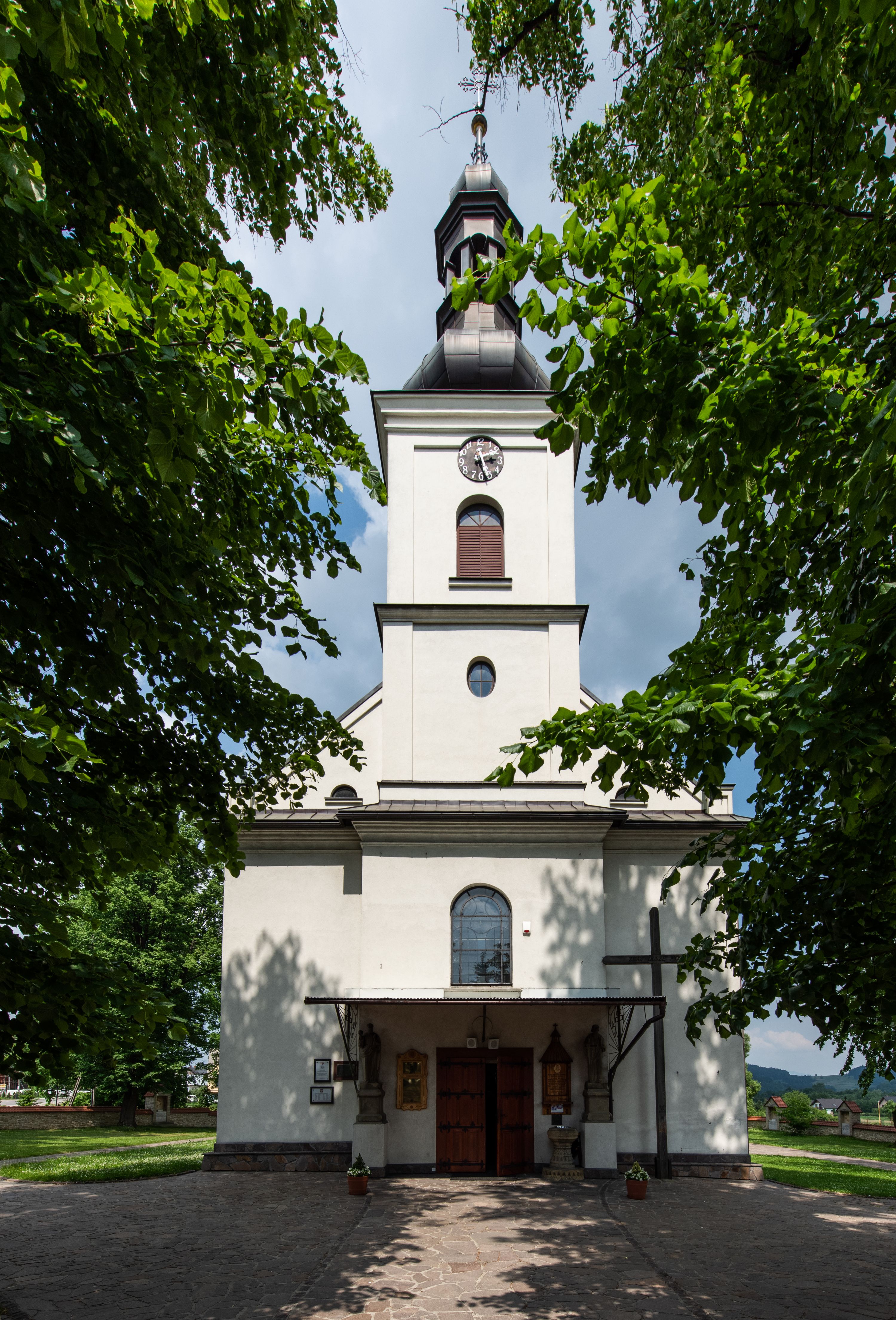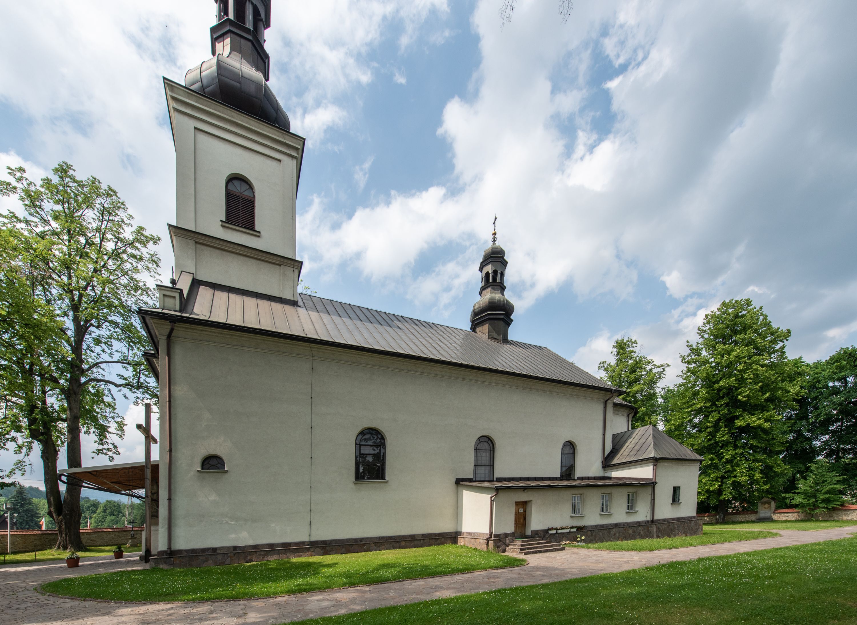 Kościół usytuowany jest w południowo-wschodniej części wsi, otoczony kamiennym murem, otynkowanym, krytym betonową płytą, w który wbudowano współczesne stacje drogi krzyżowej. Na plac kościelny prowadzą trzy bramy. Główna brama znajduje się w murze od strony zachodniej, nakryta jest ostrołukową arkadą. Dwie mniejsze bramy zlokalizowane są od strony południowej oraz od strony wschodniej. Na placu przed kościołem stoi pomnik z 1911 roku wystawiony na pamiątkę księdza Wojciecha Blaszyńskiego i działacza ludowego Stanisława Stojałowskiego.