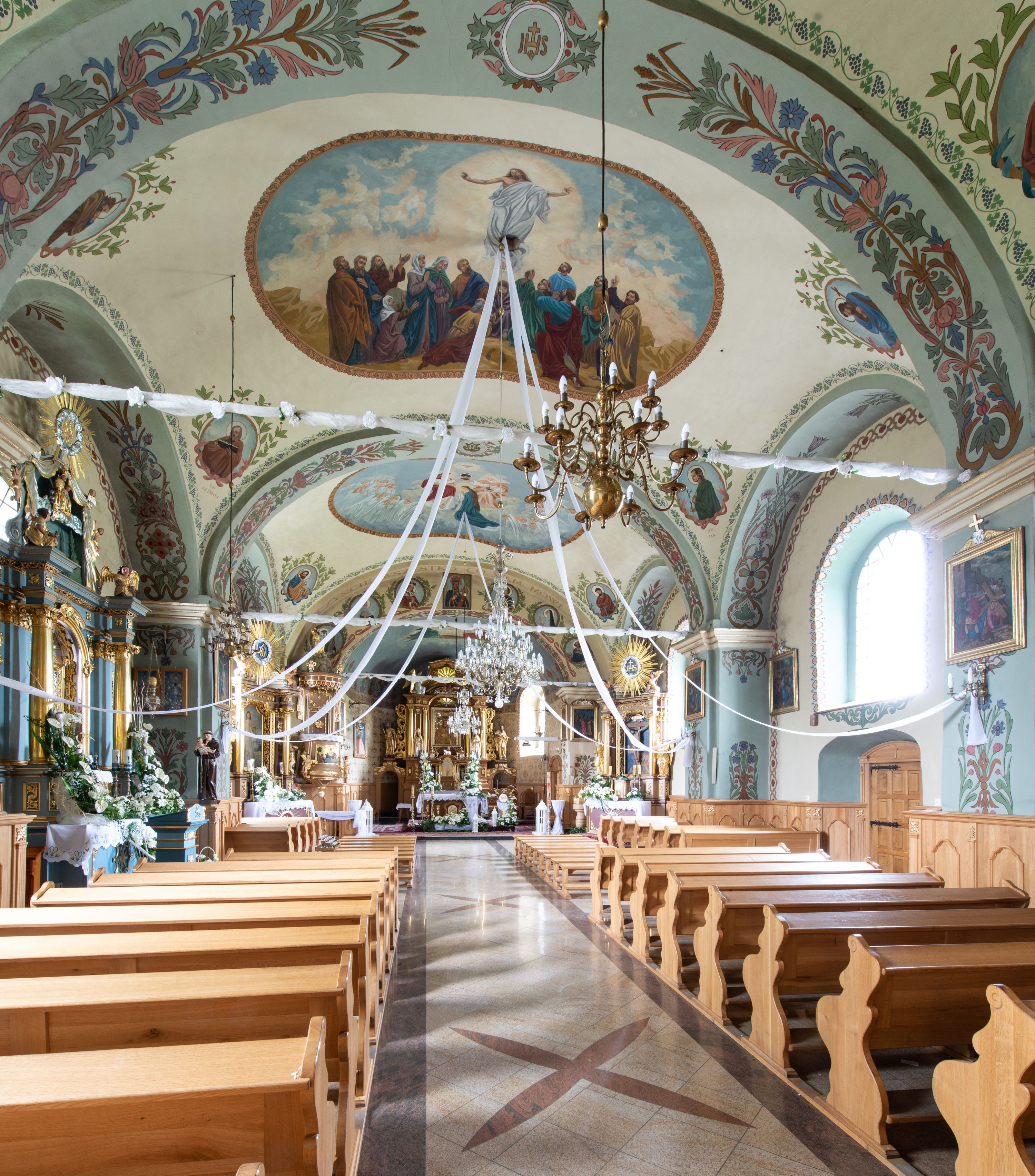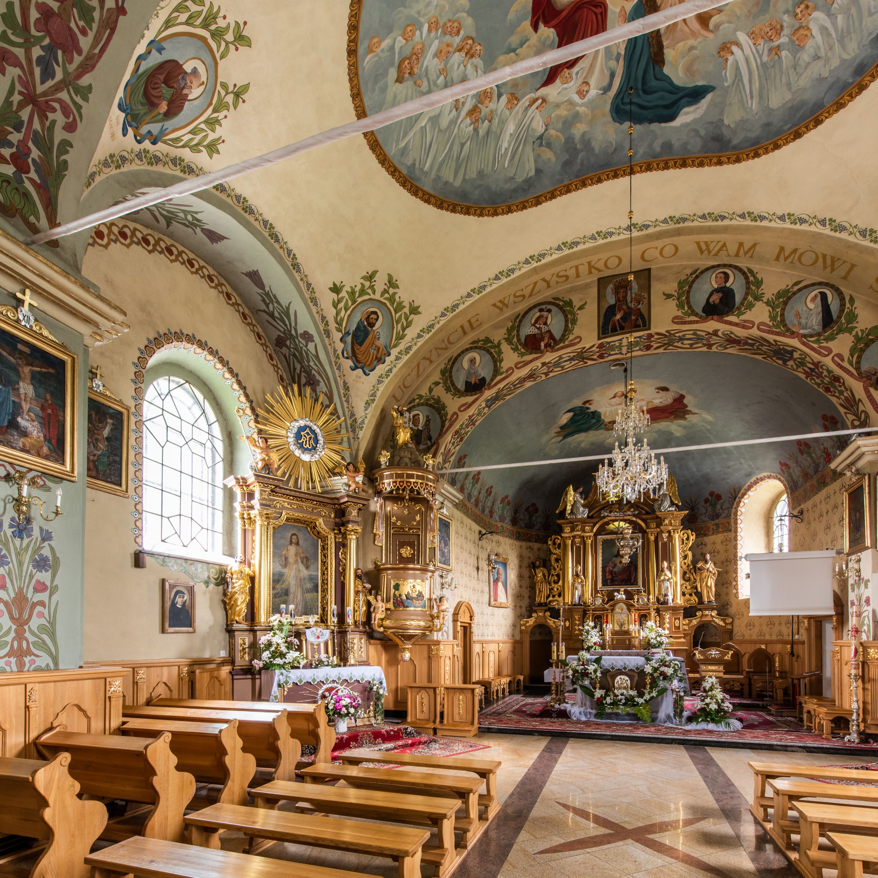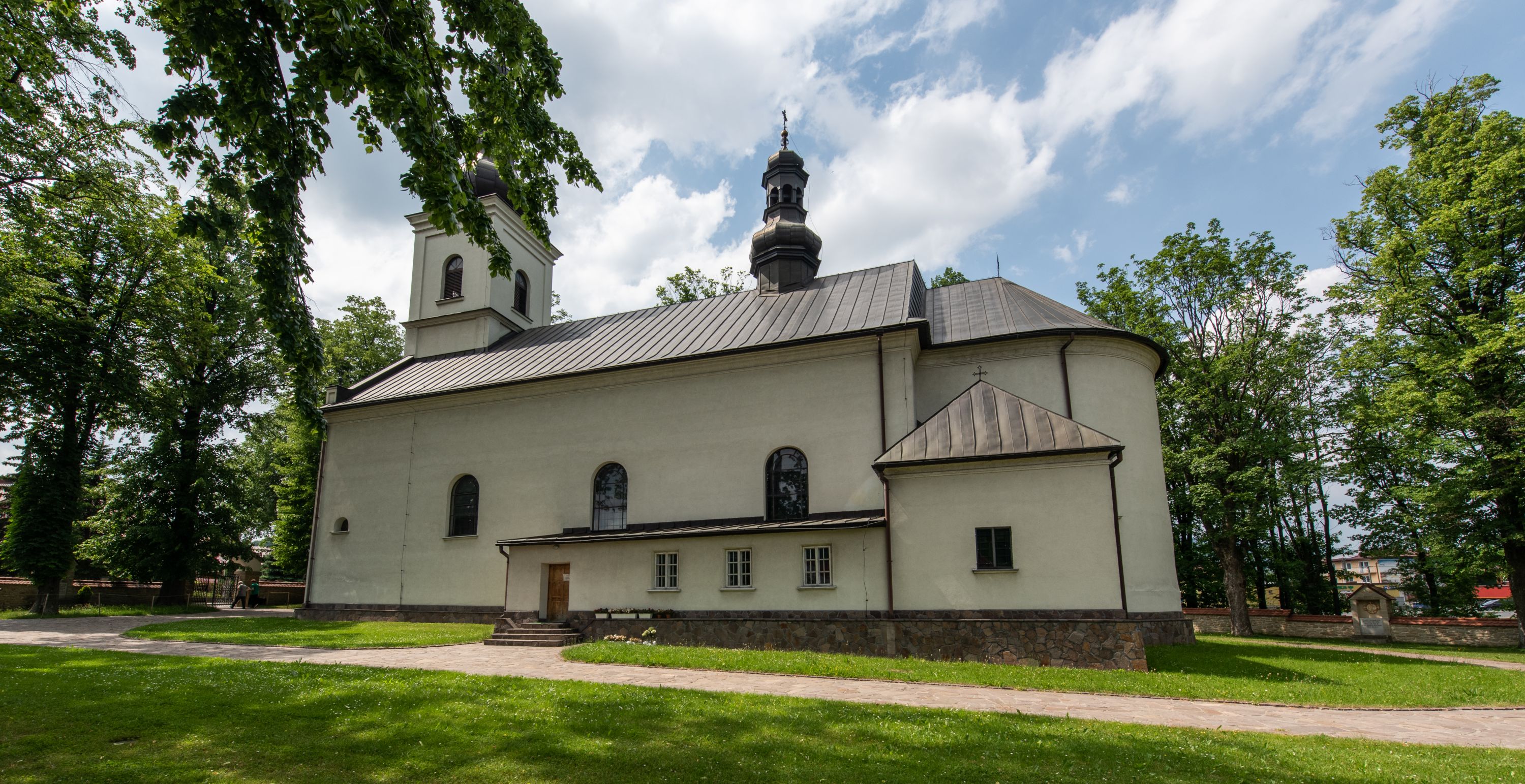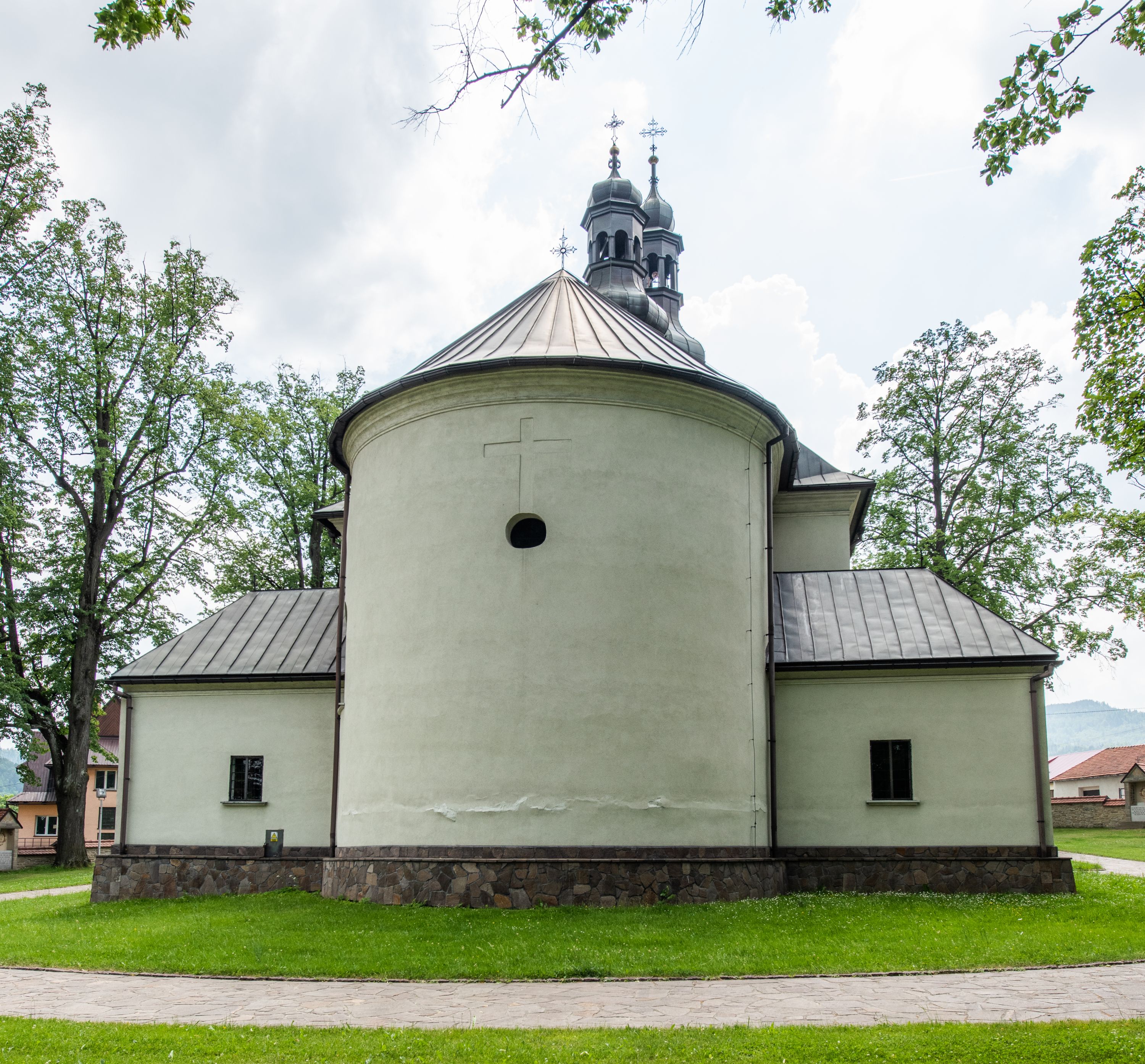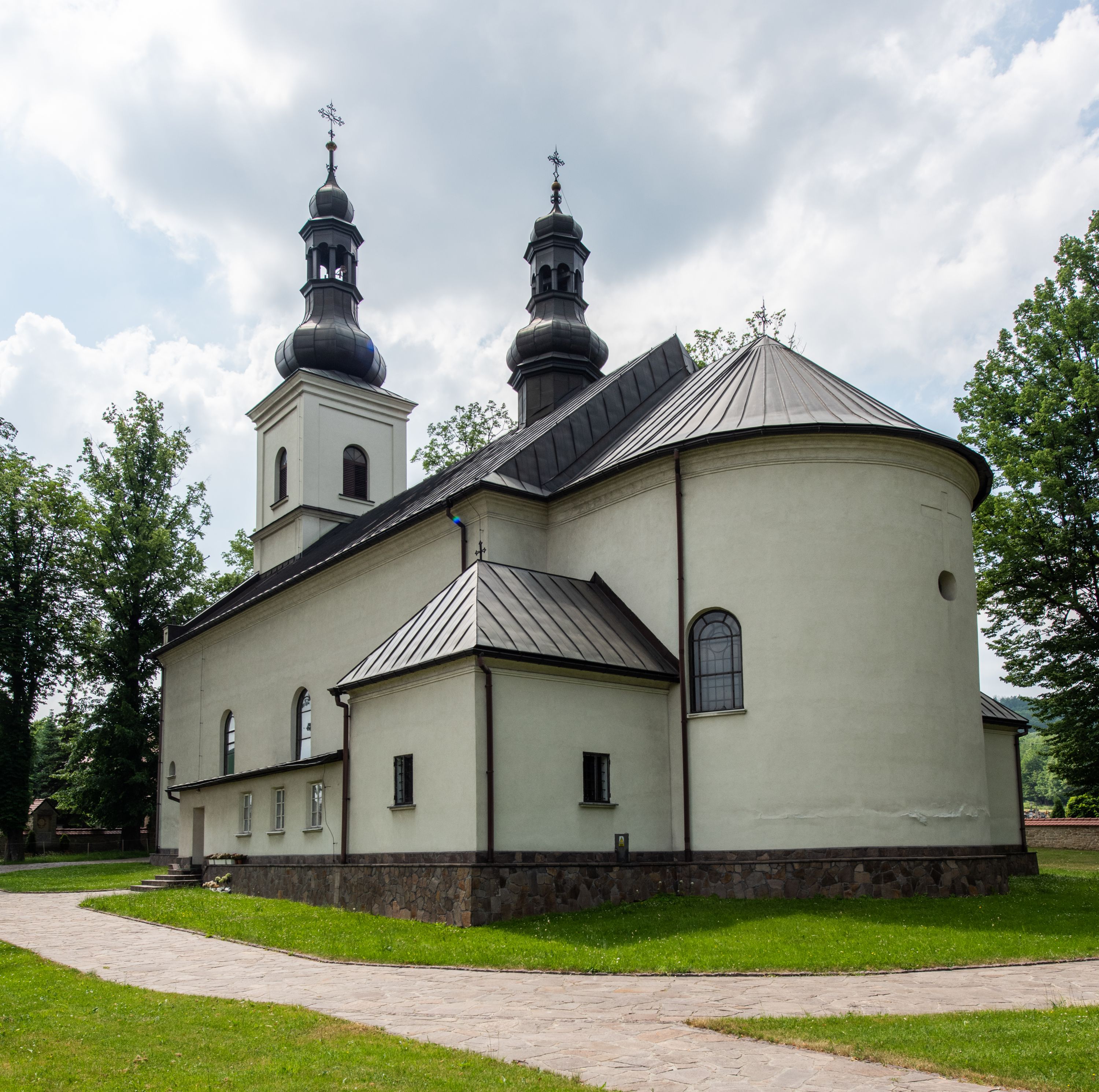 Kościół usytuowany jest w południowo-wschodniej części wsi, otoczony kamiennym murem, otynkowanym, krytym betonową płytą, w który wbudowano współczesne stacje drogi krzyżowej. Na plac kościelny prowadzą trzy bramy. Główna brama znajduje się w murze od strony zachodniej, nakryta jest ostrołukową arkadą. Dwie mniejsze bramy zlokalizowane są od strony południowej oraz od strony wschodniej. Na placu przed kościołem stoi pomnik z 1911 roku wystawiony na pamiątkę księdza Wojciecha Blaszyńskiego i działacza ludowego Stanisława Stojałowskiego.