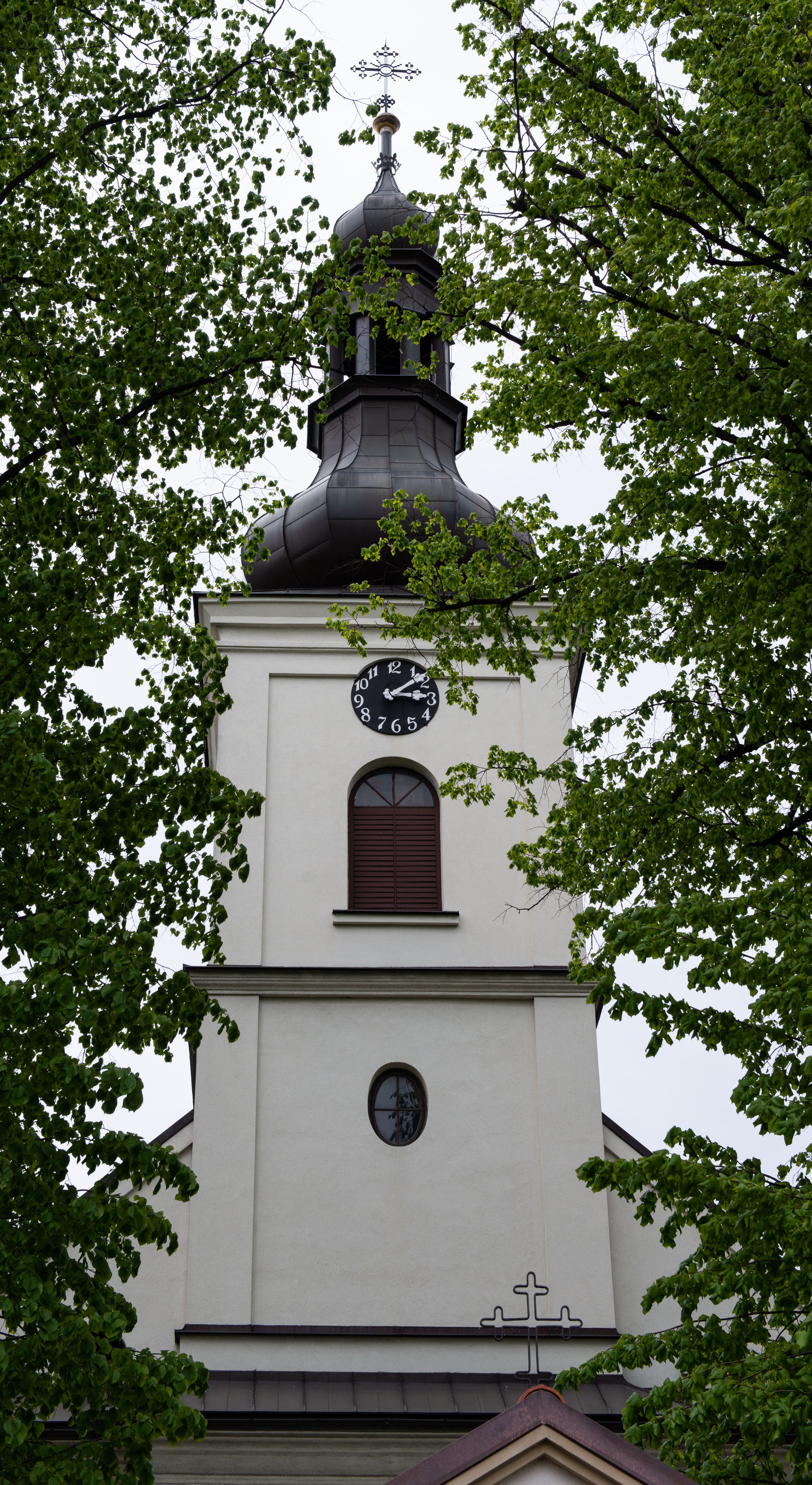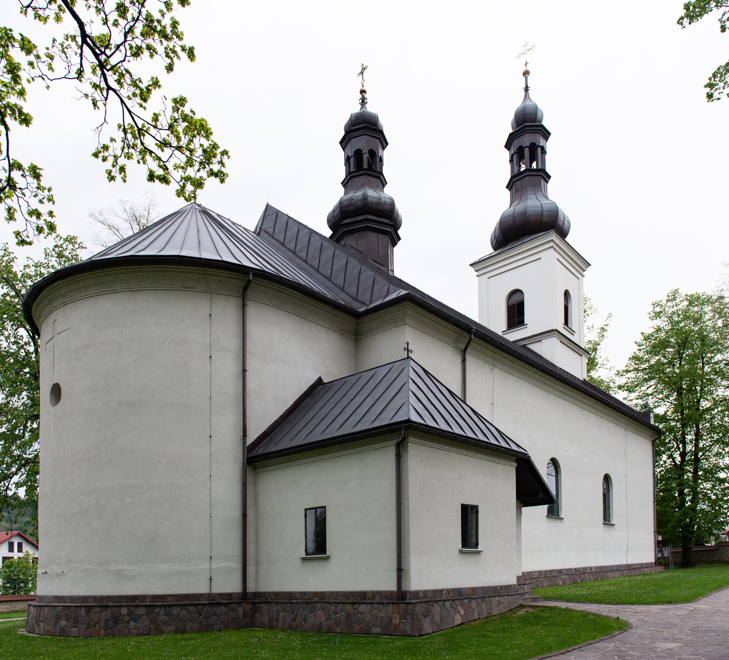 Fasada kościoła jest płaska, zakończona gzymsem z wysuniętą do przodu trójkondygnacyjną wieżą, nakrytą baniastym hełmem z latarnią. Drugie piętro wieży połączone jest z fasadą prostymi spływami. Przy wejściu na wysokich cokołach ustawione są rzeźby świętych Piotra i Pawła.