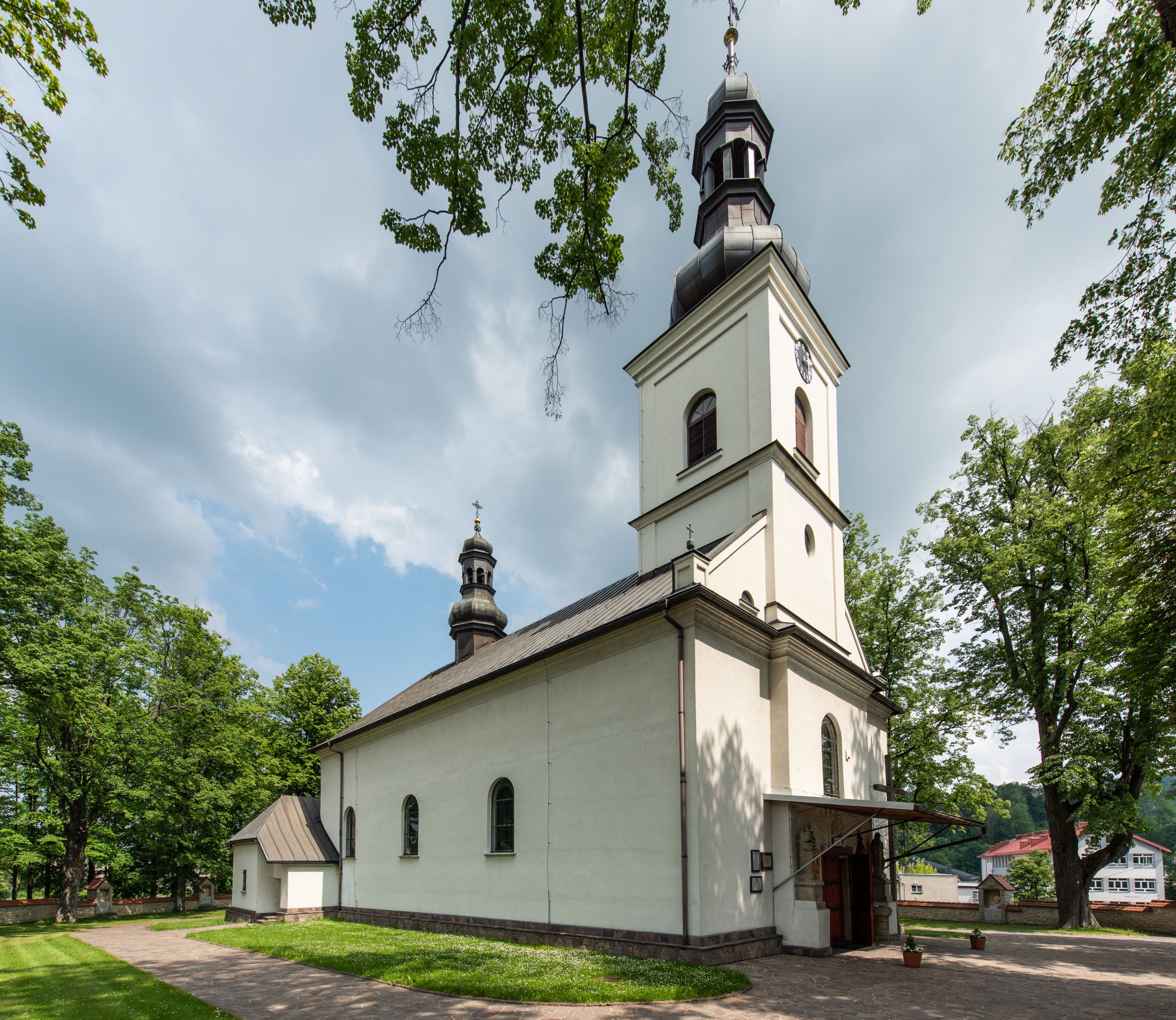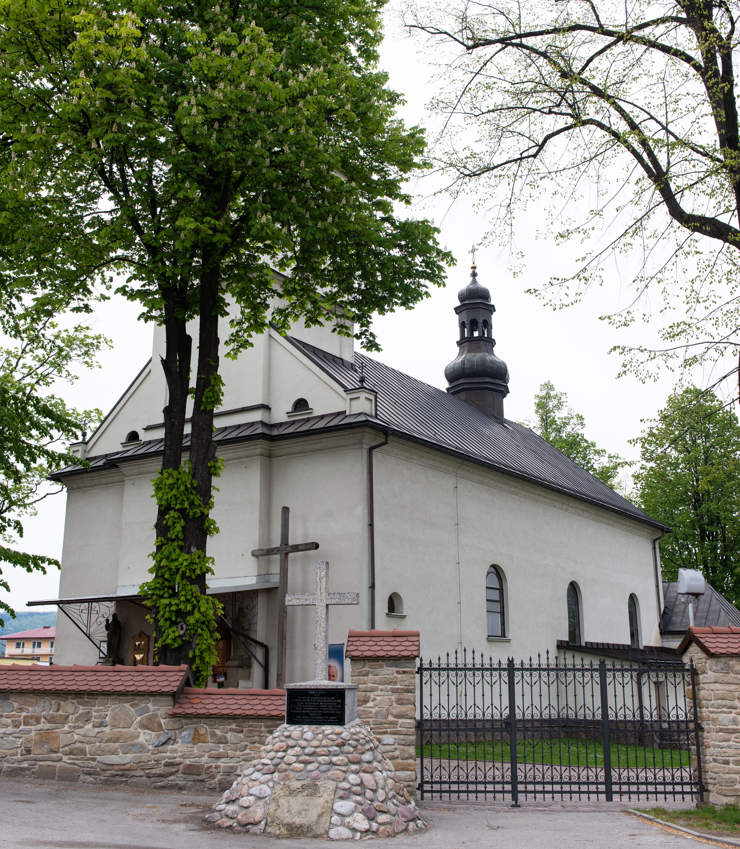 Ponieważ mały, drewniany kościół nie mieścił wszystkich parafian w 1813 roku (a według niektórych przekazów juz w 1809 roku) postanowiono o budowie nowej, większej świątyni według planów kościoła w Makowie Podhalańskim. Kamień wydobywano w okolicznych kamieniołomach „Psiej Dolinie” oraz „Za Gorylką”, a także w Łęgu, gdzie materiał budowlany został naniesiony przez powódź w 1813 roku. Cegłę zakupiono w Żywcu. Budowę rozpoczęto w 1815 roku wylaniem fundamentów, a całość zakończono w 1825 roku. Świątynię pokryto blachą miedzianą. Na podłogę zwożono płaskie kamienie z „Za Gorylki”, które następnie szlifowano i układano w kościele (posadzkę tę wymieniono w 1949 roku na czarno-białe lastrykowe płytki). Świątynię poświęcił 16 lipca 1815 ksiądz Ignacy Machayski, proboszcz z Suchej Beskidzkiej, a konsekrował ją 3 maja 1825 biskup tarnowski Grzegorz Tomasz Ziegler. Kościół ten został zniszczony w wyniku pożaru w 1911 roku. Świątynię odnowiono rok później. Pierwotnie kościół pokryty był gontem, który w 1868 roku zastąpiono blachą miedzianą, a po pożarze w 1911 roku eternitem. Następnie pokrycie dachu zmieniono na blachę żelazną, ocynkowaną nad prezbiterium i zakrystią. Na hełmach wieży i sygnaturki położona jest obecnie blacha miedziana, która ocalała z pożaru. Na chórze zostały umieszczone dwunastogłosowe organy wykonane przez firmę Rieger z Jagorsdorfu. Polichromię kościoła wykonał Antoni Stopa (1849-1922), malarz i poeta, pochodzący z Osiedla Ostrysz w Makowie Podhalańskim, uczeń Jana Matejki przed 1911 rokiem. Obecnie w ramach prac konserwatorskich obrazy uległy jednak zmianom, na przykład scenę „Sanktuarium siedmiu aniołów” zastąpiono obrazem przedstawiającym rozmowę Jezusa z uczniami. W 2008 roku wykonano boazerię w prezbiterium oraz siedzenia dla celebransów i ministrantów, natomiast pod koniec listopada firma Kazimierza Wolskiego z Mizernej położyła granitową posadzkę w całym kościele. W kolejnym roku pokryto boazerią pozostałe ściany w kościele, wykonano nowe ławki i zastąpiono dotychczasowe krzesła dębowymi klęcznikami. Na placu przed kościołem można zobaczyć pomnik z 1911 roku wystawiony na pamiątkę księdza Wojciecha Blaszyńskiego, wieloletniego proboszcza tutejszej parafii i działacza ludowego Stanisława Stojałowskiego. Pomnik wystawiło miejscowe Kółko Rolnicze i strażacy. W 1954 roku wykonano 14 stacji drogi krzyżowej z napisami fundatorów oraz mur otaczający plac przykościelny, a w 1956 roku zrobiono dookoła kościoła chodnik z płyt betonowych.