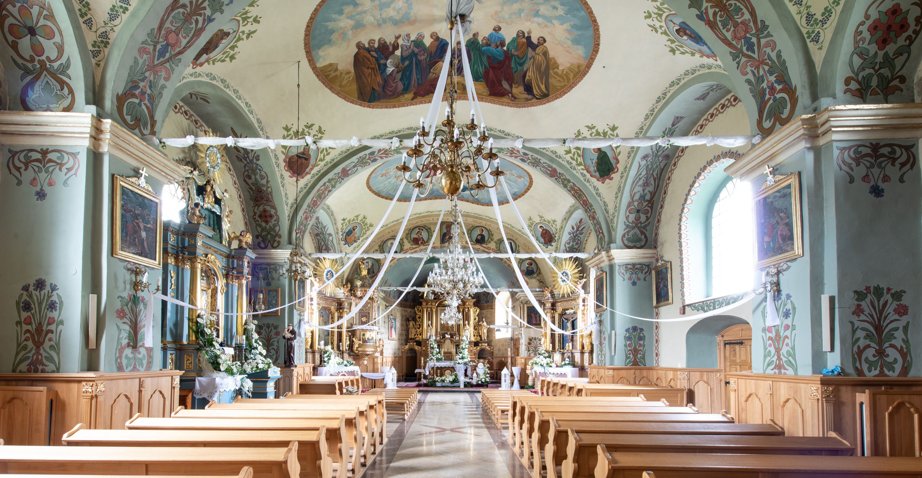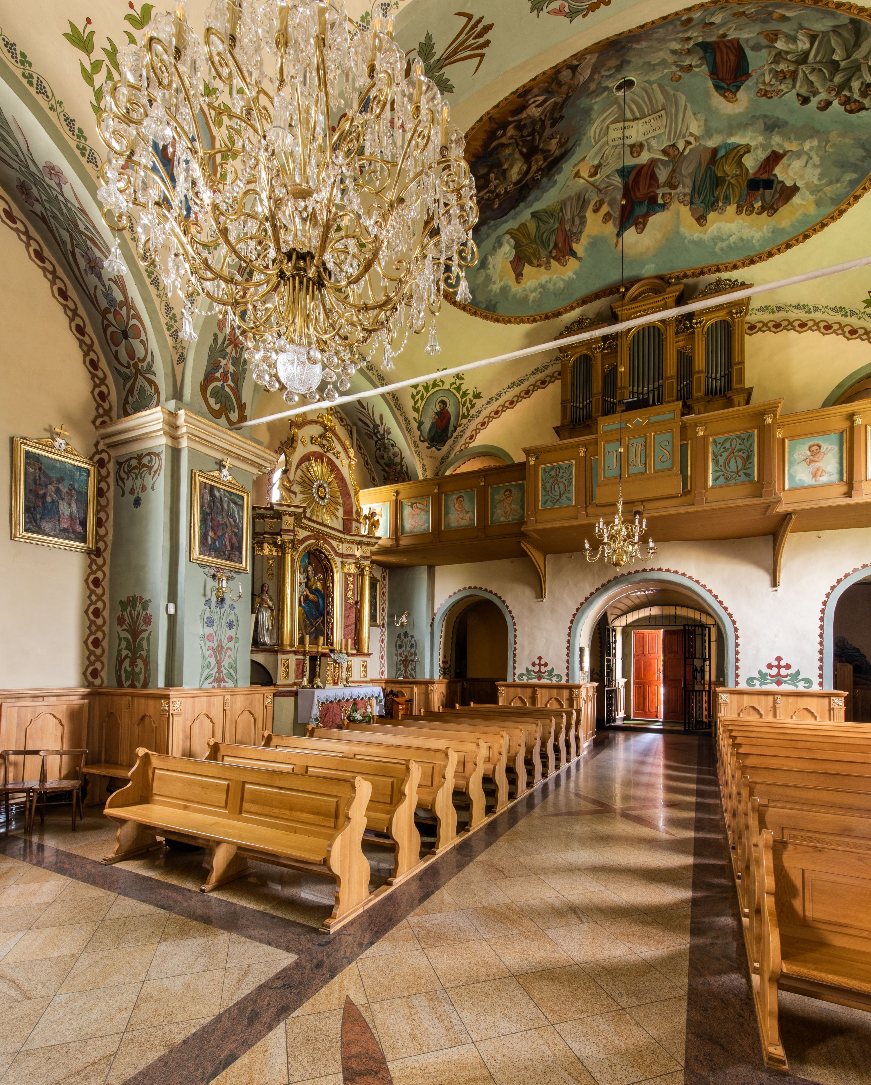 Kościoł nakryty jest dachem dwuspadowym, na skrzyżowaniu nawy z prezbiterium umieszczona jest sygnaturka z hełmem baniastym z latarnią.