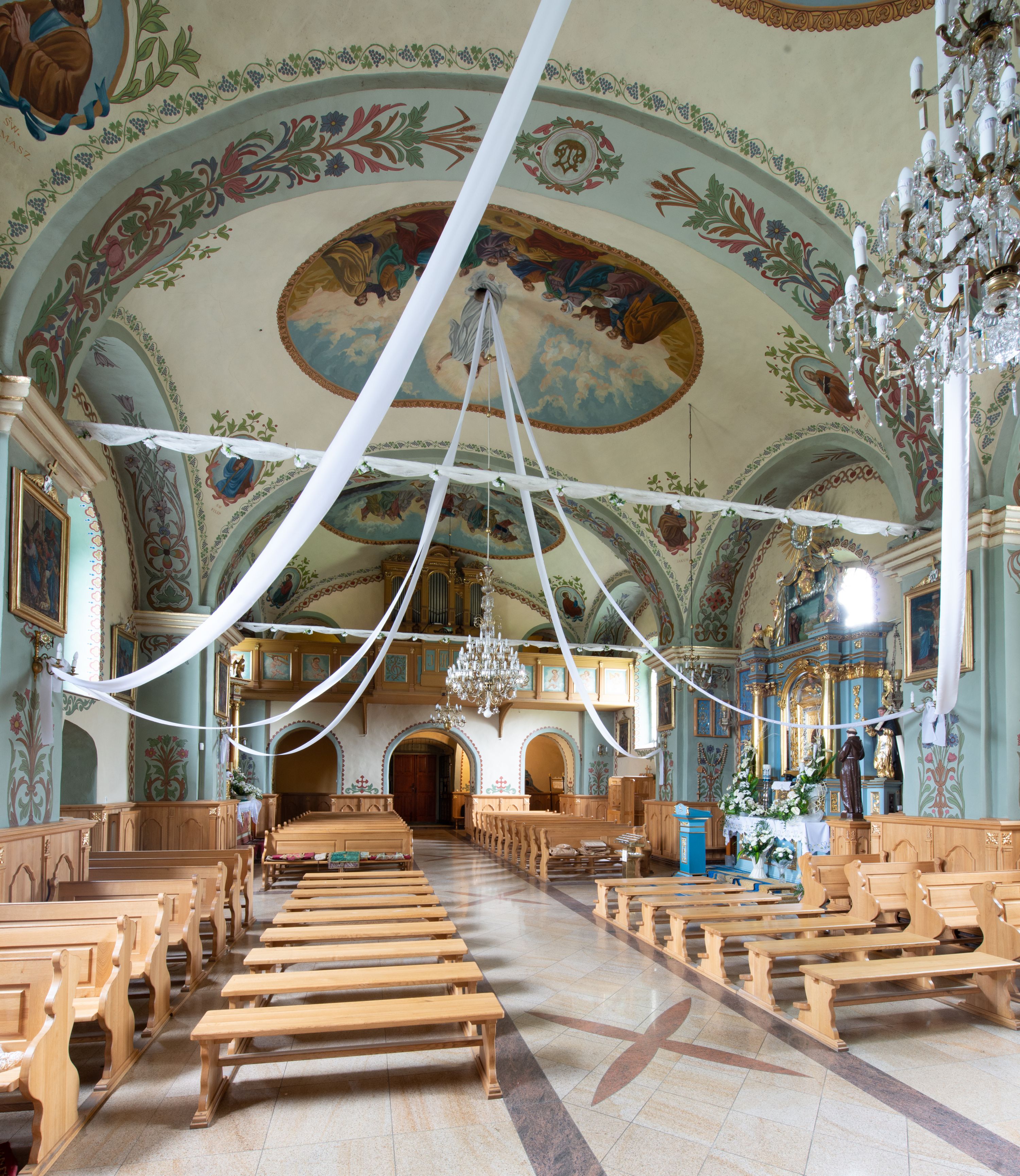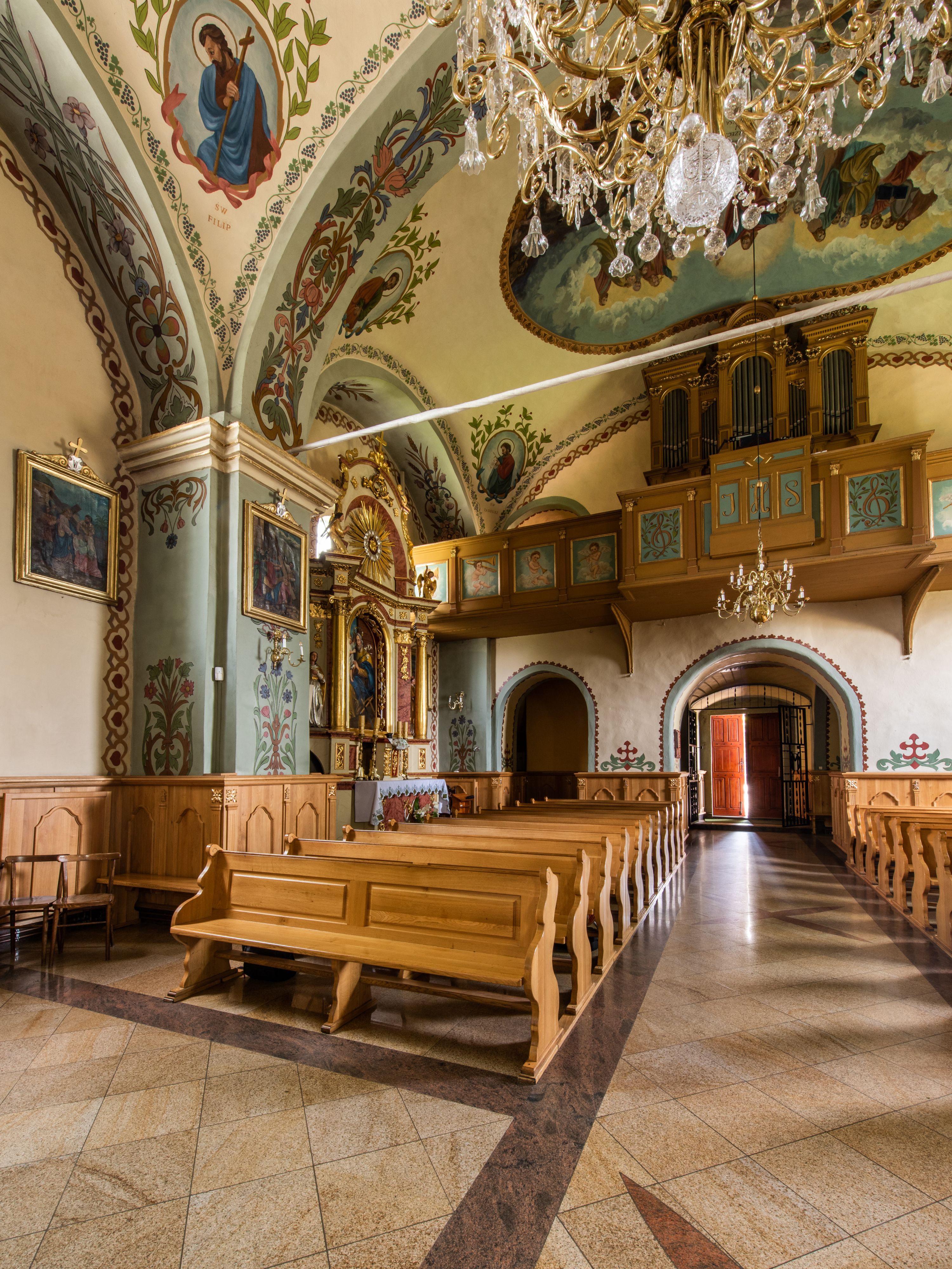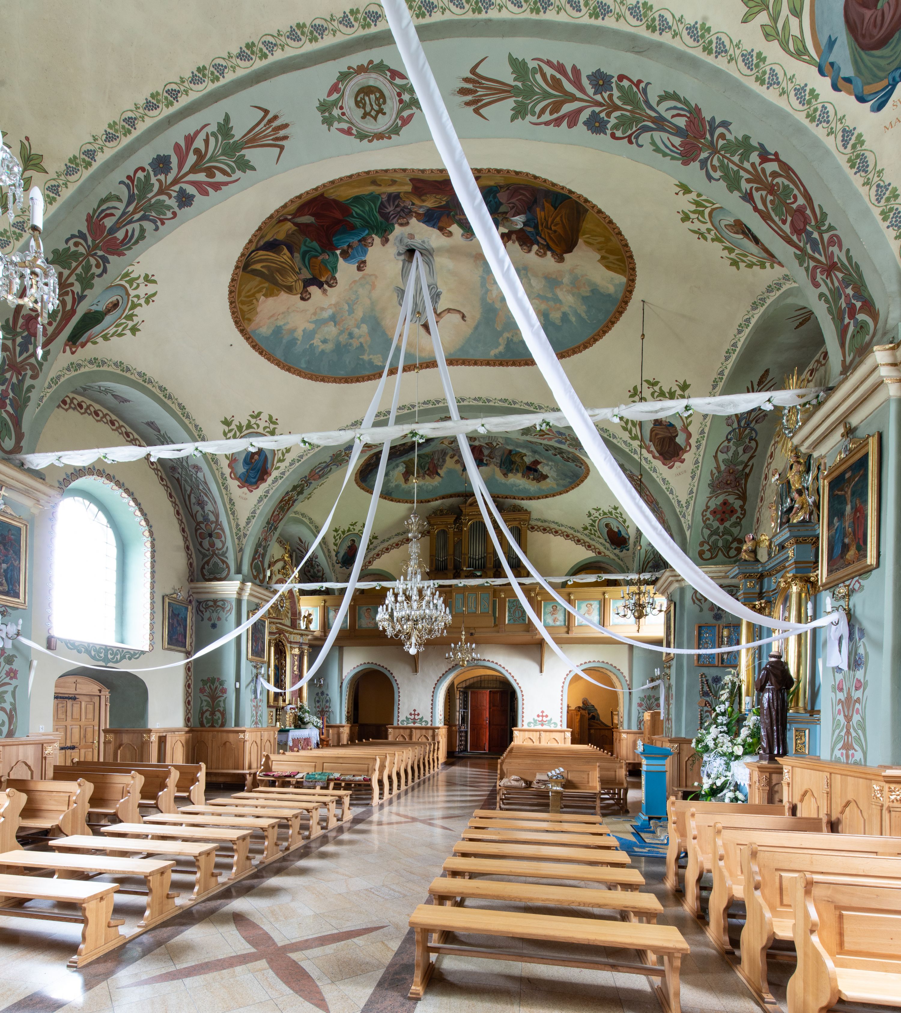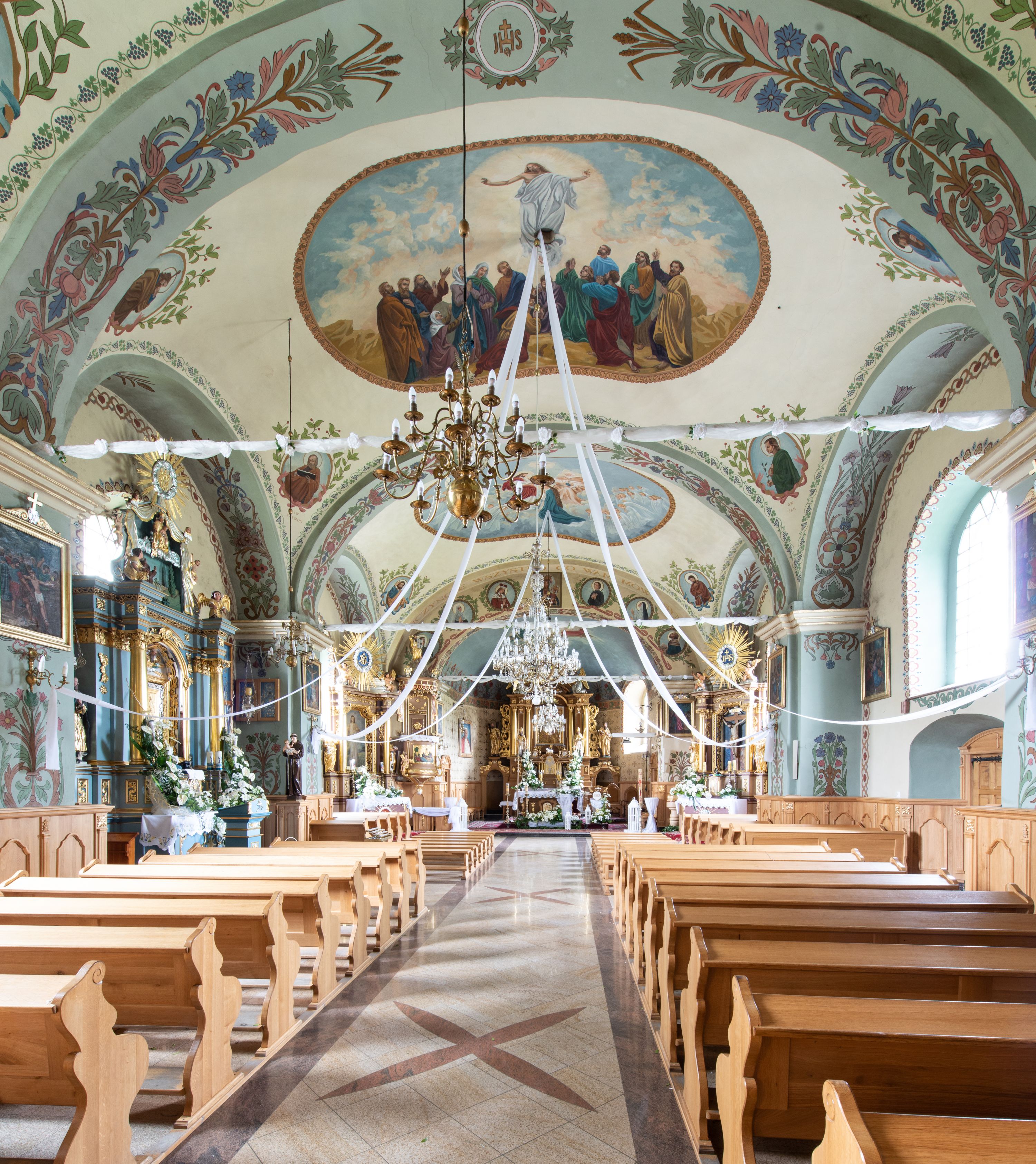 Świątynia jest orientowana, murowana, jednonawowa z węższym i krótkim prezbiterium, zamkniętym półkoliście oraz z wieżą na zakończeniu nawy. Do prezbiterium przylega zakrystia od północy i skarbczyk od południa. Od strony południowej dobudowana jest również niska kruchta. Wnętrze trójprzęsłowej nawy rozczłonkowane jest filarami przyściennymi wspierającymi sklepienie żagielkowe. Chór muzyczny trójarkadowy, wsparty na dwóch filarach. W ścianach korpusu nawowego znajdują się głębokie wnęki, w których umieszczone są prostokątne otwory okienne zamknięte półkolistym łukiem, po trzy od strony północnej i południowej; takie same okno znajduje się również w apsydzie od strony południowej oraz na chórze od strony zachodniej. Ponadto w apsydzie na wysokości zwieńczenia ołtarza głównego umieszczone jest małe, okrągłe okno. W kruchcie, skarbczyku i zakrystii okna są prostokątne. Drzwi główne dwuskrzydłowe, drewniane z metalowymi okuciami, zabezpieczone od wewnątrz dwiema żelaznymi zaporami umocowanymi w murze. Podobne drzwi znajdują się od strony południowej z kruchty.