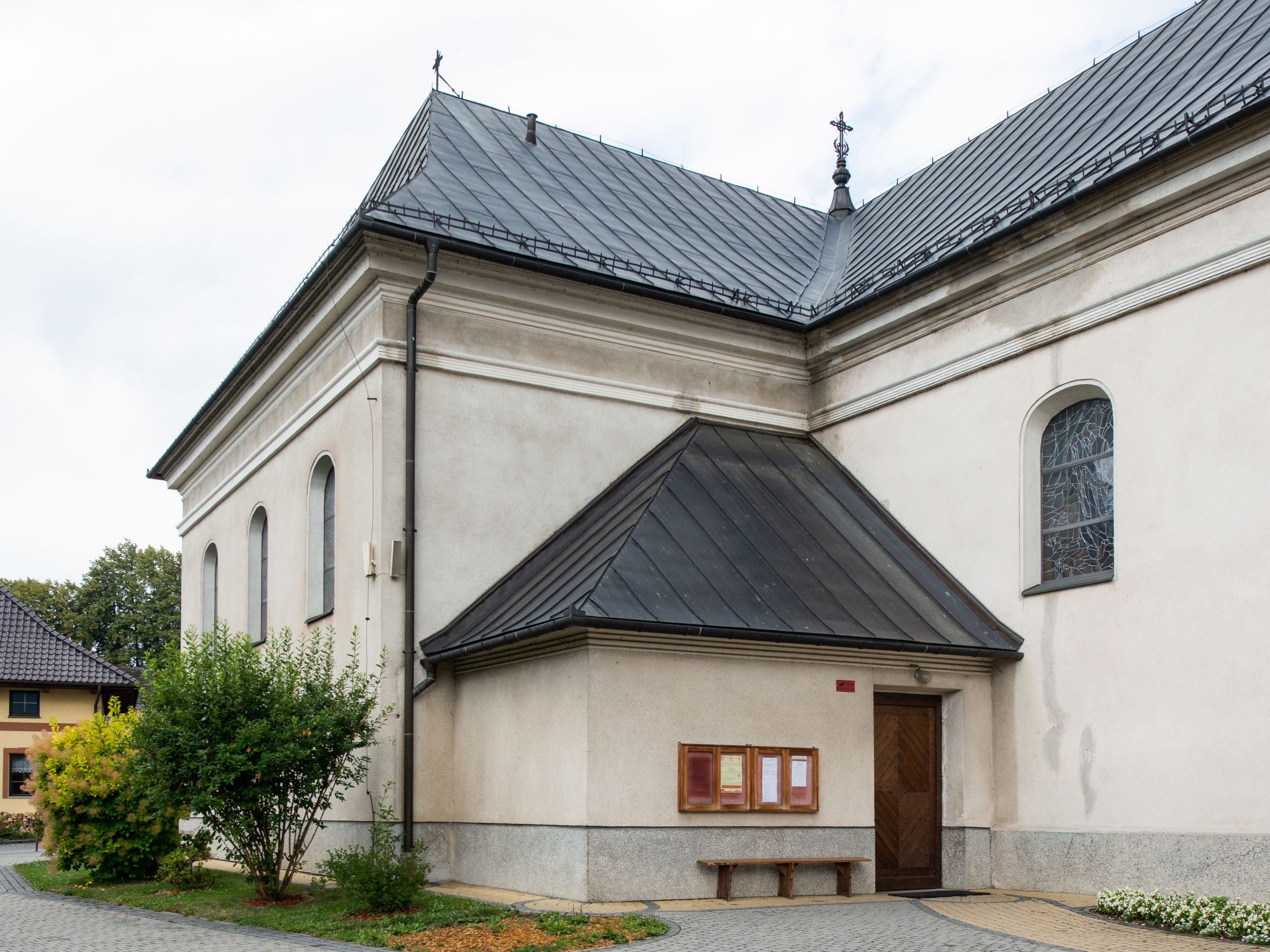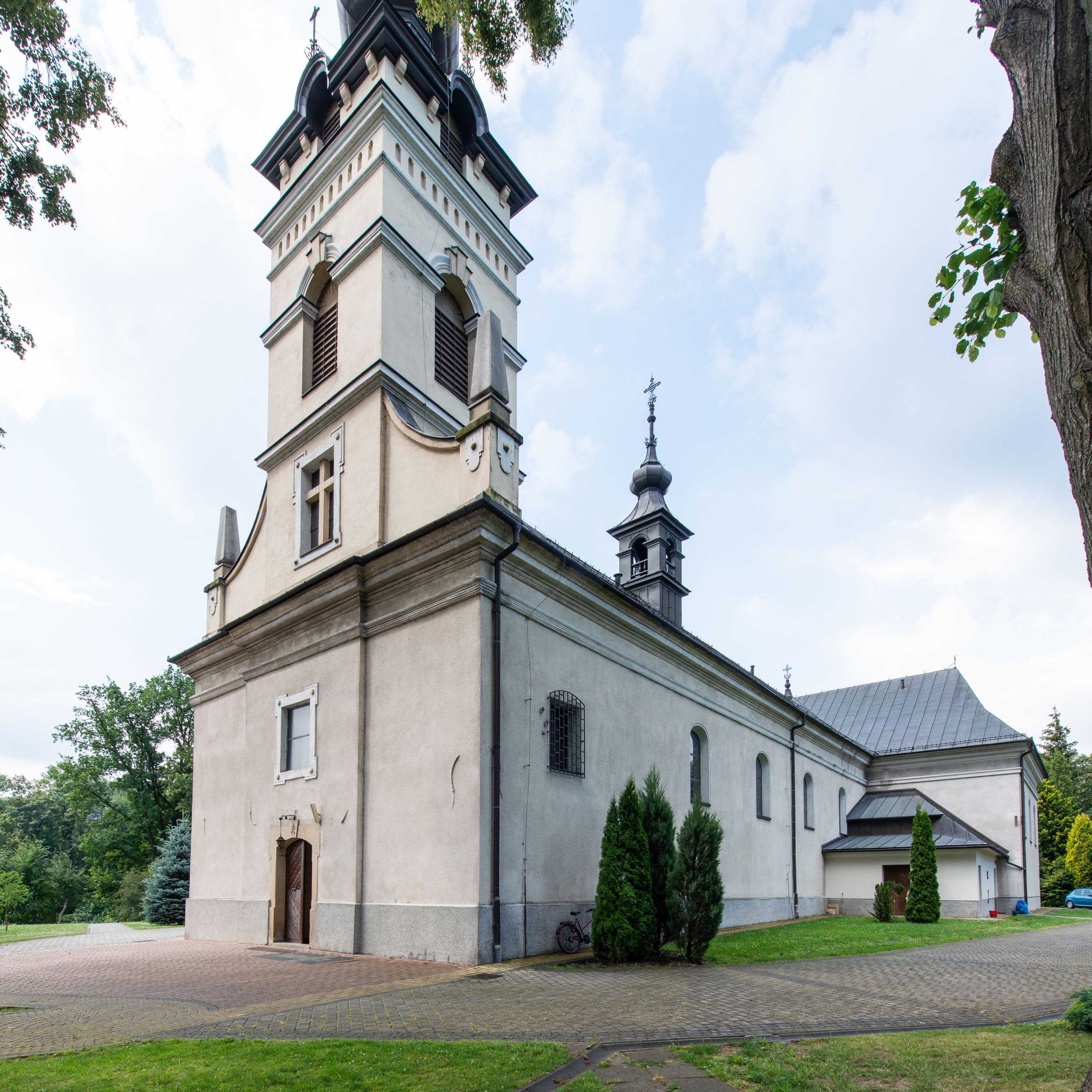 Kościół usytuowany jest w centrum miejscowości. Na plac kościelny prowadzi główne wejście od strony zachodniej oraz dwa mniejsze od strony północnej i południowej. Świątynia założona jest na planie krzyża łacińskiego, prezbiterium skierowane na zachód, równe szerokości nawy. Do korpusu kościoła przylega od strony zachodniej niższa i węższa zakrystia, a od strony południowej kruchta. Główne wejście do kościoła znajduje się od strony wschodniej przez czworoboczny przedsionek, nad którym wznosi się wieża. Portal z piaskowca, prosty o uszatych górnych narożach, w kluczu insygnia papieskie. W przedsionku od północnej strony zbudowane wewnętrzne, dwubiegowe schody kamienne prowadzące pierwotnie na chór muzyczny i wyższe piętra wieży. Na piętrze wejście do dwóch pomieszczeń usytuowanych na zapleczu chóru. Pomieszczenia te są nakryte stropami, oświetlone od południa i od wschodu. W pomieszczeniu południowym znajduje się kamienny próg z datą „1767”. Do przedsionka od strony południowej przylega kaplica Matki Boskiej Różańcowej założona na rzucie kwadratu, nakryta płaskim, malowanym stropem, wejście do kaplicy od strony północnej.