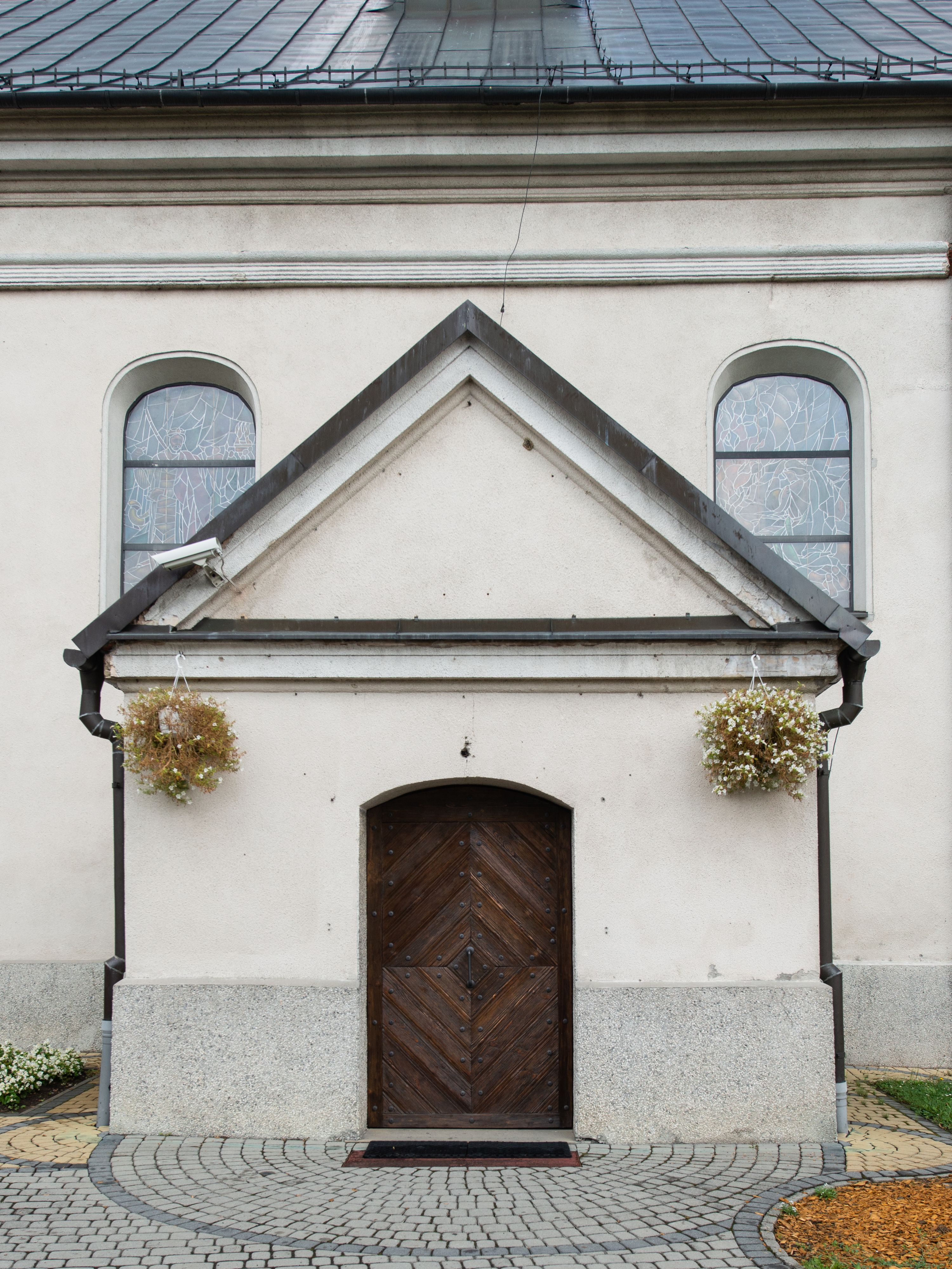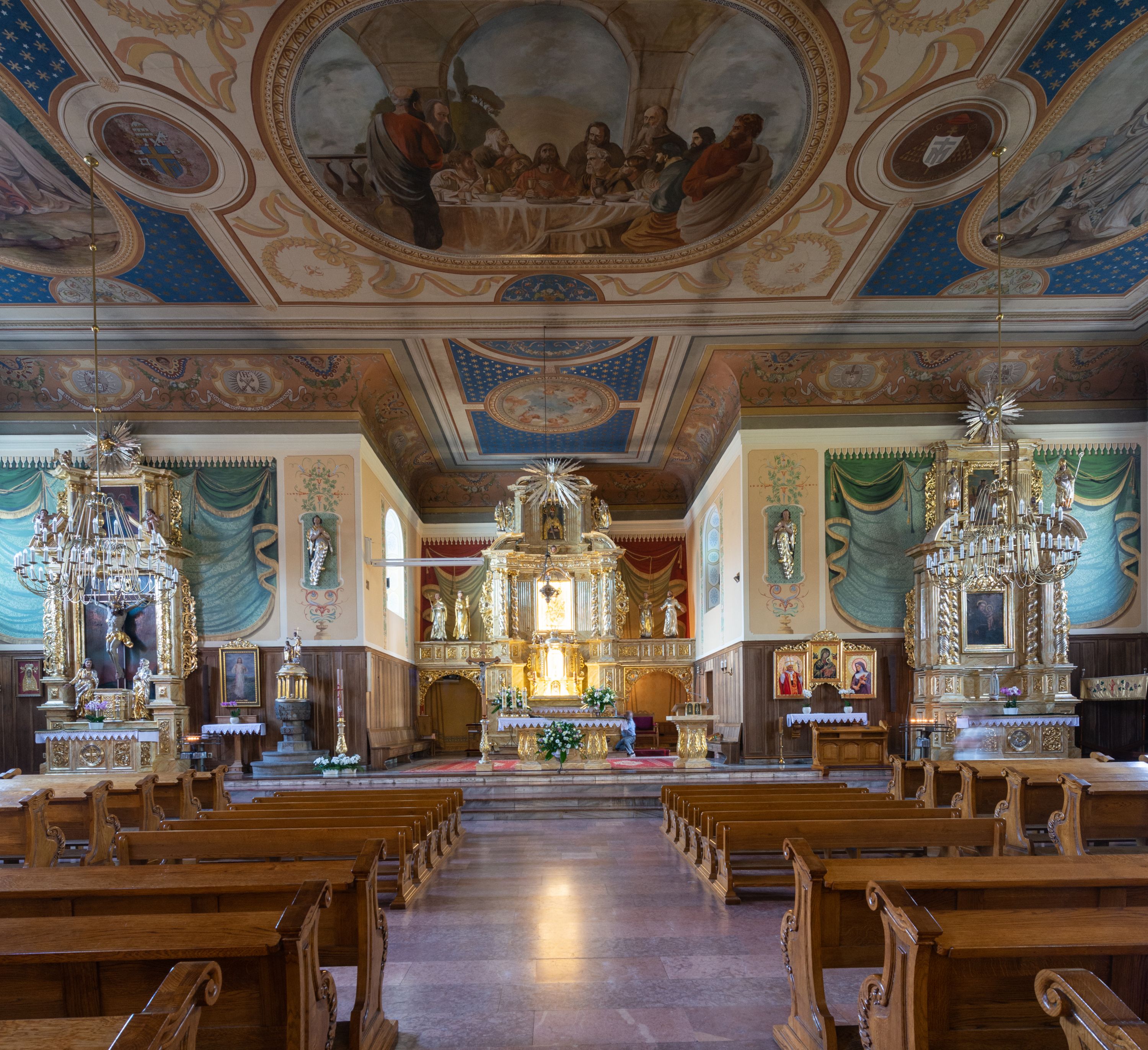 Zakrystia jednoizbowa, dwa okna prostokątne w ścianie północno-zachodniej oraz dwoje drzwi, jedne do prezbiterium, drugie wejściowe w ścianie południowej. Wewnątrz zakrystii wąskie schody prowadzące do schowka na pięterku: jednoizbowego, oświetlonego od południa i od zachodu. Zakrystia i schowek nakryte płaskimi sufitami. Kruchta przybudowana do południowej ściany kościoła założona na rzucie kwadratu, o dwóch wejściach: z nawy i od zewnątrz od strony południowej. Wnętrze kościoła bez zaznaczonych podziałów architektonicznych, w dolnej części drewniana boazeria, w górnej iluzjonistyczna polichromia imitująca pilastry wspierające strop. Chór muzyczny wsparty na dwóch słupach.