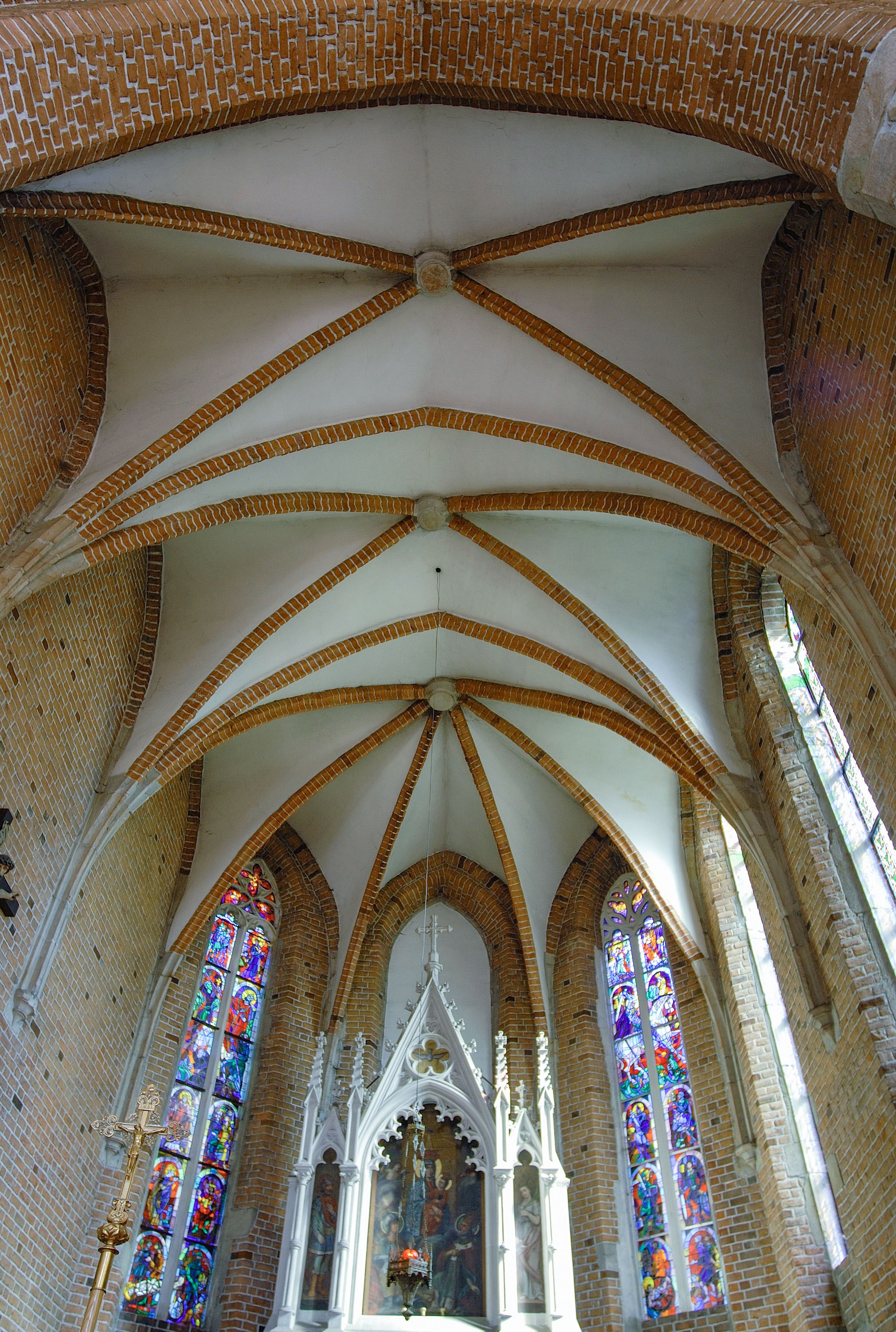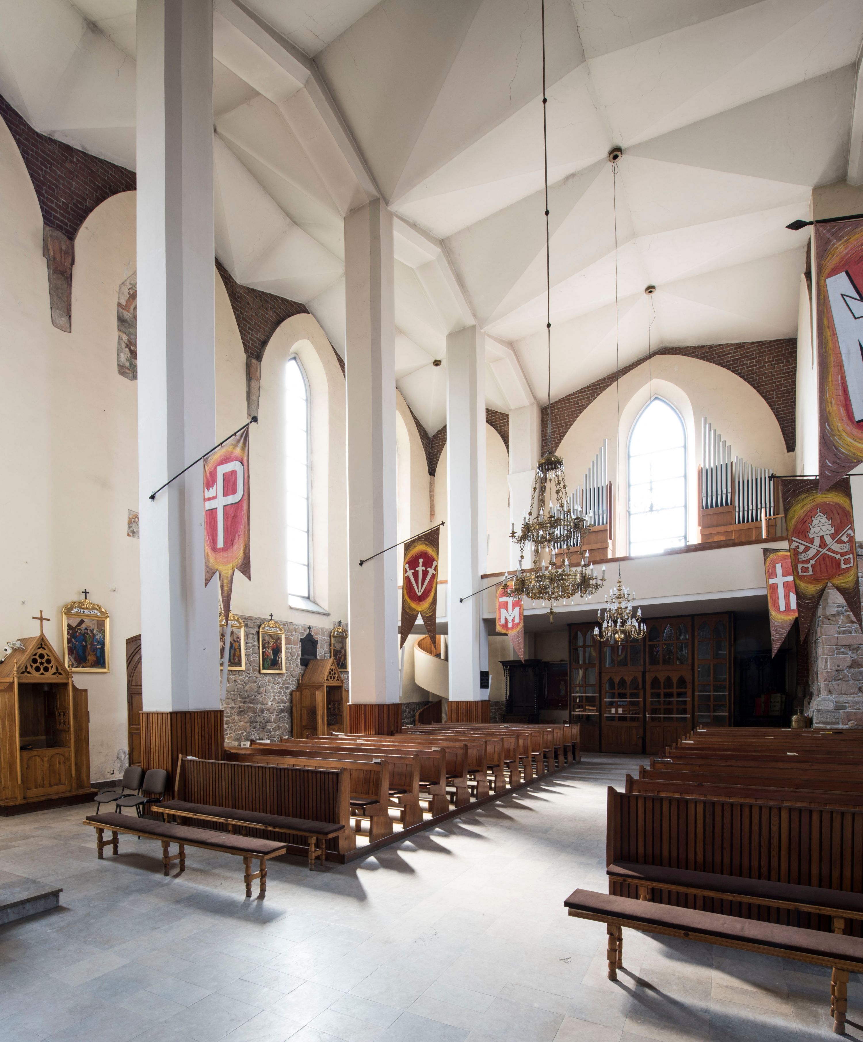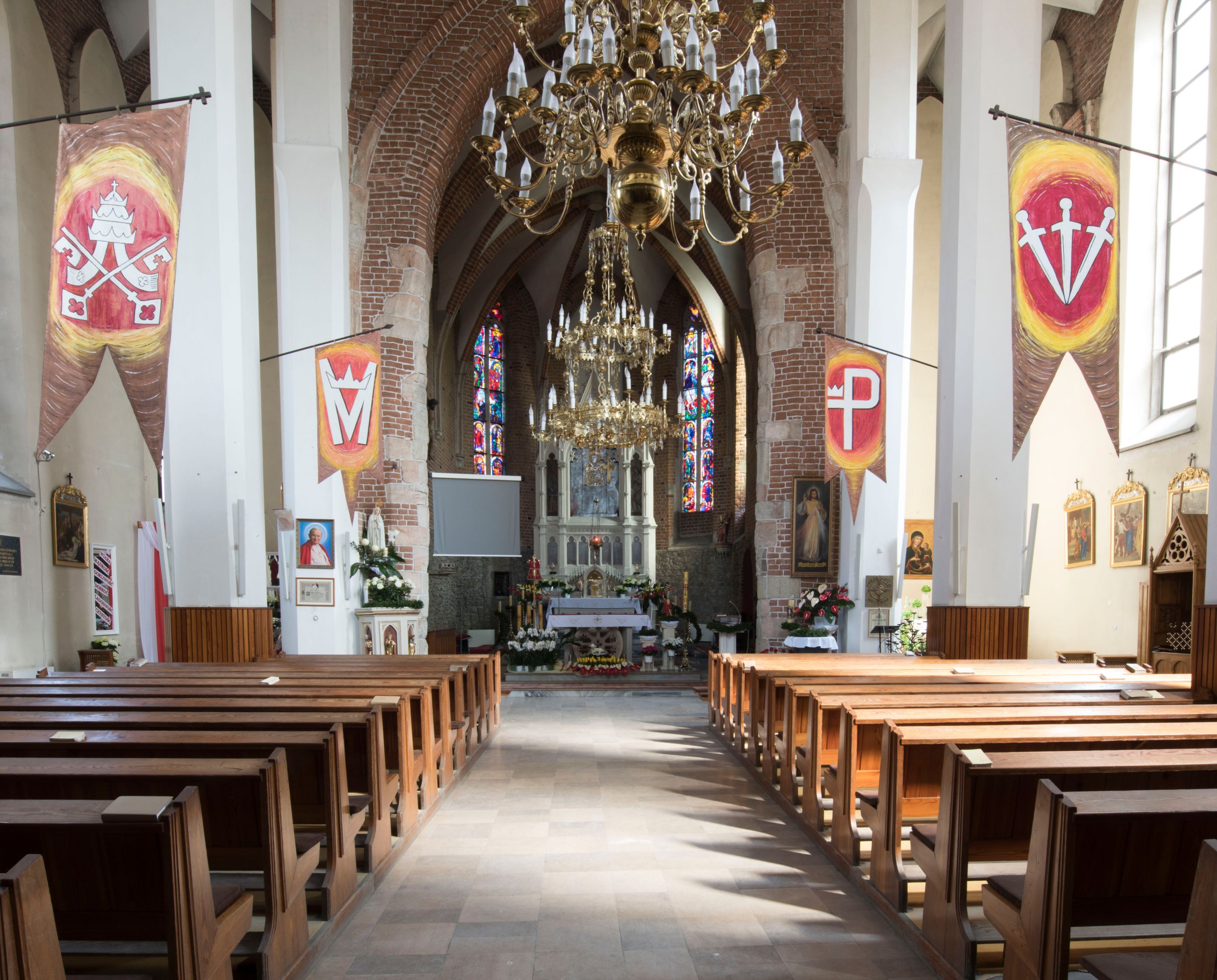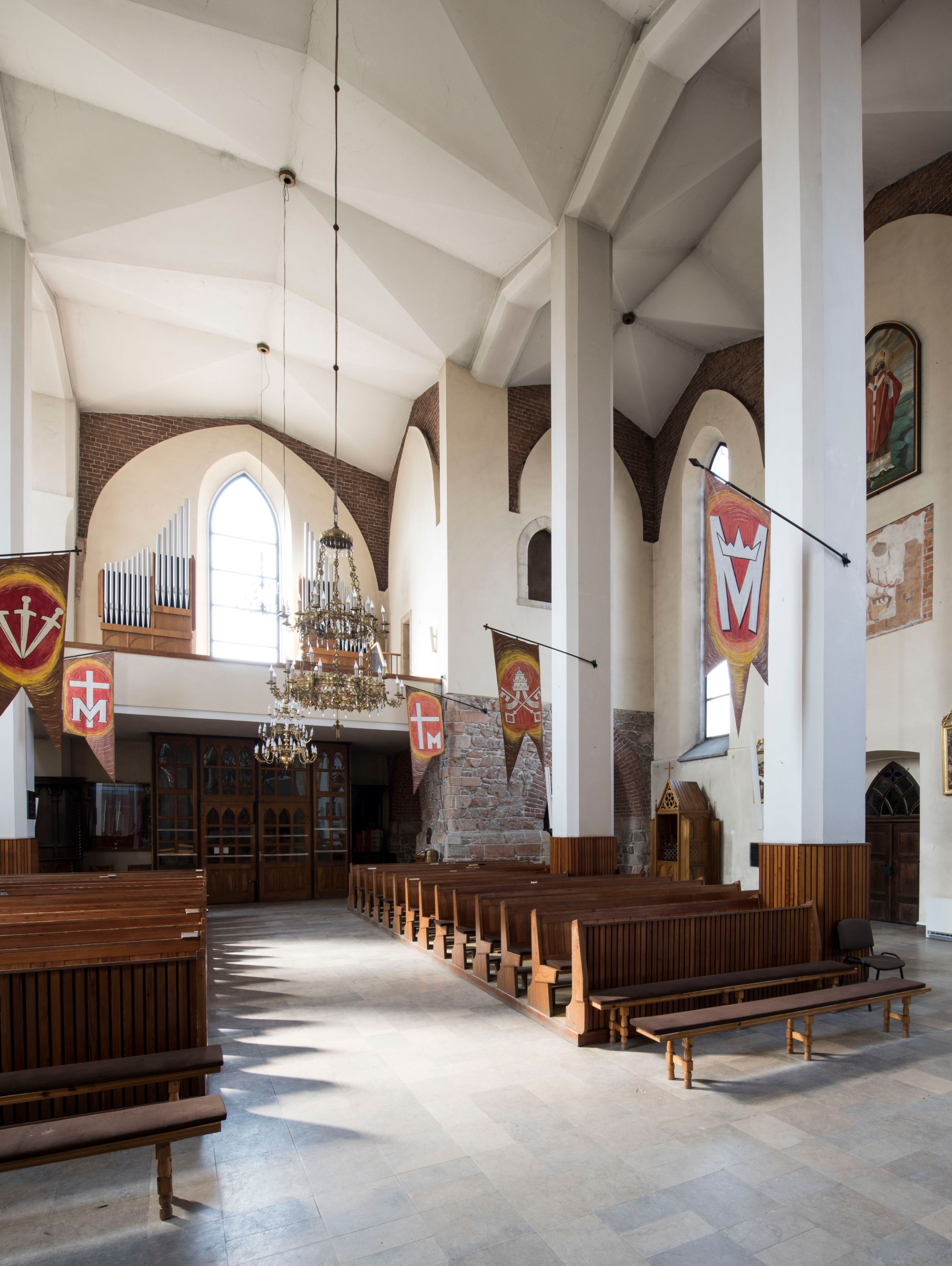 Gotycki kościół, trójnawowy, halowy, z zamkniętym wielobocznie prezbiterium i z wieżą w narożu północno-zachodnim korpusu.