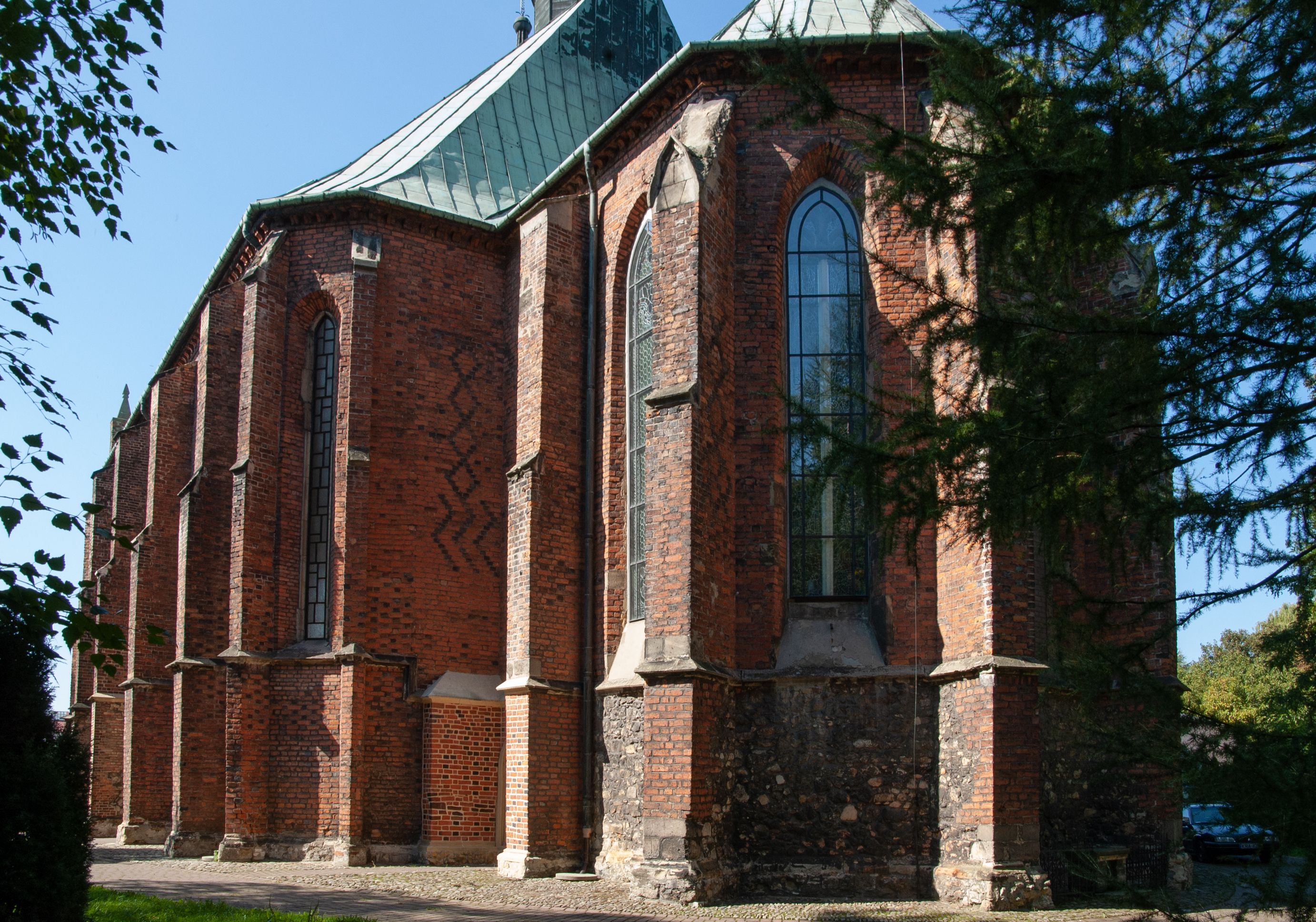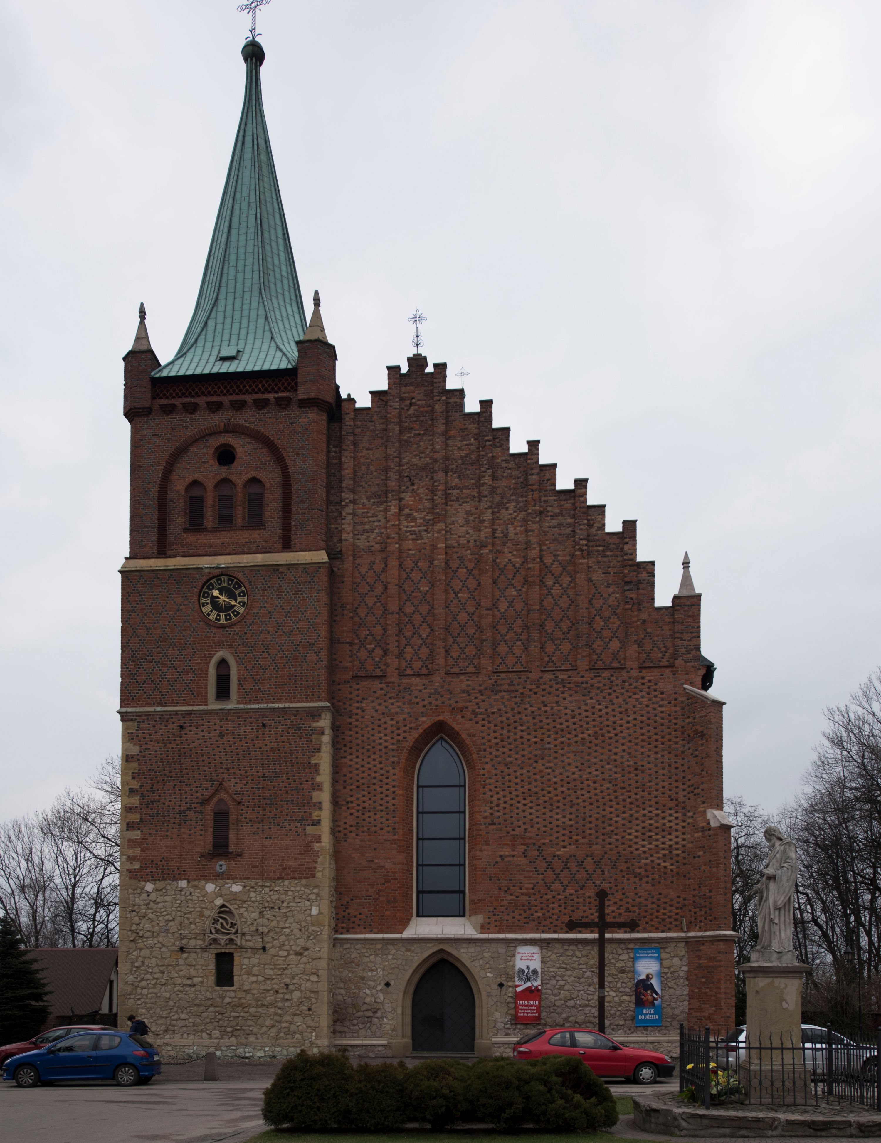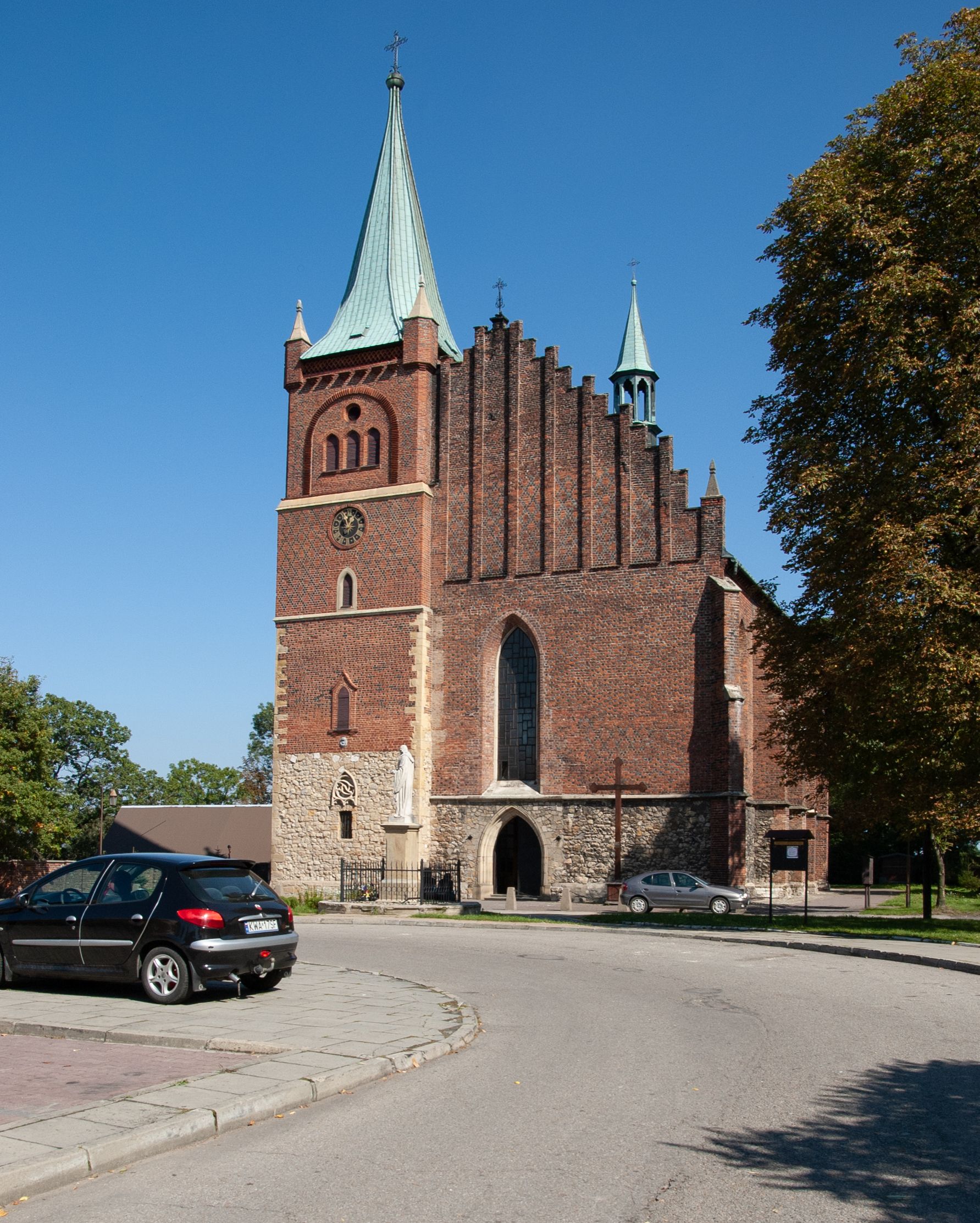 Wzniesiony około 1400 roku, z kamienia łamanego, ciosu i cegły oraz ciosu do detalu architektonicznego. Położony na wschód od rynku, w pobliżu zamku. Gotycki, wielokrotnie przekształcany (m.in. 1766, 1836 według projektu F.M. Lanciego). Orientowany, trójnawowy, czteroprzęsłowy, halowy, z dwuprzęsłowym zamkniętym wielobocznie prezbiterium. Przy prezbiterium od północy zakrystia piętrowa (nadbudowana 1915 r.). W północno-zachodnim narożu korpusu wieża na rzucie kwadratu, pięciokondygnacyjna , zwieńczona hełmem z wieżyczkami. Przy nawach bocznych od wschodu poligonalne kaplice, przy korpusie od zachodu i północy kruchty. Arkada tęczy ostrołukowa. W prezbiterium sklepienie krzyżowo-żebrowe na wspornikach. W korpusie zachowane nasady gotyckich sklepień żebrowych, obecnie żelbetowy strop (około 1960 r.). Trzy portale kamienne: ostrołukowy i zamknięte łukiem w ośli grzbiet. Mury opięte przyporami, szczyt zachodni schodkowy ze sterczynami; dachy dwuspadowe.
