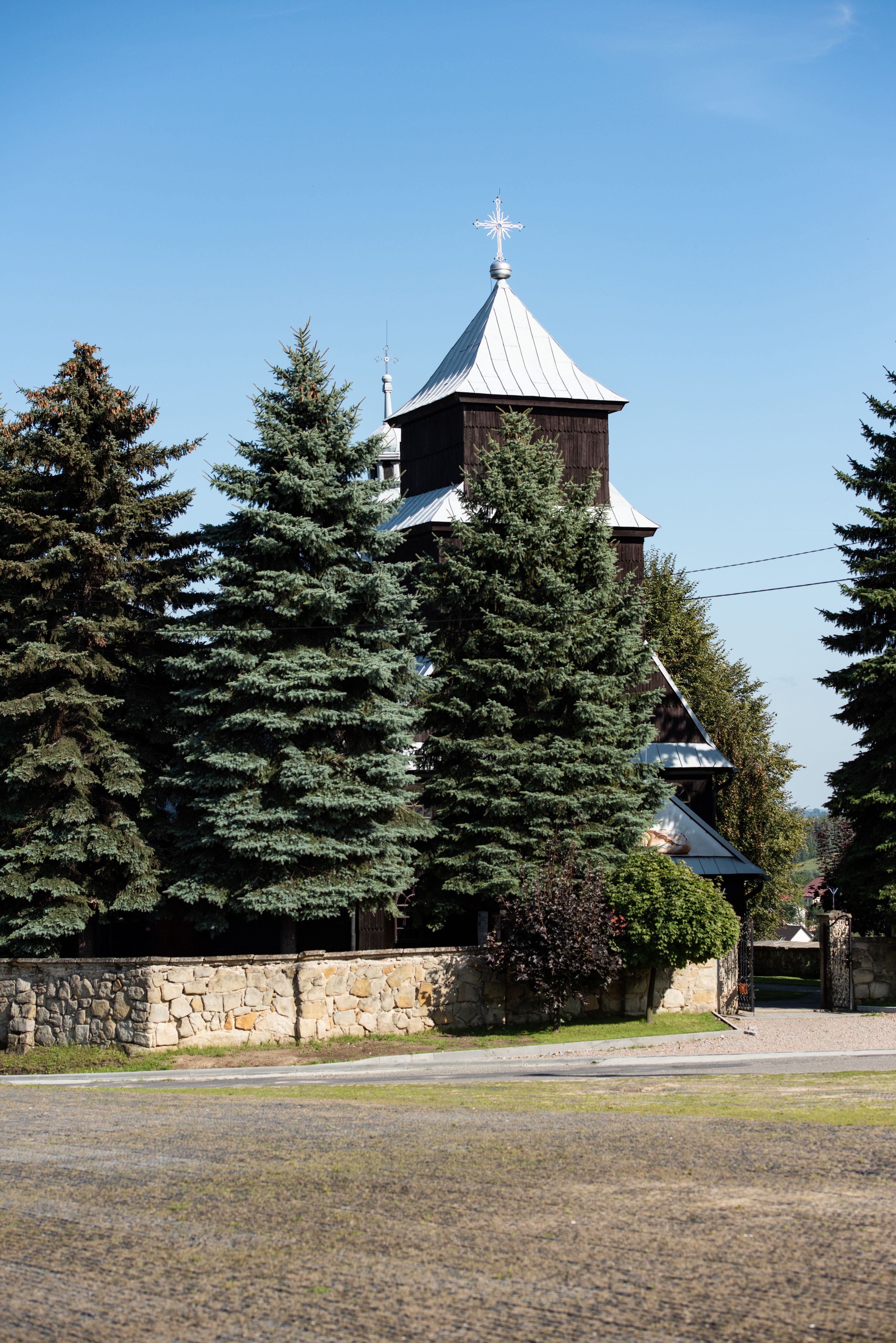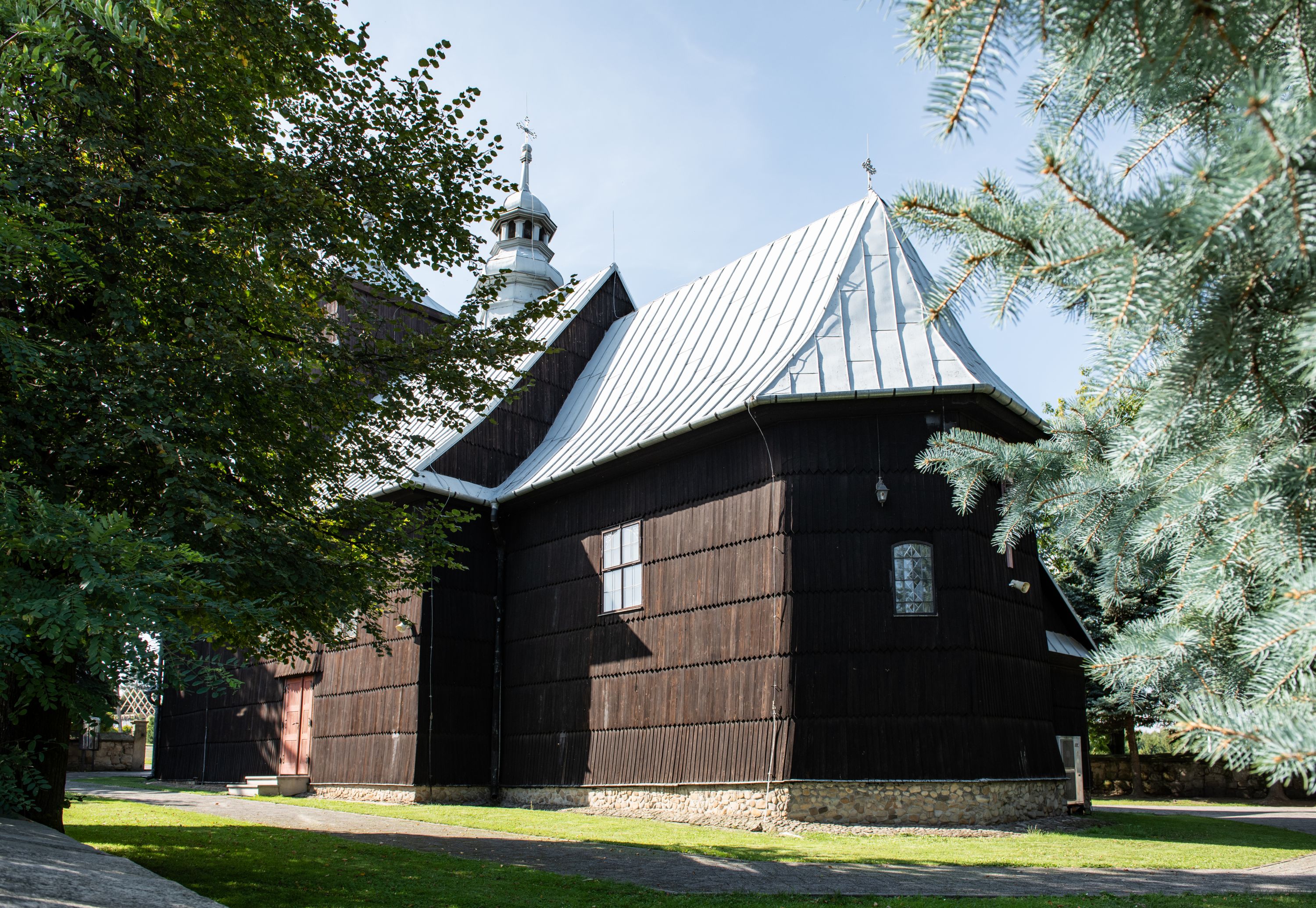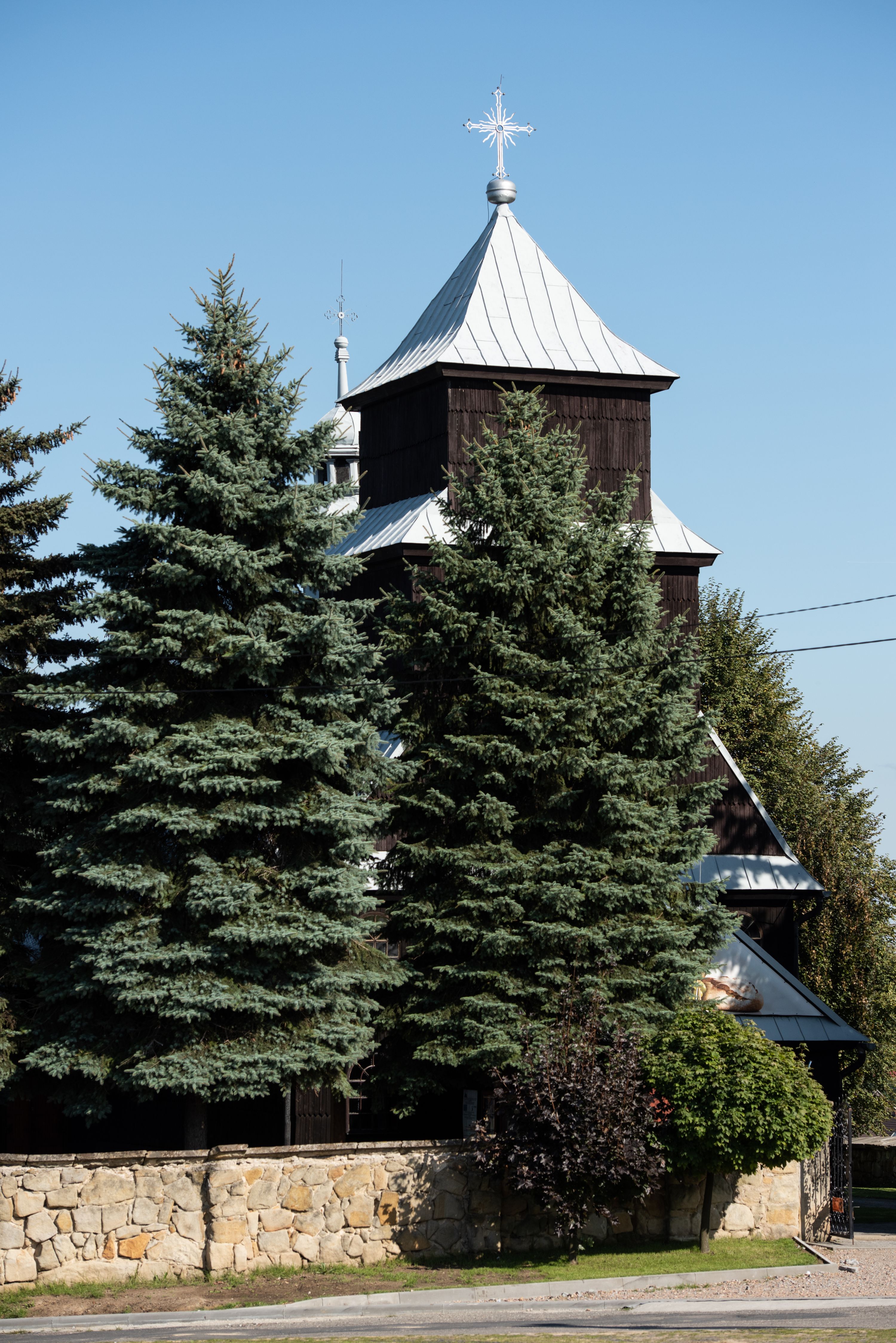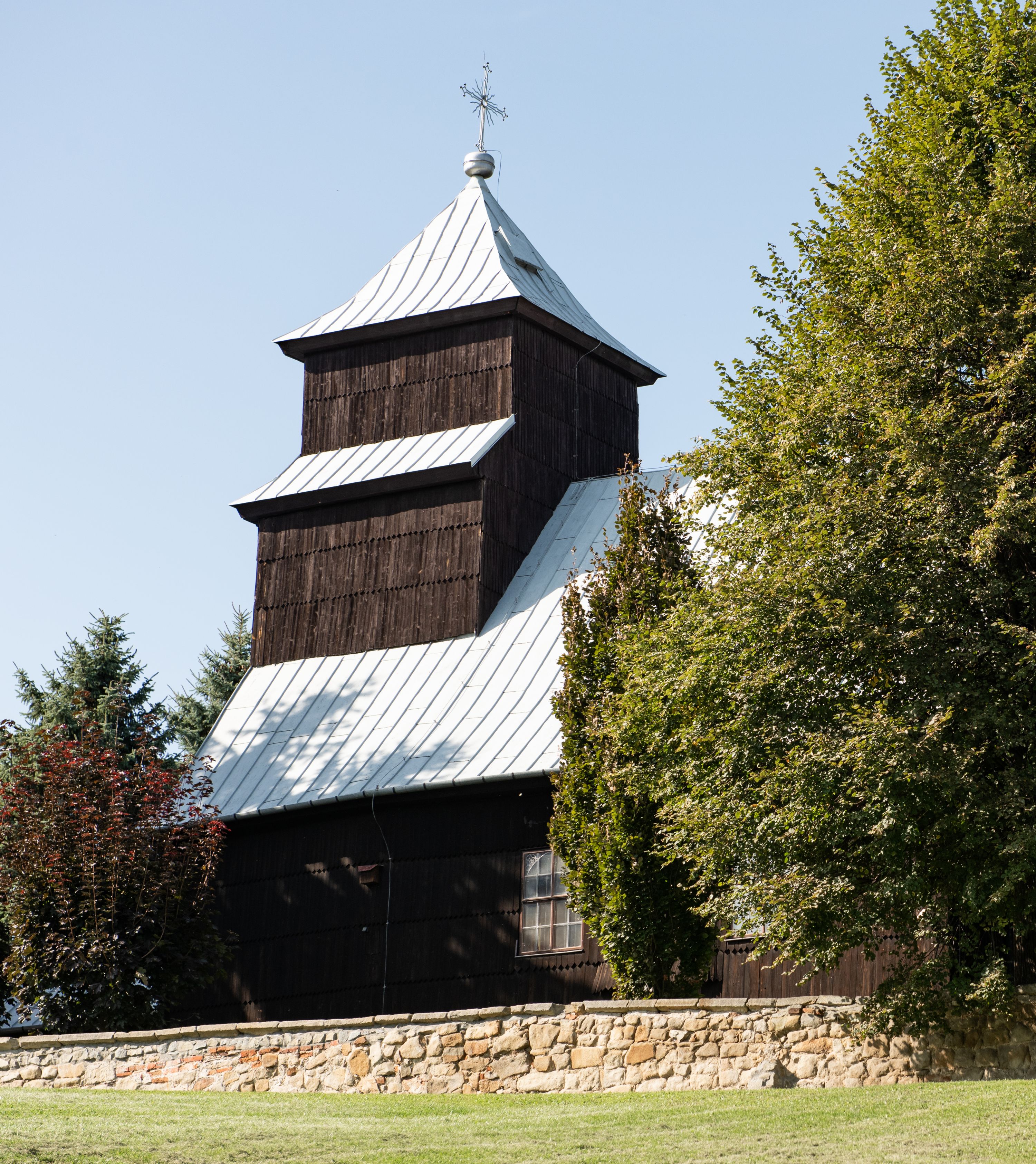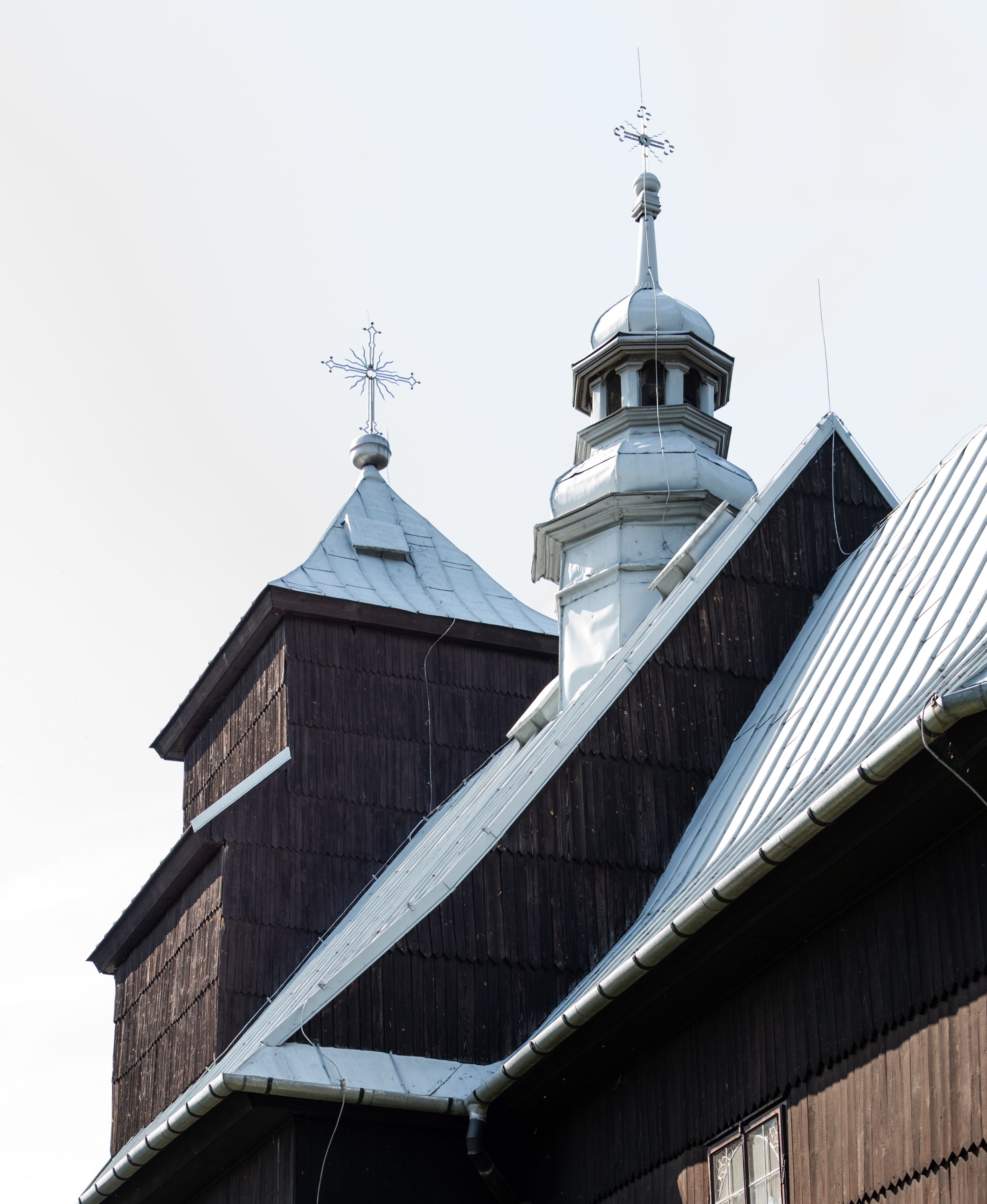 Kościół nakryty dachami dwuspadowymi, o pokryciu blaszanym, wyższym nad nawą, niższym nad prezbiterium. W połowie długości dachu, nad nawą, wbudowana wieżyczka na sygnaturkę, na ośmiobocznym, obitym blachą trzonie, z latarnią zwieńczoną niewielkim hełmem. Wieża nakryta czterospadowym daszkiem namiotowym, zwieńczona kulistą puszką i krzyżem. Kruchta nakryta osobnym daszkiem dwuspadowym, półszczytowym, zakrystia niższym dachem pulpitowym.