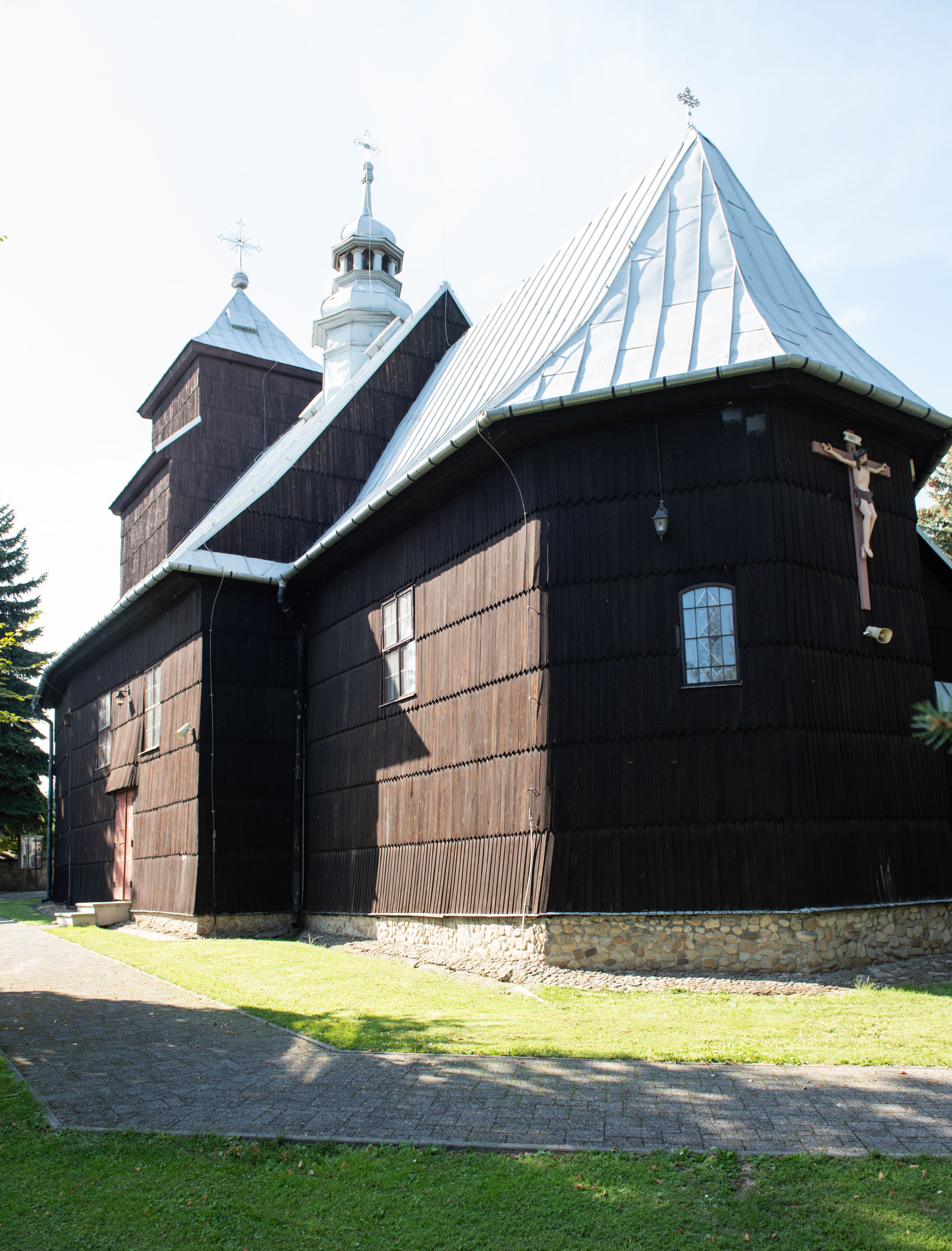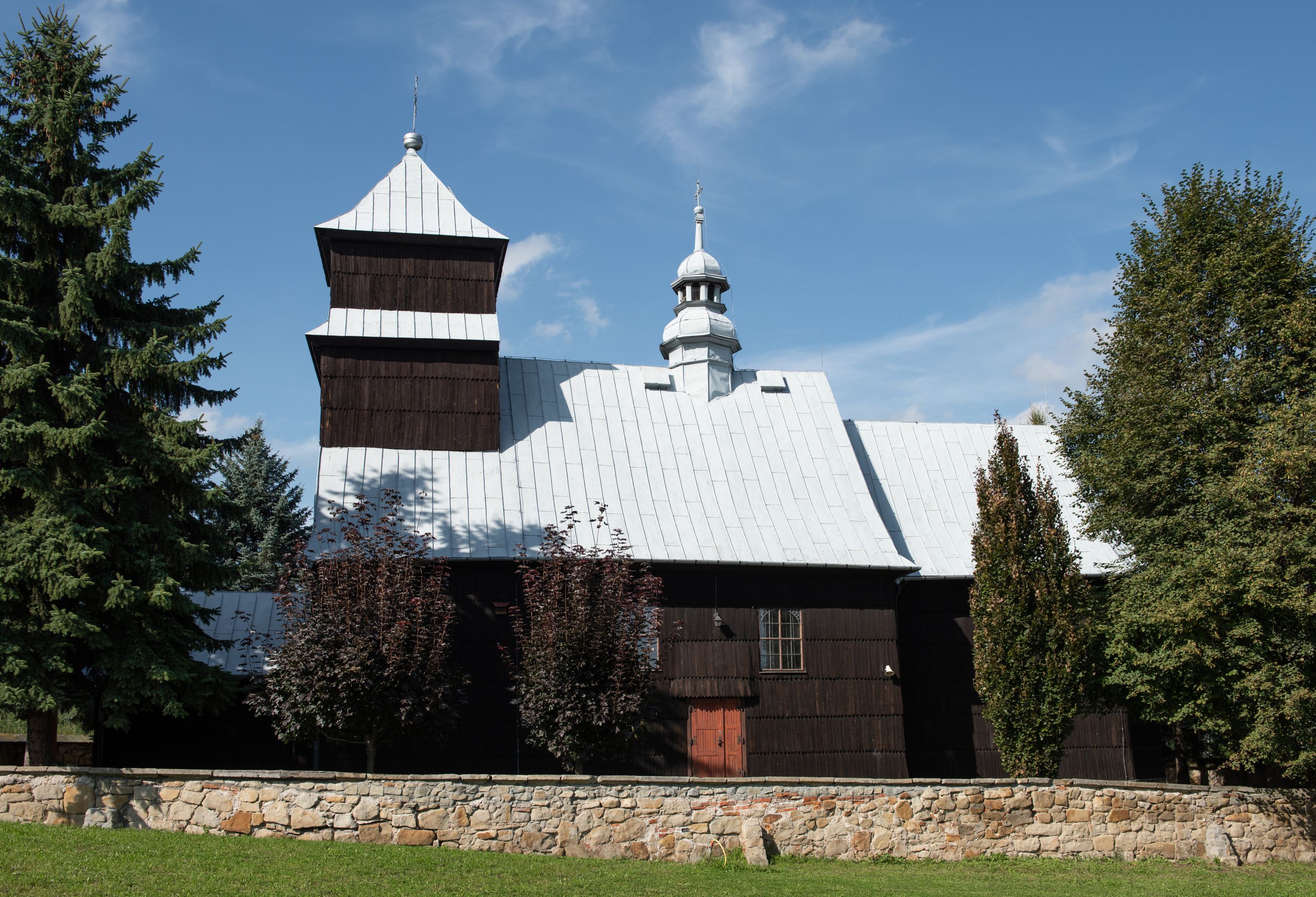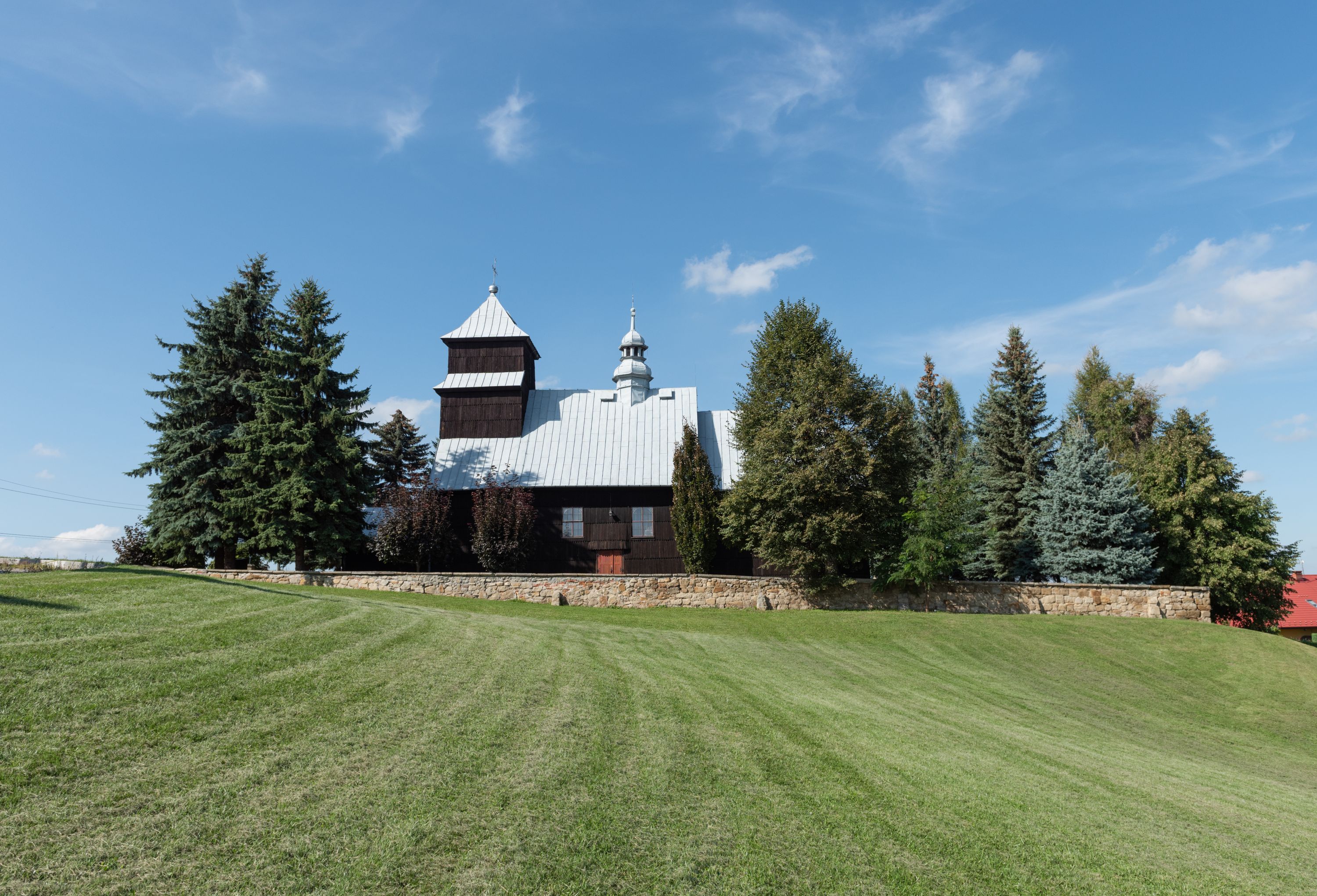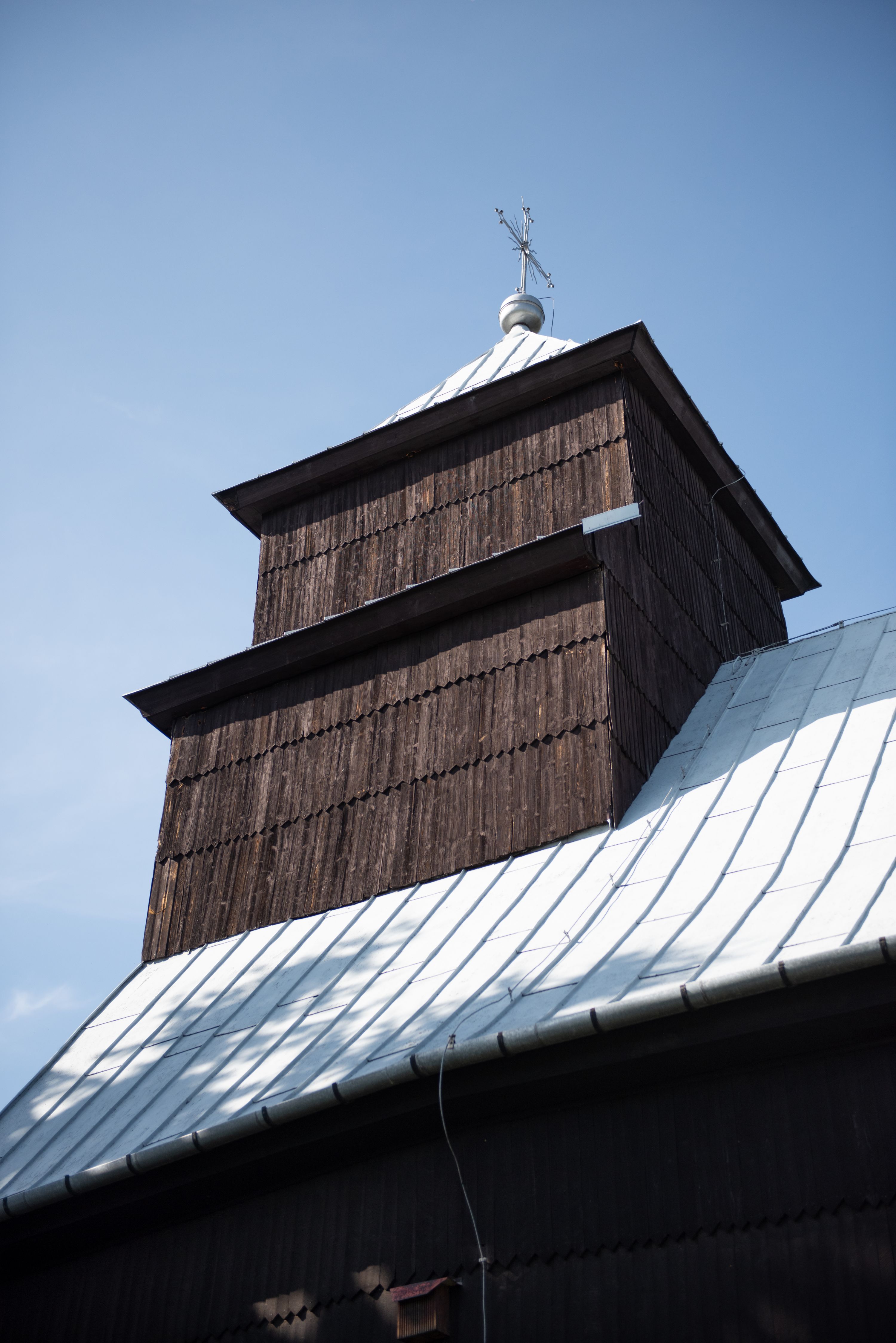 Kościół nakryty dachami dwuspadowymi, o pokryciu blaszanym, wyższym nad nawą, niższym nad prezbiterium. W połowie długości dachu, nad nawą, wbudowana wieżyczka na sygnaturkę, na ośmiobocznym, obitym blachą trzonie, z latarnią zwieńczoną niewielkim hełmem. Wieża nakryta czterospadowym daszkiem namiotowym, zwieńczona kulistą puszką i krzyżem. Kruchta nakryta osobnym daszkiem dwuspadowym, półszczytowym, zakrystia niższym dachem pulpitowym.