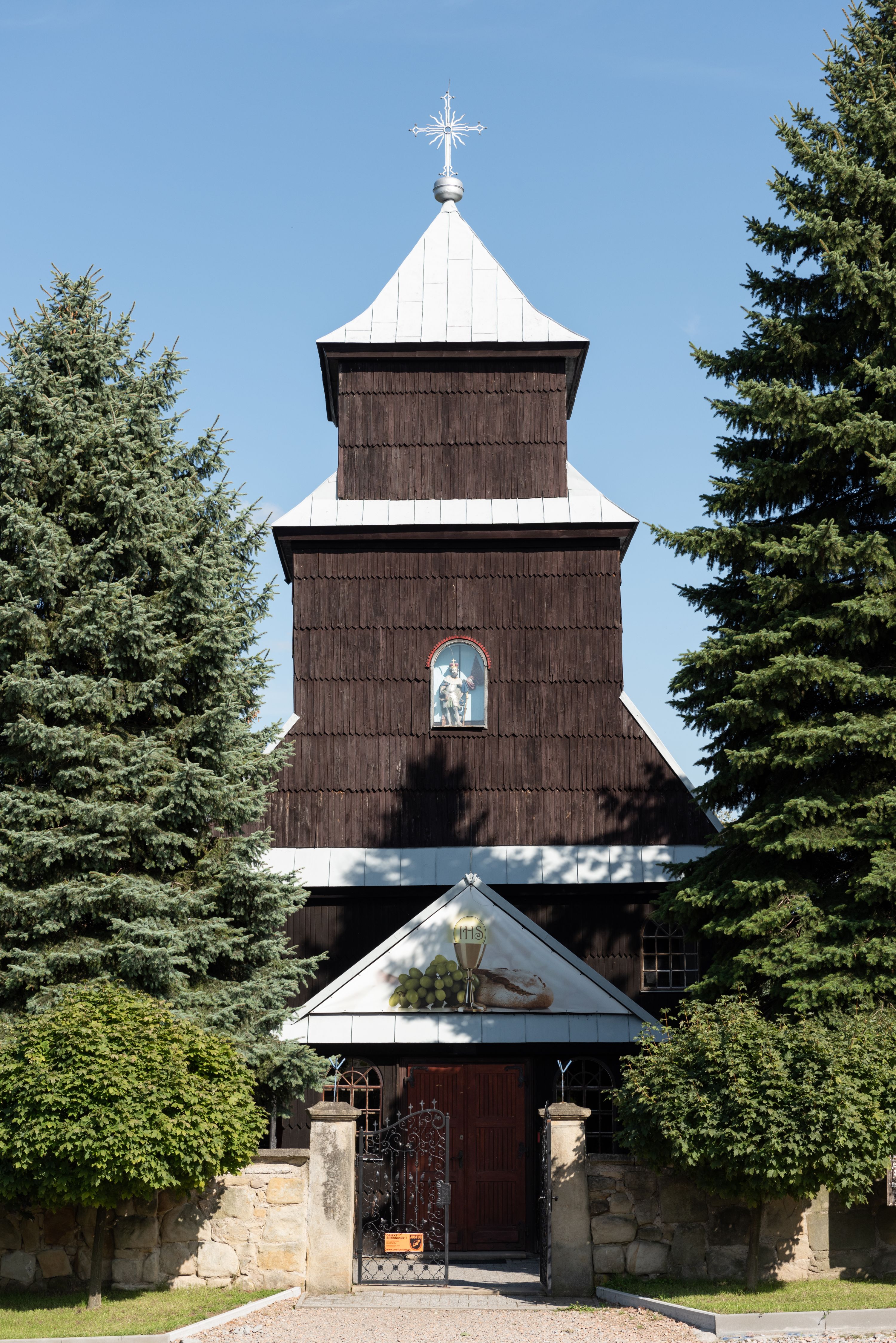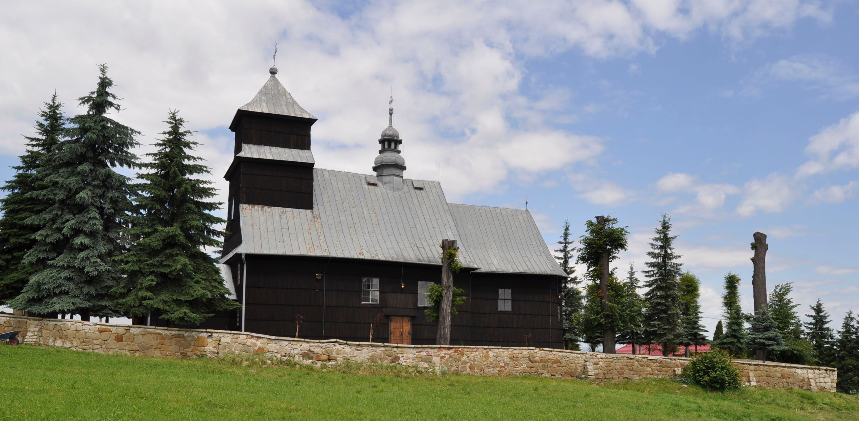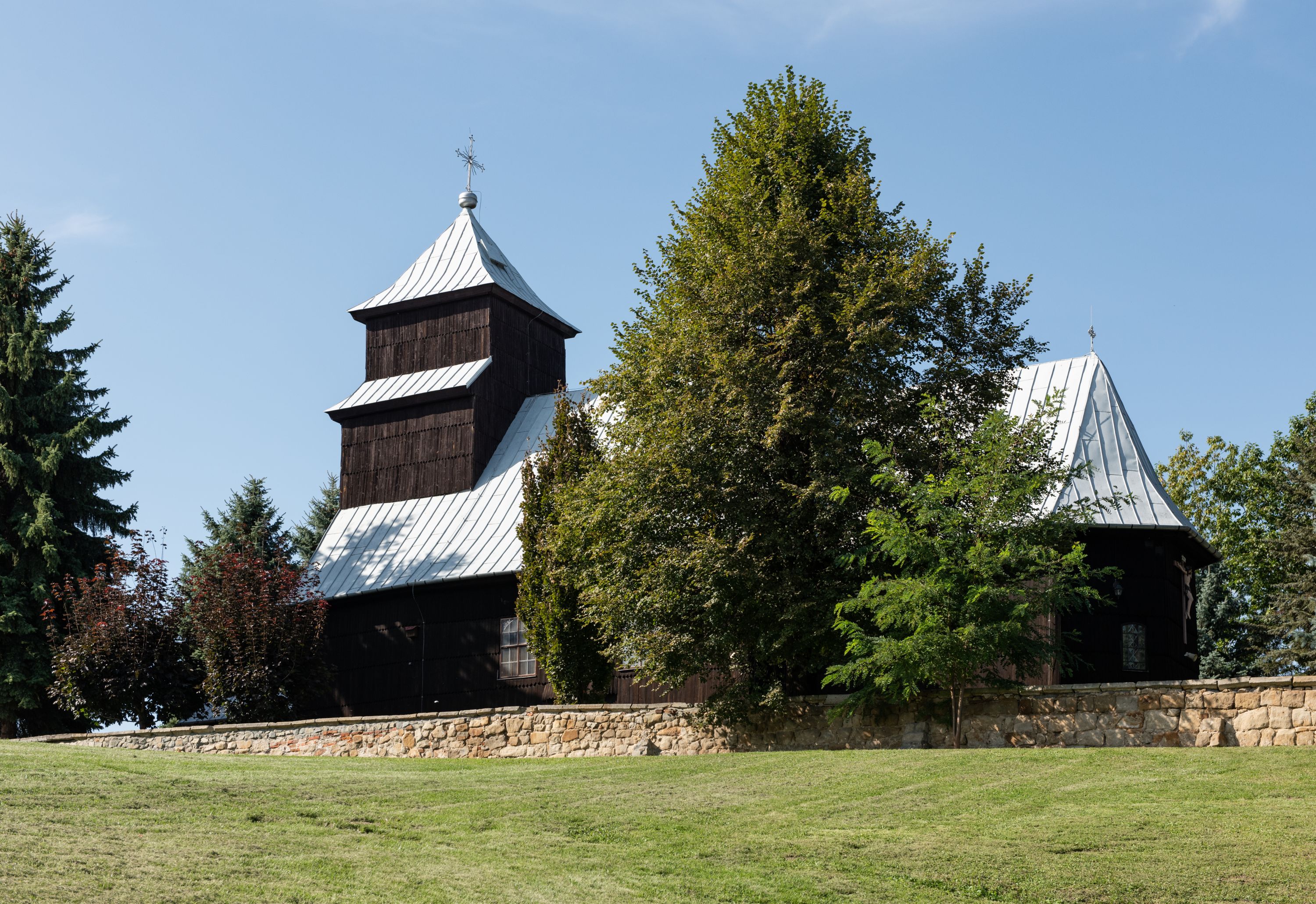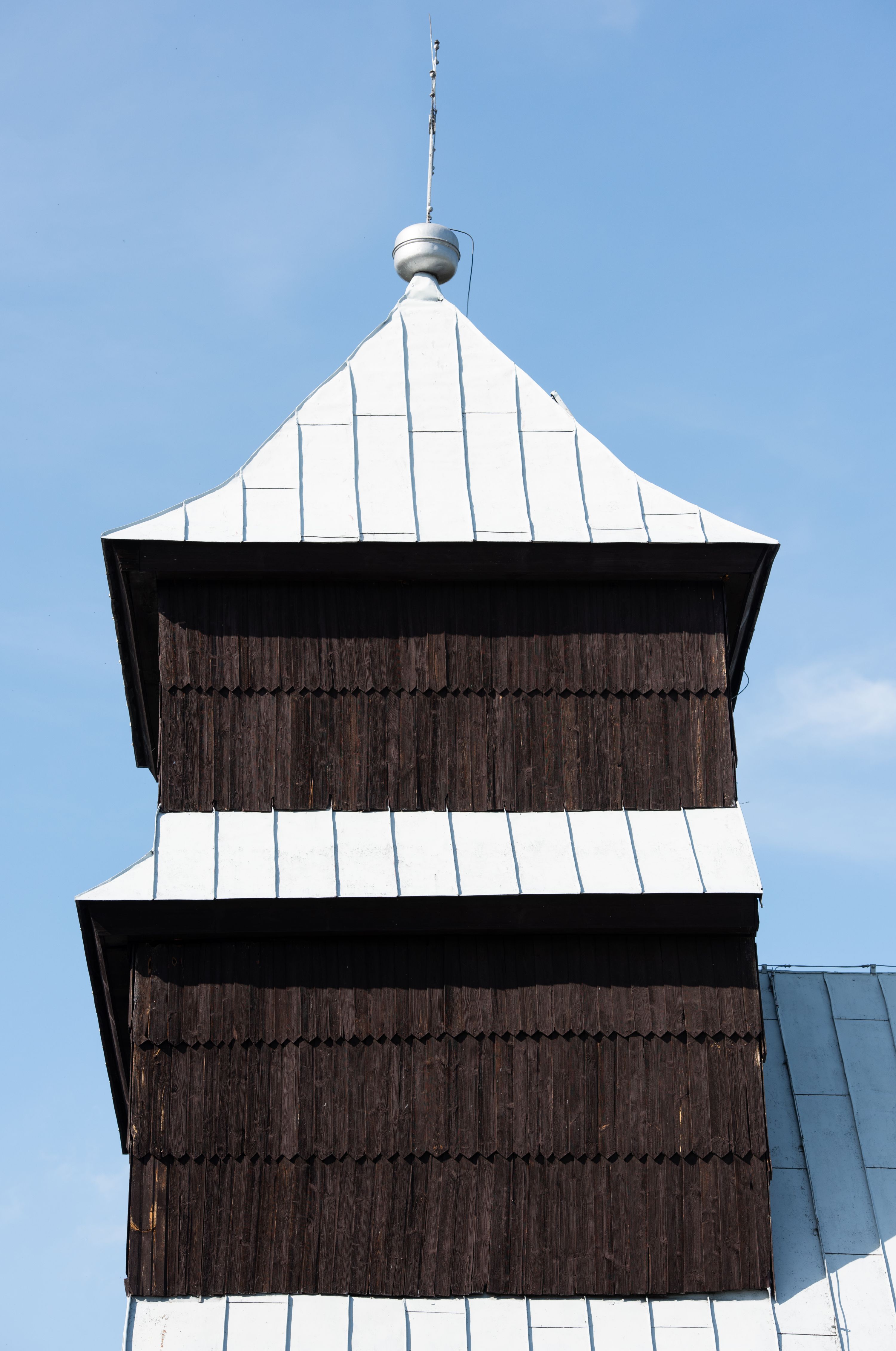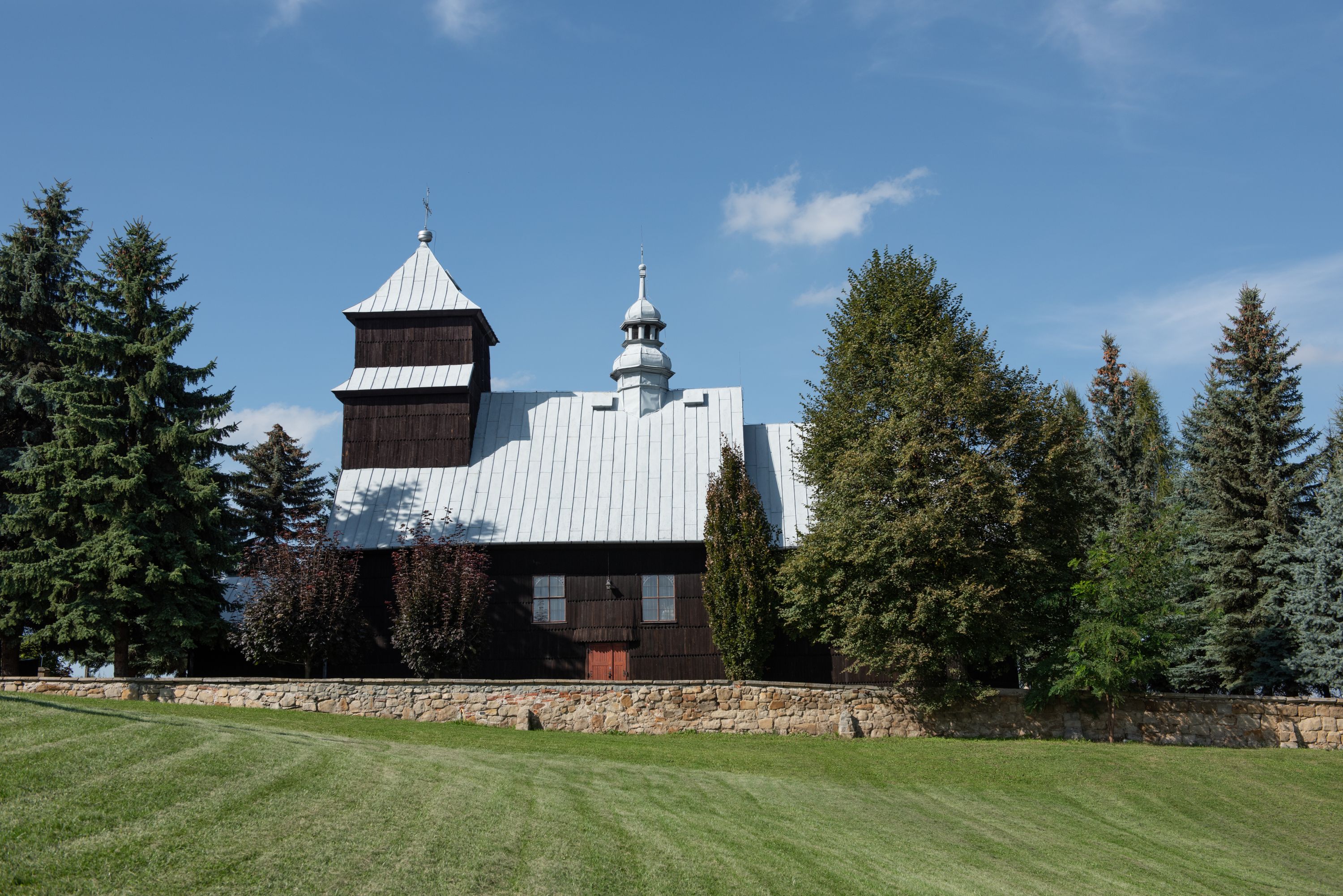 Kościół nakryty dachami dwuspadowymi, o pokryciu blaszanym, wyższym nad nawą, niższym nad prezbiterium. W połowie długości dachu, nad nawą, wbudowana wieżyczka na sygnaturkę, na ośmiobocznym, obitym blachą trzonie, z latarnią zwieńczoną niewielkim hełmem. Wieża nakryta czterospadowym daszkiem namiotowym, zwieńczona kulistą puszką i krzyżem. Kruchta nakryta osobnym daszkiem dwuspadowym, półszczytowym, zakrystia niższym dachem pulpitowym.