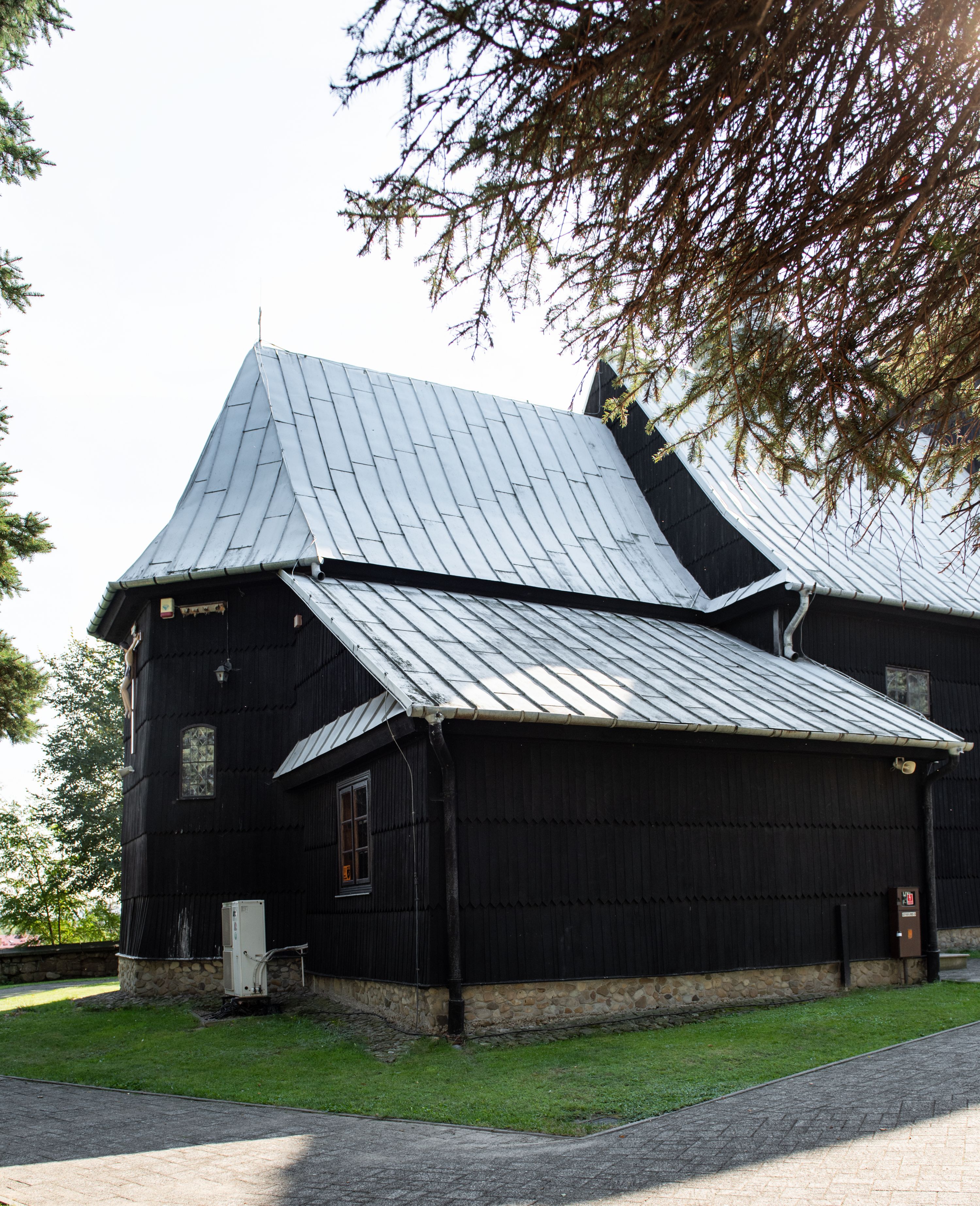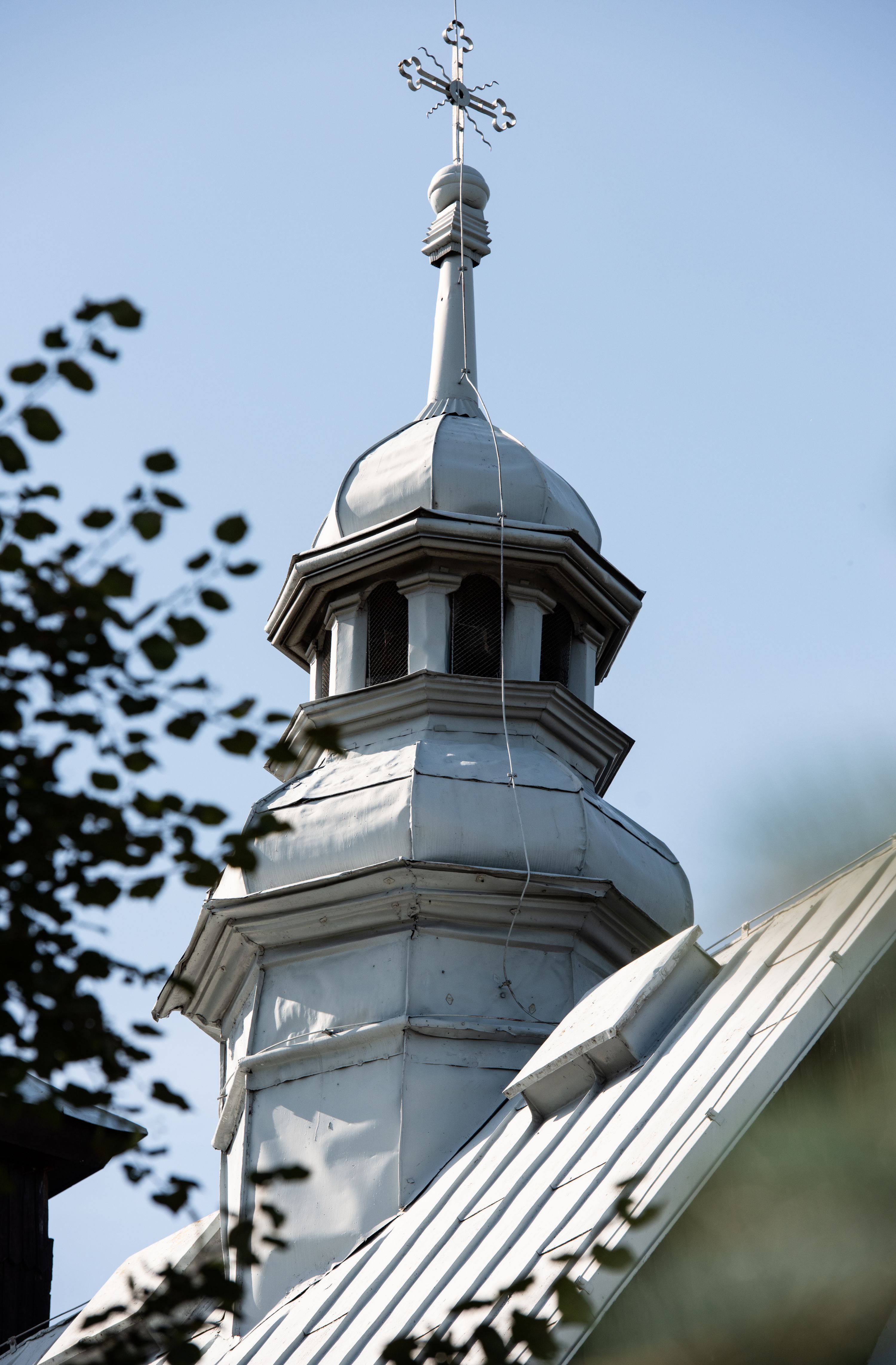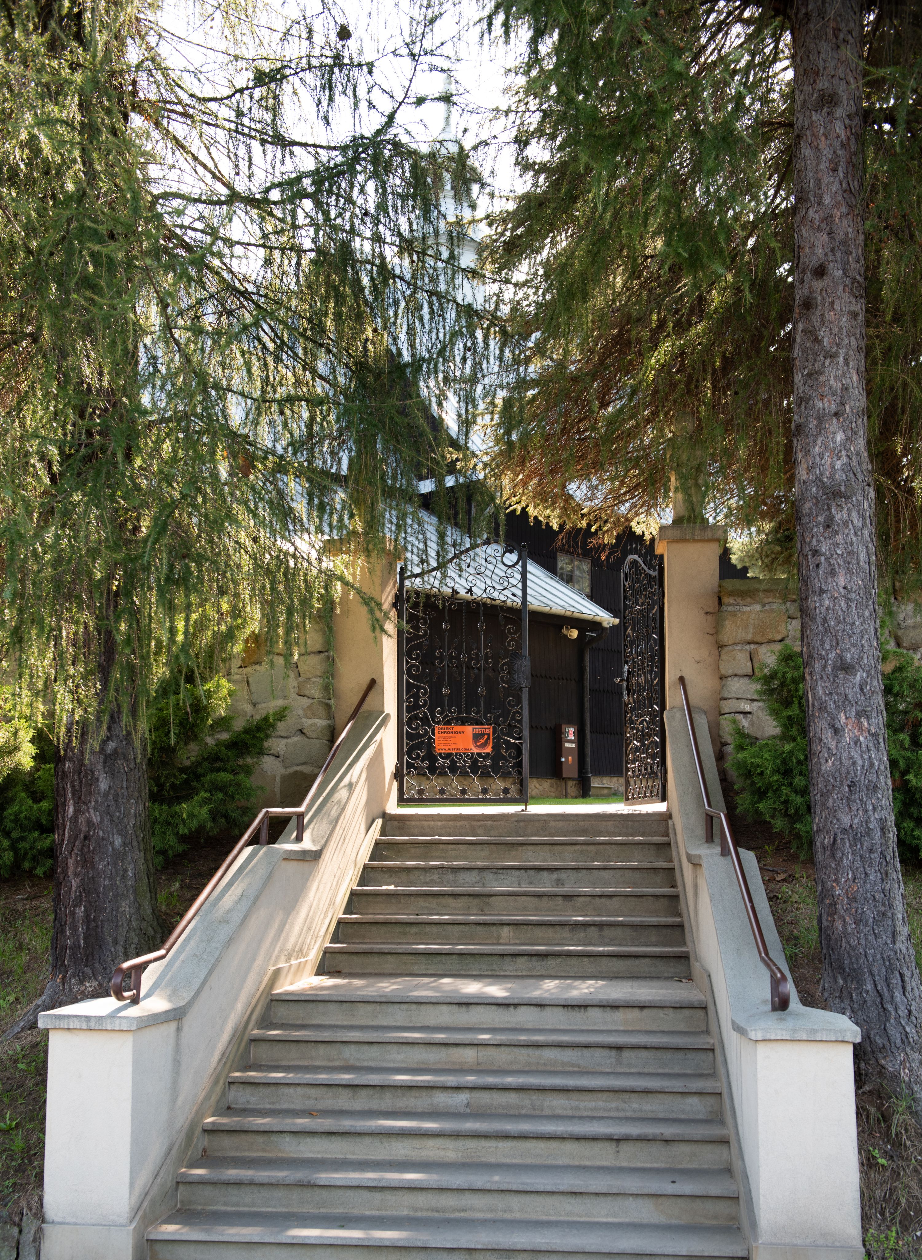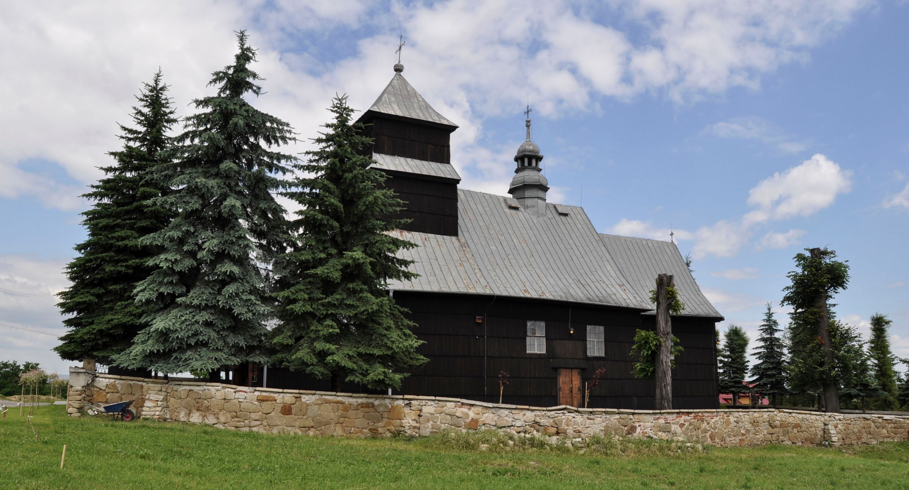 Kościół nakryty dachami dwuspadowymi, o pokryciu blaszanym, wyższym nad nawą, niższym nad prezbiterium. W połowie długości dachu, nad nawą, wbudowana wieżyczka na sygnaturkę, na ośmiobocznym, obitym blachą trzonie, z latarnią zwieńczoną niewielkim hełmem. Wieża nakryta czterospadowym daszkiem namiotowym, zwieńczona kulistą puszką i krzyżem. Kruchta nakryta osobnym daszkiem dwuspadowym, półszczytowym, zakrystia niższym dachem pulpitowym.