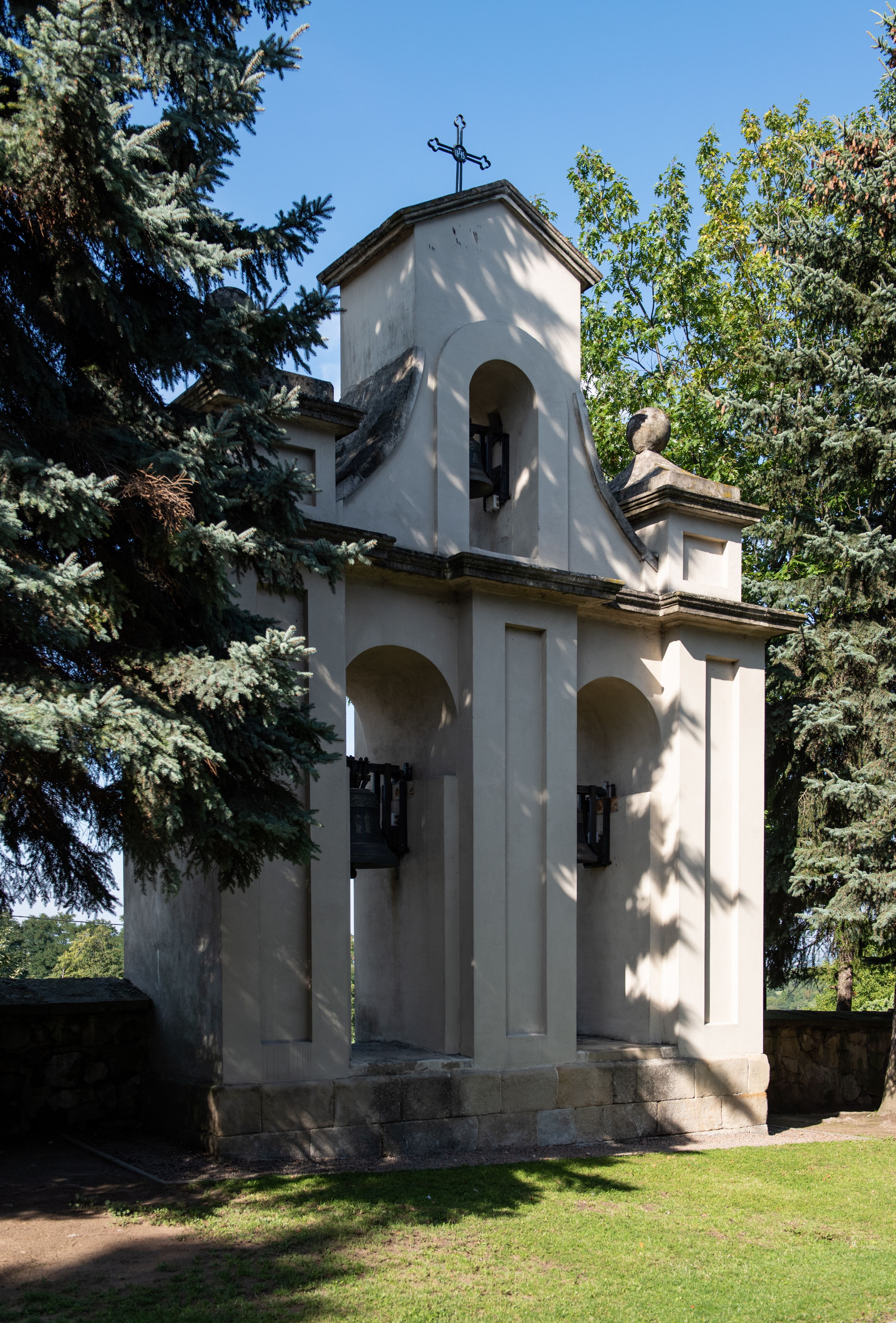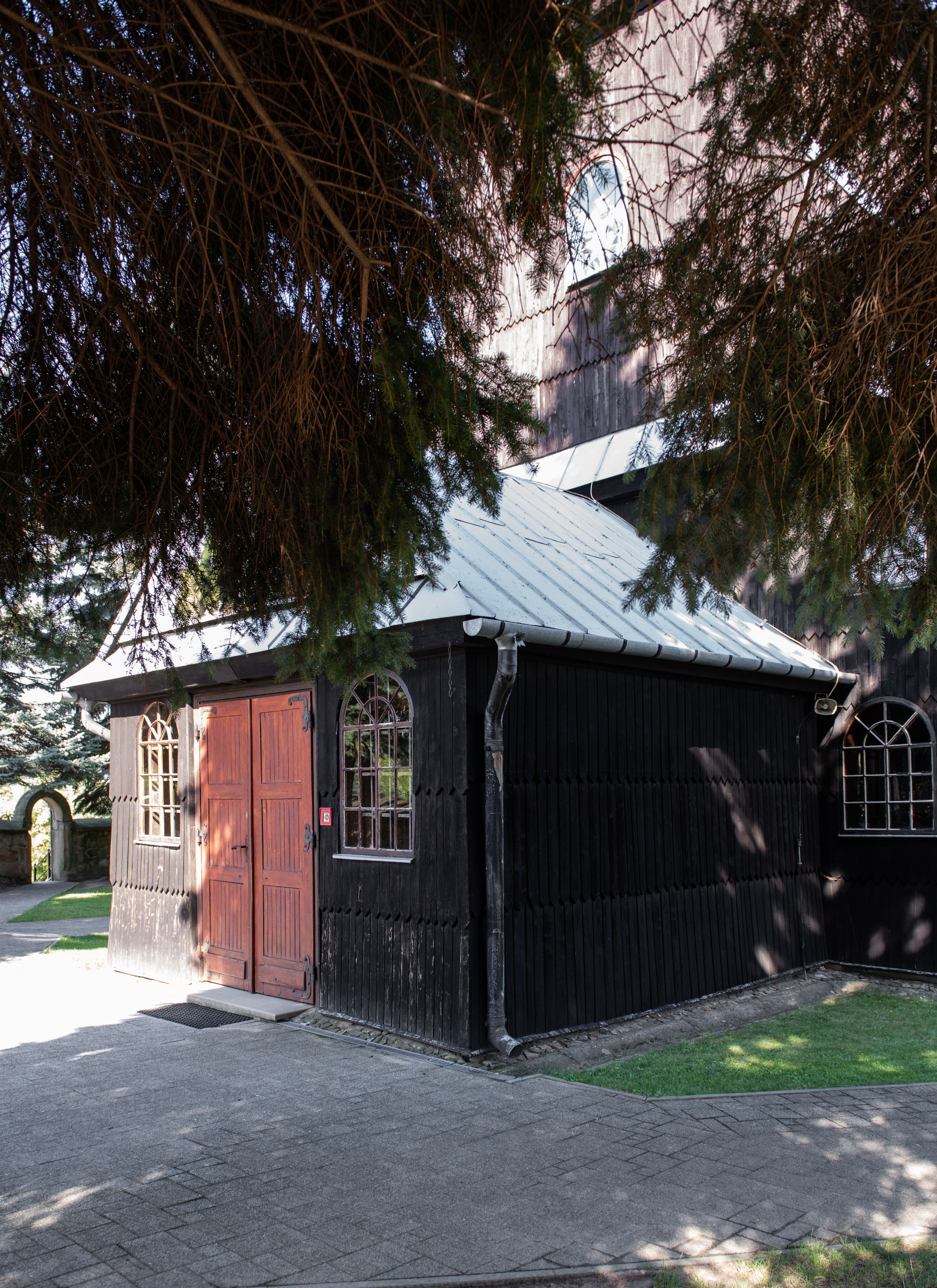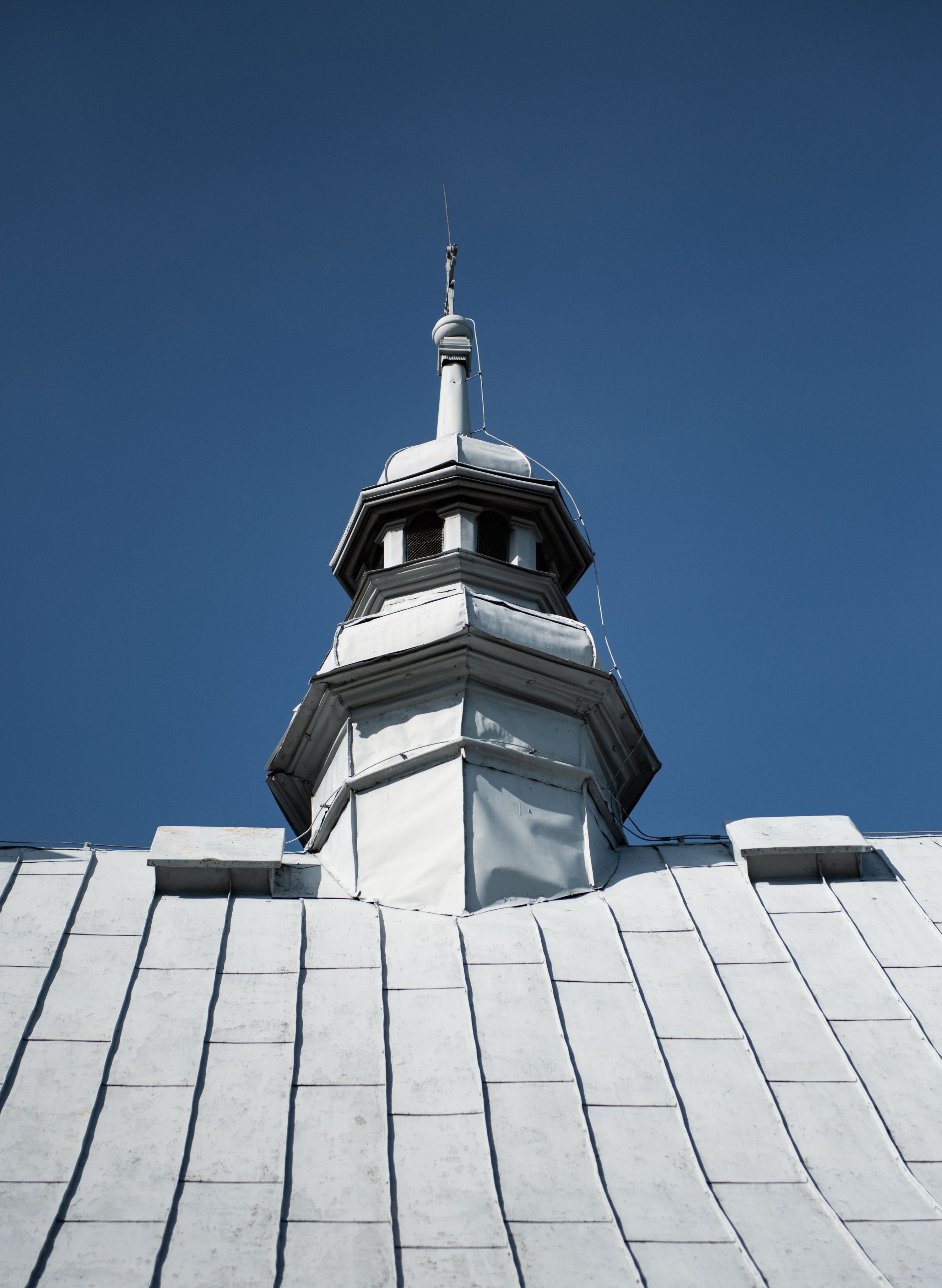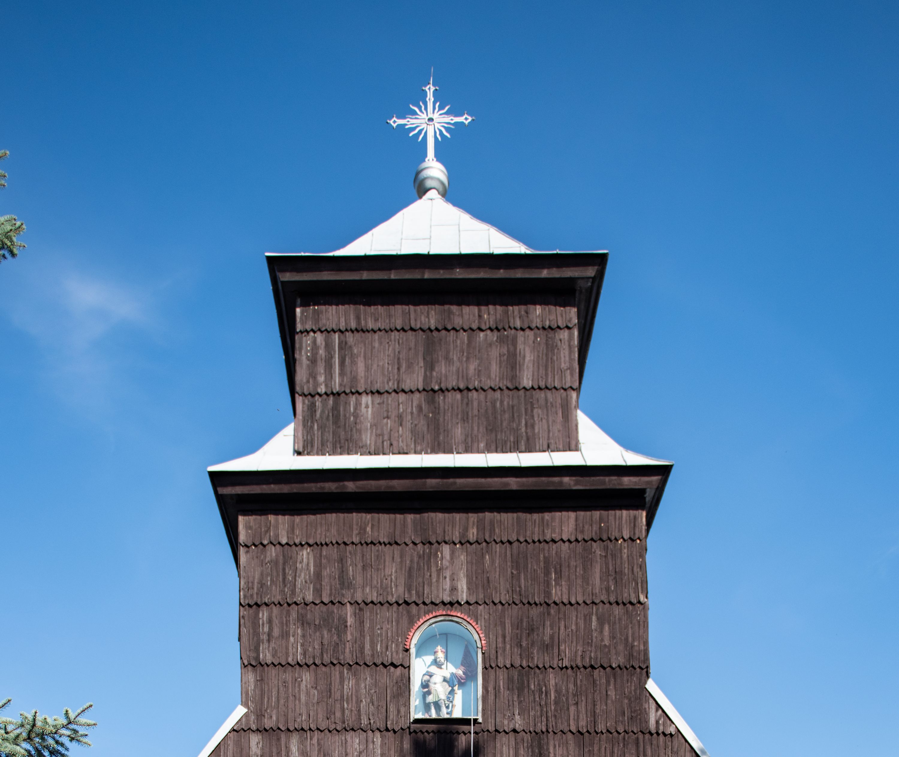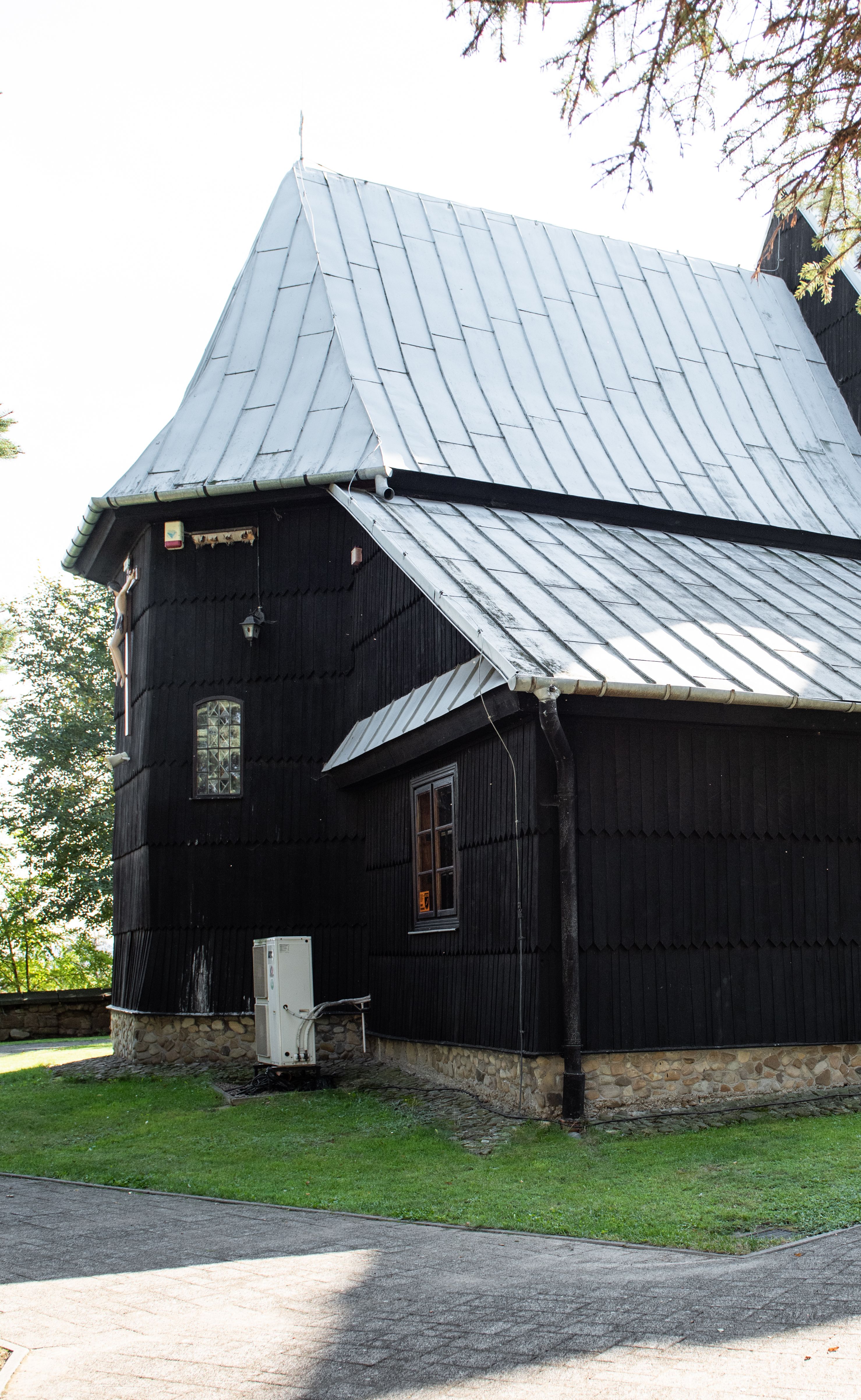 Kościół nakryty dachami dwuspadowymi, o pokryciu blaszanym, wyższym nad nawą, niższym nad prezbiterium. W połowie długości dachu, nad nawą, wbudowana wieżyczka na sygnaturkę, na ośmiobocznym, obitym blachą trzonie, z latarnią zwieńczoną niewielkim hełmem. Wieża nakryta czterospadowym daszkiem namiotowym, zwieńczona kulistą puszką i krzyżem. Kruchta nakryta osobnym daszkiem dwuspadowym, półszczytowym, zakrystia niższym dachem pulpitowym.