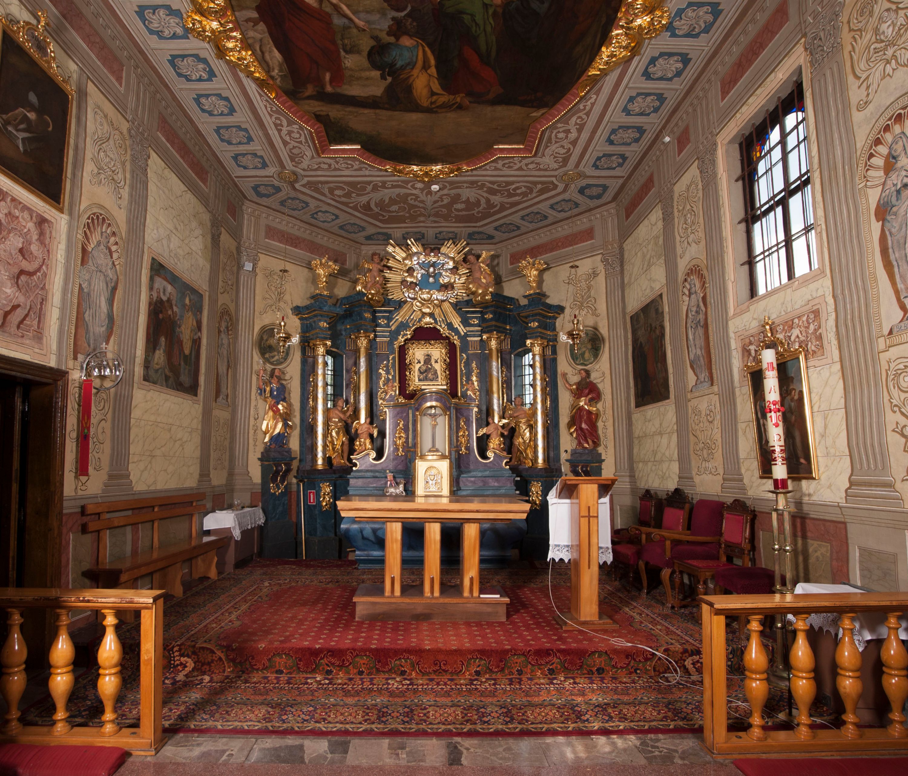 W przyziemiu wieży babiniec połączony z nawą wtórnym otworem w ścianie. Pomiędzy nawą a prezbiterium otwór tęczowy. Parapet chóru muzycznego w zachodniej części nawy, wsparty na czterech drewnianych kolumnach, z wejściem z nawy po drabiniastych schodach. Ściany i sklepienia pokryte polichromią z iluzjonistyczną architekturą i scenami figuralnymi. Wnętrze nakryte pułapami deskowymi w nawie i prezbiterium oraz stropem belkowym w babińcu. Otwory drzwiowe o prostokątnym wykroju zamknięte drzwiami obitymi deskami w kruchcie zachodniej, w ścianie południowej nawy oraz z prezbiterium do zakrystii. Okna w formie stojącego prostokąta. Posadzka kamienna, z płyt marmurowych.