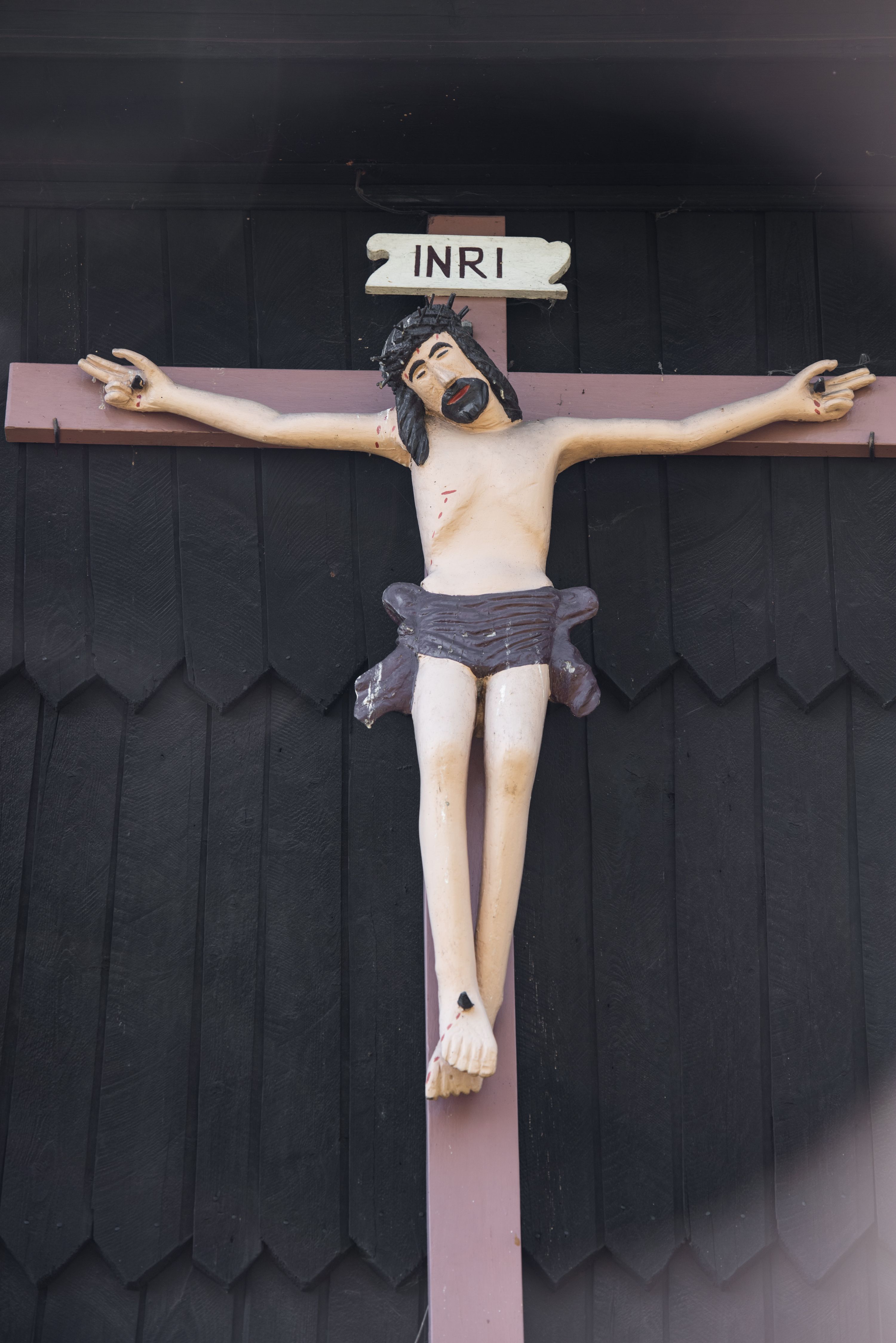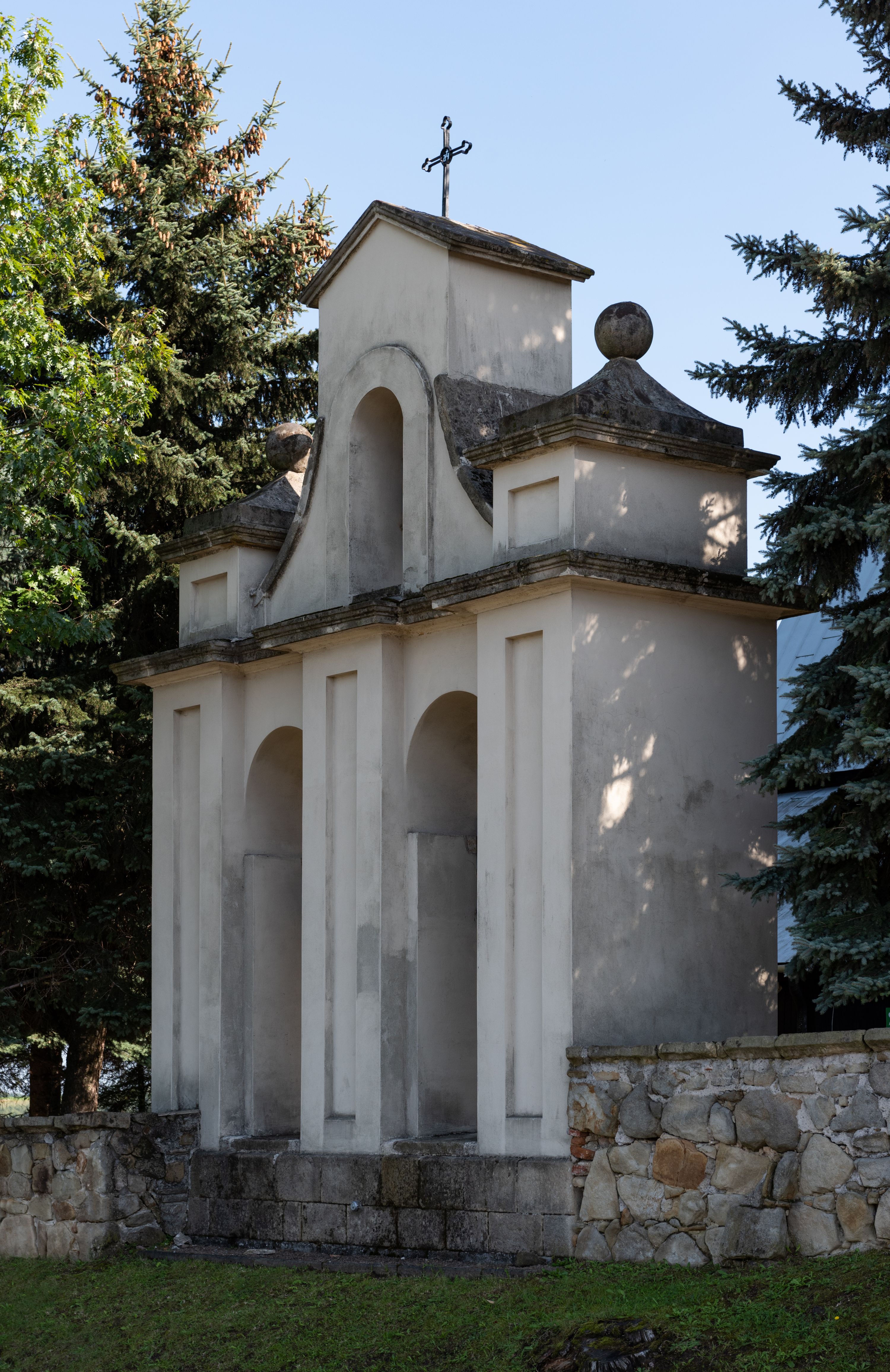 Elewacja frontowa jednoosiowa. Na osi wejście do kruchty zachodniej. Korpus wieży podzielony poziomo daszkami okapowymi, na froncie okno. Elewacje boczne jednolite. Korpus nawowy przepruty oknami po dwa na ścianach północnej i południowej, prezbiterium z oknem na ścianie południowej oraz dwoma okienkami na ścianach zamknięcia. Na elewacji wschodniej zawieszony krucyfiks.