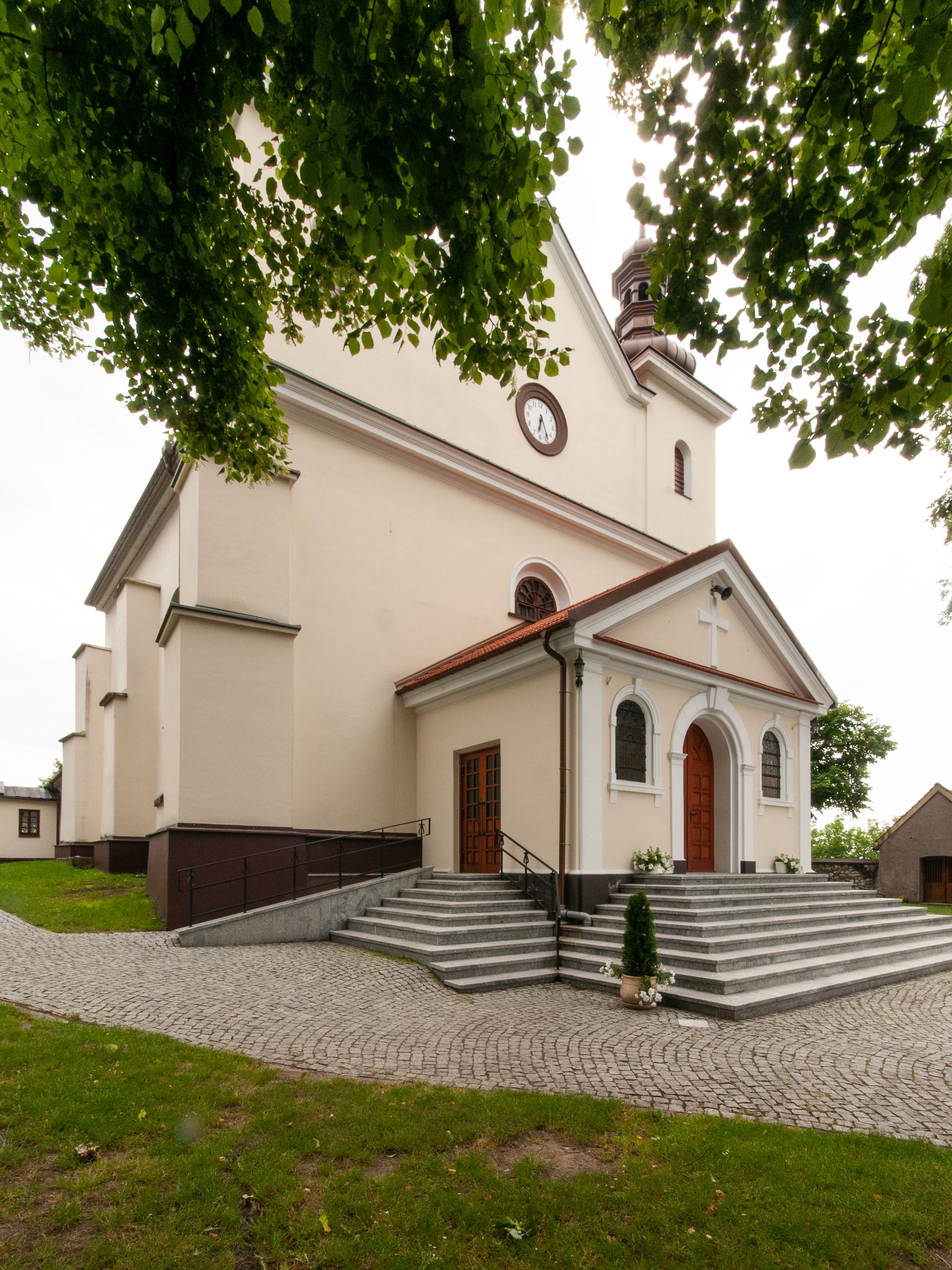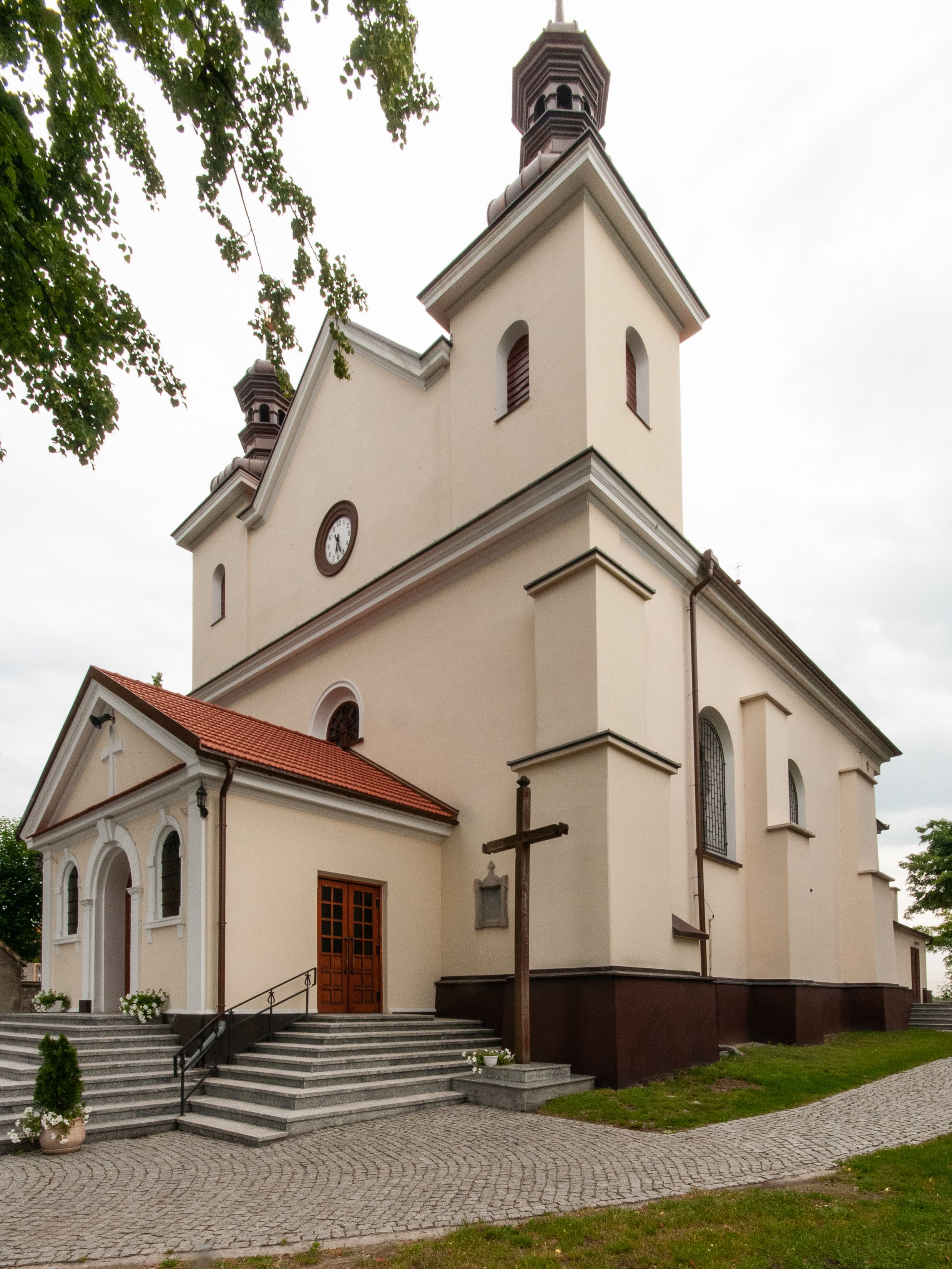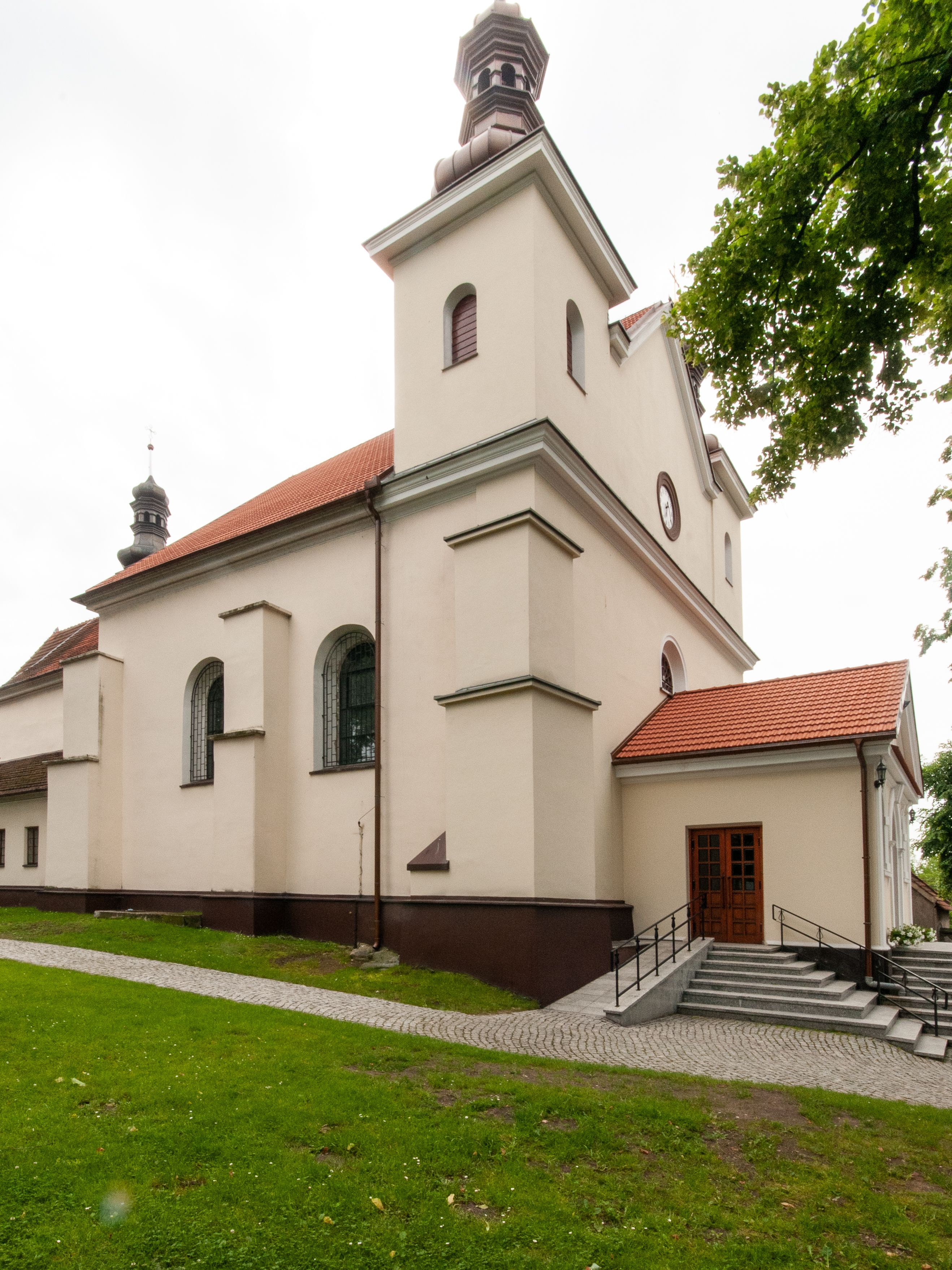Kościół orientowany, murowany, jednonawowy z prezbiterium zakończonym wielobocznie. Wschodnia część węższa, prostokątna, zachodnia szersza, trójnawowa, halowa. Do prezbiterium od północy przylega zakrystia, do wschodniej części korpusu przybudówka, od zachodu kruchta. Ściany nawy dzielą pilastry. Prezbiterium sklepione krzyżowo, absyda konchowo z lunetami, nawy kolebkowo z lunetami. Od zachodu chór wsparty na dwóch czworobocznych słupach. Jego parapet jest wybrzuszony w części środkowej, ażurowy, zakończony u dołu listwą wycinaną w formie stylizowanych listków. W prezbiterium jedno okno w kształcie stojącego prostokąta zamknięte łukiem pełnym i jedno ślepe, zamknięte łukiem ostrym. Od strony północnej do zakrystii dwa okna zamknięte łukiem odcinkowym i cztery prostokątne, dwa okna zamknięte łukiem pełnym do zachodniej części nawy; od strony południowej pięć okien zamkniętych łukiem pełnym. Główne wejście od zachodu, drugie od południa, kolejne do zakrystii, portal z prezbiterium do zakrystii, z czarnego marmuru. Fasada dwuwieżowa, z kruchtą, do której prowadzi ciąg schodów. Kruchta prostopadłościenna, z dachem dwuspadowym, z portalem w kształcie prostokąta zamkniętego łukiem pełnym na osi między oknami powtarzającymi ten kształt. Nad kondygnacją trójkątny przyczółek z krzyżem łacińskim. Fasada dwukondygnacyjna, z wieżami wtopionymi w lico. Pierwsza kondygnacja gładka, flankowana szkarpami, zamknięta gzymsem, druga również niemal gładka, z zegarem na środku i małymi oknami w partii wież. Na osi trójkątny przyczółek. Elewacje obiega cokół, wspierają szkarpy – najgęściej ustawione wokół prezbiterium. Dachy naw dwuspadowe, nad prezbiterium dach zakończony wielobocznie, nad zakrystią pulpitowy; na kalenicy wieżyczka na sygnaturkę, wieże zakończone rozbudowanymi hełmami.