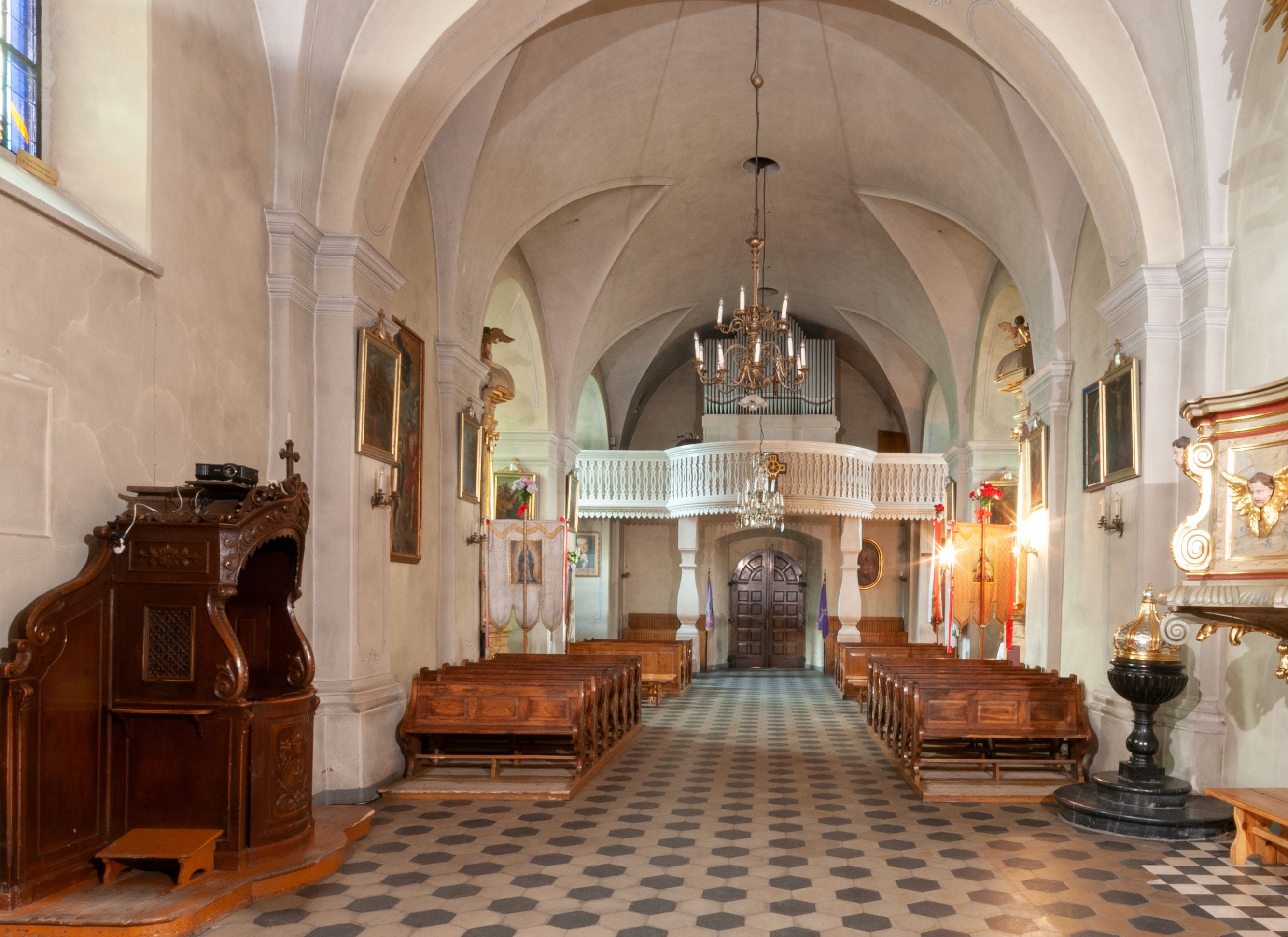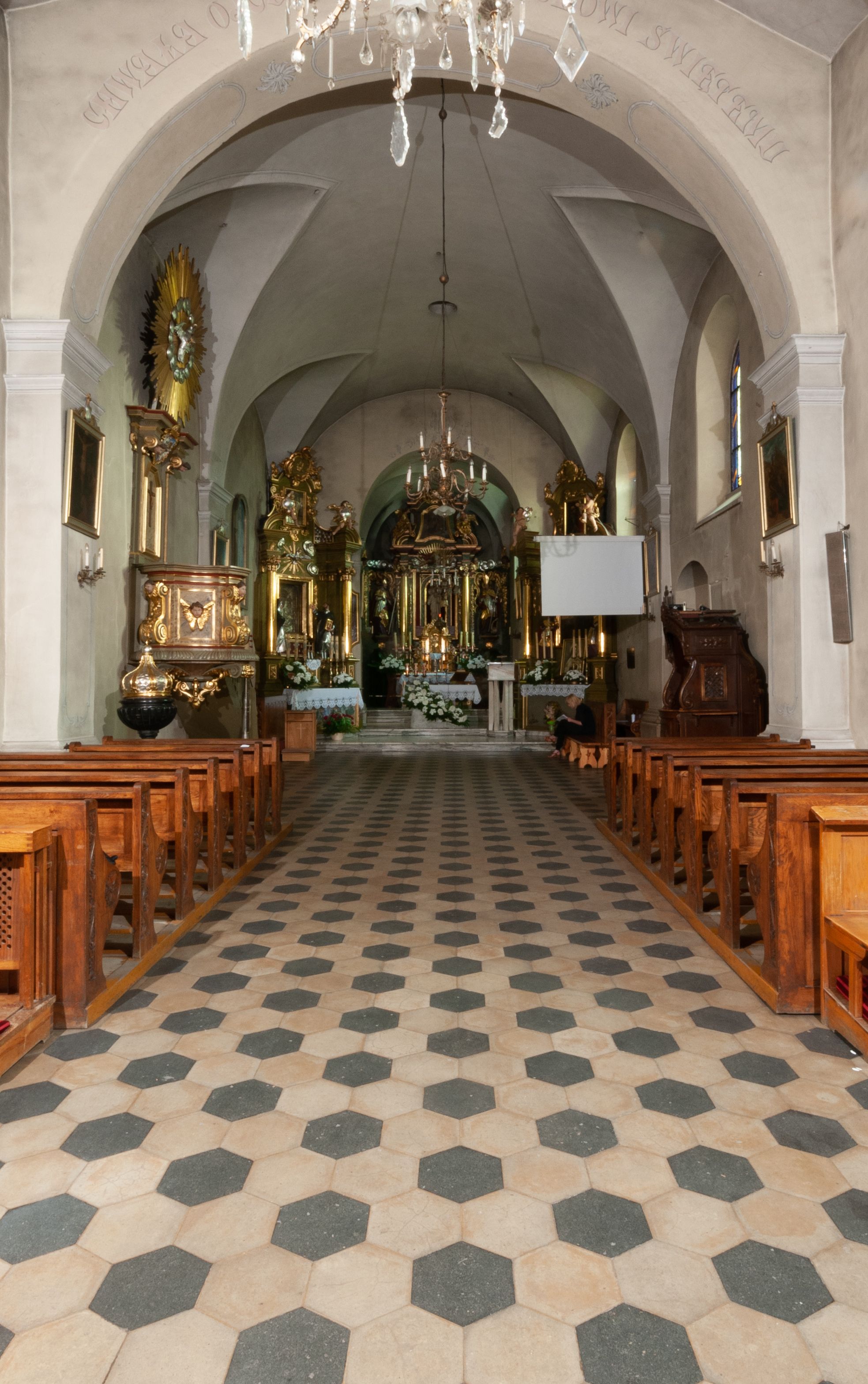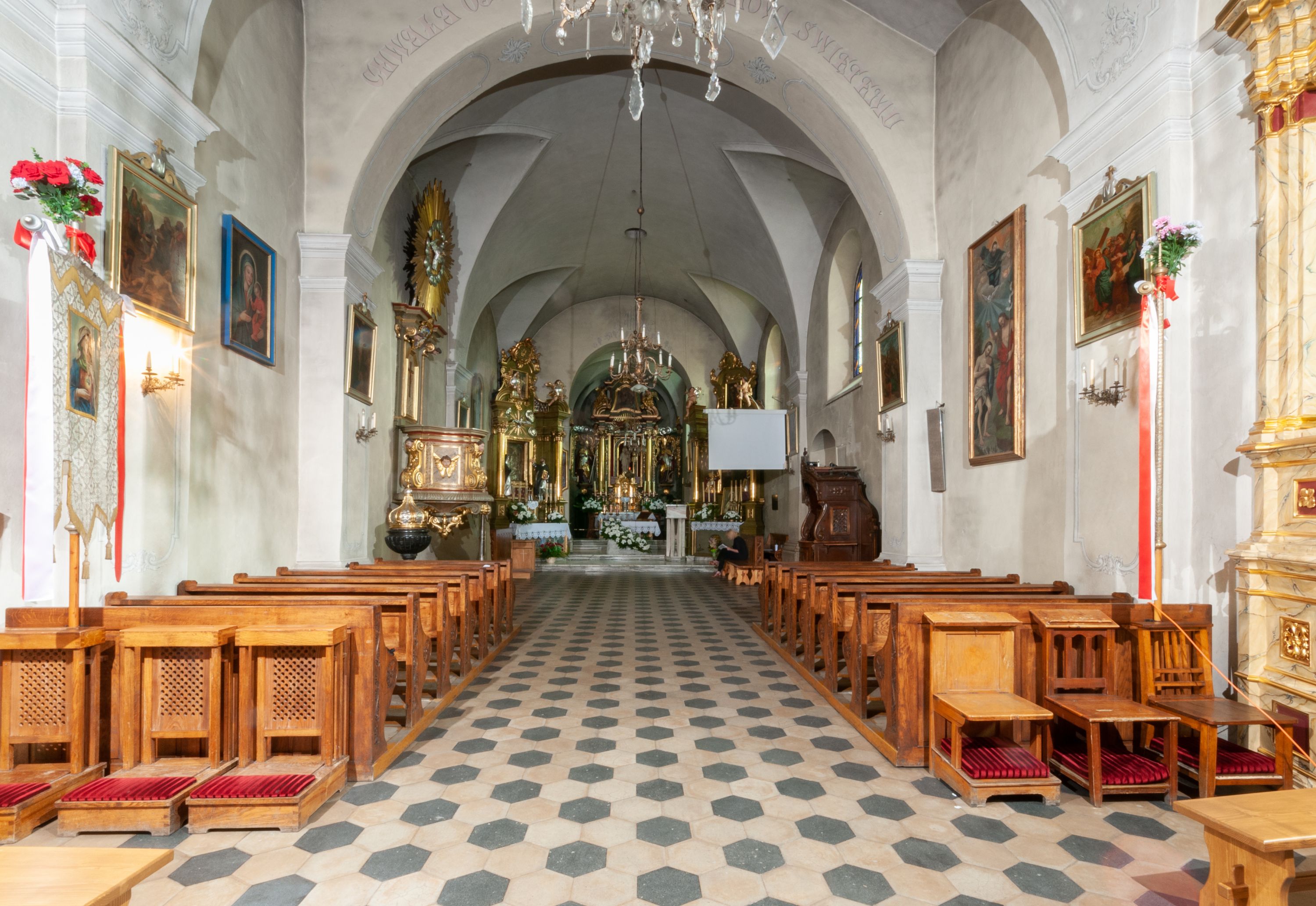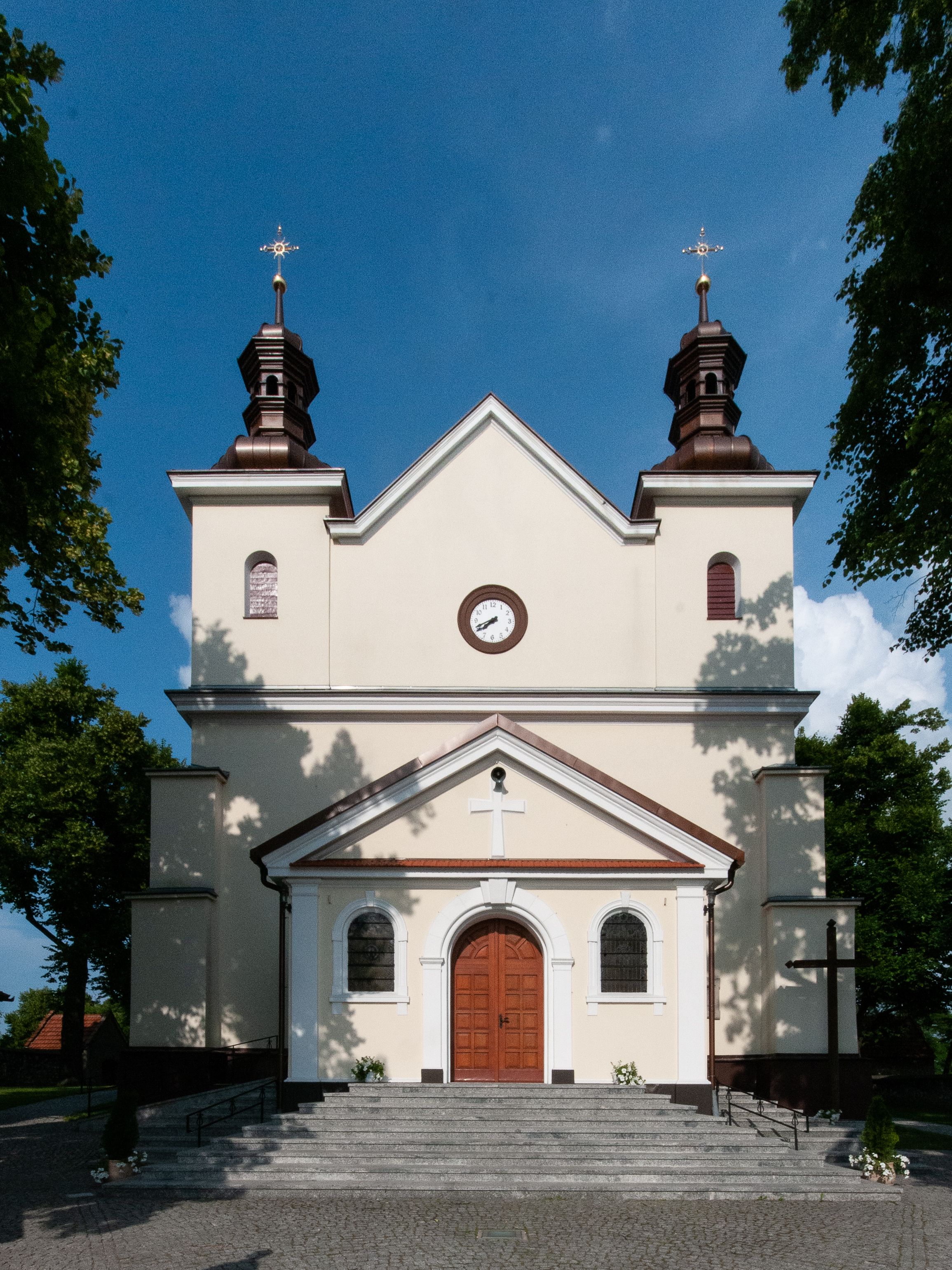 Kościół pw. Trójcy Świętej jest budowlą wieloetapową. Najstarsze jest niewielkie prezbiterium, które wybudowano prawdopodobnie jeszcze przed 1440 rokiem, wschodnia część nawy została odbudowana około 1680 roku, a zachodnia część pochodzi z końca XVIII wieku. Najmłodsze są wieże dobudowane w 1933 roku. We wnętrzu na uwagę zasługują: chrzcielnica z czarnego marmuru z XVII wieku, obraz św. Izydora w prawym, bocznym ołtarzu według tradycji pędzla Michała Stachowicza i późnobarokowe ołtarze. Prowadzący do zakrystii portal z czarnego marmuru i ołtarz boczny lewy Ukrzyżowania pochodzą, według niektórych przekazów, z krakowskiego kościoła Wszystkich Świętych.
