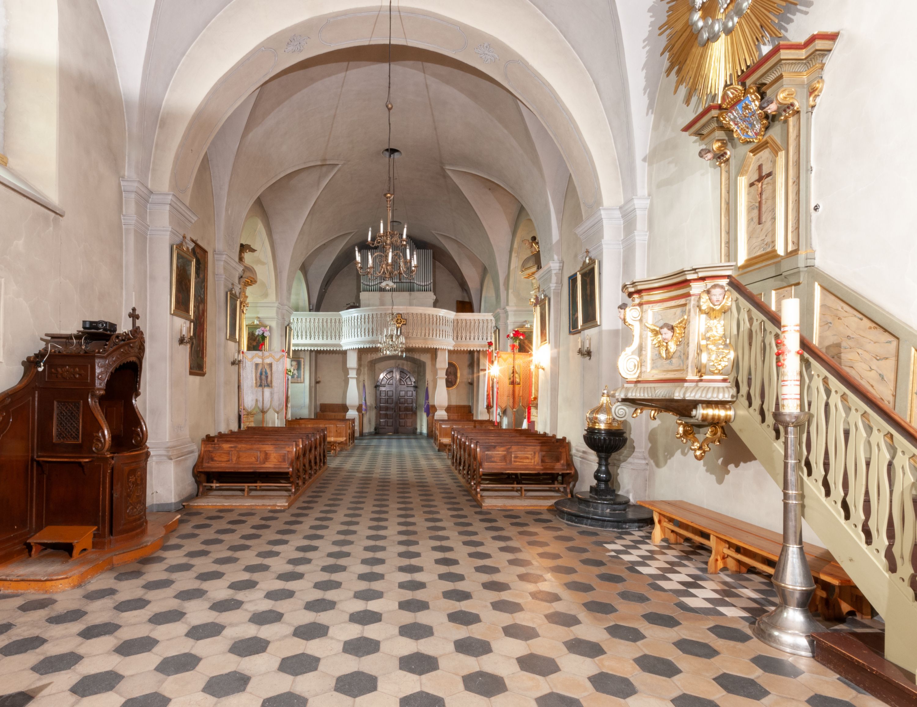 We wnętrzu na uwagę zasługują chrzcielnica z czarnego marmuru z XVII wieku, obraz św. Izydora w prawym, bocznym ołtarzu według tradycji pędzla Michała Stachowicza i późnobarokowe ołtarze. Prowadzący do zakrystii portal z czarnego marmuru i ołtarz boczny lewy Ukrzyżowania pochodzą, według niektórych przekazów, z krakowskiego kościoła Wszystkich Świętych.