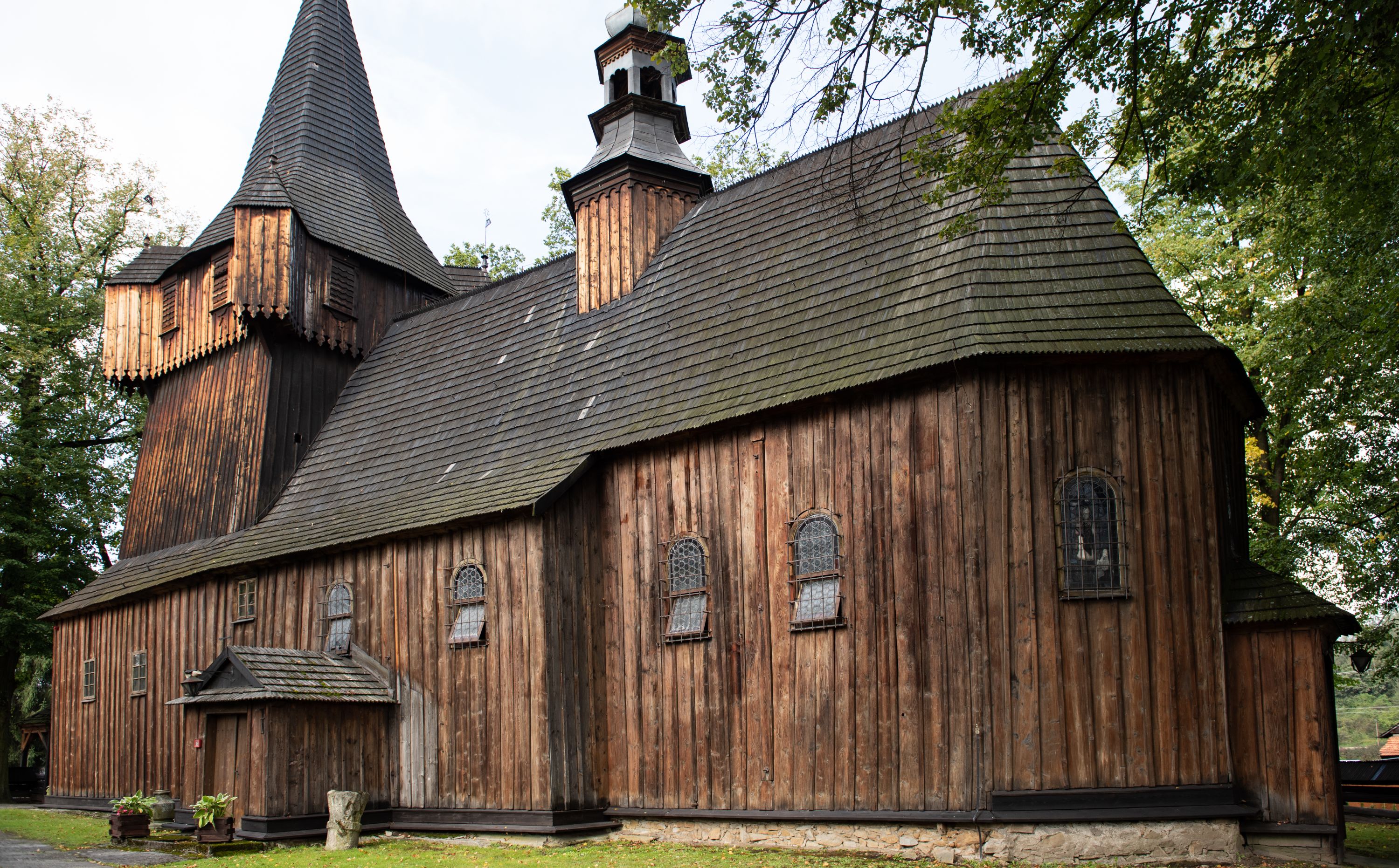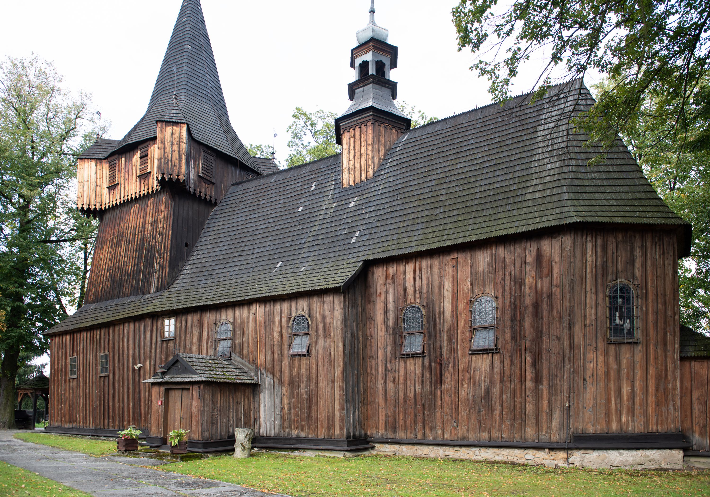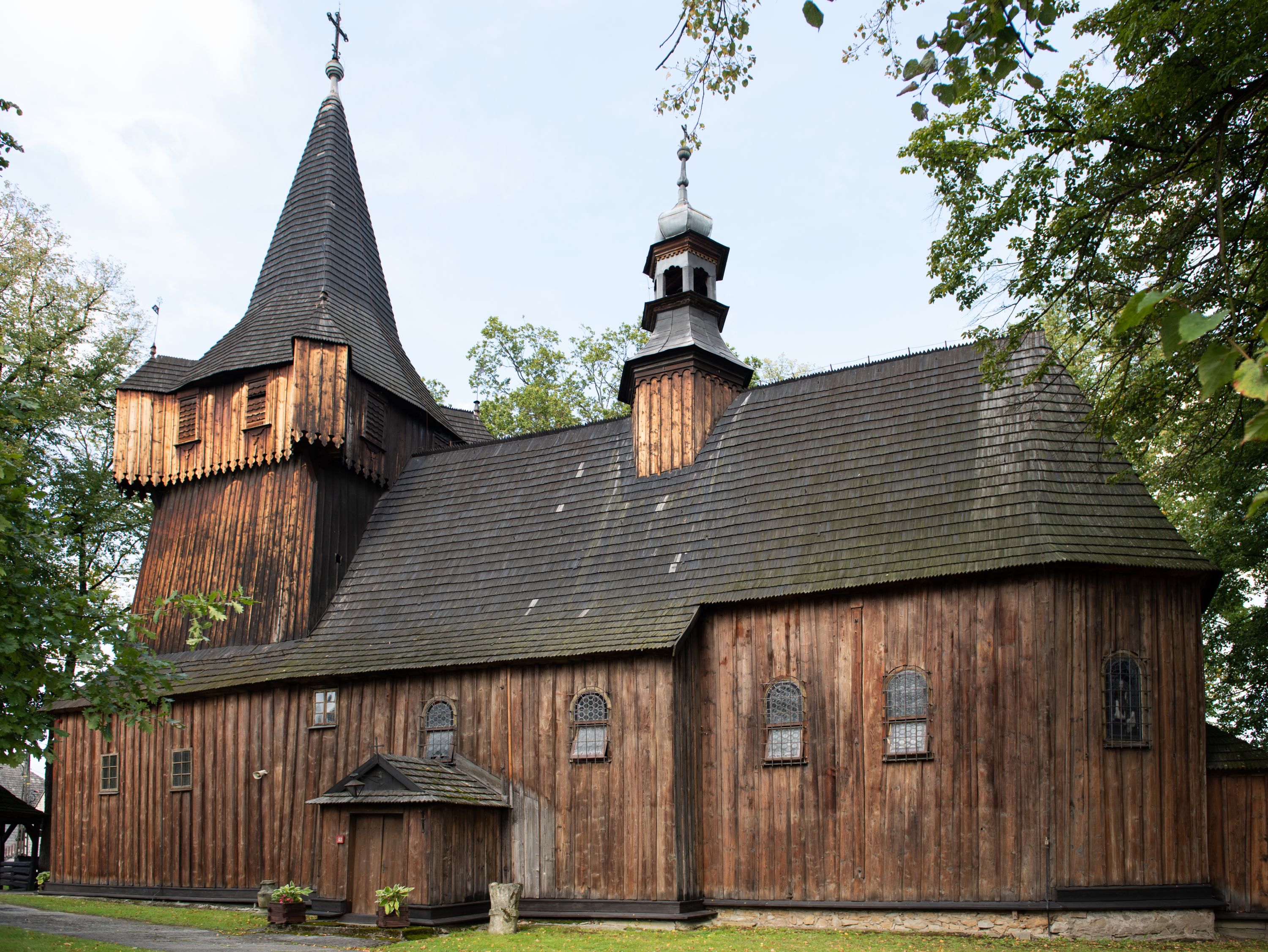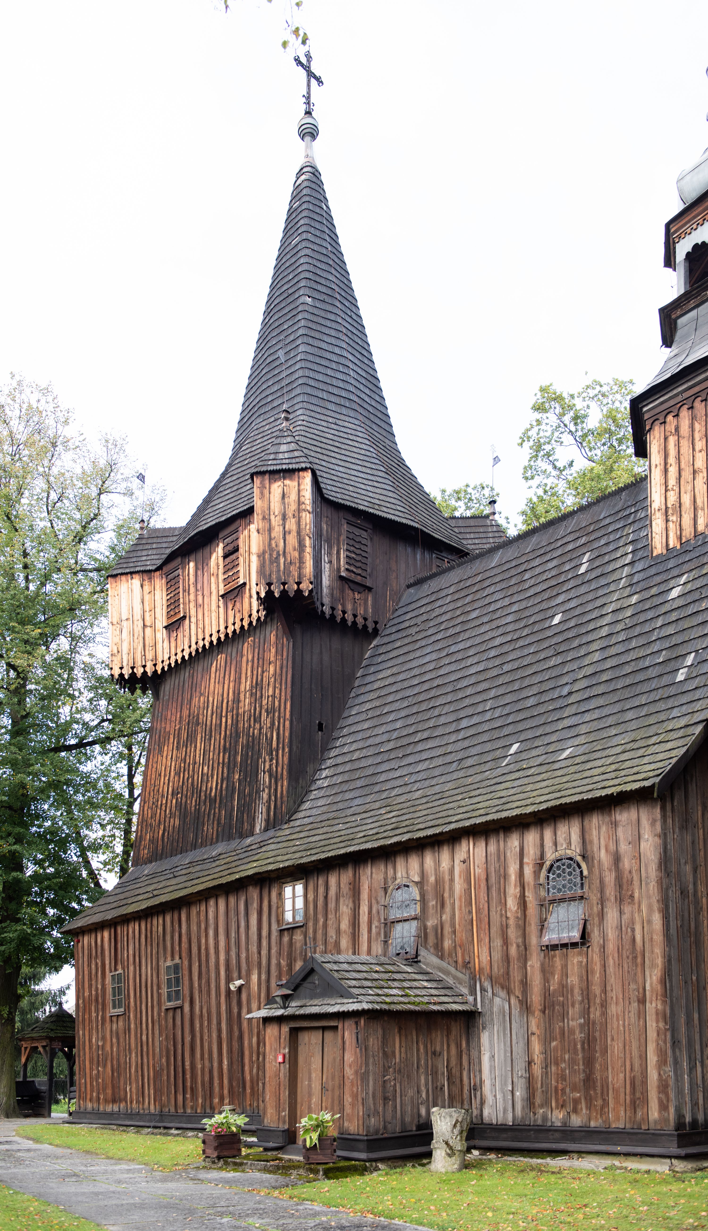 Kościół w Woli Radziszowskiej powstał najprawdopodobniej w 1440 roku. Wieżę dobudowano prawdopodobnie na przełomie XVI i XVII stulecia. W późniejszym okresie architektura świątyni nie uległa znaczącym zmianom. Budowla stanowi przykład niewielkich rozmiarów, jednonawowej i jednowieżowej, późnogotyckiej świątyni drewnianej o konstrukcji zrębowej typowej dla terenu południowej Małopolski. Na uwagę zasługuje wyposażenie świątyni, reprezentujące różne epoki i style. Do jego najstarszych elementów należy umieszczony w barokowym ołtarzu głównym gotycki obraz przedstawiający Matkę Boską z Dzieciątkiem w typie Hodegetrii datowany na około 1460 rok oraz utrzymany w tradycji późnogotyckiej krucyfiks umieszczony na belce tęczowej. Manierystyczne ołtarze boczne noszące wezwania św. Anny i Ukrzyżowania zostały wykonane najprawdopodobniej w 1636 roku. Na ścianach i stropach świątyni widnieje polichromia o motywach figuralnych wykonana w 1893 roku w miejsce starszej dekoracji malarskiej o tych samych tematach.