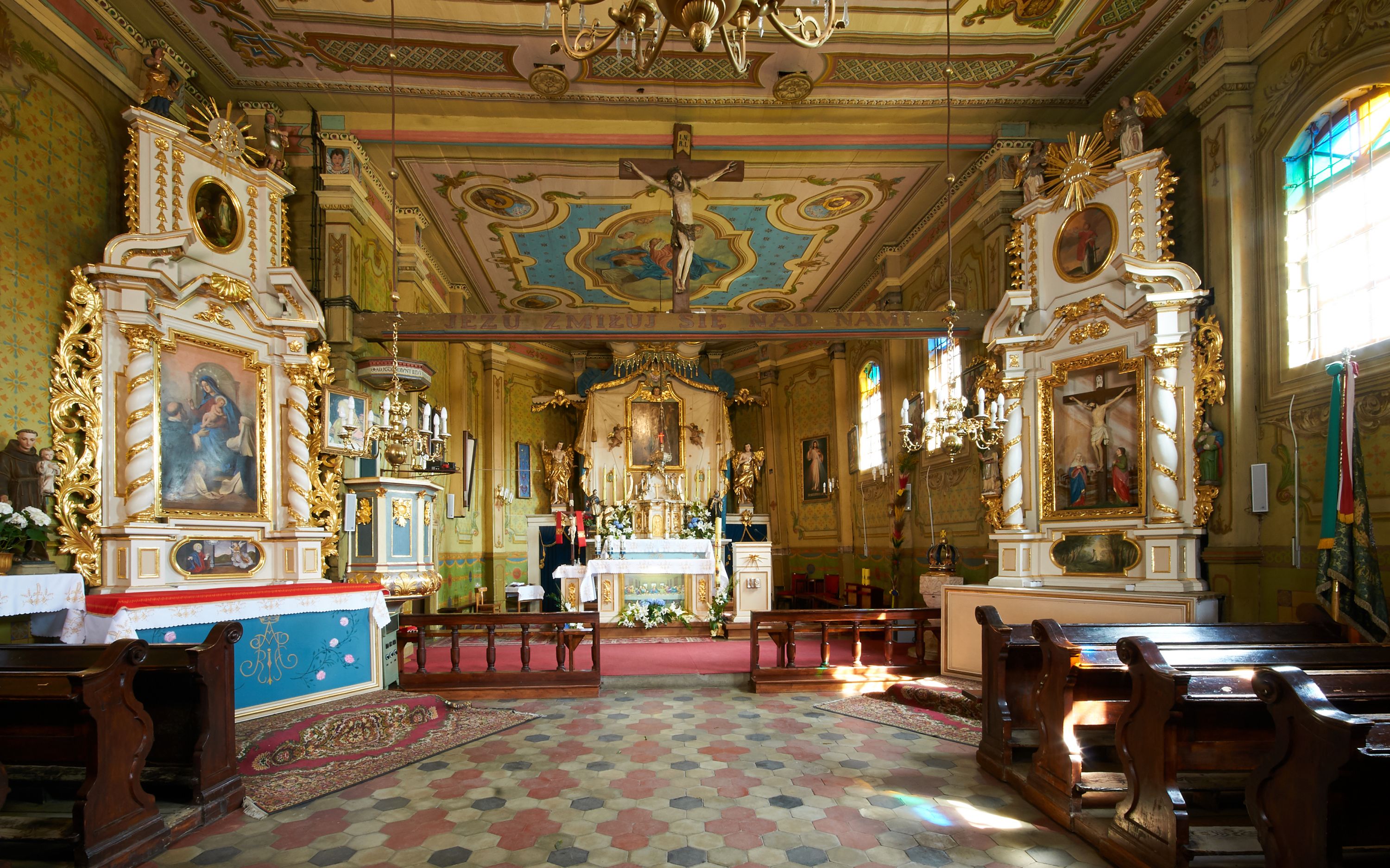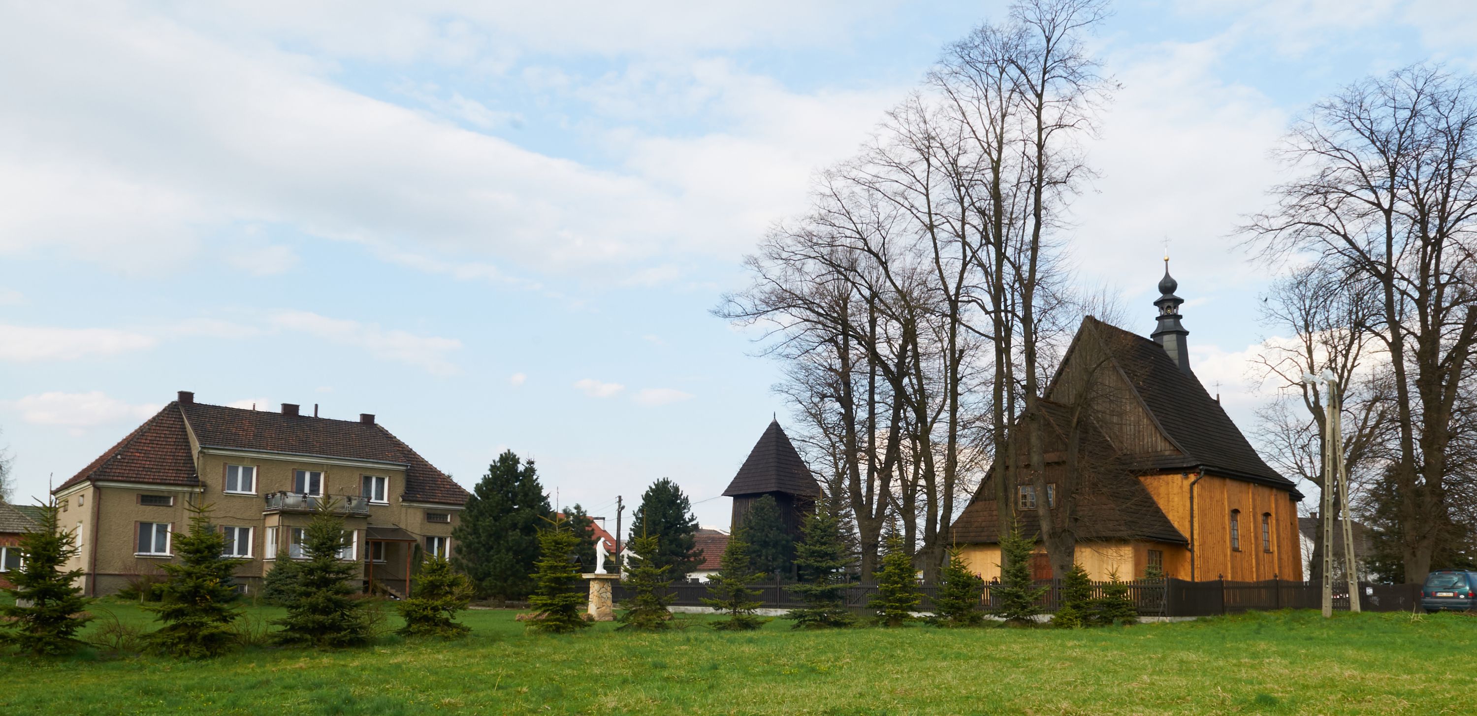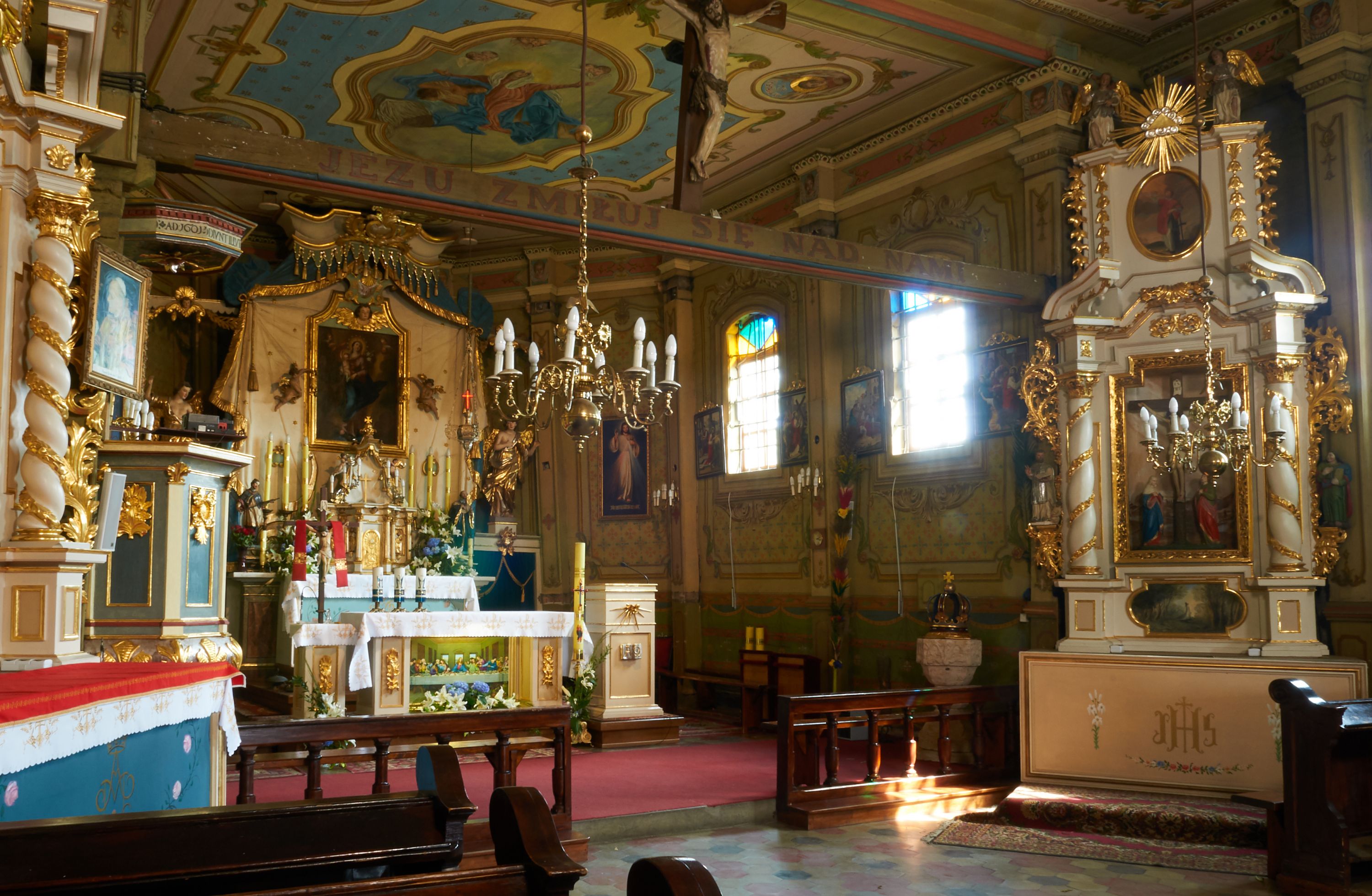 Kościół drewniany o konstrukcji zrębowej, na betonowym podmurowaniu przesłoniętym daszkiem gontowym, kruchta zachodnia o konstrukcji słupowo-ramowej. Elewacje jednolite, szalowane z listwowaniem, wzmocnione lisicami. Więźba dachowa drewniana, krokwiowa. Kościół orientowany, jednonawowy, nawa na rzucie prostokąta zbliżonego do kwadratu, prezbiterium nieco węższe, zakończone trójbocznie. Do wschodniej ściany prezbiterium przylega Ogrójec na rzucie prostokąta, od północy zakrystia na planie zbliżonym do trapezu. Do północnej ściany nawy przylega niewielka kruchta na rzucie prostokąta, od zachodu duża kruchta na planie prostokąta z pomieszczeniem nad nią, ze schodami drabiniastymi na chór, otwarta do nawy trzema dużymi otworami o wykroju prostokątnym. Wnętrze podzielone pilastrami podtrzymującymi architraw i fryz, wyłamane na ich osi. Pomiędzy nawą a prezbiterium prostokątny otwór tęczowy z prostą belką. Parapet chóru muzycznego w zachodniej części nawy, o wklęsło-wypukłym zarysie, podparty przez dwie kolumny i dwie półkolumny o wielobocznych trzonach. Otwory drzwiowe o prostokątnym wykroju zamknięte drzwiami spągowymi w północnej ścianie nawy oraz prezbiterium. Wnętrze nakryte pułapami deskowymi. Posadzka z płyt ceramicznych.