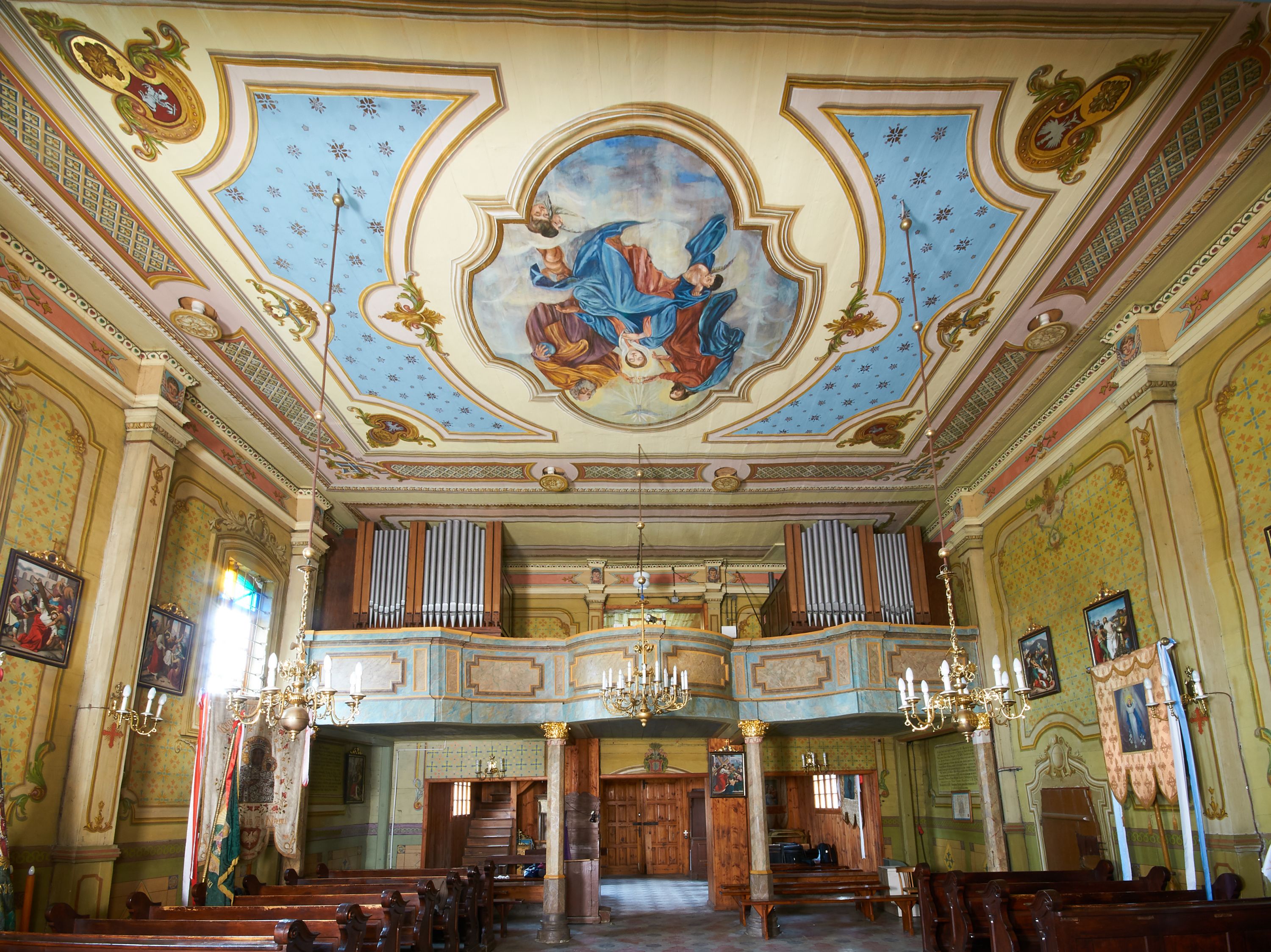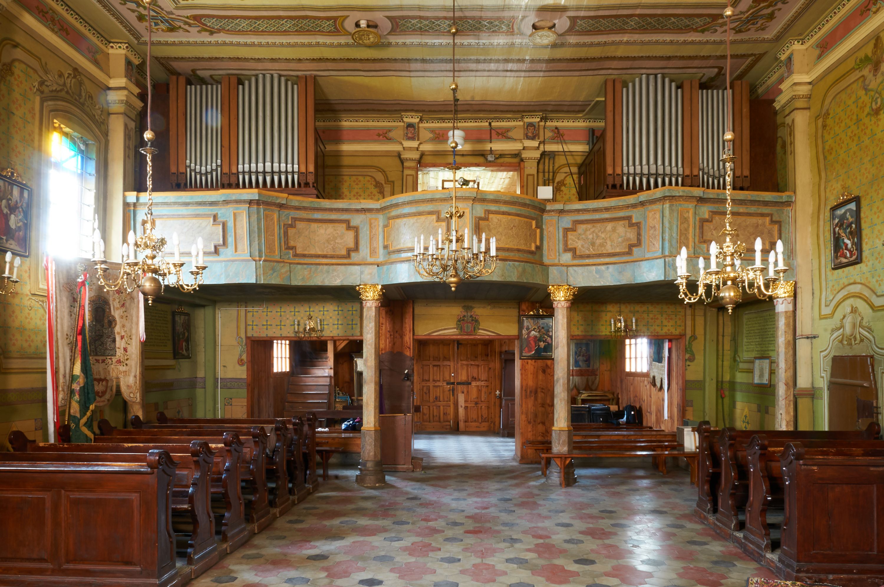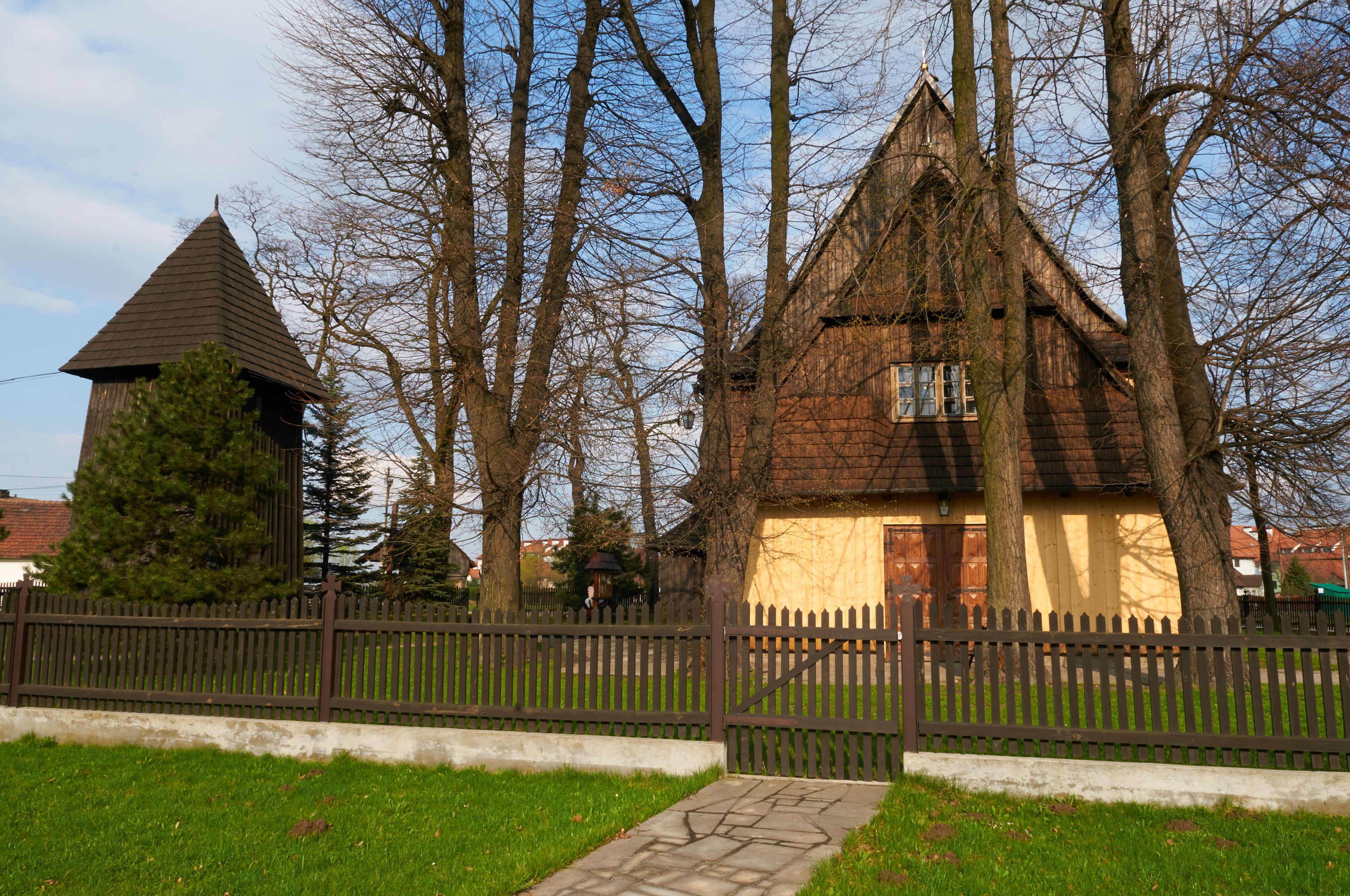 Kościół drewniany o konstrukcji zrębowej, na betonowym podmurowaniu przesłoniętym daszkiem gontowym, kruchta zachodnia o konstrukcji słupowo-ramowej. Elewacje jednolite, szalowane z listwowaniem, wzmocnione lisicami. Więźba dachowa drewniana, krokwiowa. Kościół orientowany, jednonawowy, nawa na rzucie prostokąta zbliżonego do kwadratu, prezbiterium nieco węższe, zakończone trójbocznie. Do wschodniej ściany prezbiterium przylega Ogrójec na rzucie prostokąta, od północy zakrystia na planie zbliżonym do trapezu. Do północnej ściany nawy przylega niewielka kruchta na rzucie prostokąta, od zachodu duża kruchta na planie prostokąta z pomieszczeniem nad nią, ze schodami drabiniastymi na chór, otwarta do nawy trzema dużymi otworami o wykroju prostokątnym. Wnętrze podzielone pilastrami podtrzymującymi architraw i fryz, wyłamane na ich osi. Pomiędzy nawą a prezbiterium prostokątny otwór tęczowy z prostą belką. Parapet chóru muzycznego w zachodniej części nawy, o wklęsło-wypukłym zarysie, podparty przez dwie kolumny i dwie półkolumny o wielobocznych trzonach. Otwory drzwiowe o prostokątnym wykroju zamknięte drzwiami spągowymi w północnej ścianie nawy oraz prezbiterium. Wnętrze nakryte pułapami deskowymi. Posadzka z płyt ceramicznych.