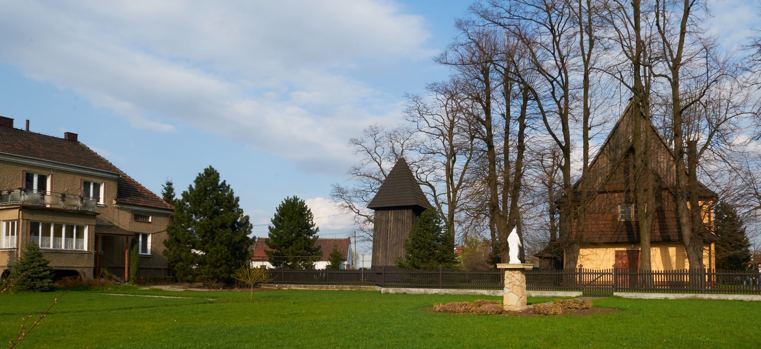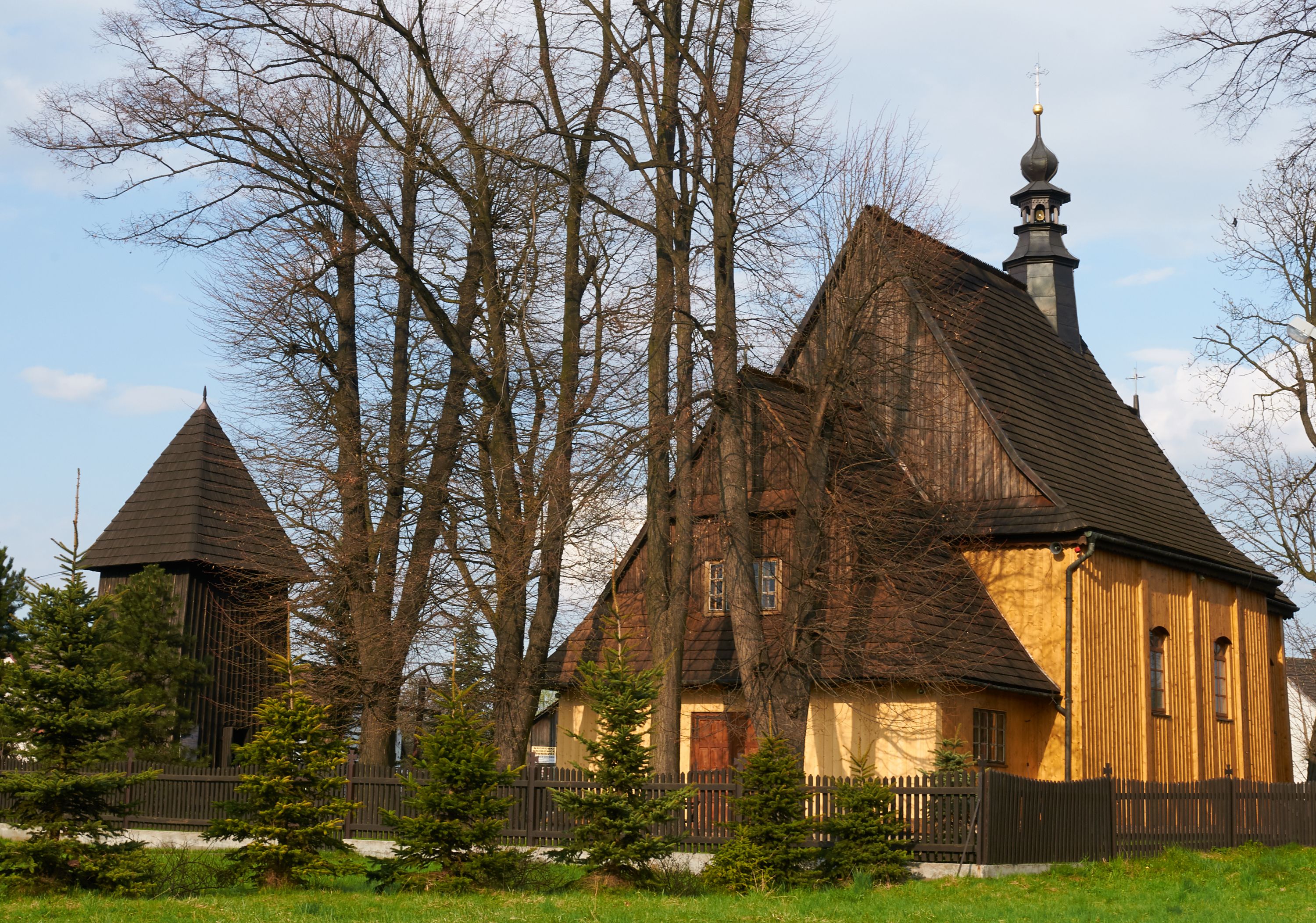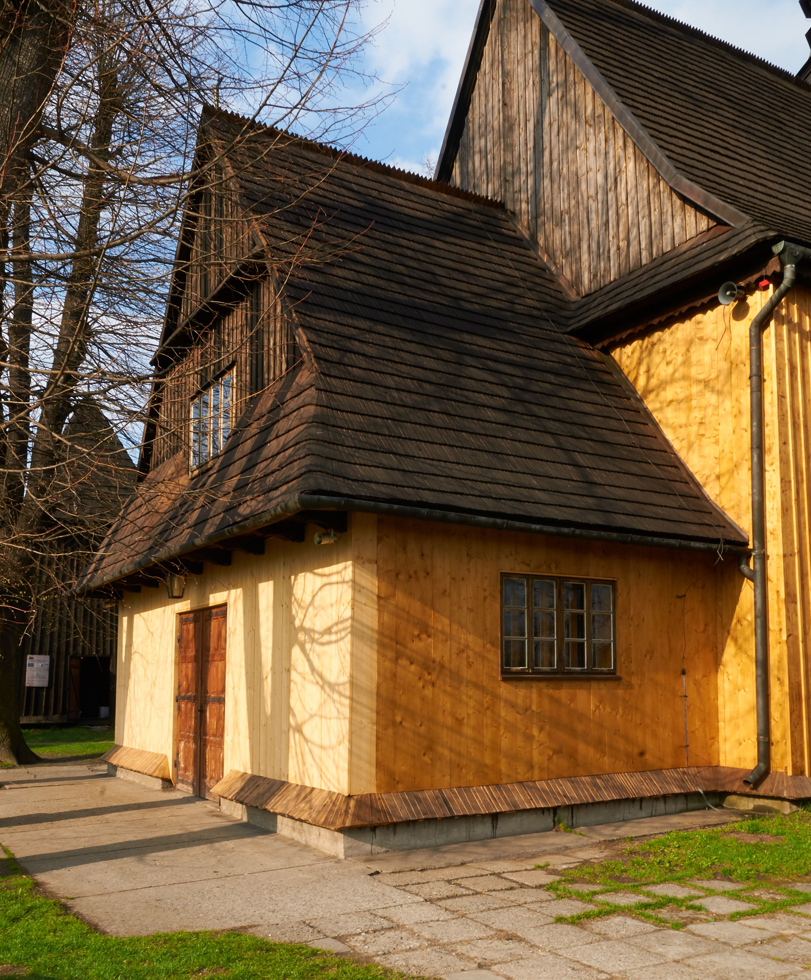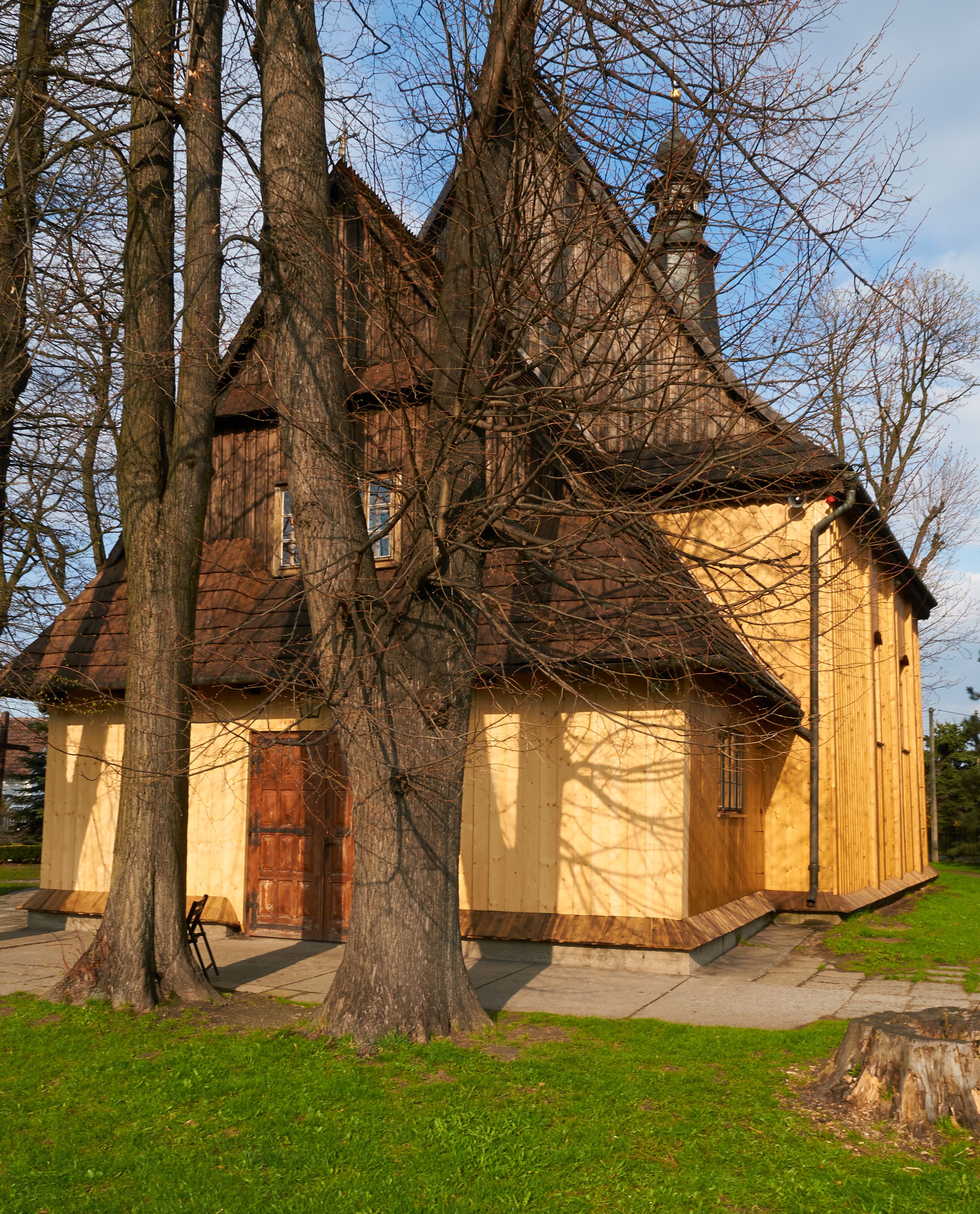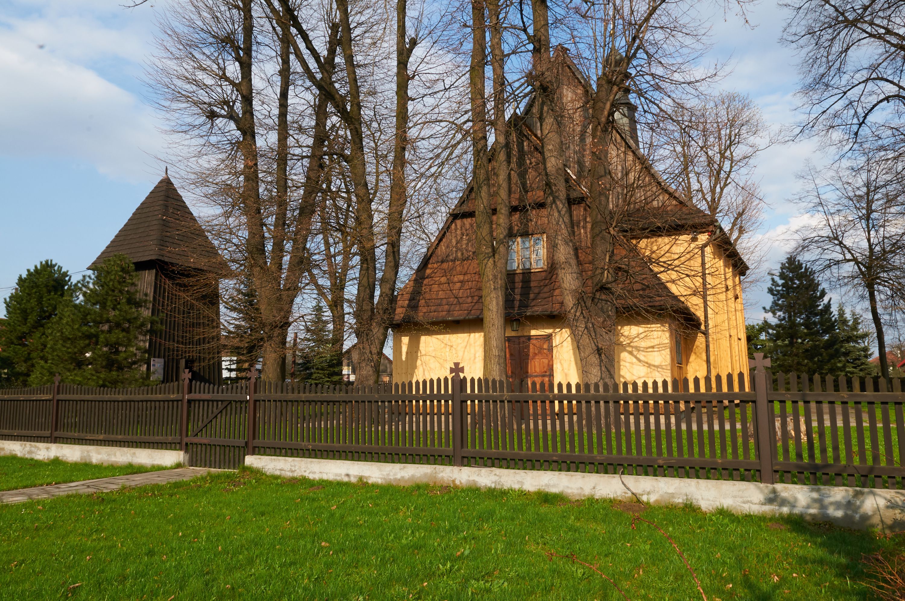 Elewacja frontowa jednoosiowa, na osi wejście do kruchty z dwuskrzydłowymi drzwiami, w partii szczytu podwójne okno. W elewacji południowej cztery otwory okienne w formie stojącego prostokąta zamkniętego łukiem odcinkowym, dwa w nawie i dwa w prezbiterium oraz prostokątne, podwójne okno w kruchcie zachodniej, z krosnowymi oknami o drobnych podziałach kwaterowych. Elewacja północna z prostokątnym, podwójnym oknem w części kruchty zachodniej oraz z wejściami do kruchty północnej i do zakrystii o dwuskrzydłowych drzwiach. Na ścianie wschodniej prezbiterium Ogrójec w formie głębokiej szalowanej wnęki przesłoniętej daszkiem pulpitowym. Kościół nakryty dachami gontowymi dwuspadowymi, wyższym nad nawą, niższym nad prezbiterium, z kalenicą dekorowaną gontowym grzebieniem, nad zakrystią i kruchtą północną miękko modelowane dachy trójspadowe, kruchta zachodnia nakryta dachem dwuspadowym, półszczytowym. W połowie długości dachu nad nawą od strony prezbiterium wznosi się ponad kalenicą wieżyczka na sygnaturkę, na ośmiobocznym obitym blachą trzonie, z latarnią zwieńczoną niewielkim cebulastym hełmem.